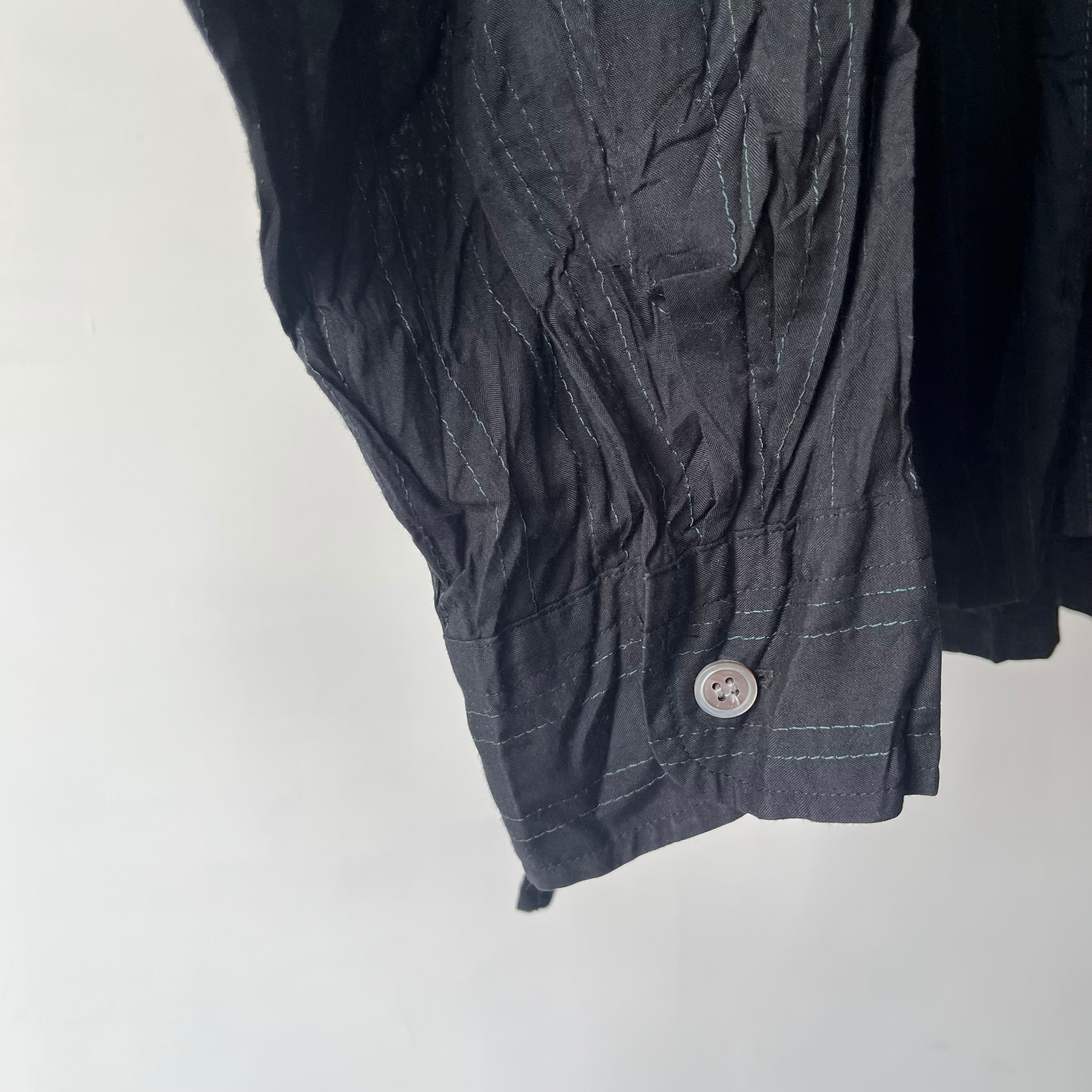 グリーンステッチが映えるl/sシワ加工シャツ