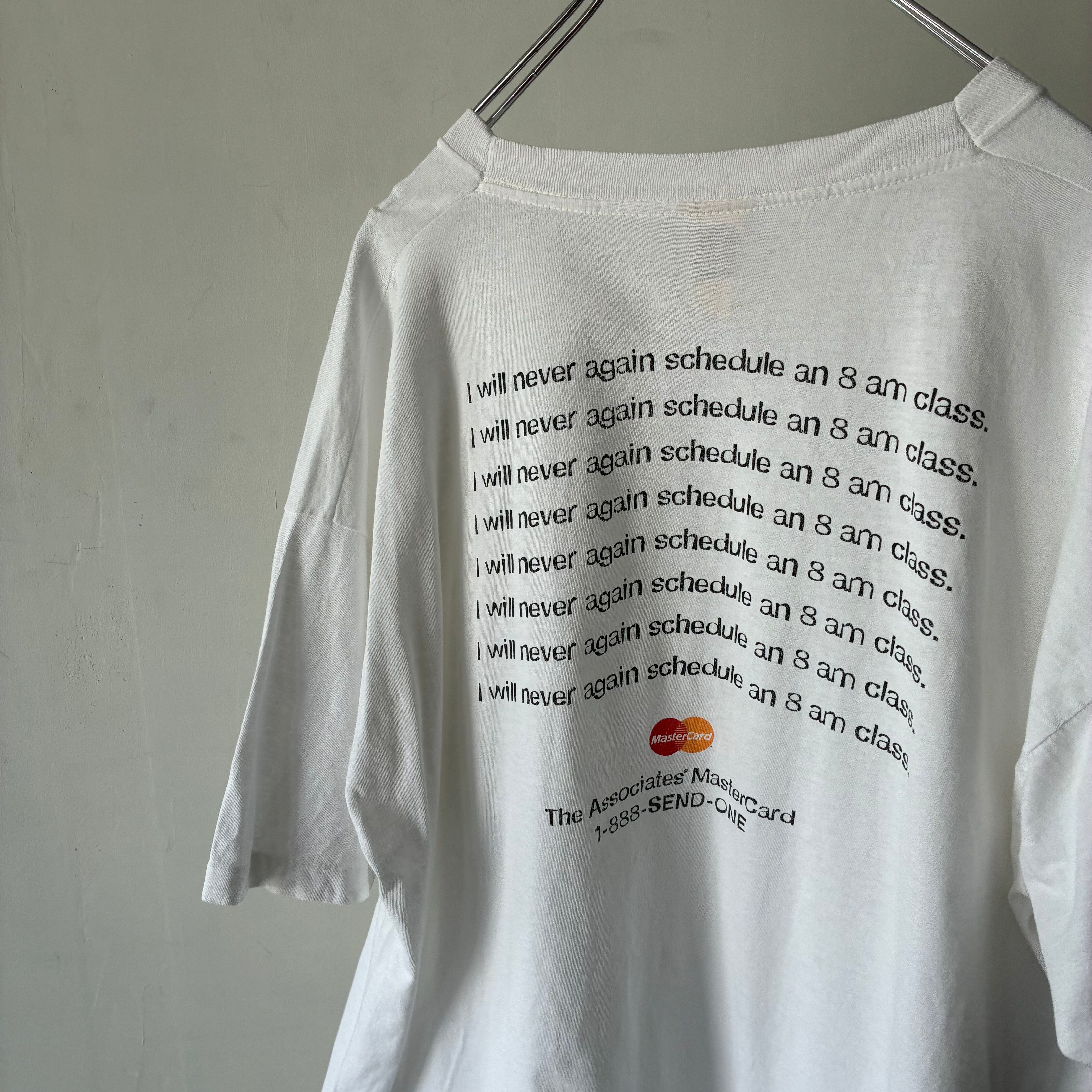 という英文が黒字で何度も繰り返され、下部には再びMasterCardロゴと1-888の電話番号が入った、広告としても学生ジョークとしても機能する洒落の効いたデザインです