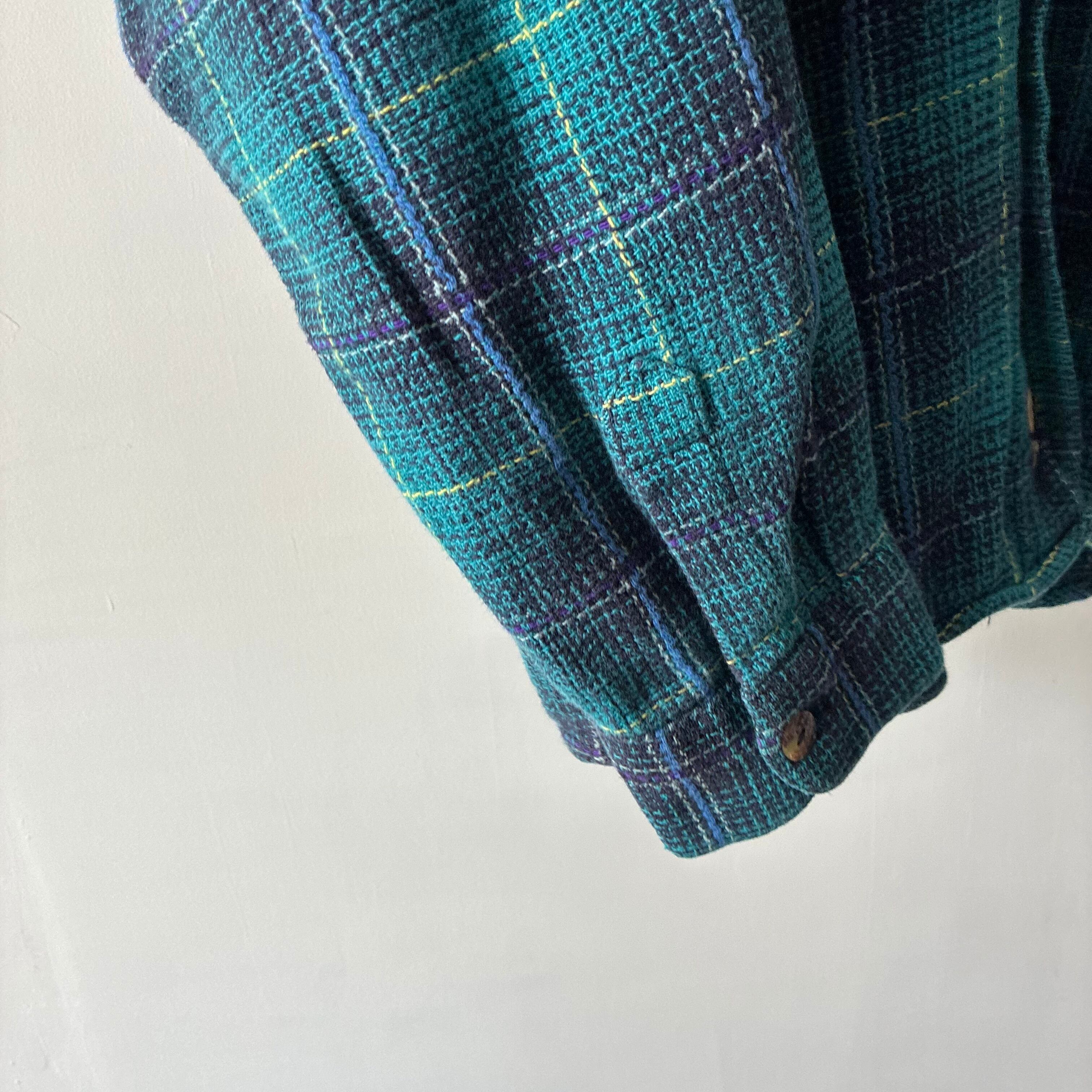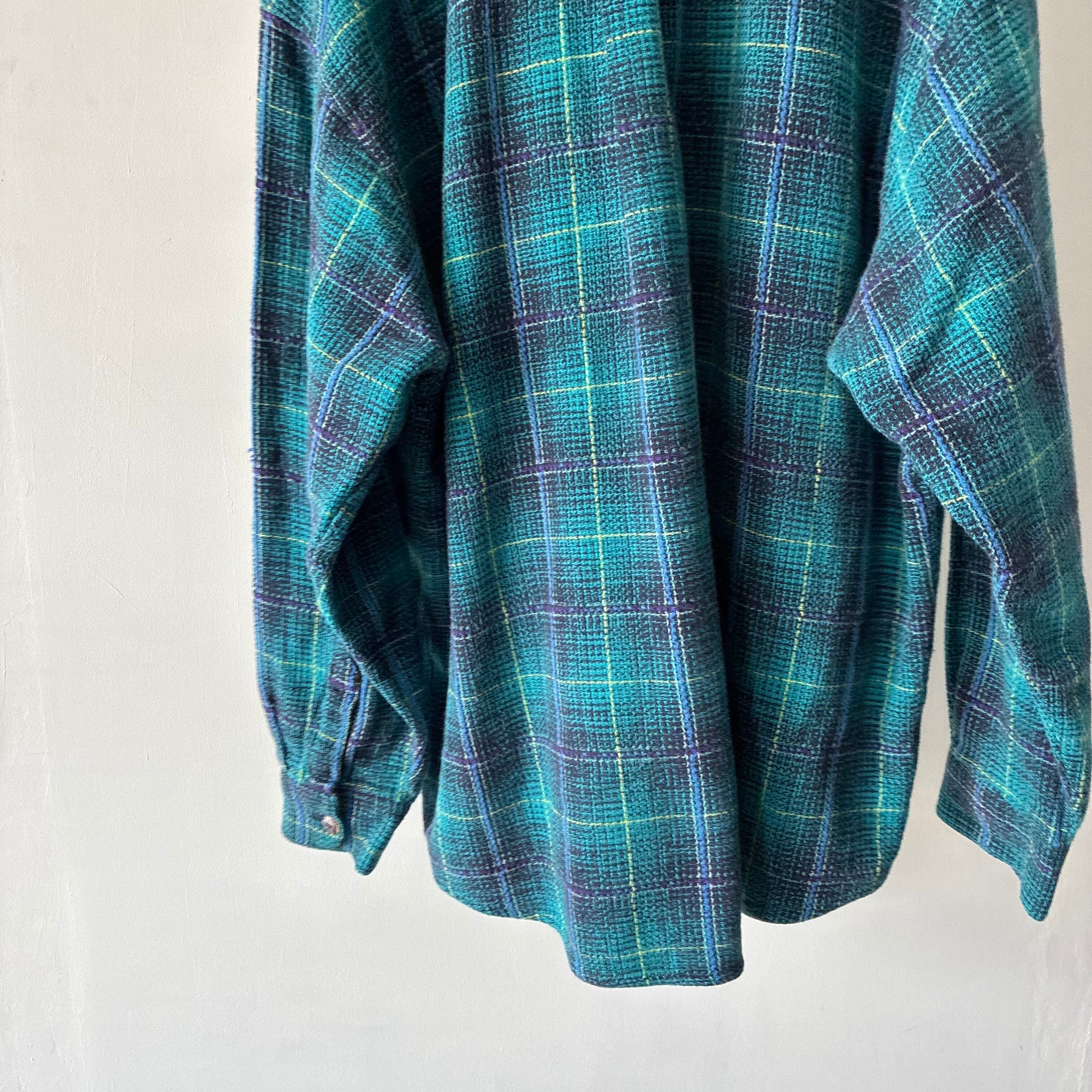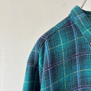 ターコイズブルーを基調とした美しいチェック柄に、パープルやイエローのラインが絶妙なアクセント