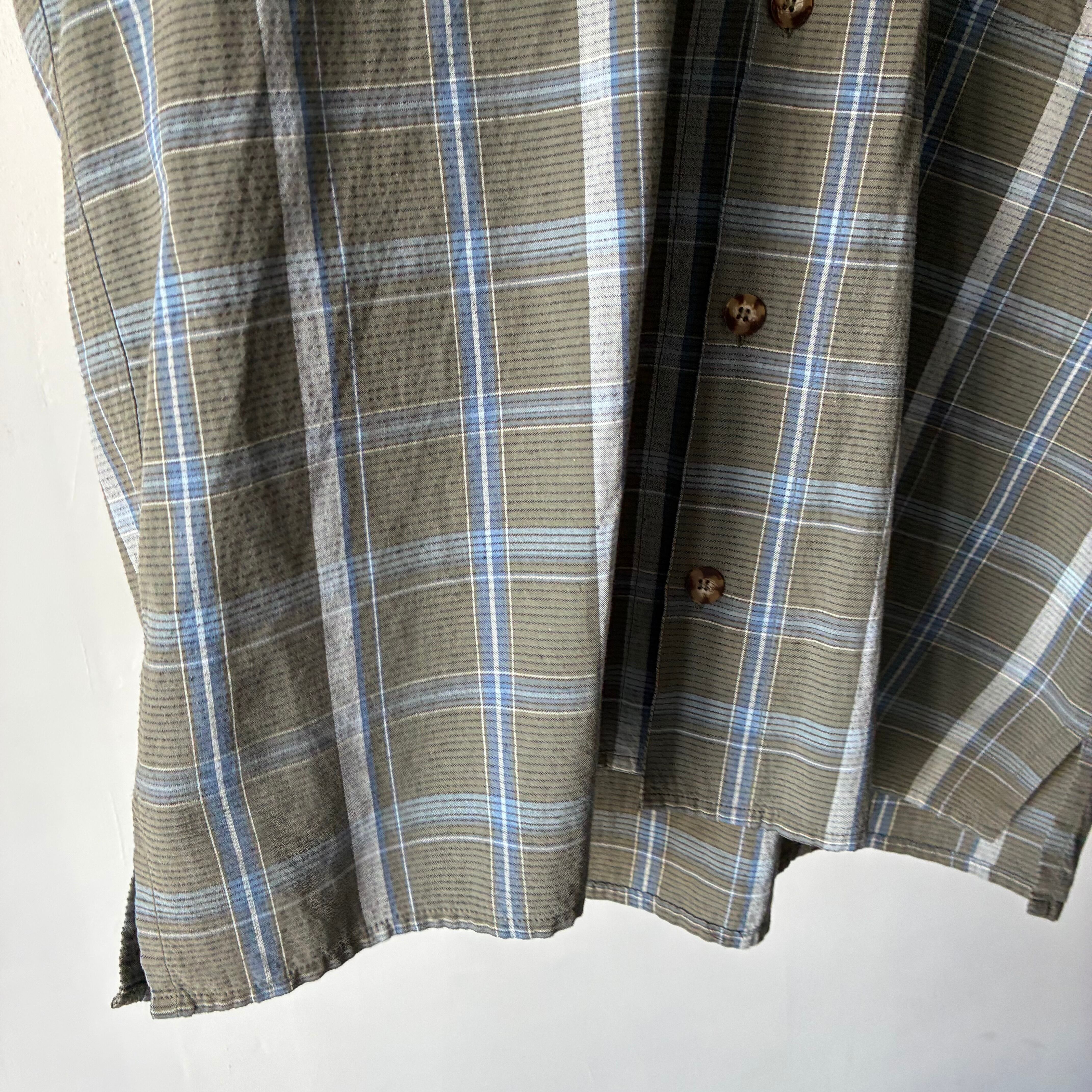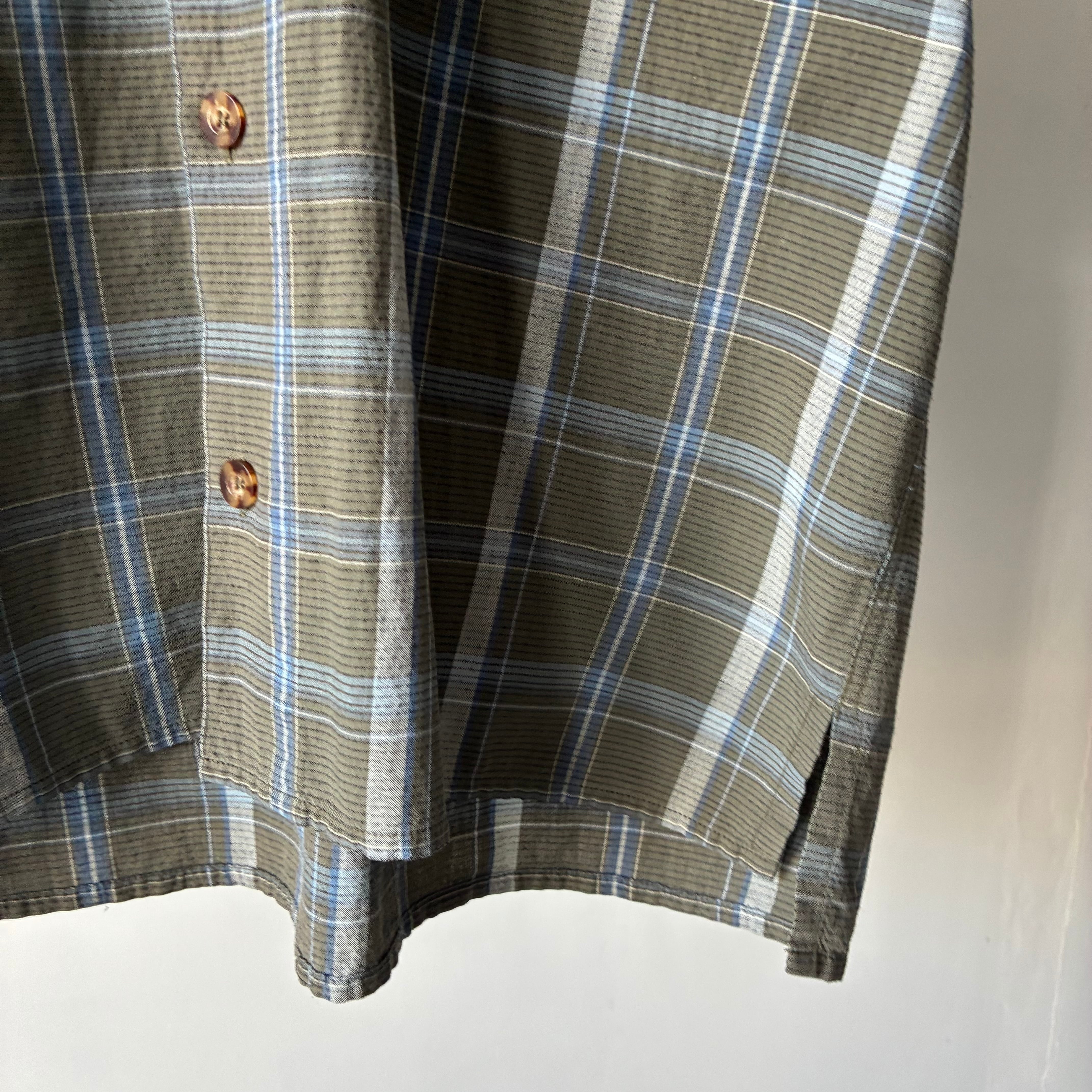 ゆったりとしたボックスシルエットに、落ち着いたカーキベース×ブルーラインのチェック柄が映える一着