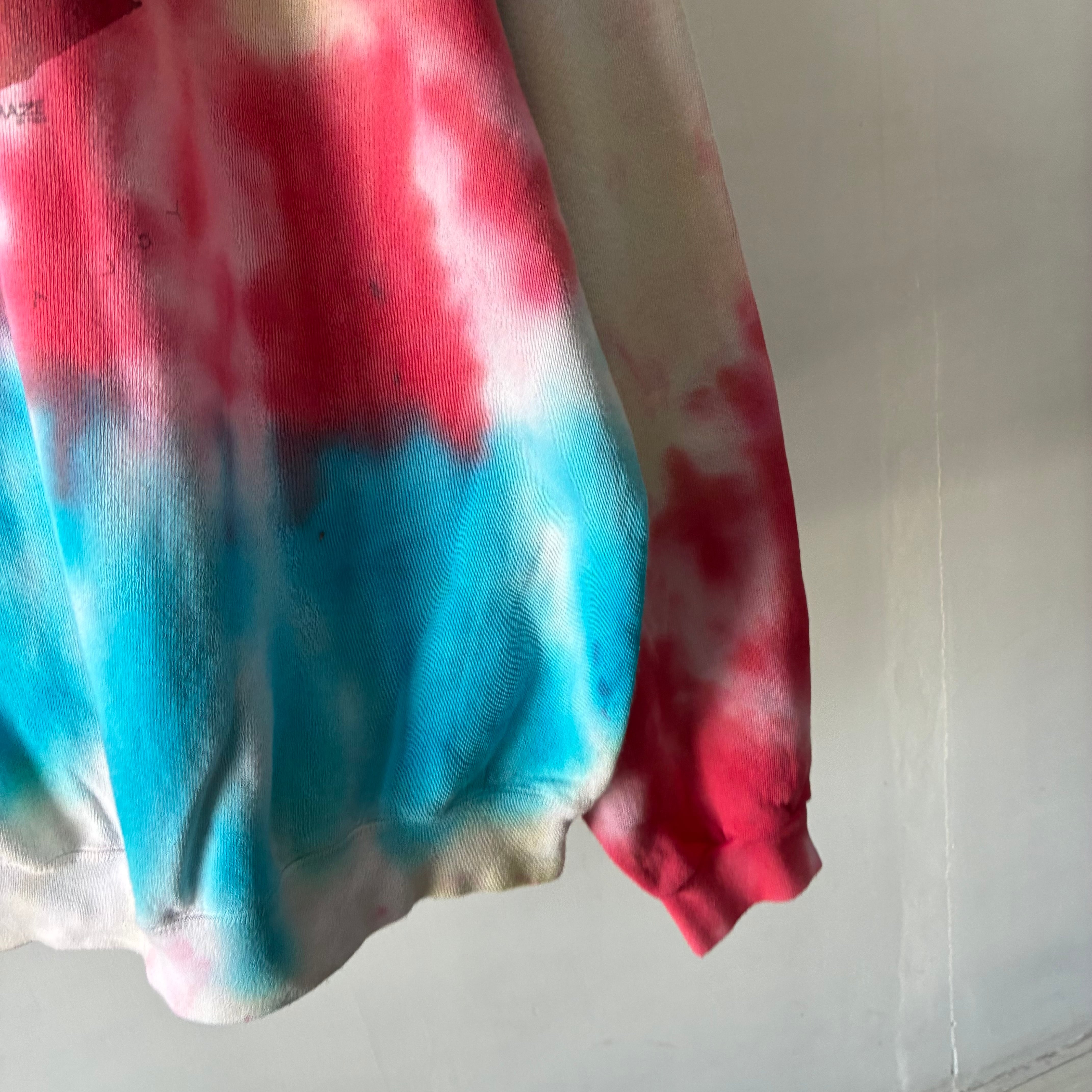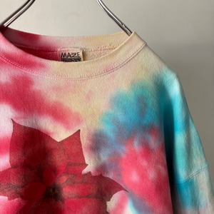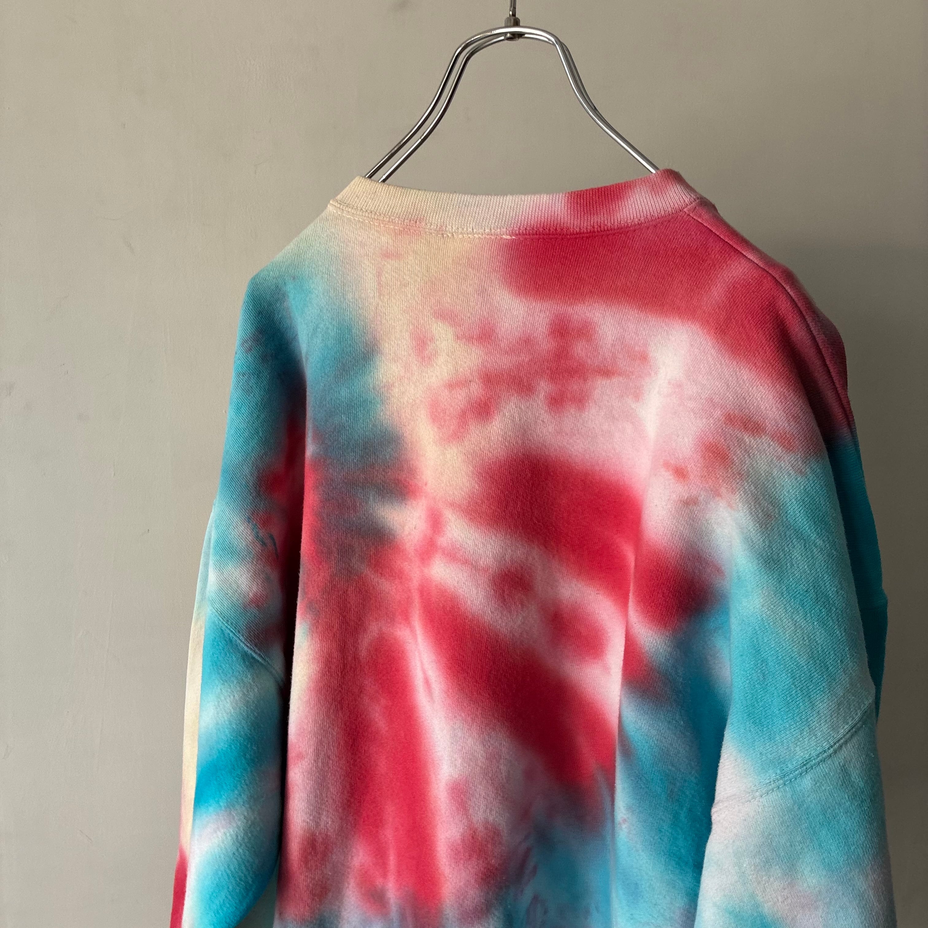 鮮やかなターコイズブルー、ピンク、イエローが絡み合い、個性を放つタイダイデザインが目を引きます