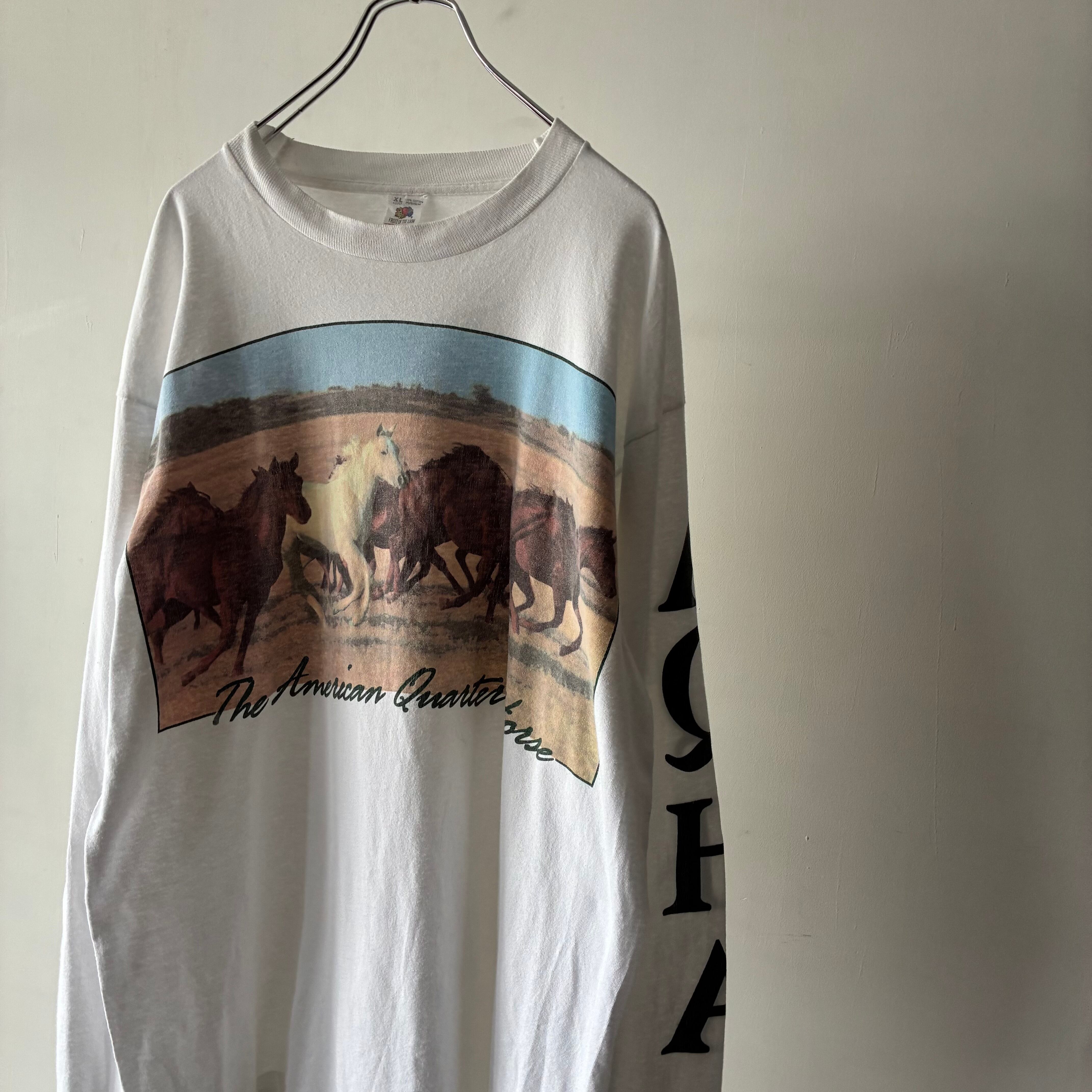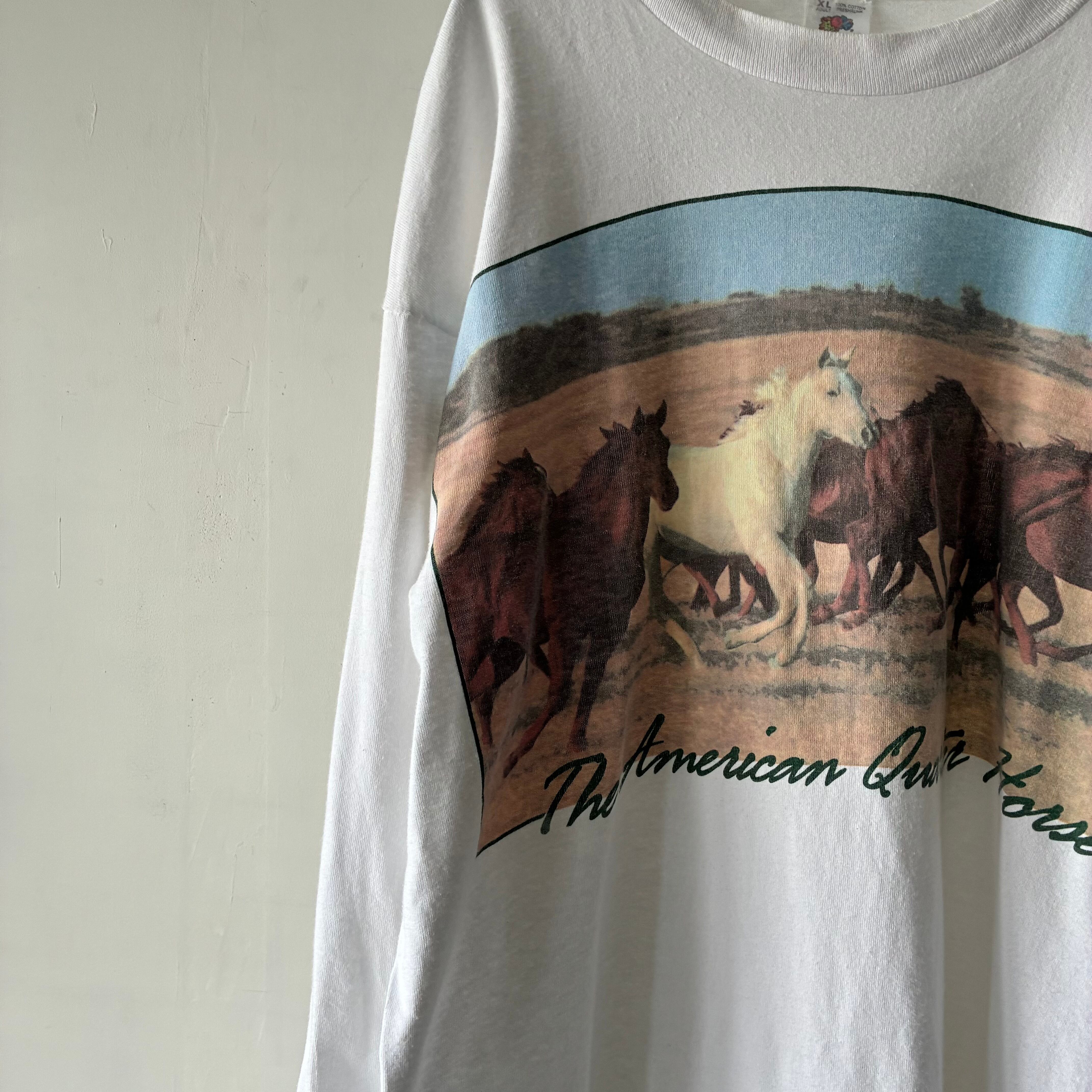 アメリカ西部文化・カウボーイ精神・自由と自然の象徴として長年愛されてきたアメリカンクォーターホースの美しいフォトプリントTシャツ