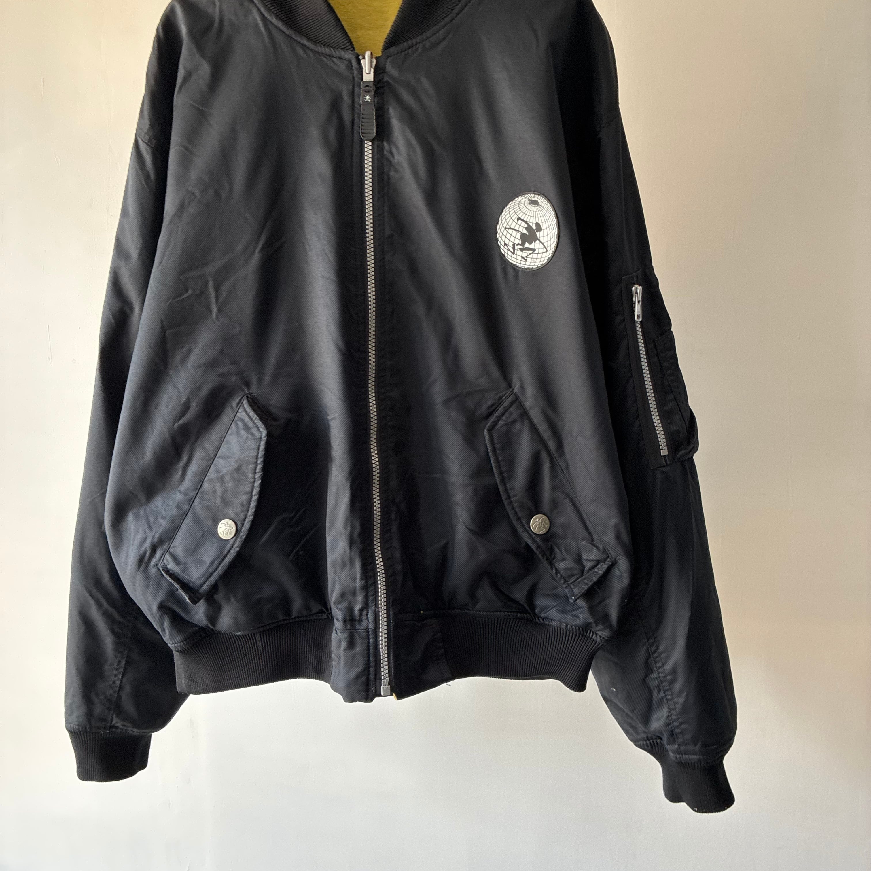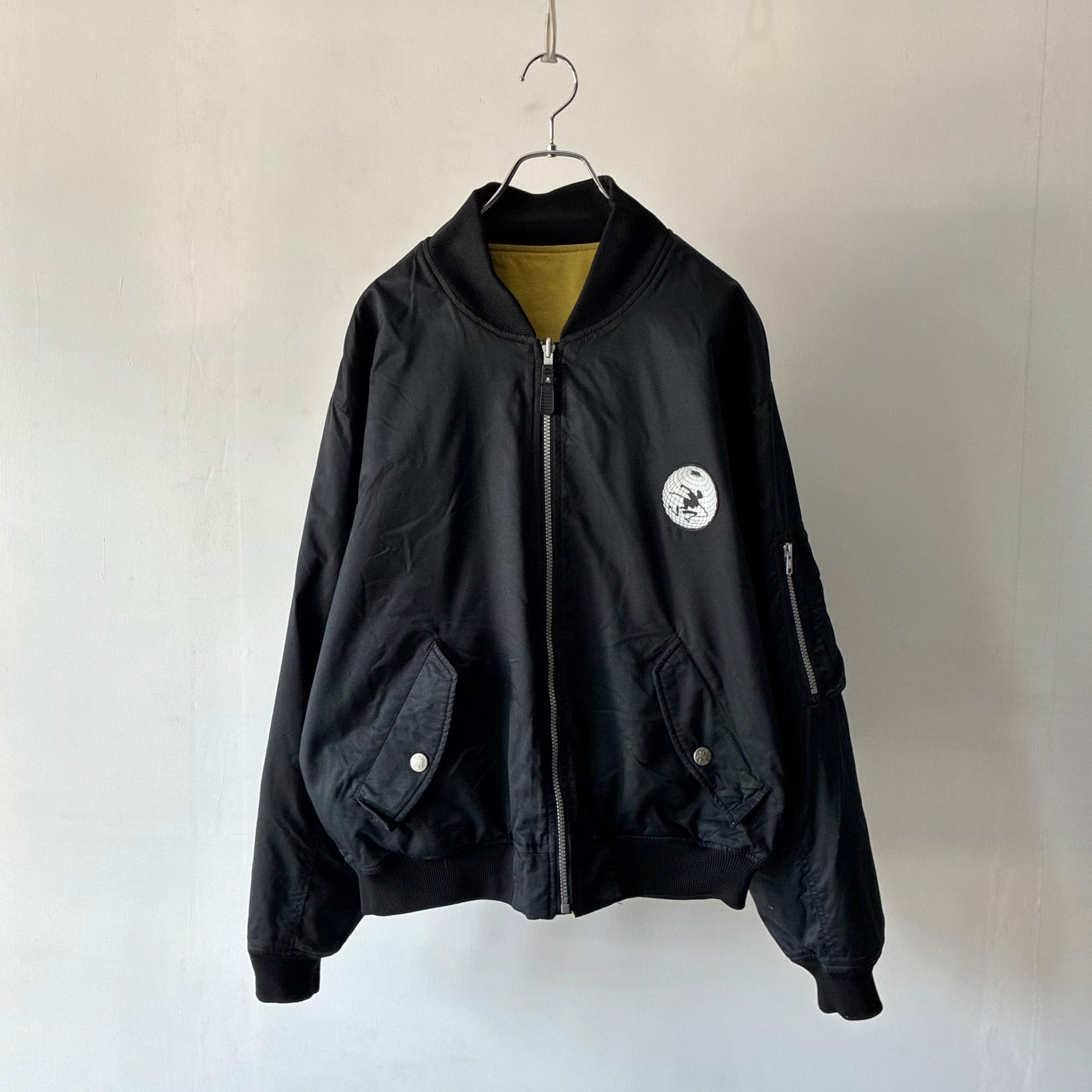 胸元には人物モチーフのワッペンが配置され袖にはユーティリティポケットを備え、MA-1風のディテールも魅力的