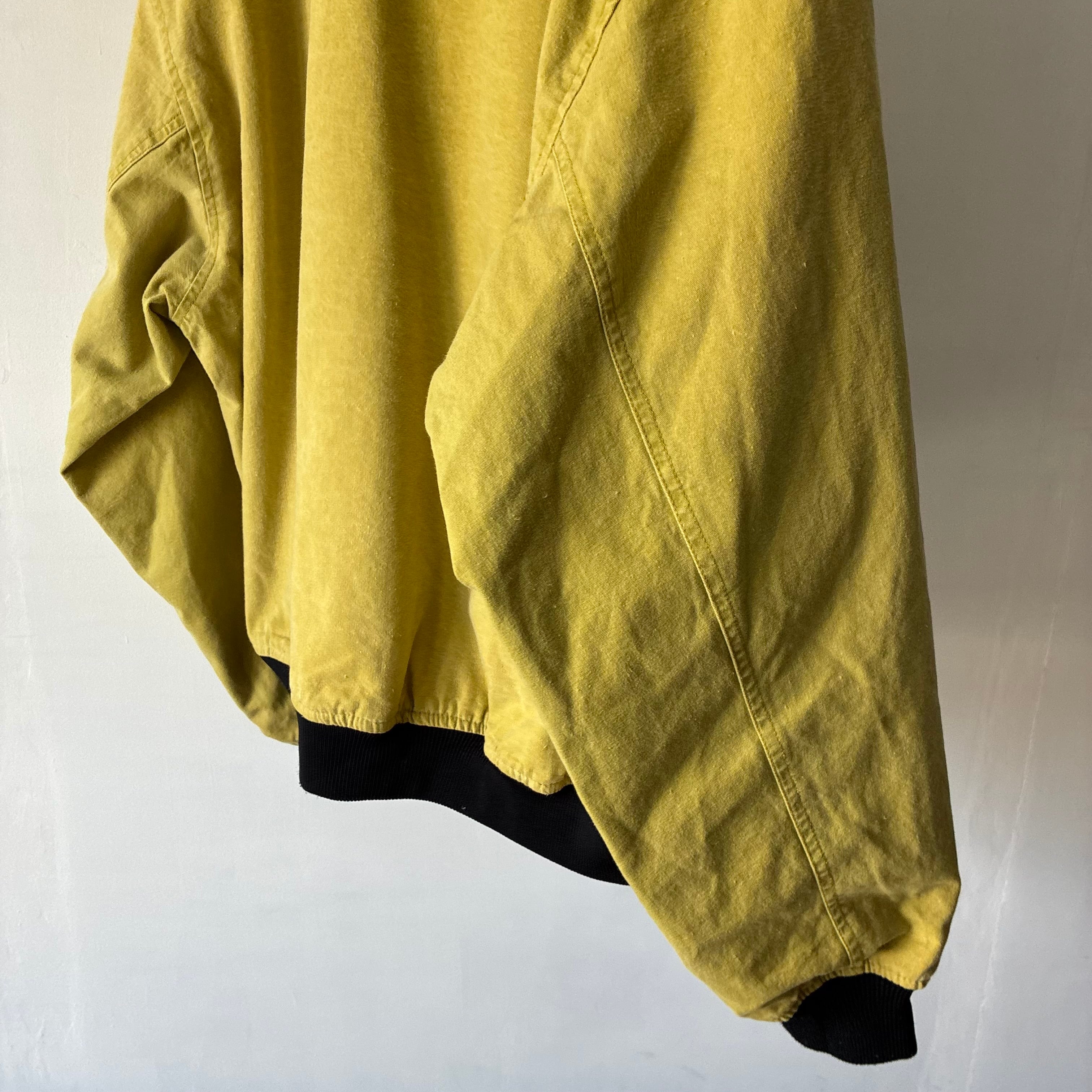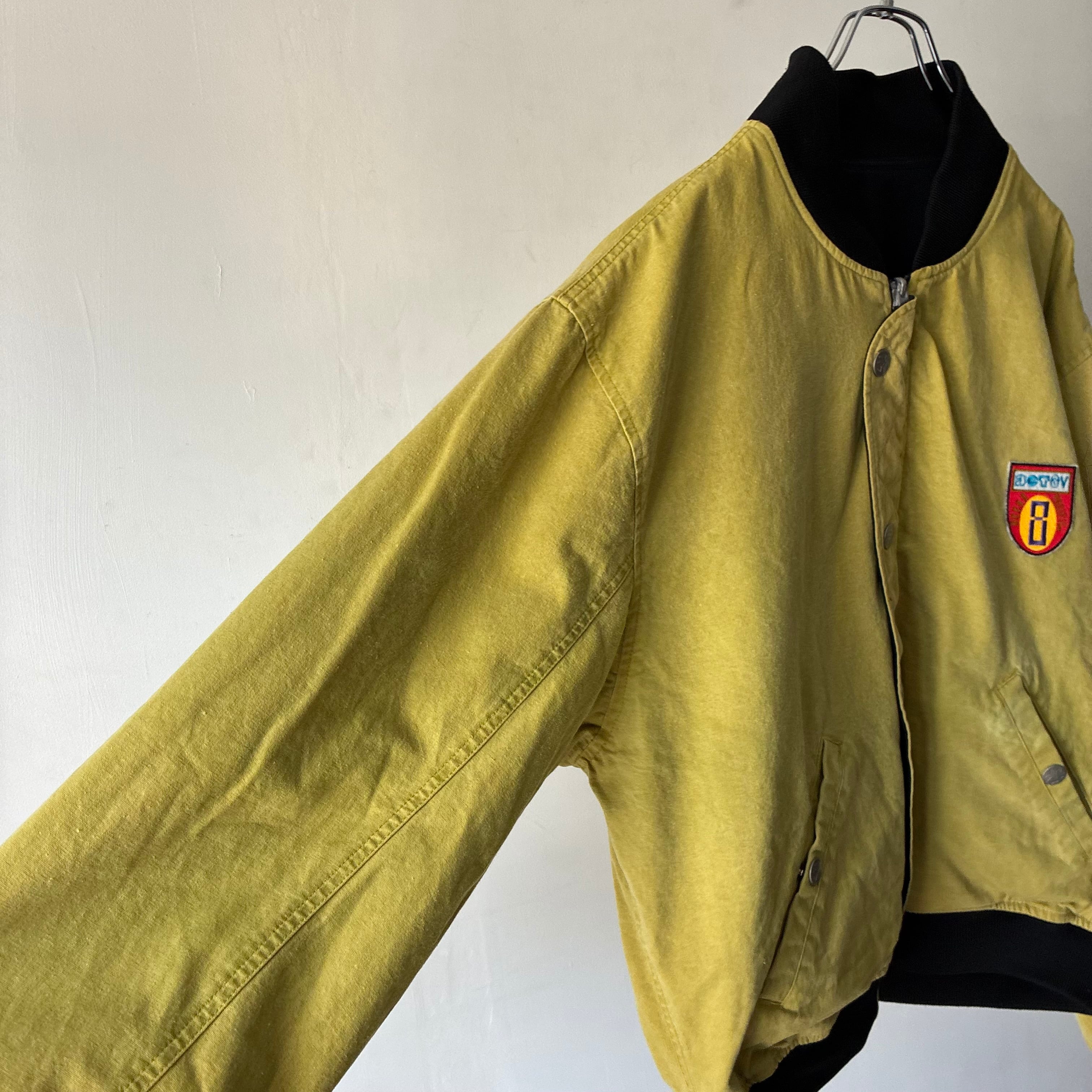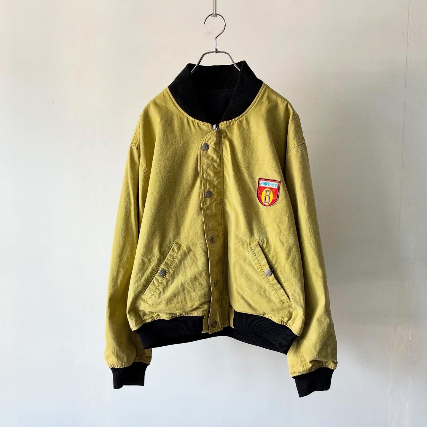 表地はフェード感のあるマスタードイエローのコットン地で、胸元にはレトロなユニフォームを思わせるパッチワーク