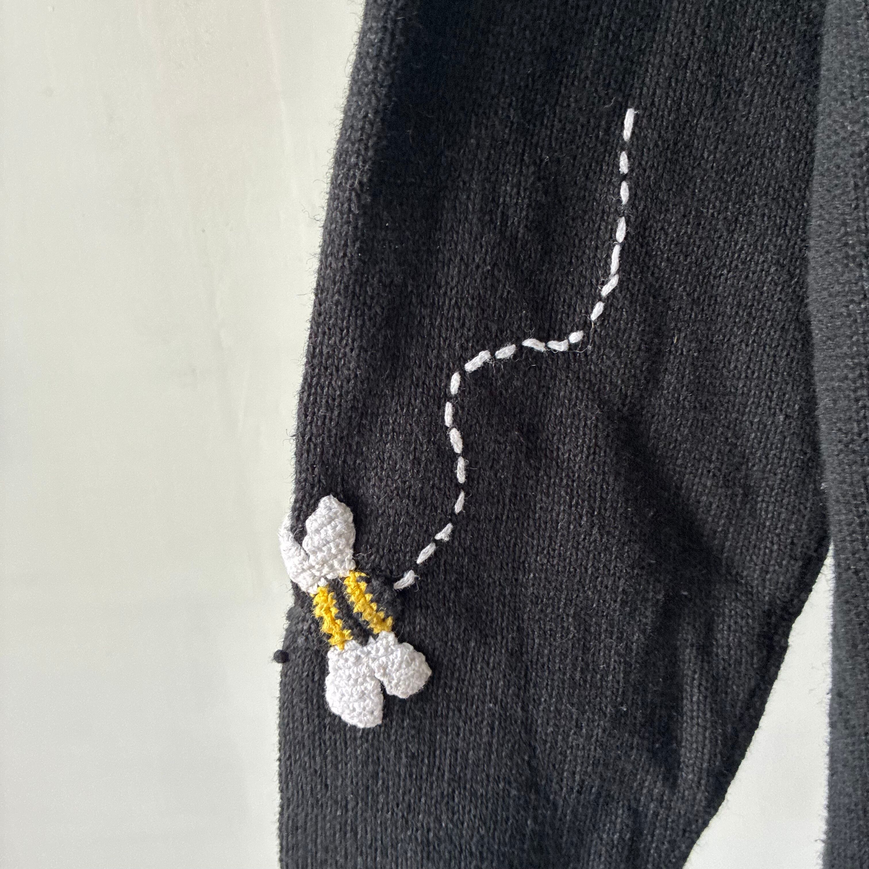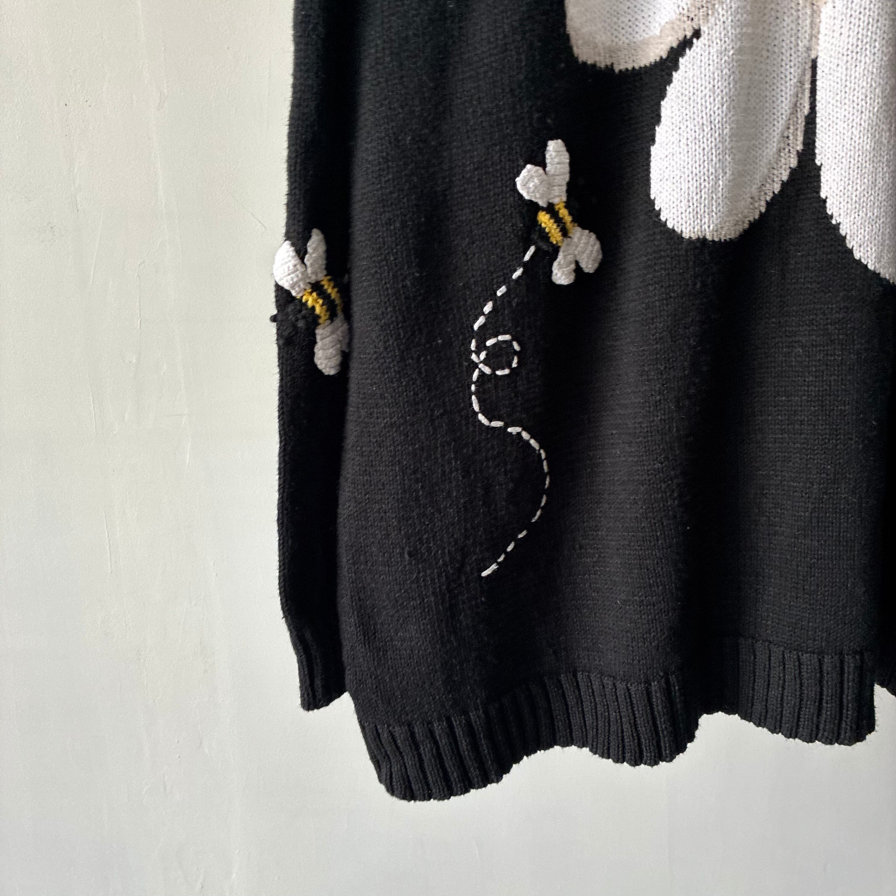 フロント・バック・袖に配置されたデイジーのジャガード編みに加え、ミツバチの部分は立体感のある刺繍で表現されており愛らしくも手の込んだデザイン
