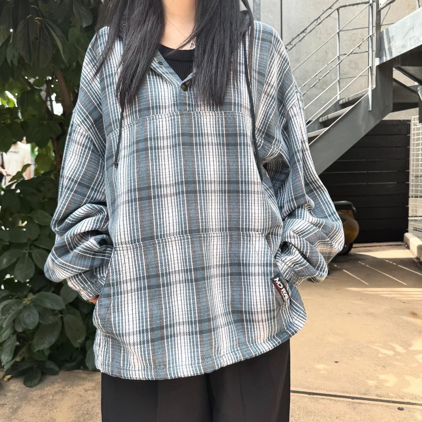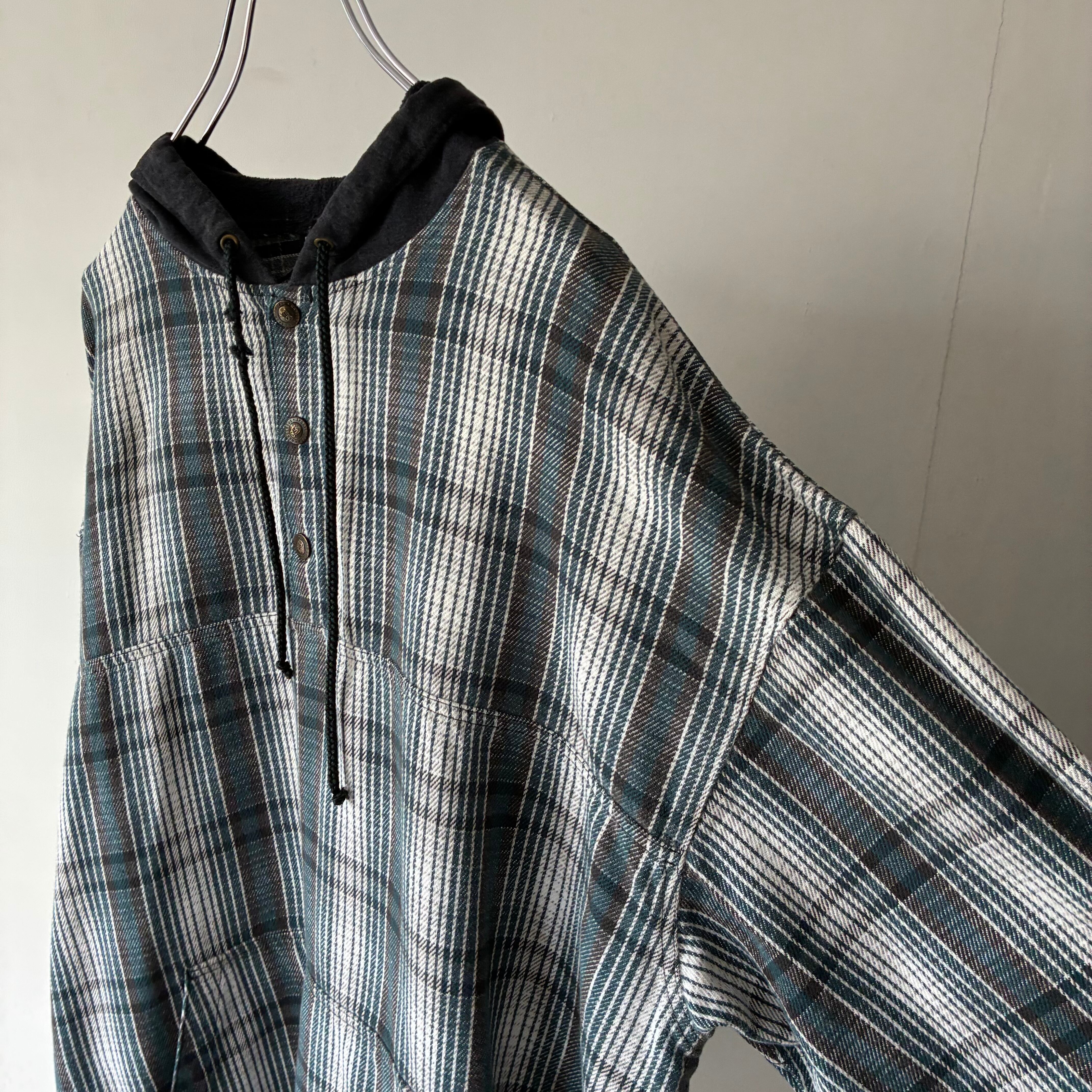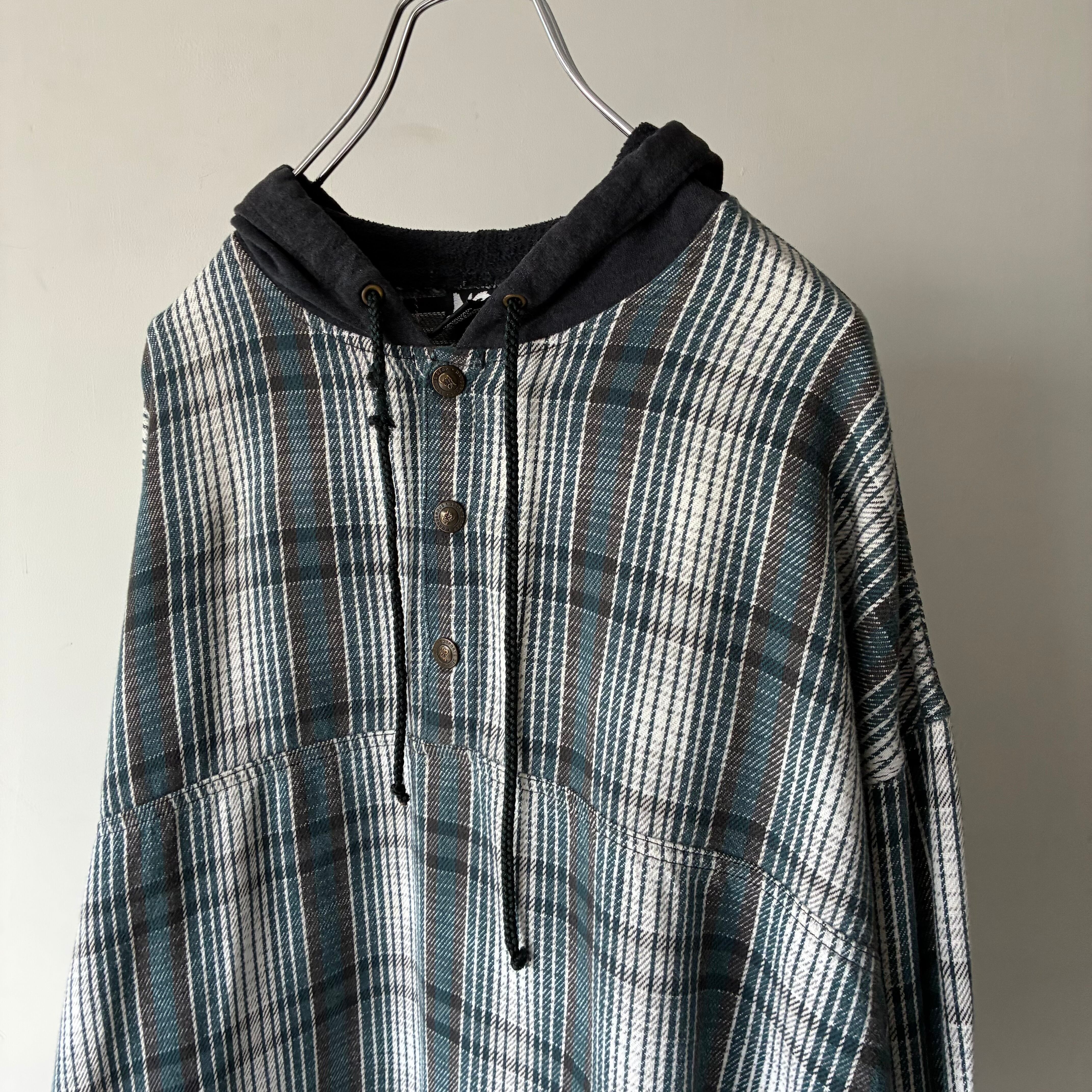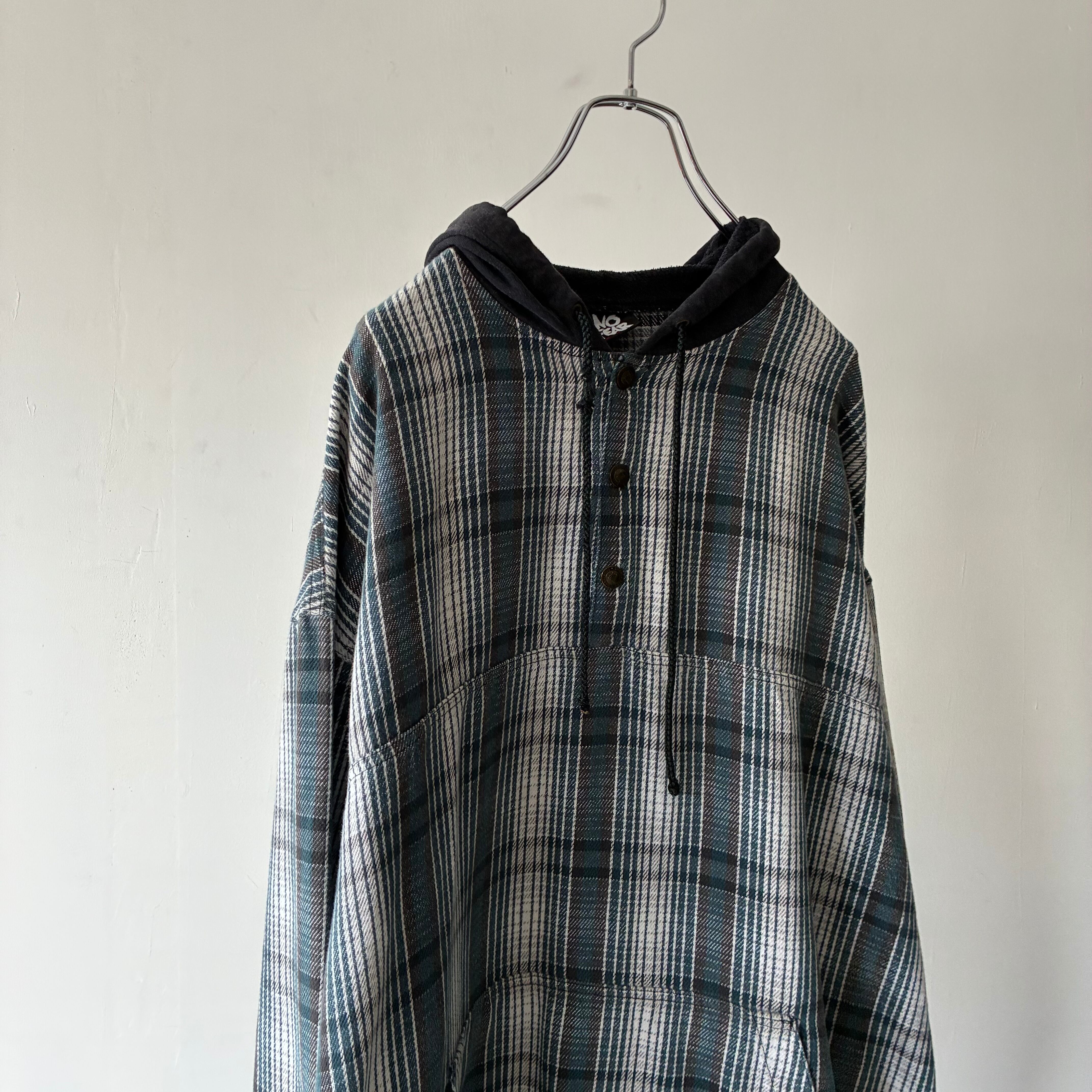 フランネル素材にブラックフードをレイヤードしたプルオーバー仕様のフーディシャツ