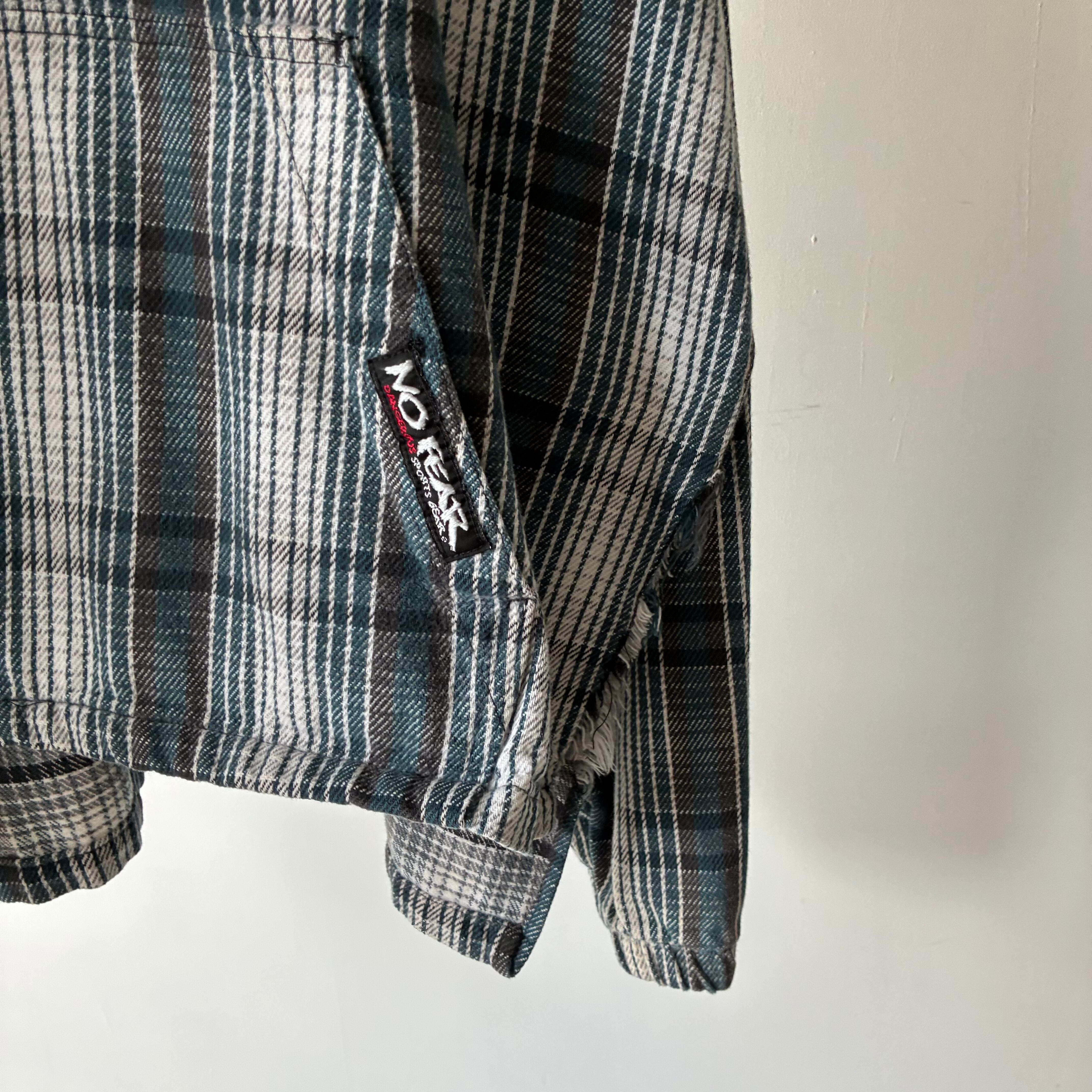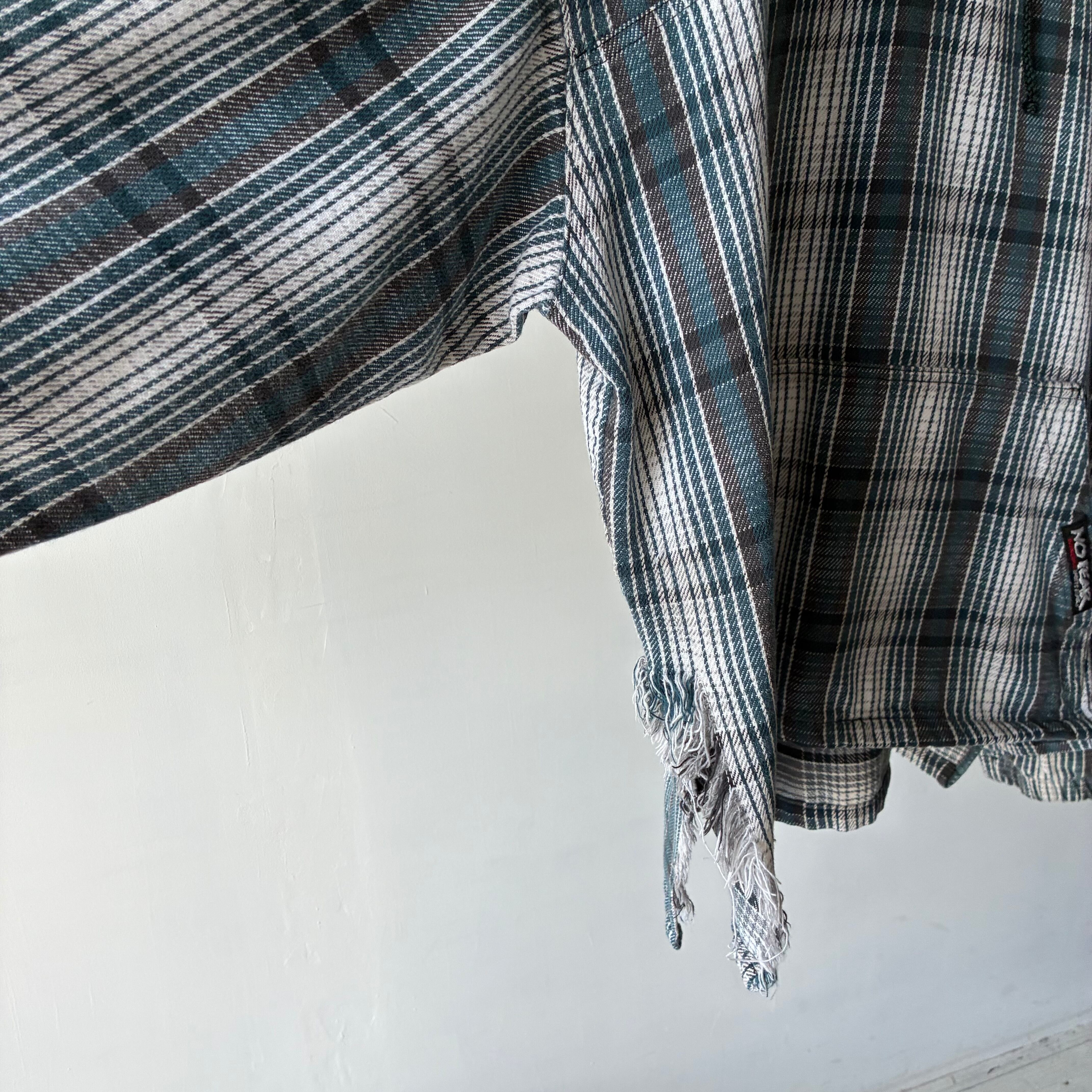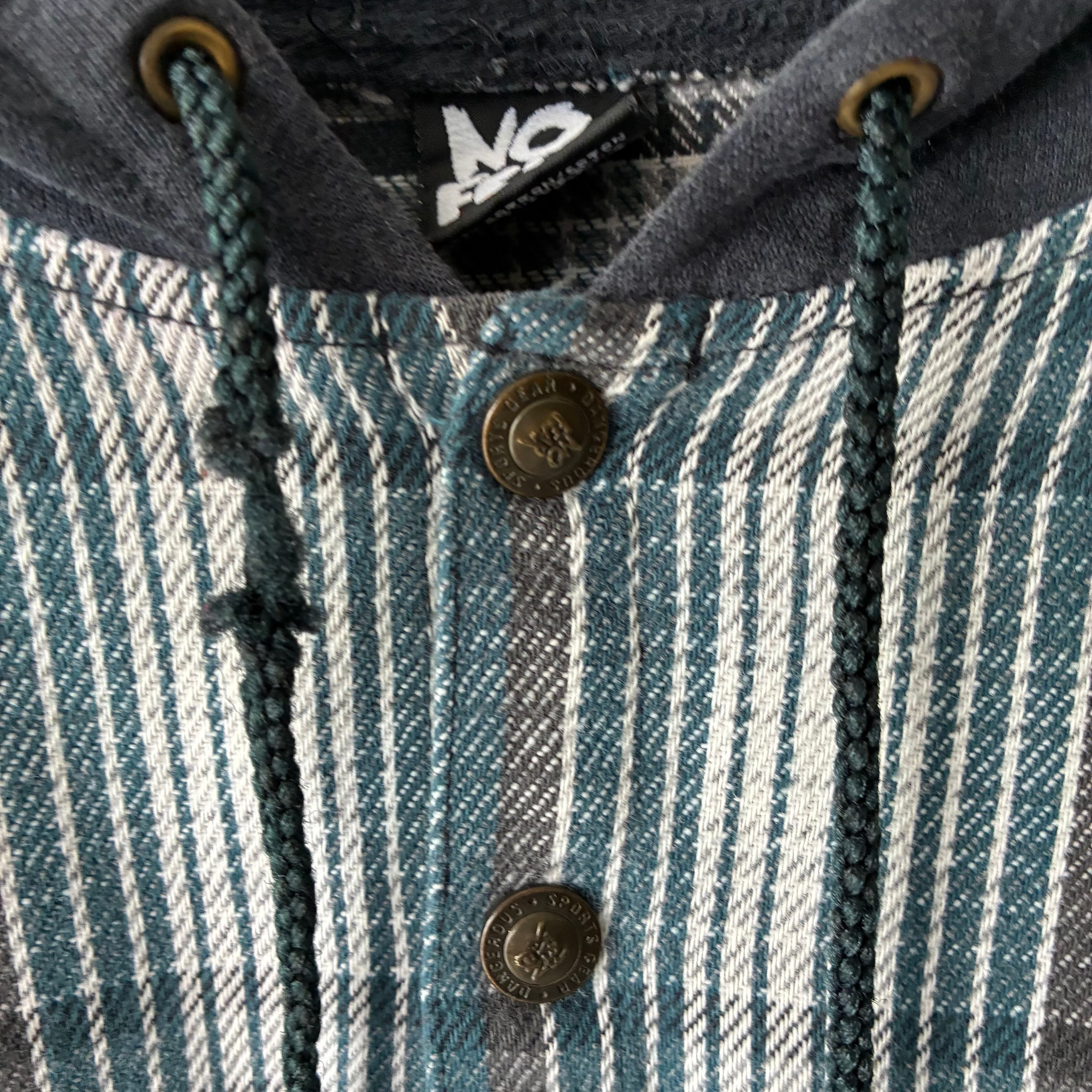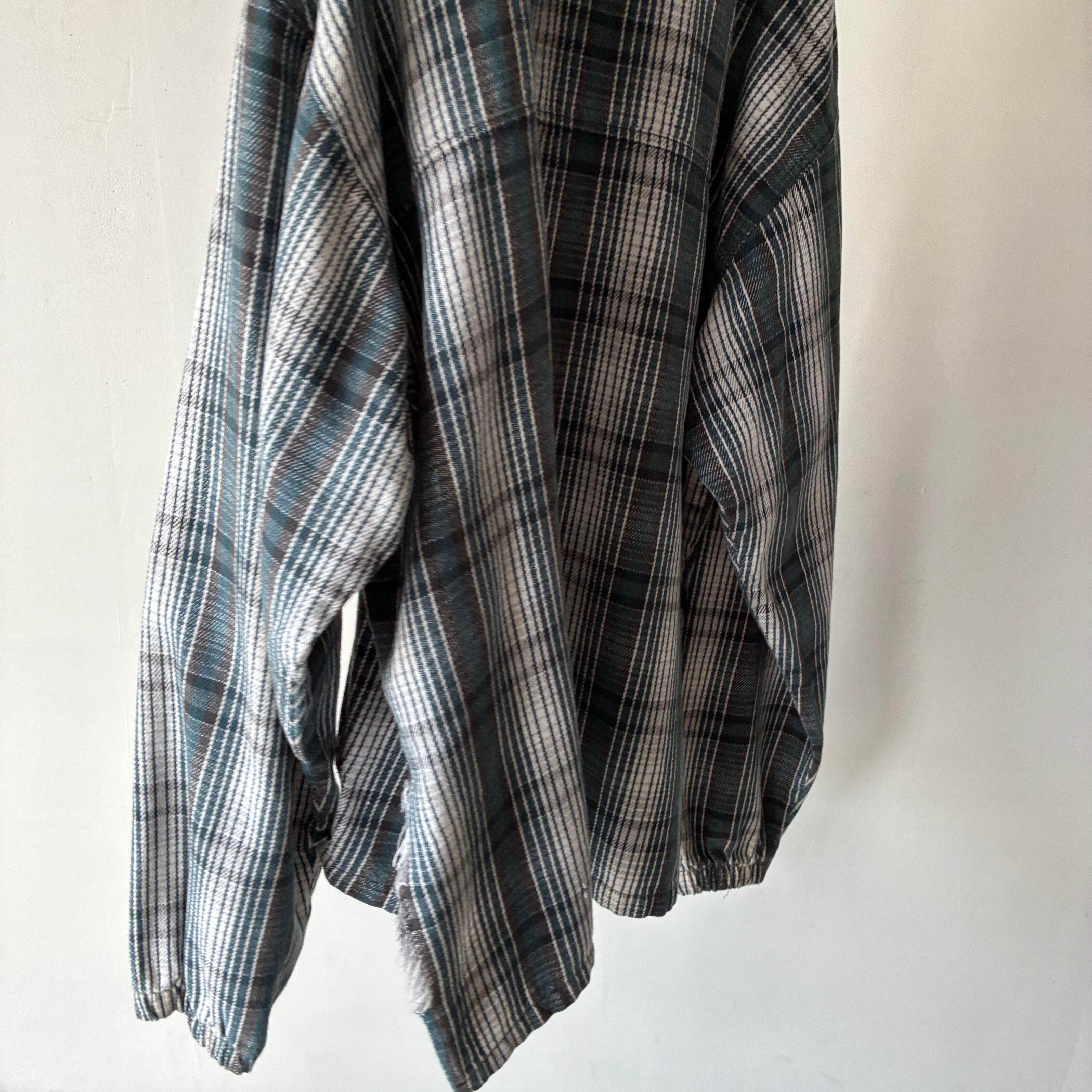 フランネル素材にブラックフードをレイヤードしたプルオーバー仕様のフーディシャツ
