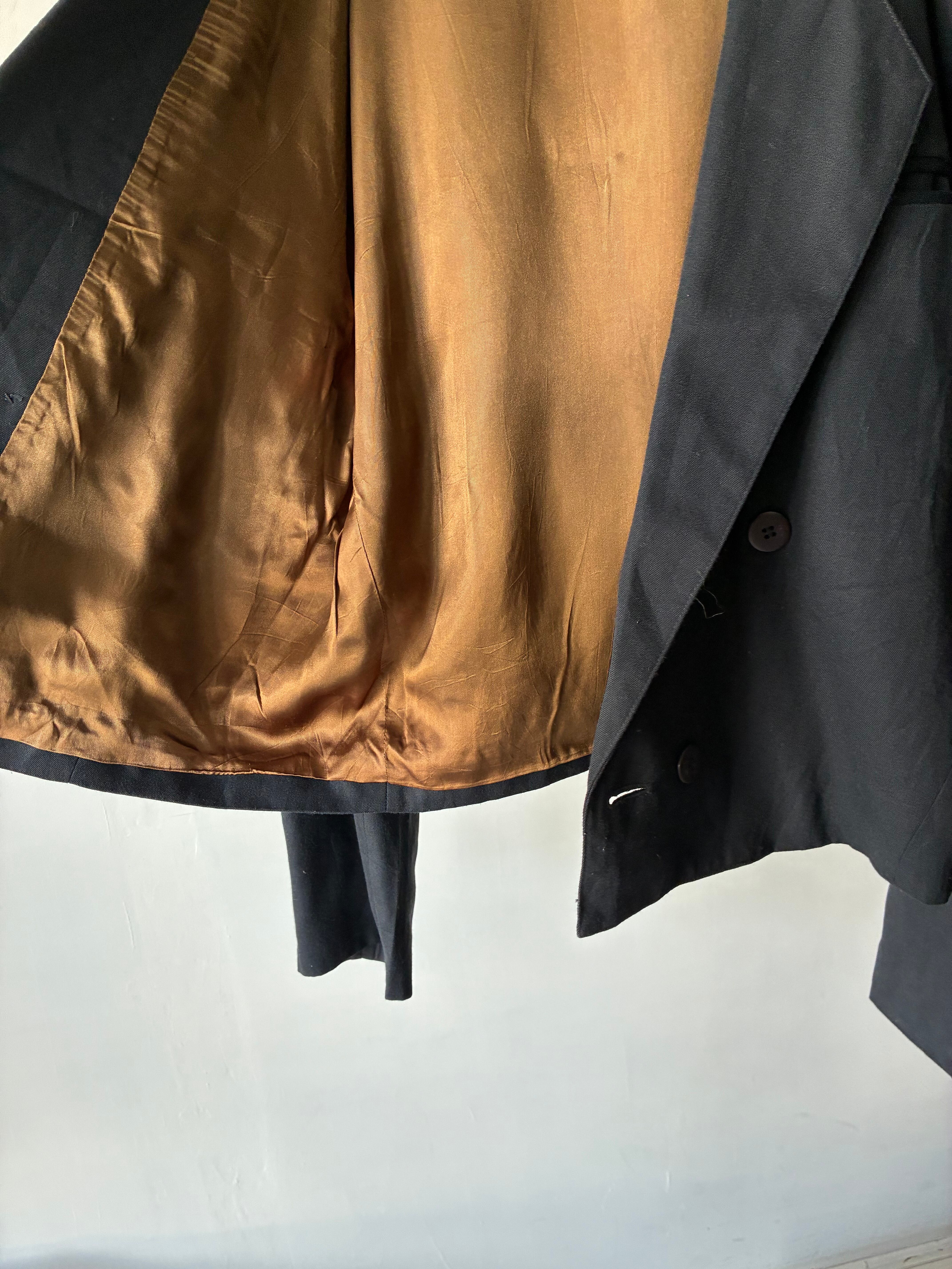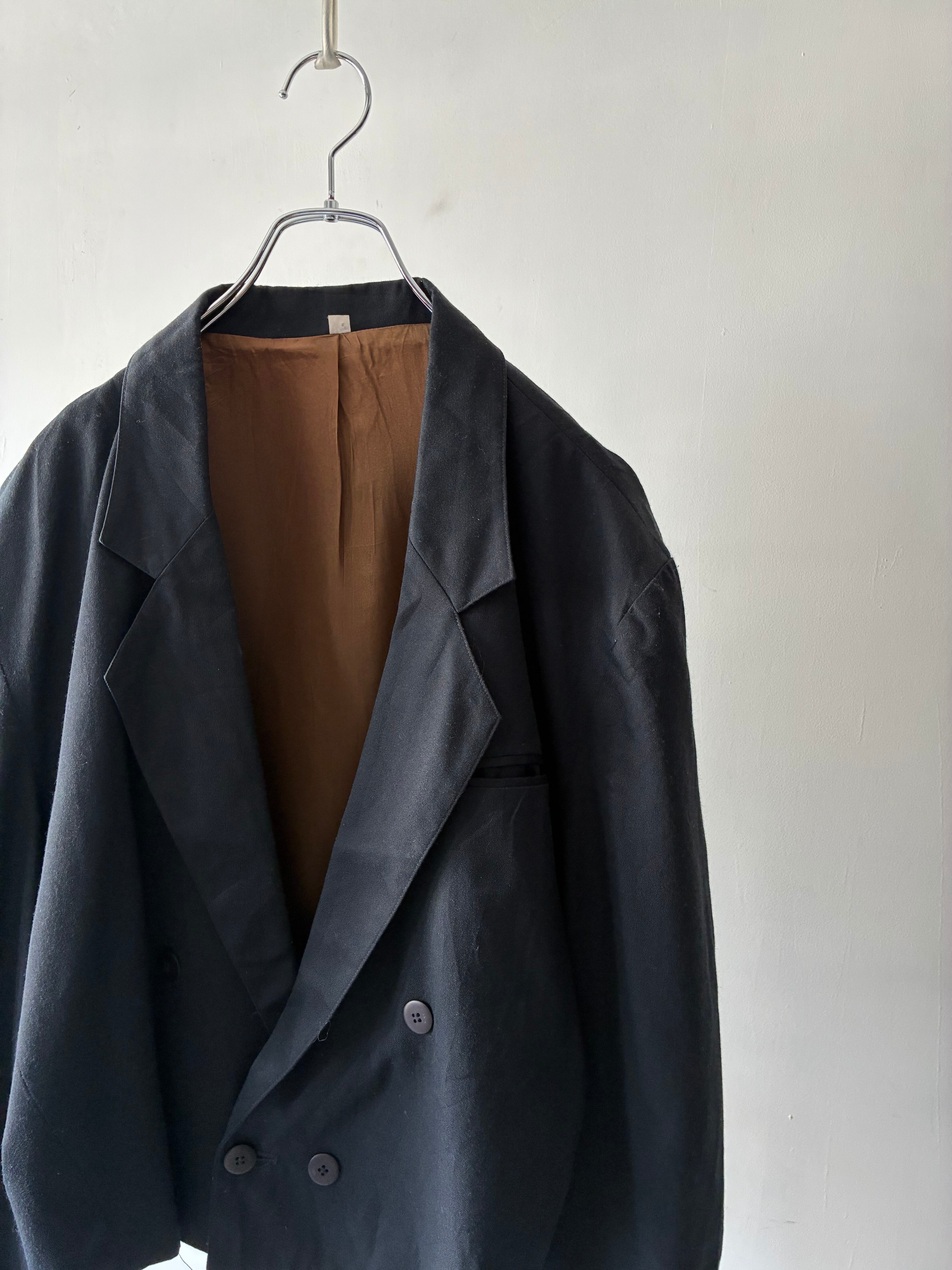 フロントはダブルブレスト仕様で、ゆったりとしたシルエットとドロップショルダーが特徴