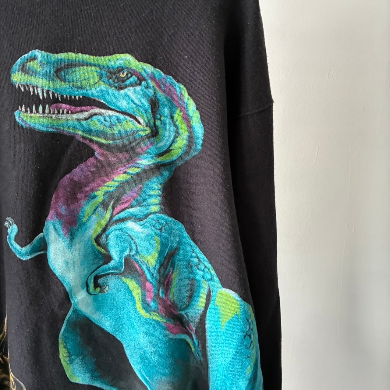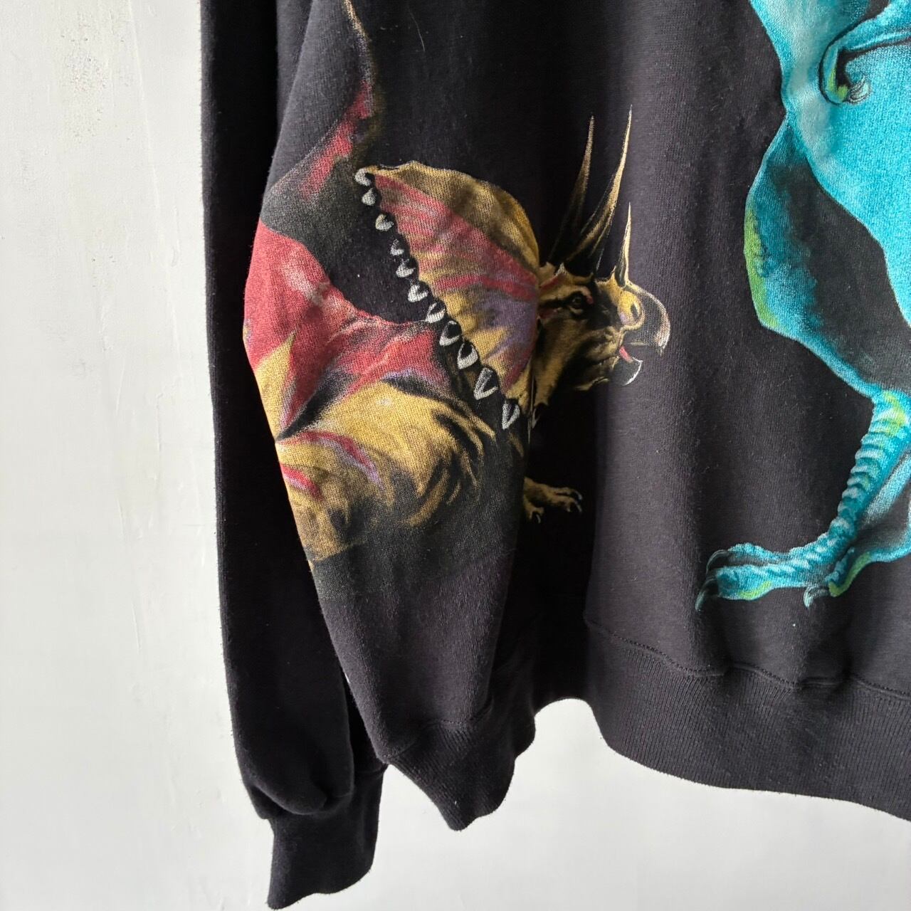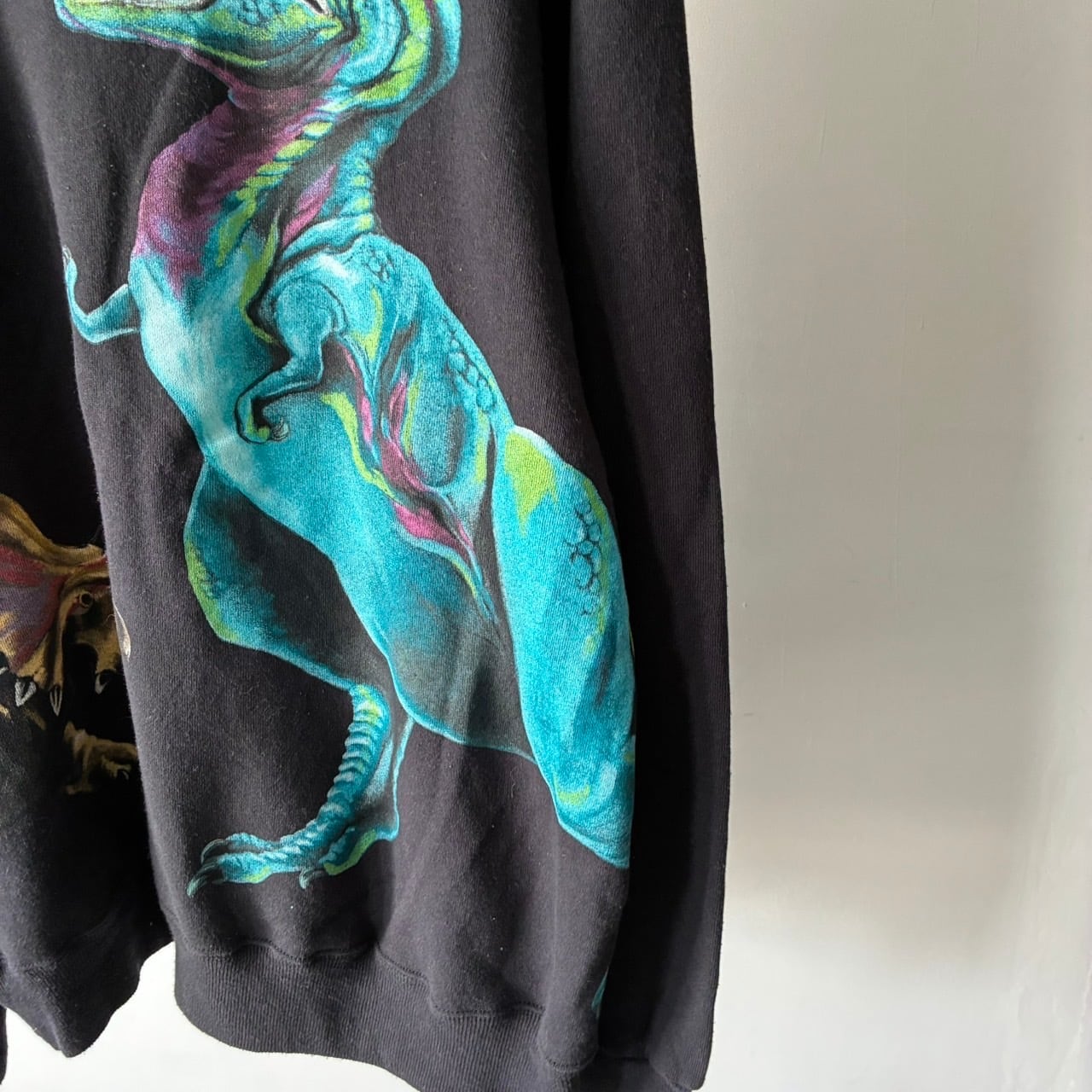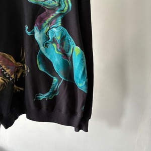 ブラックボディに背面まで渡る大判な恐竜が映えるプリントスウェット