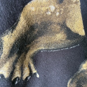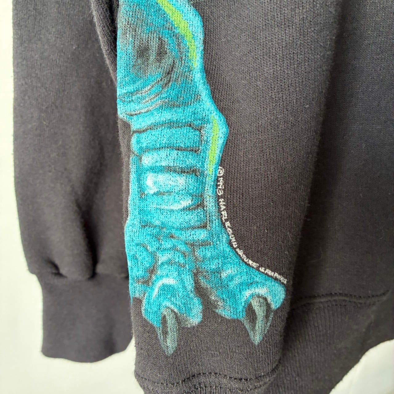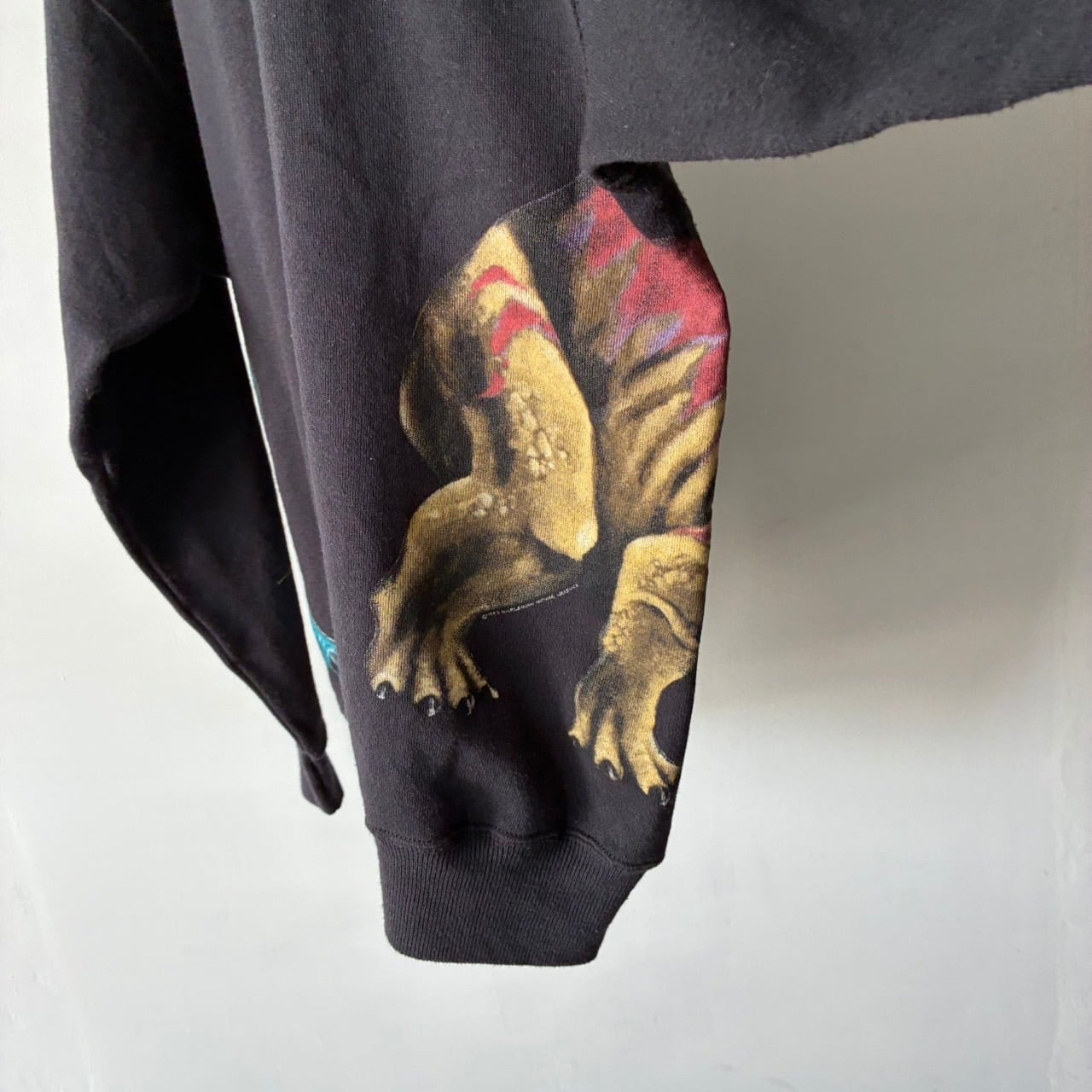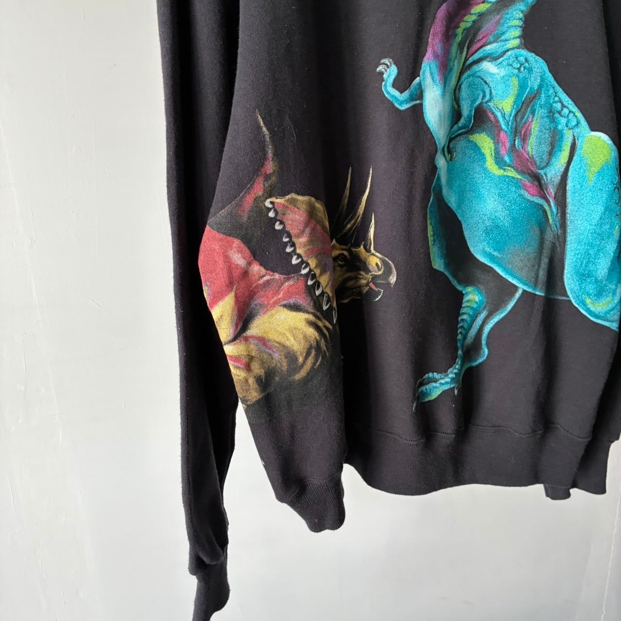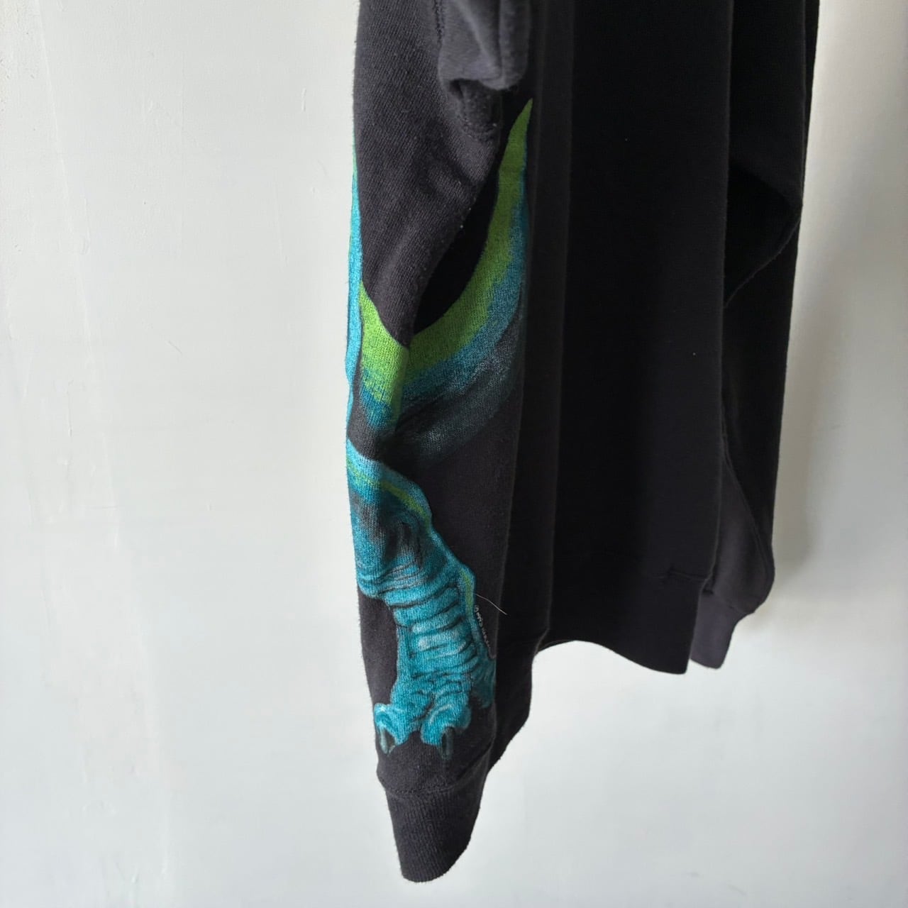 ブラックボディに背面まで渡る大判な恐竜が映えるプリントスウェット