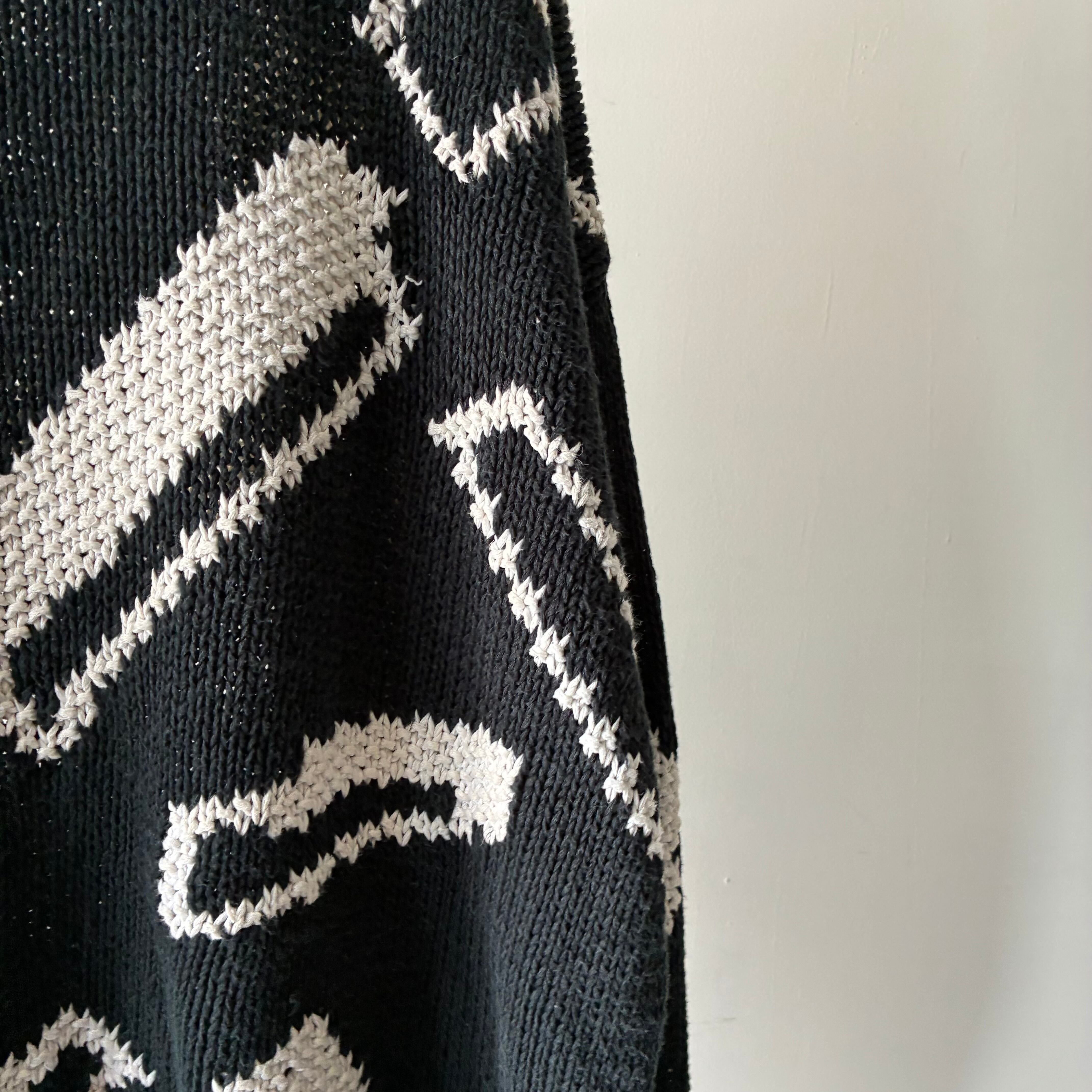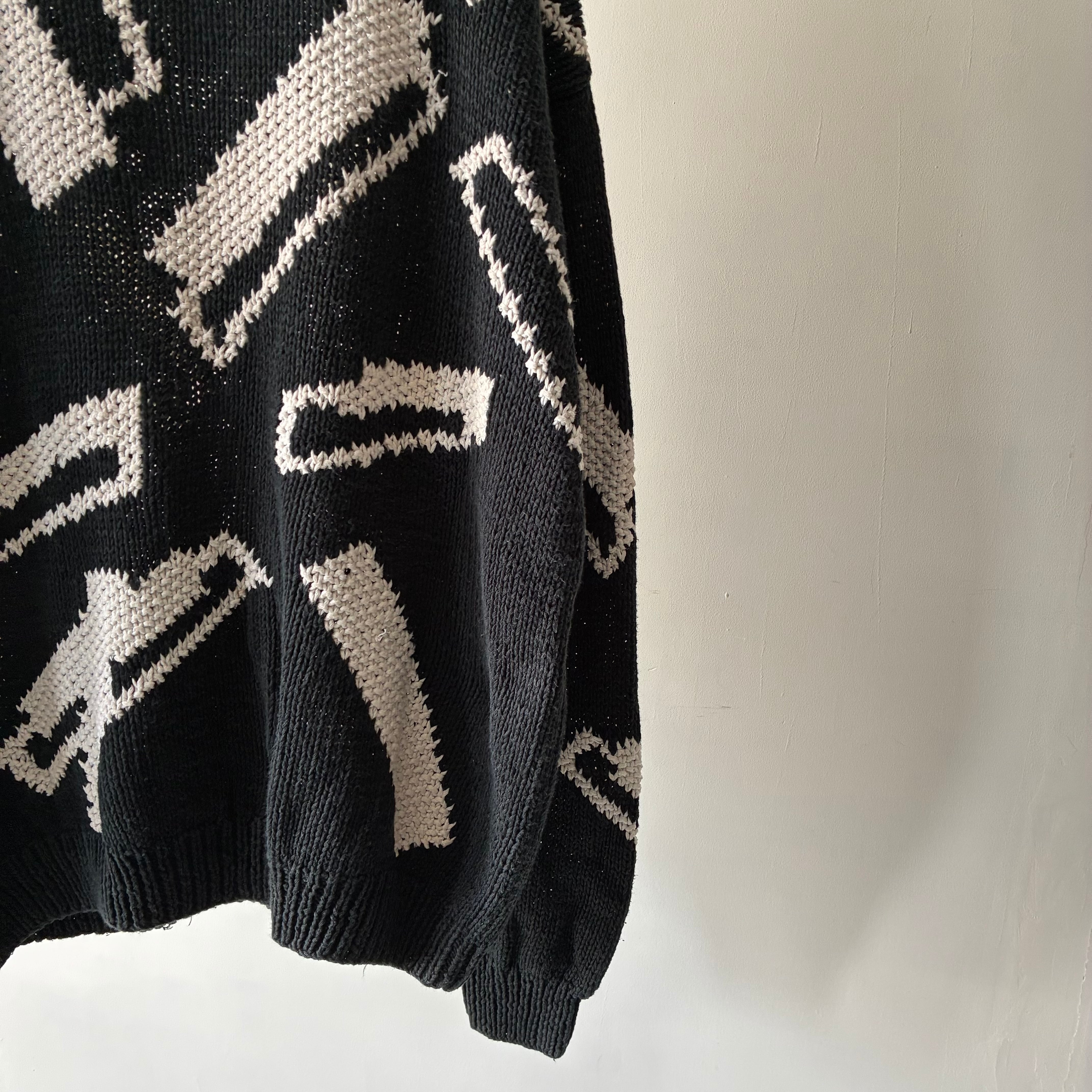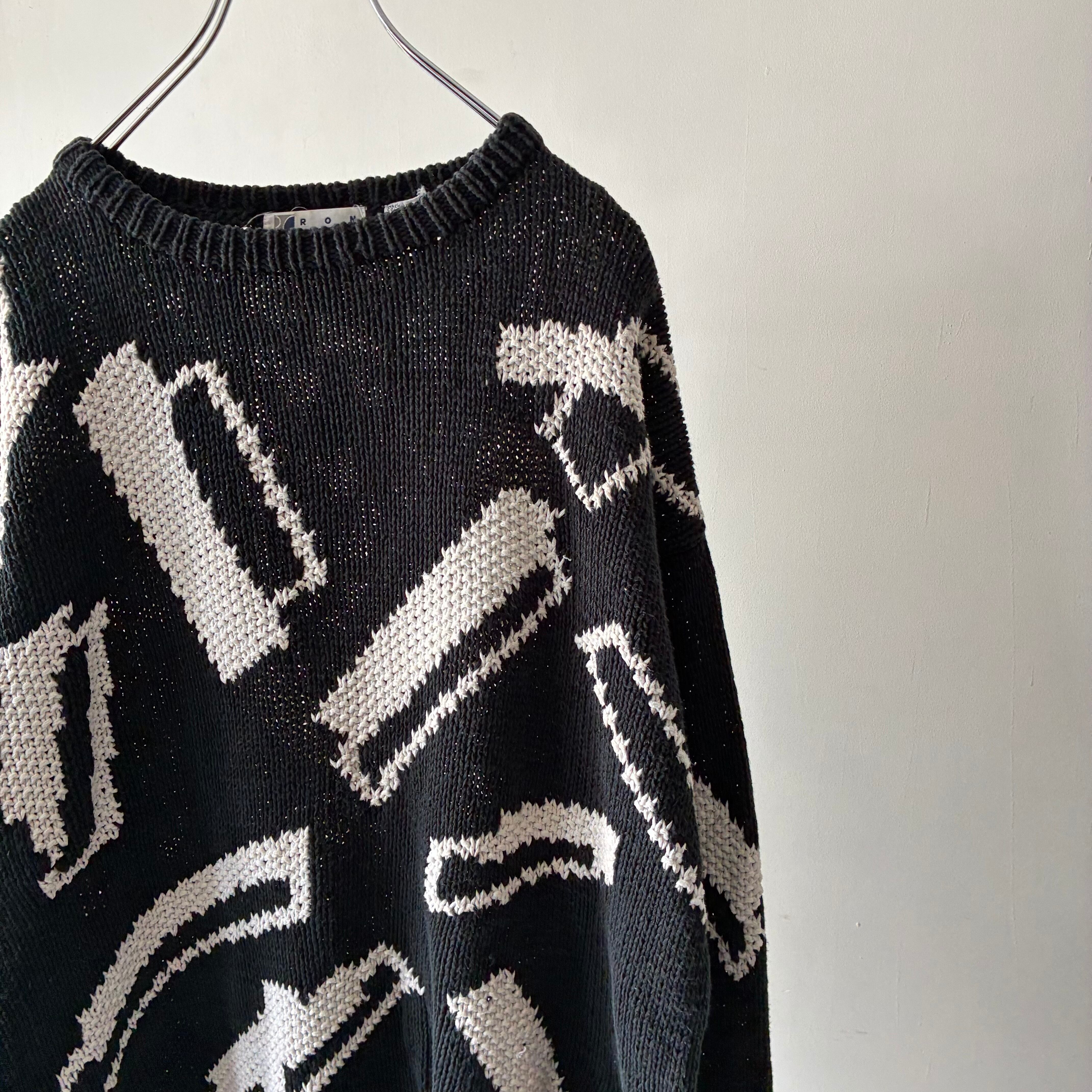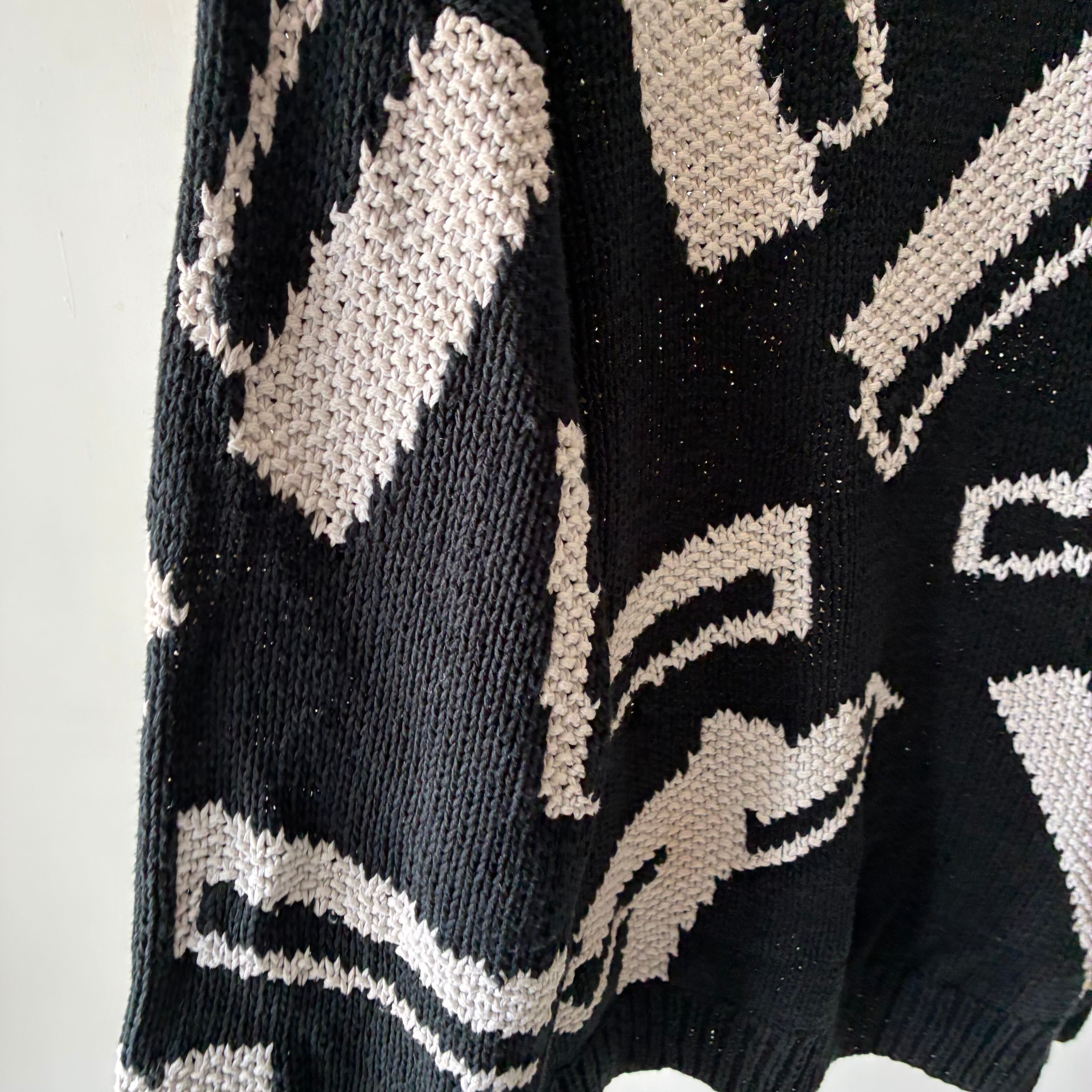 ブラックをベースにホワイトの抽象的なジオメトリック柄が編み込まれた90sらしいデザイン