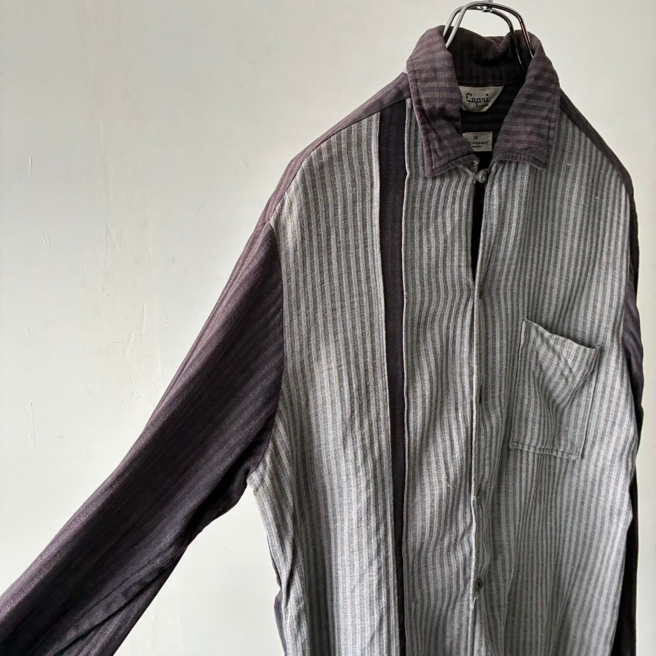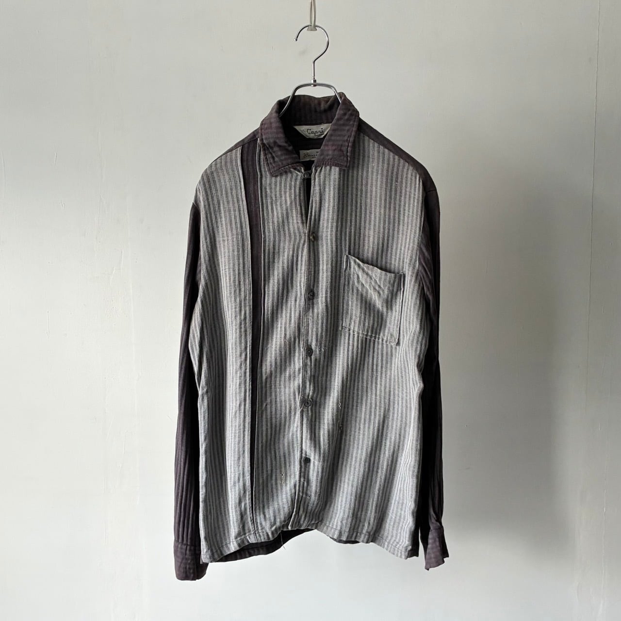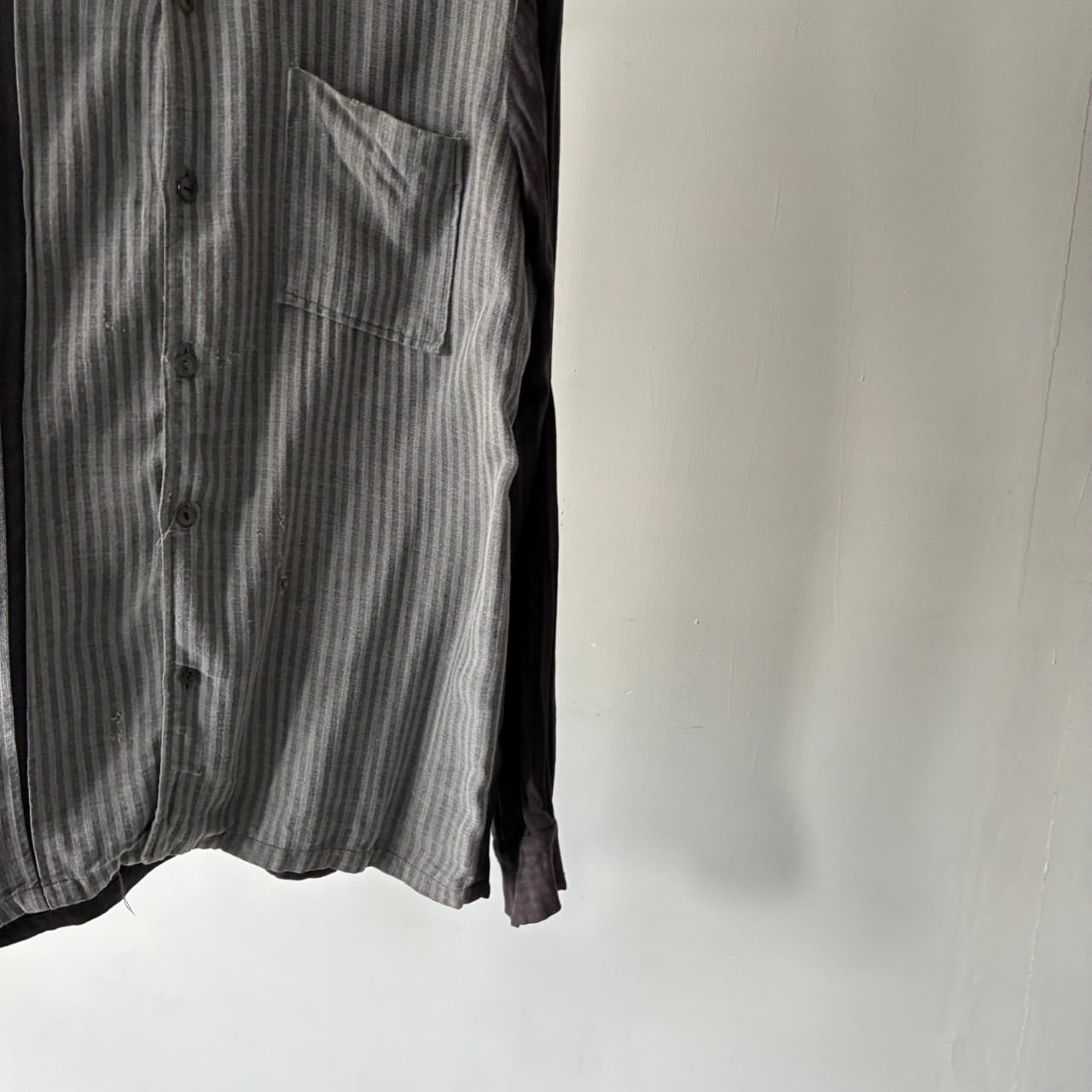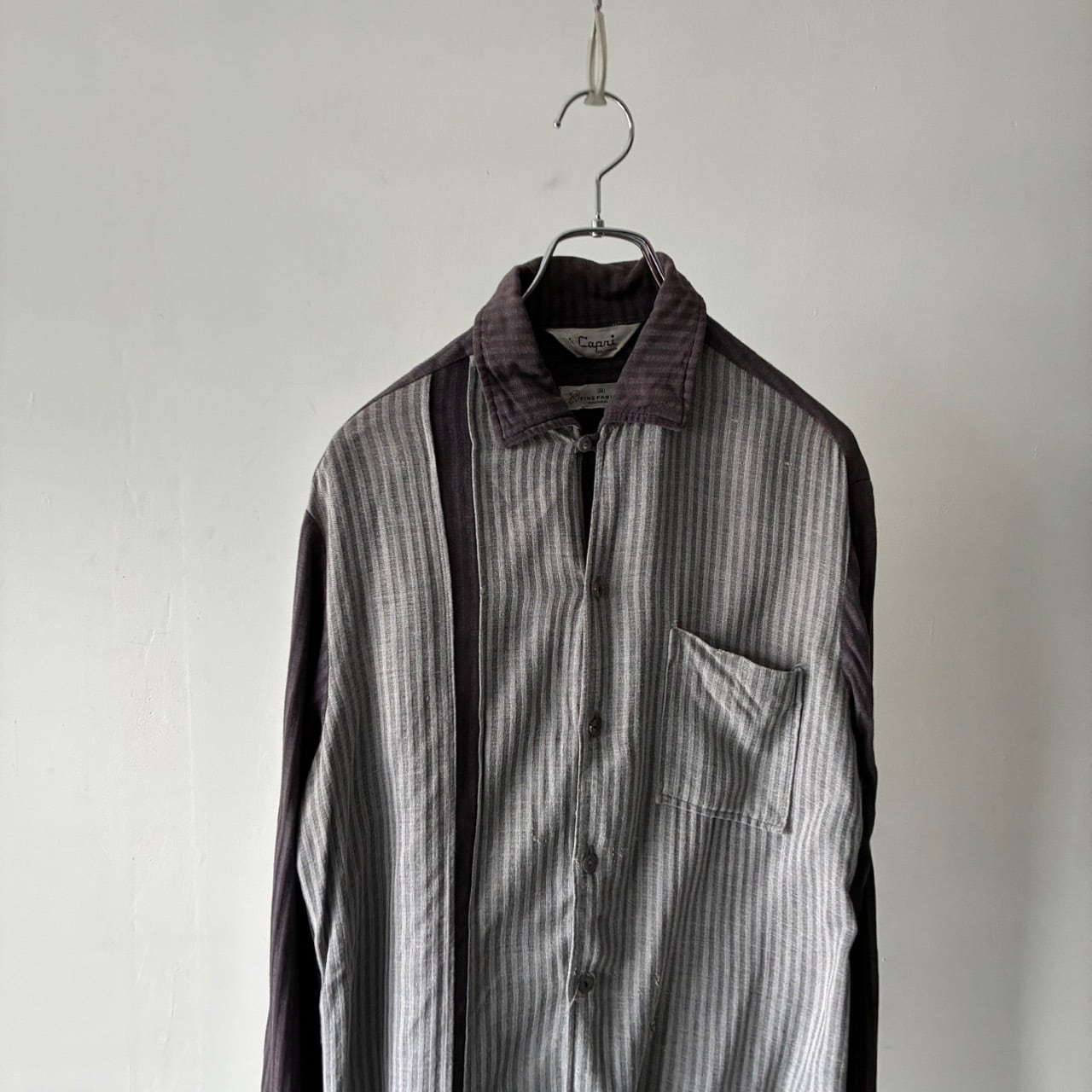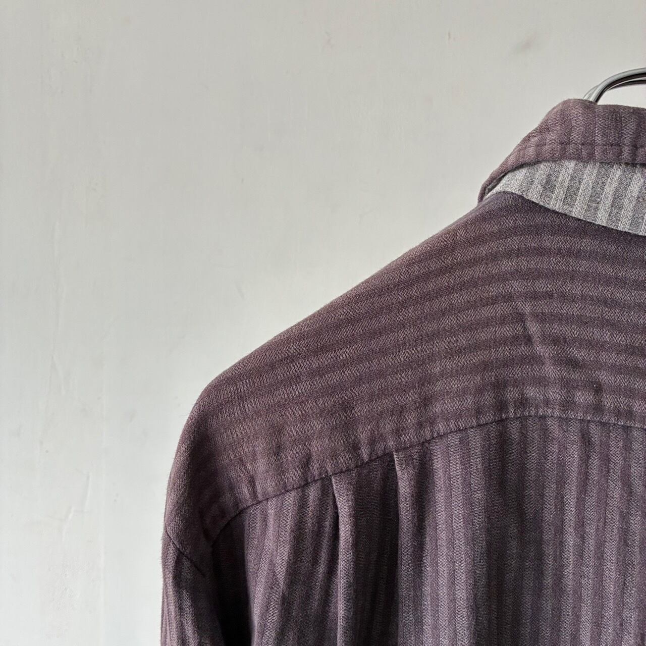 グレー×ブラウンのバイカラーでそれぞれ織りやプリーツといった作りのストライプが映えるハイグレードなイタリアンカラーシャツ