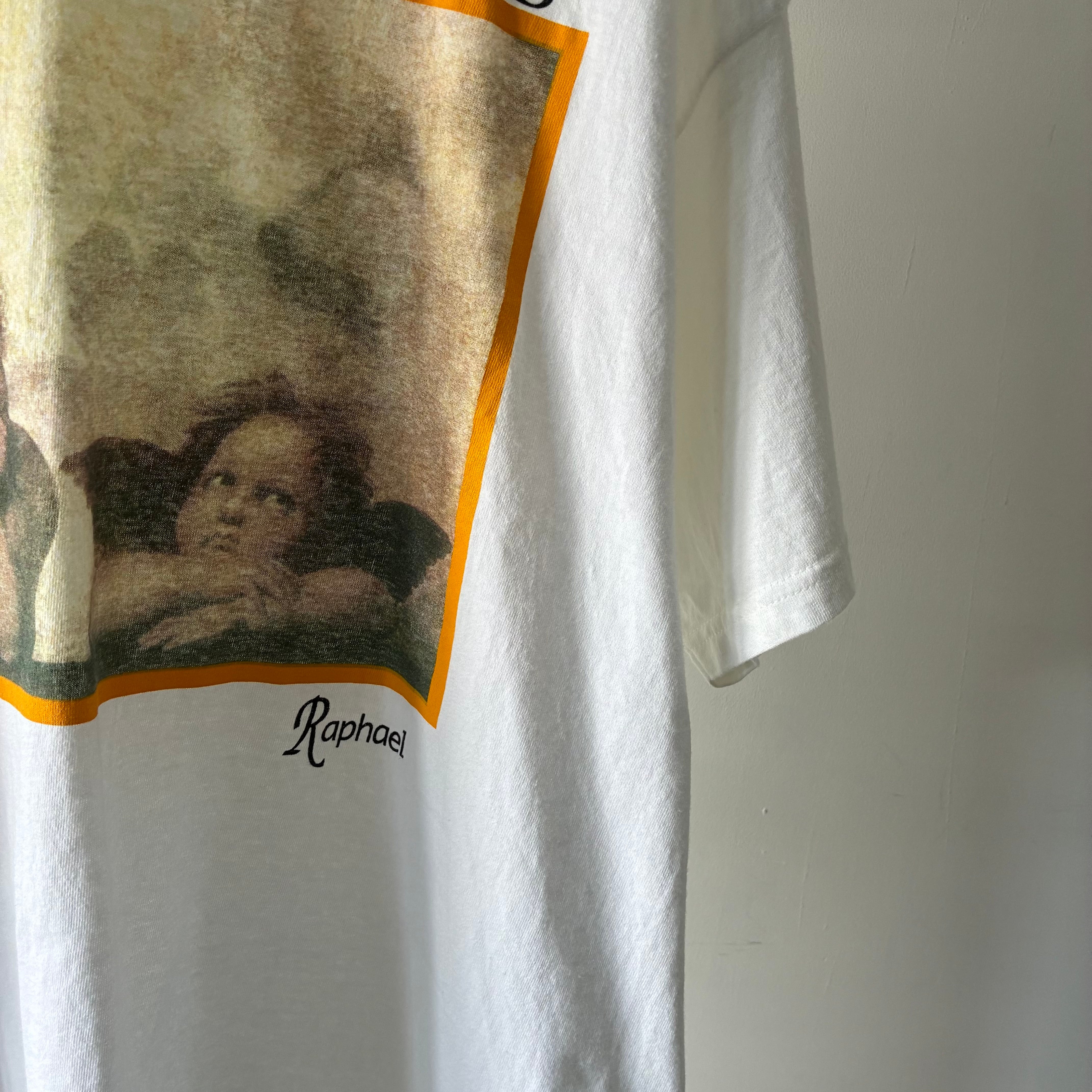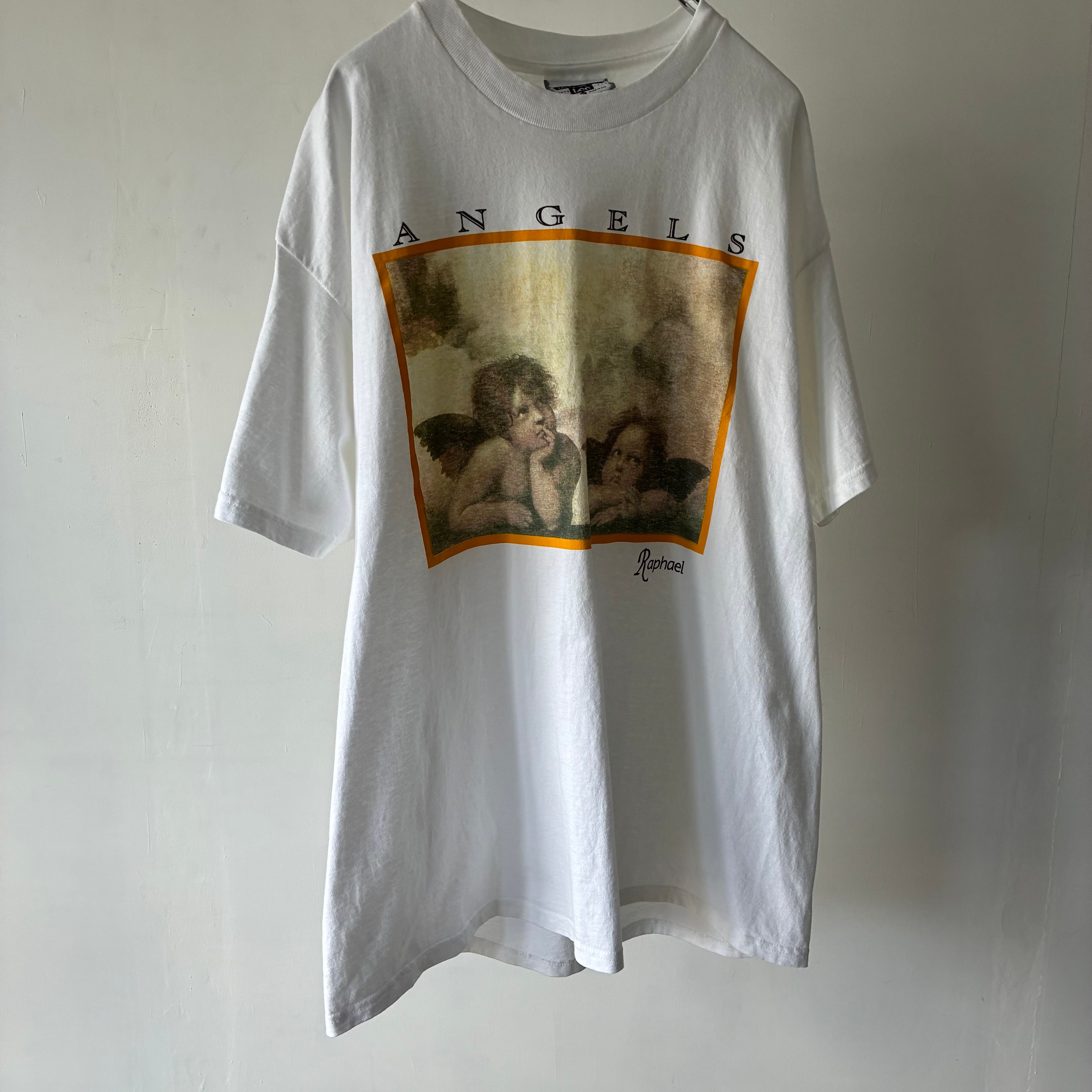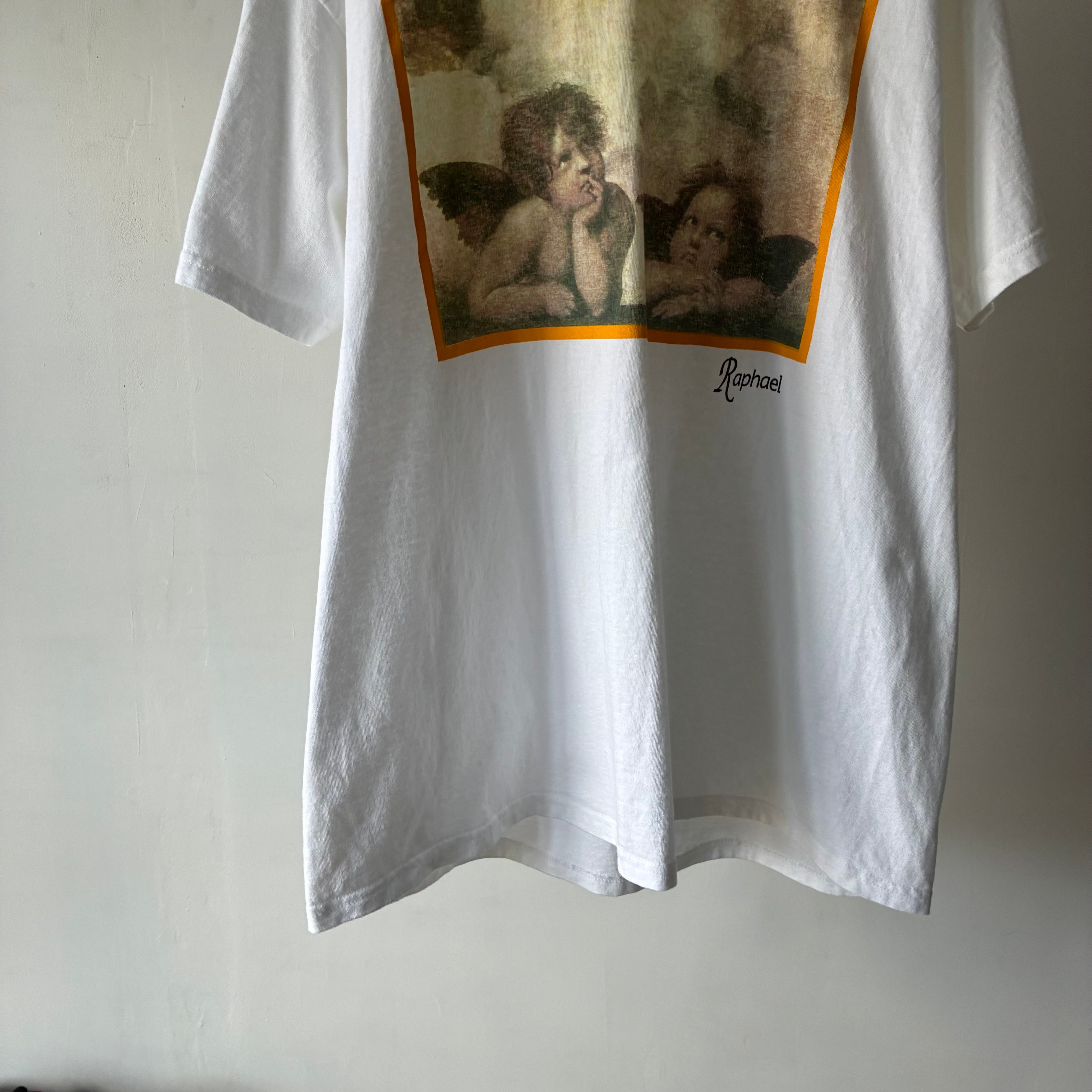 ルネサンス期を代表する巨匠 ラファエロ・サンティ の代表作「システィーナの聖母」に描かれた、名高い二人の天使をモチーフにしたプリントTシャツ