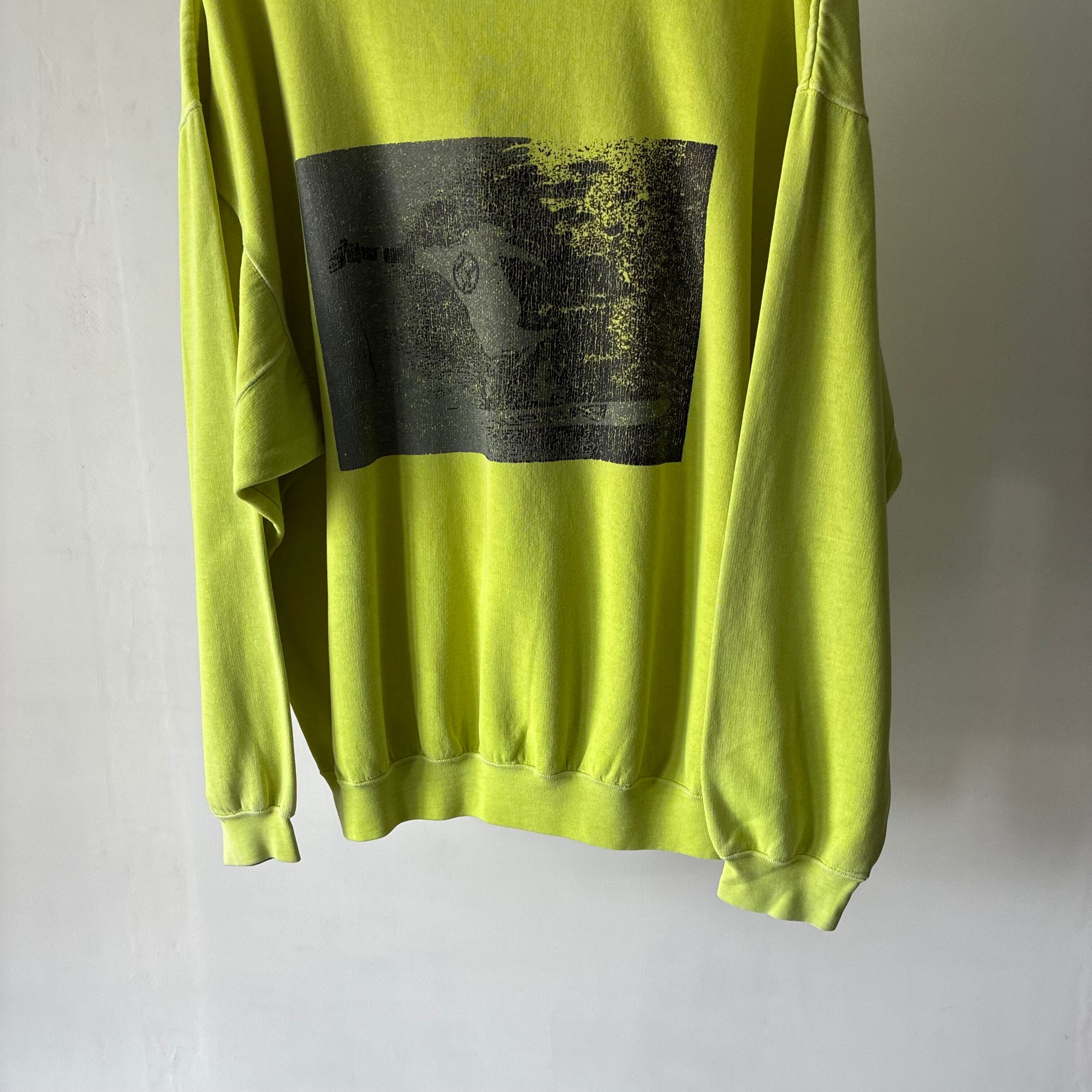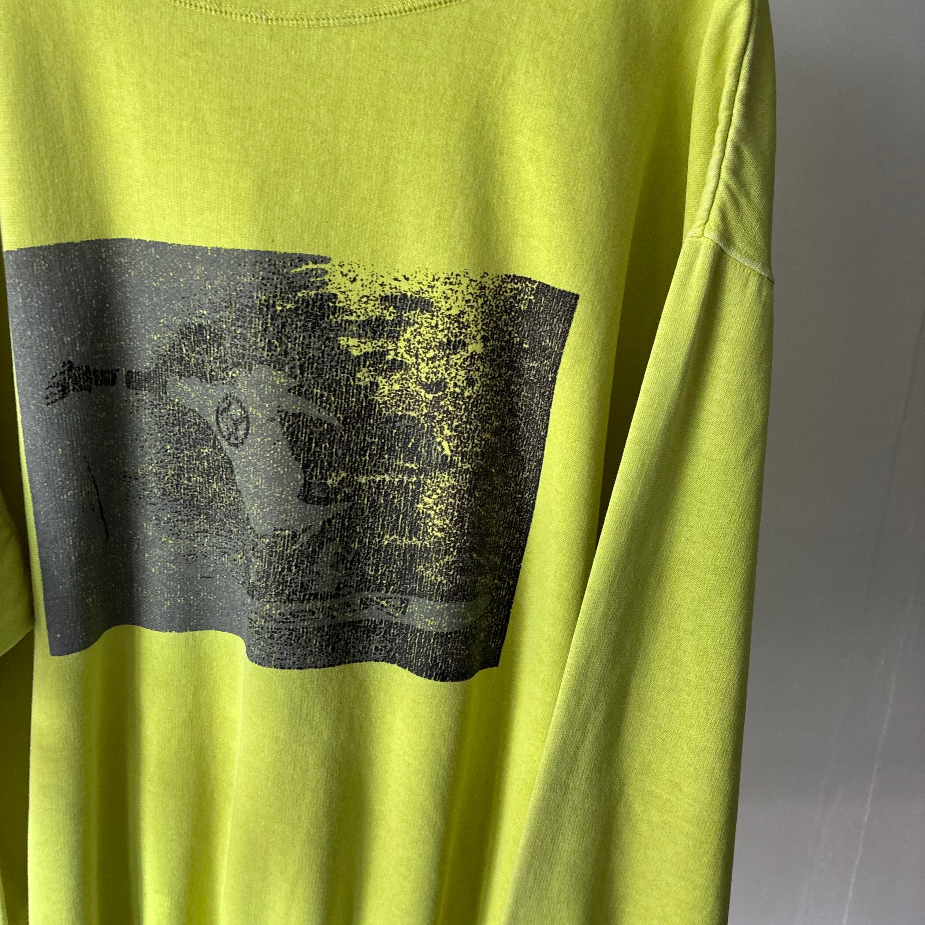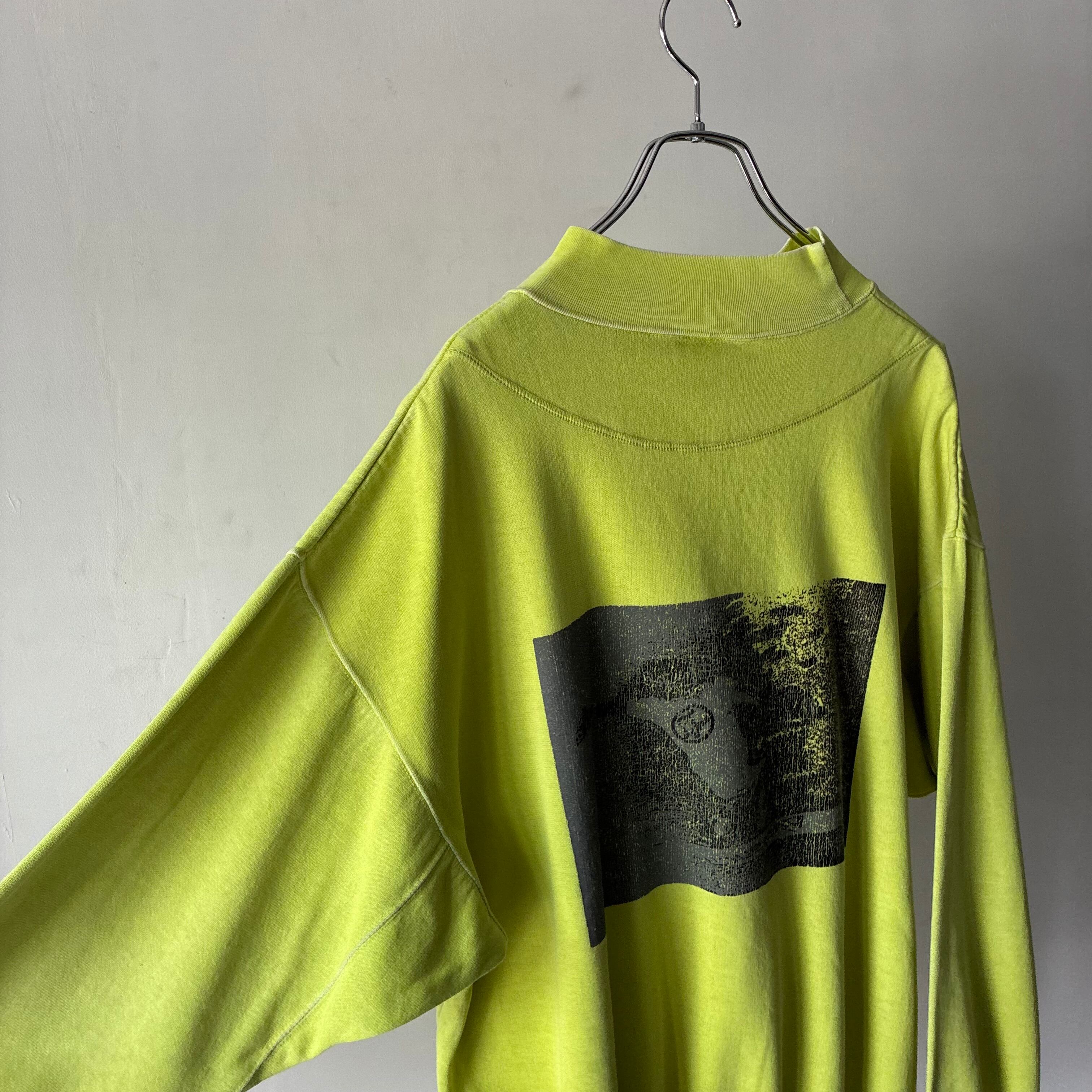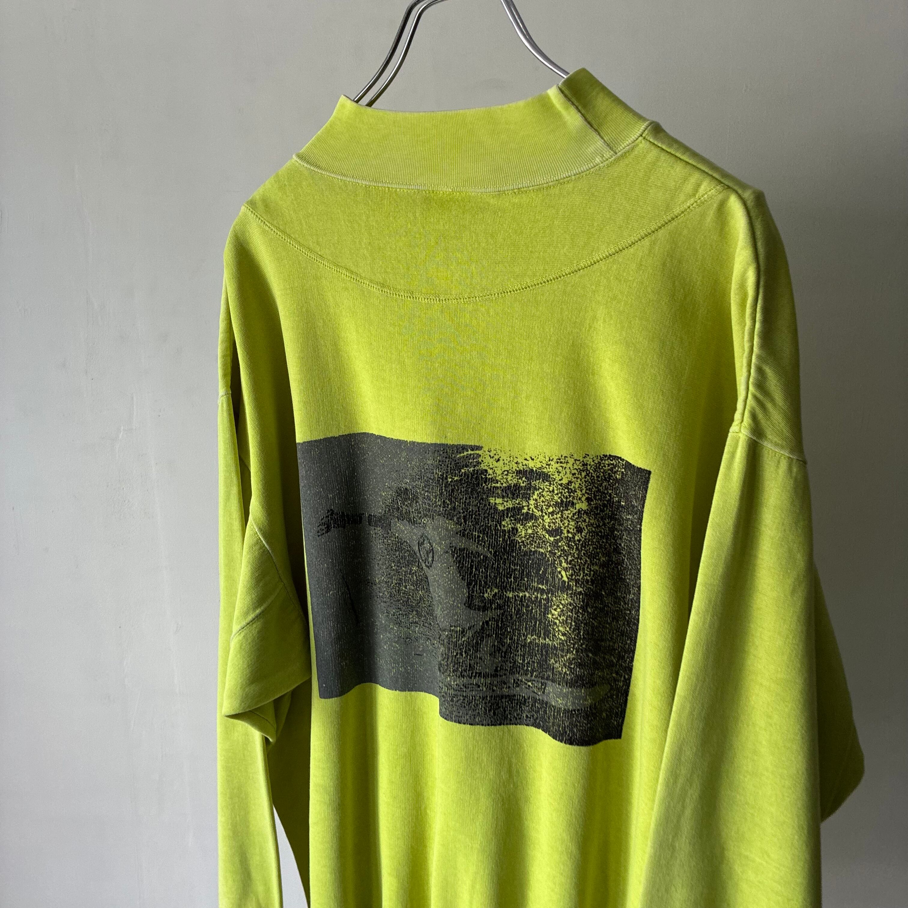 ドロップショルダー気味のゆったりとしたシルエットに加え、リブ仕様の裾・袖口で程よくルーズに着こなせる一枚。古着ならではのプリントのひび割れ感が、逆に味わい深くヴィンテージ感を引き立てています
