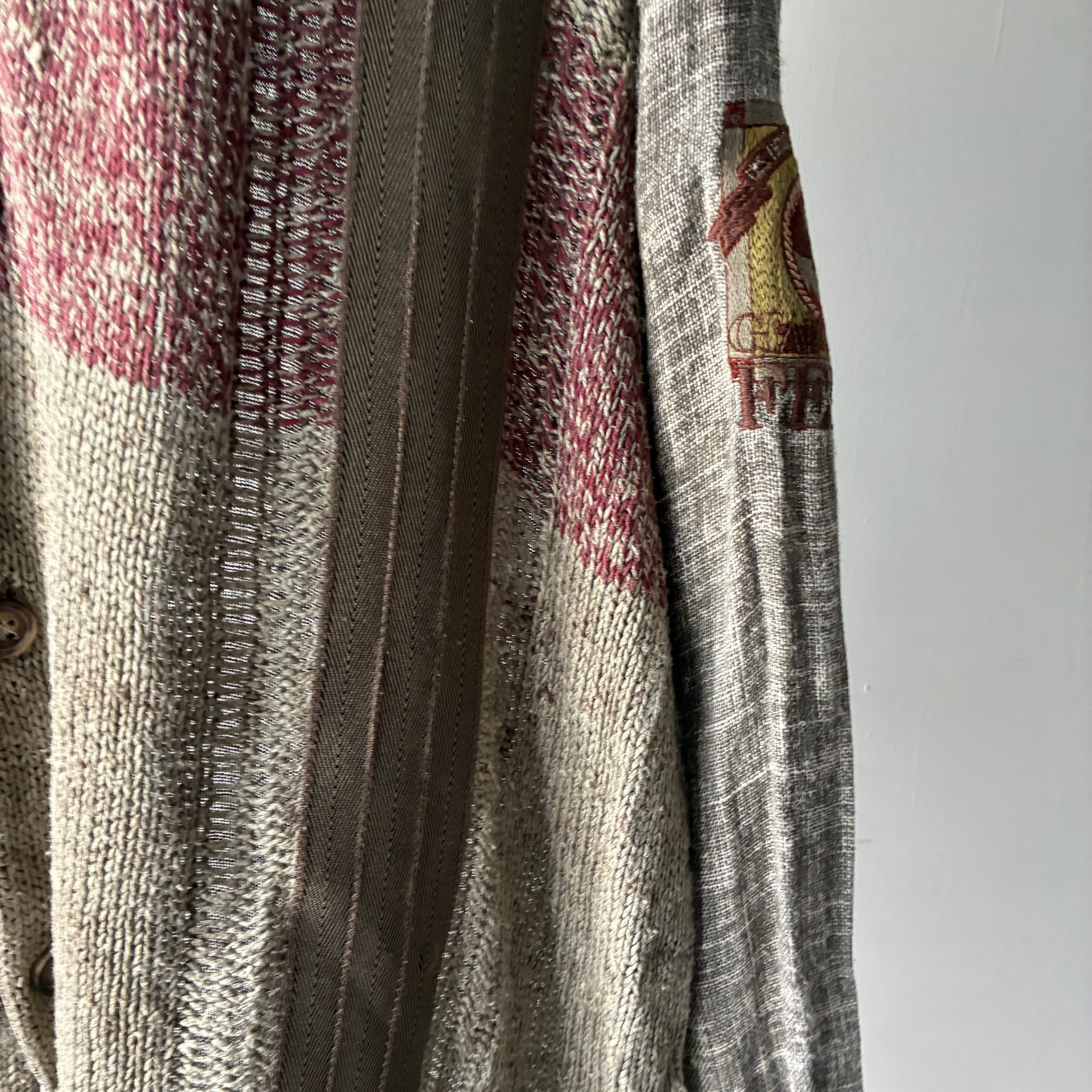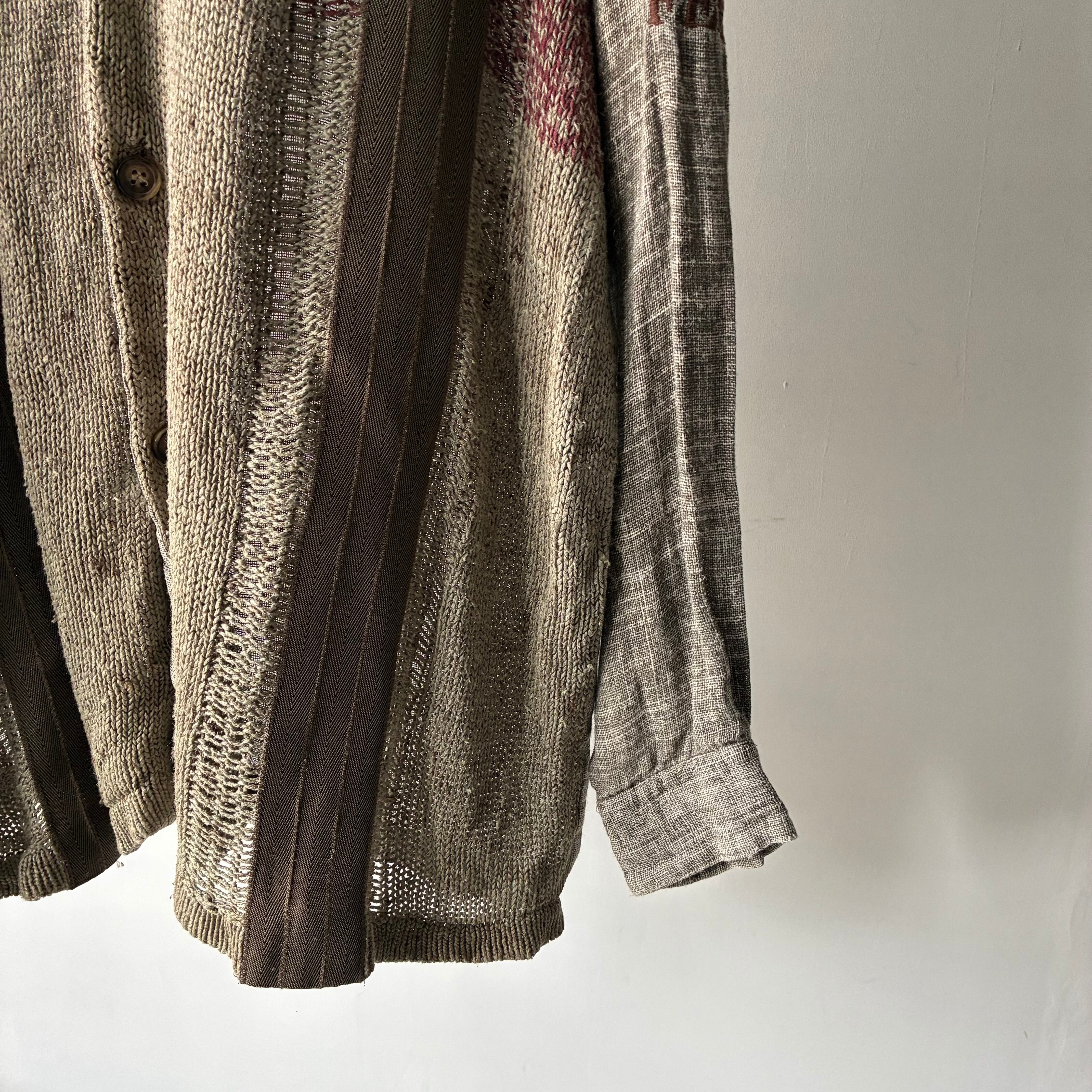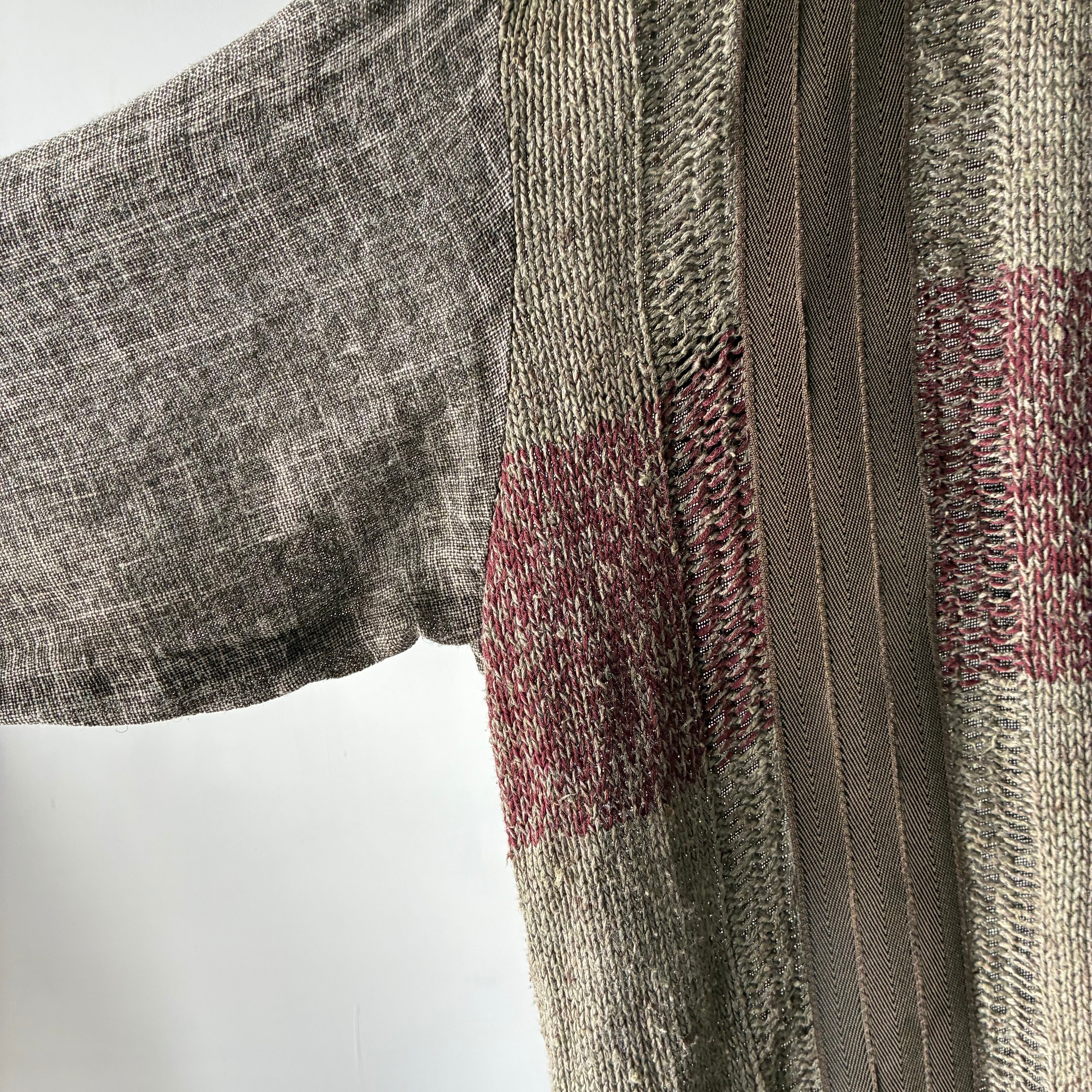 リネン混の風合い豊かな生地をベースに、編み込みのような立体的テクスチャーと、配色ライン・グラフィックプリントを組み合わせたアートピース的な一枚