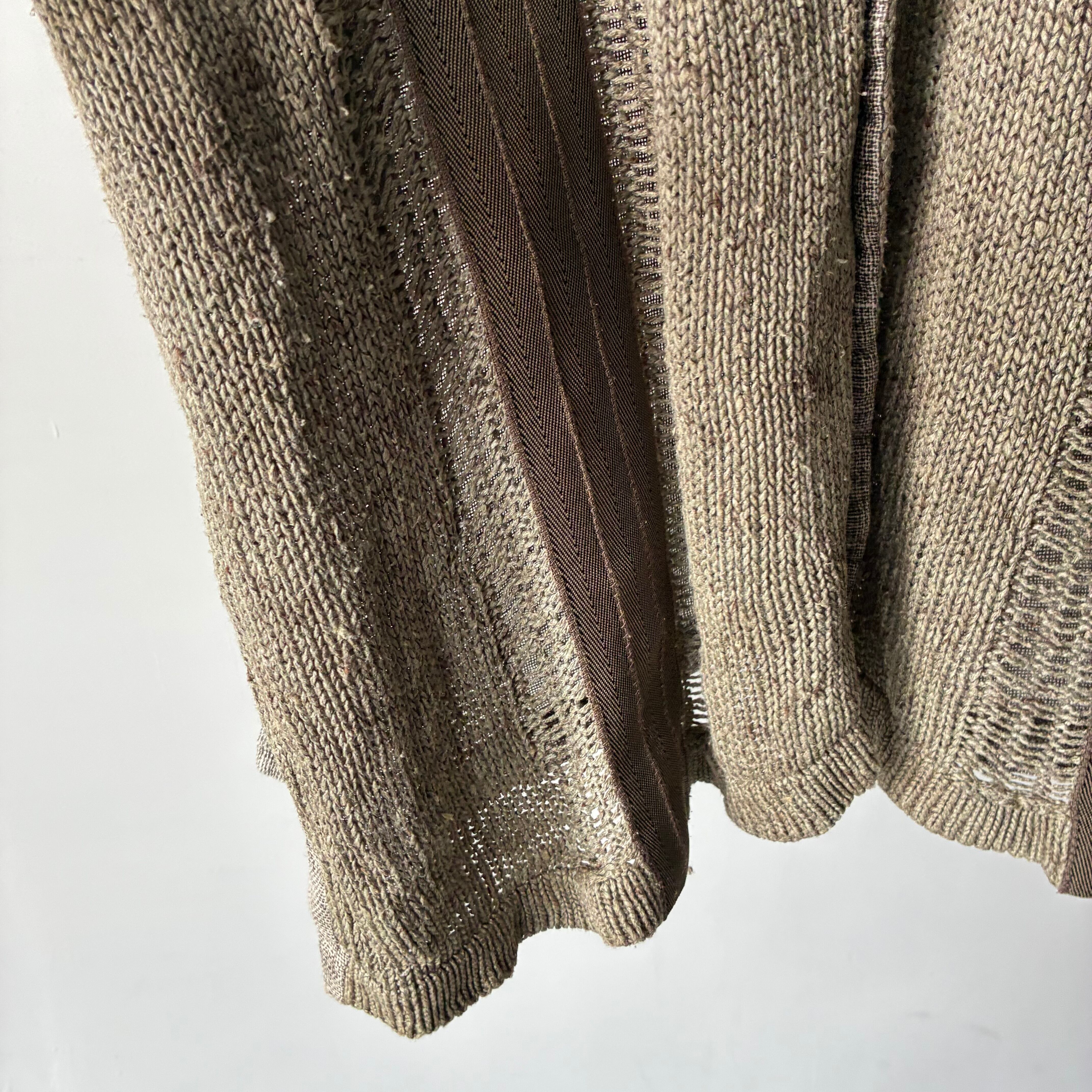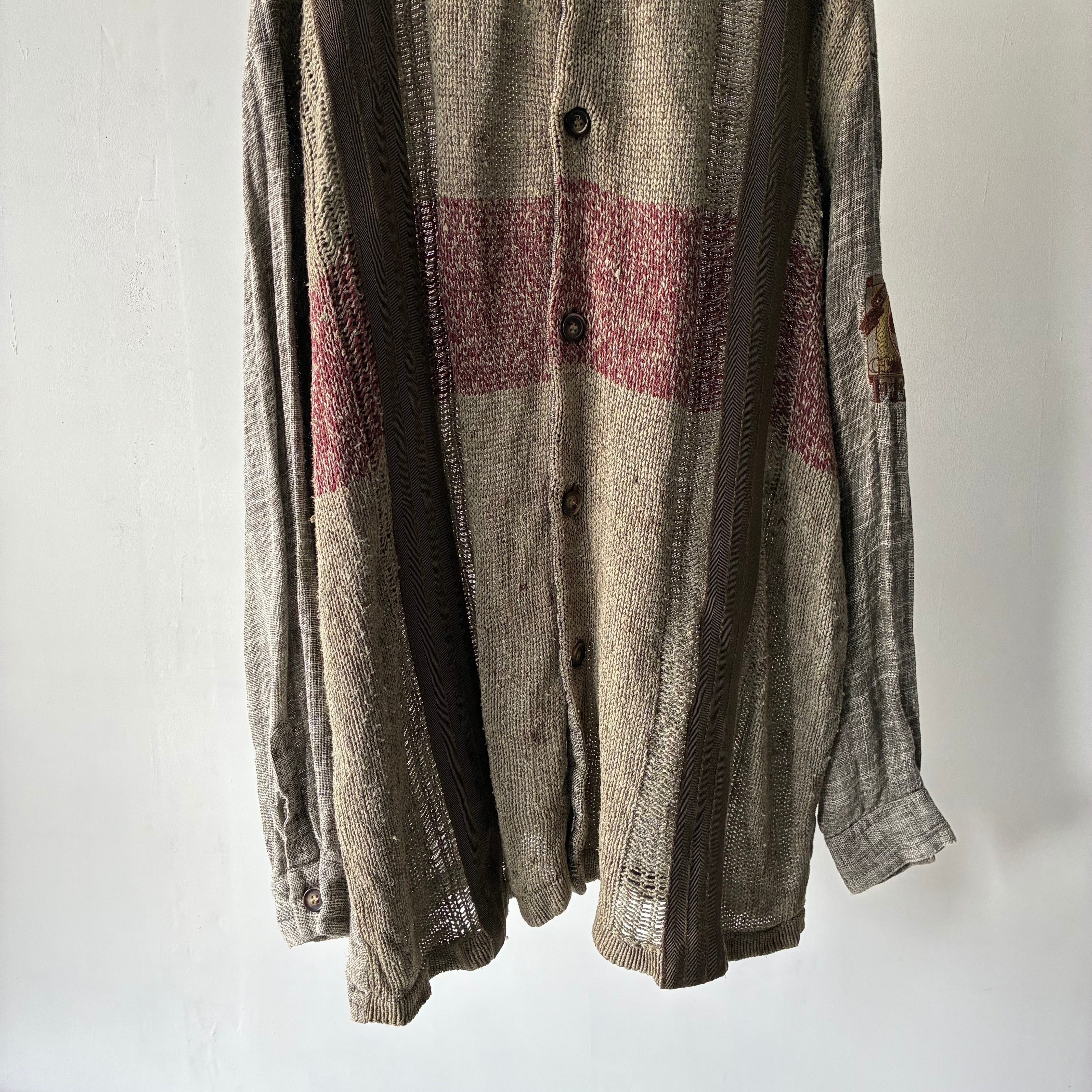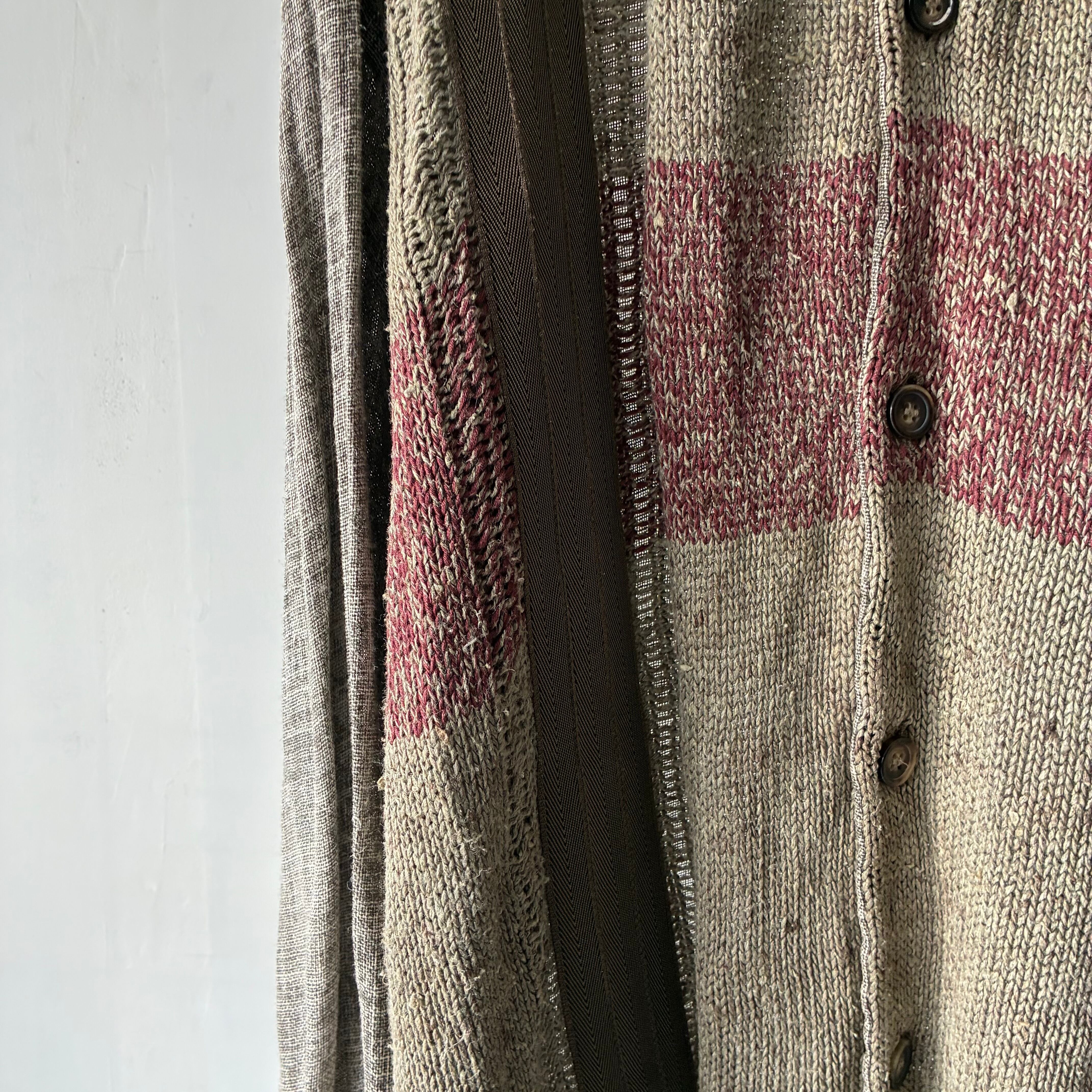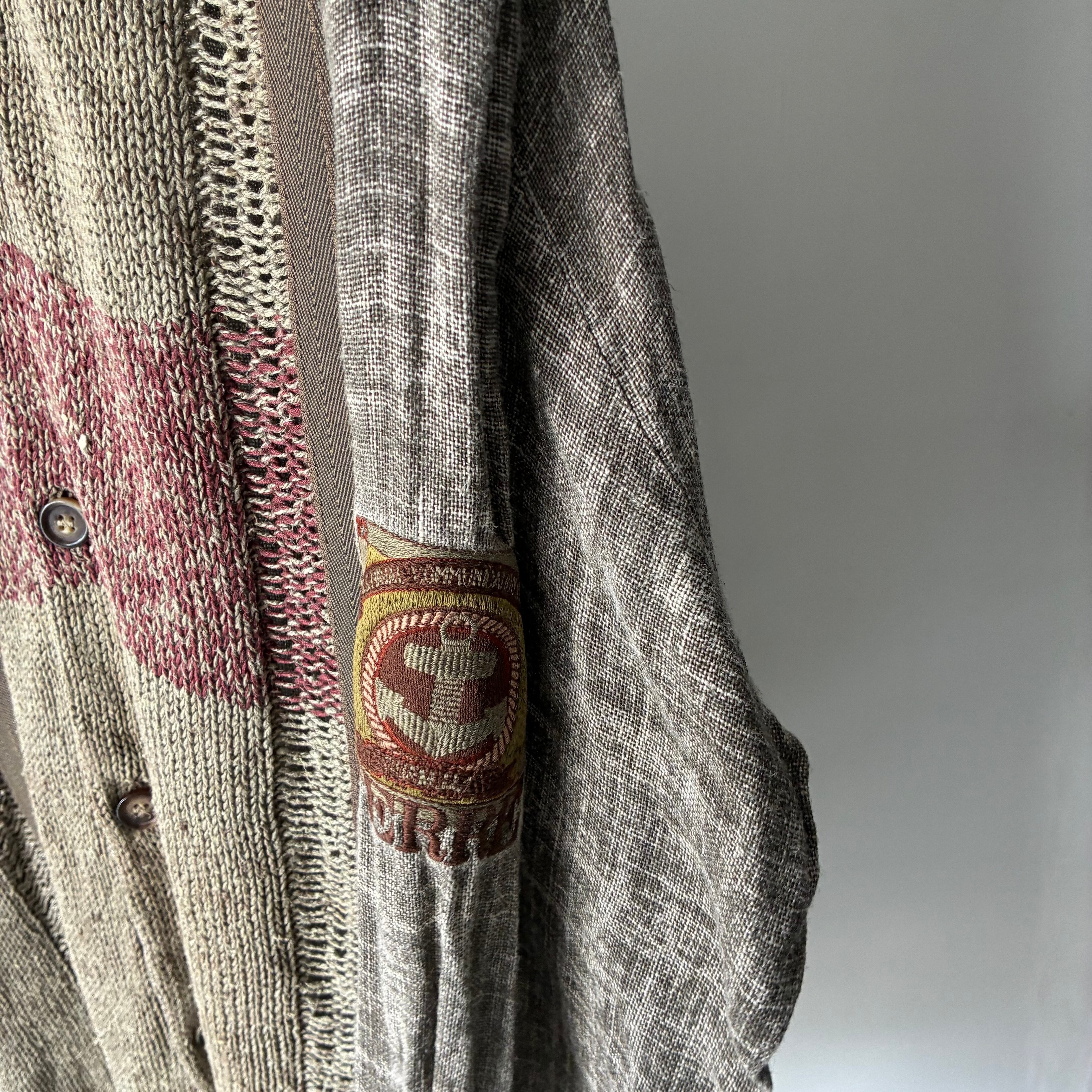 リネン混の風合い豊かな生地をベースに、編み込みのような立体的テクスチャーと、配色ライン・グラフィックプリントを組み合わせたアートピース的な一枚