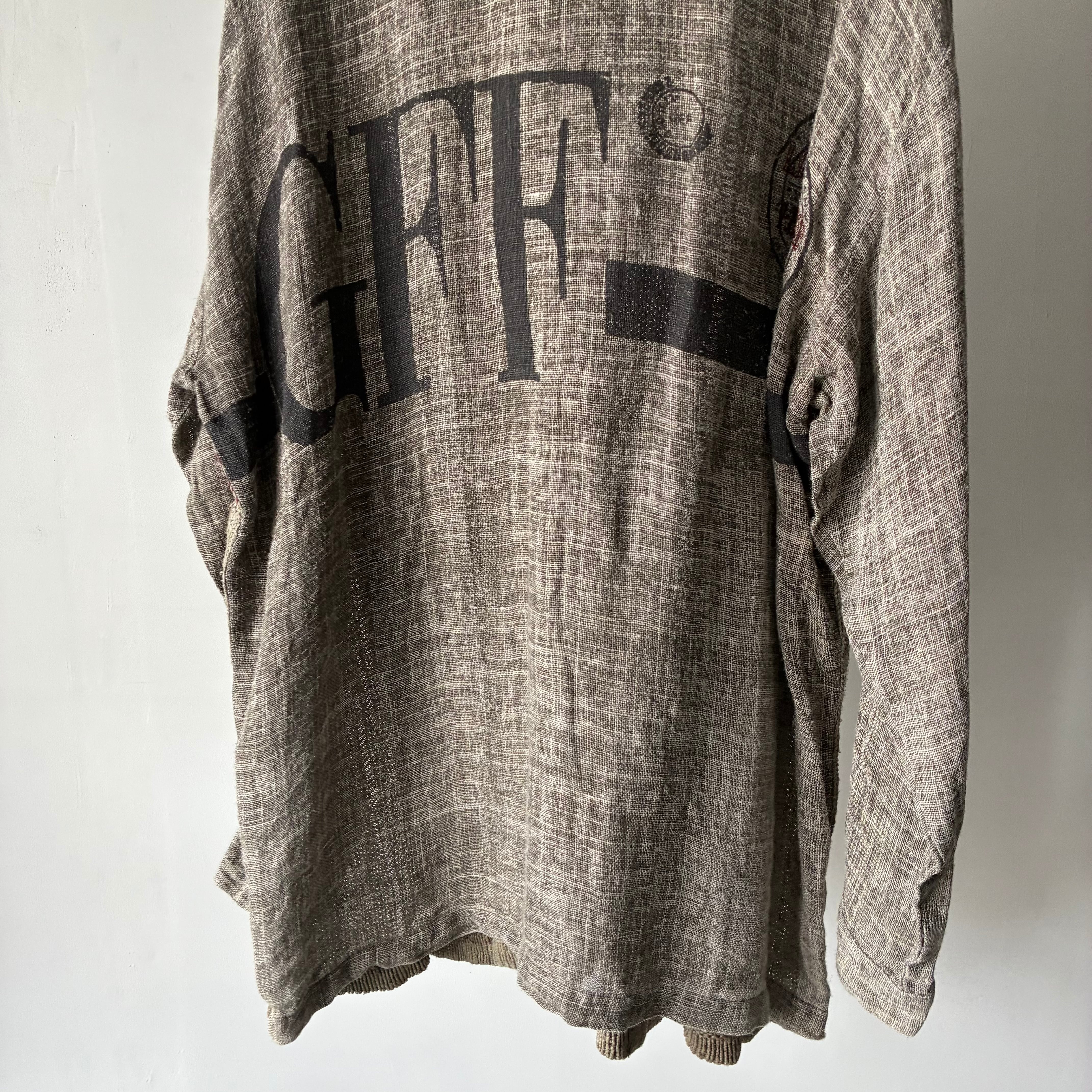 フロントにはブラウン×レッドのストライプ切り替え、バックには大胆に 「GFF」ロゴ とスタンプ風プリントが施され、袖にもワッペン風デザインがあしらわれた存在感抜群のデザイン