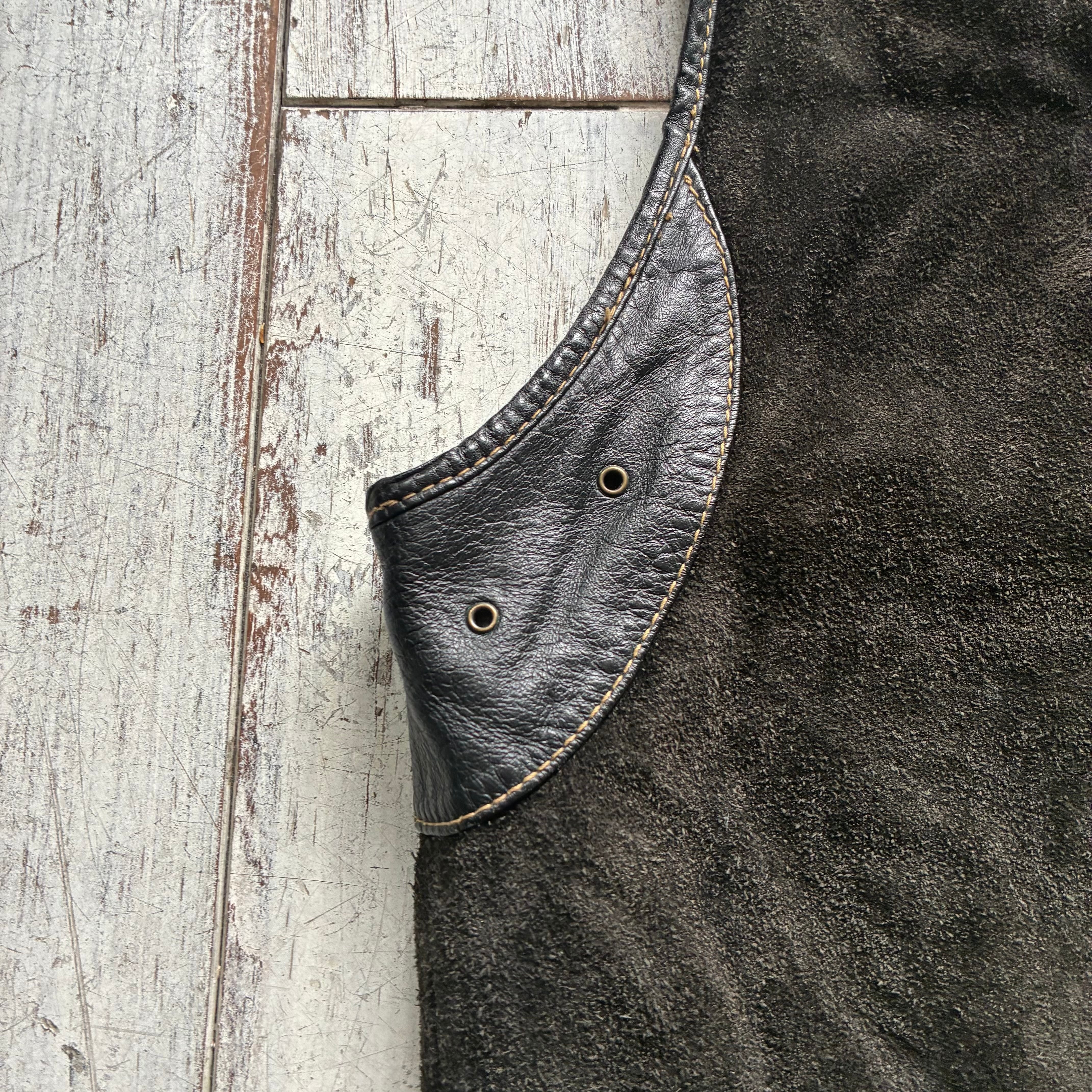 フロントはスエードレザーをベースにポケット口やアームホールに光沢感のあるスムースレザーを切り替えた存在感のあるデザイン