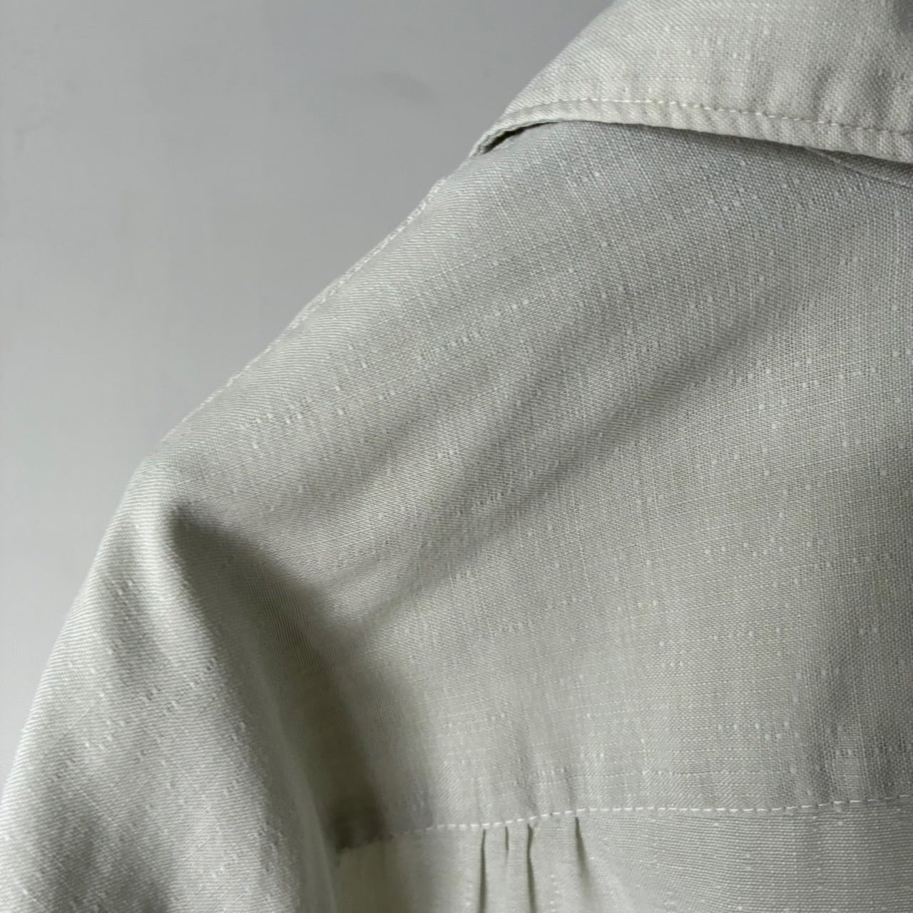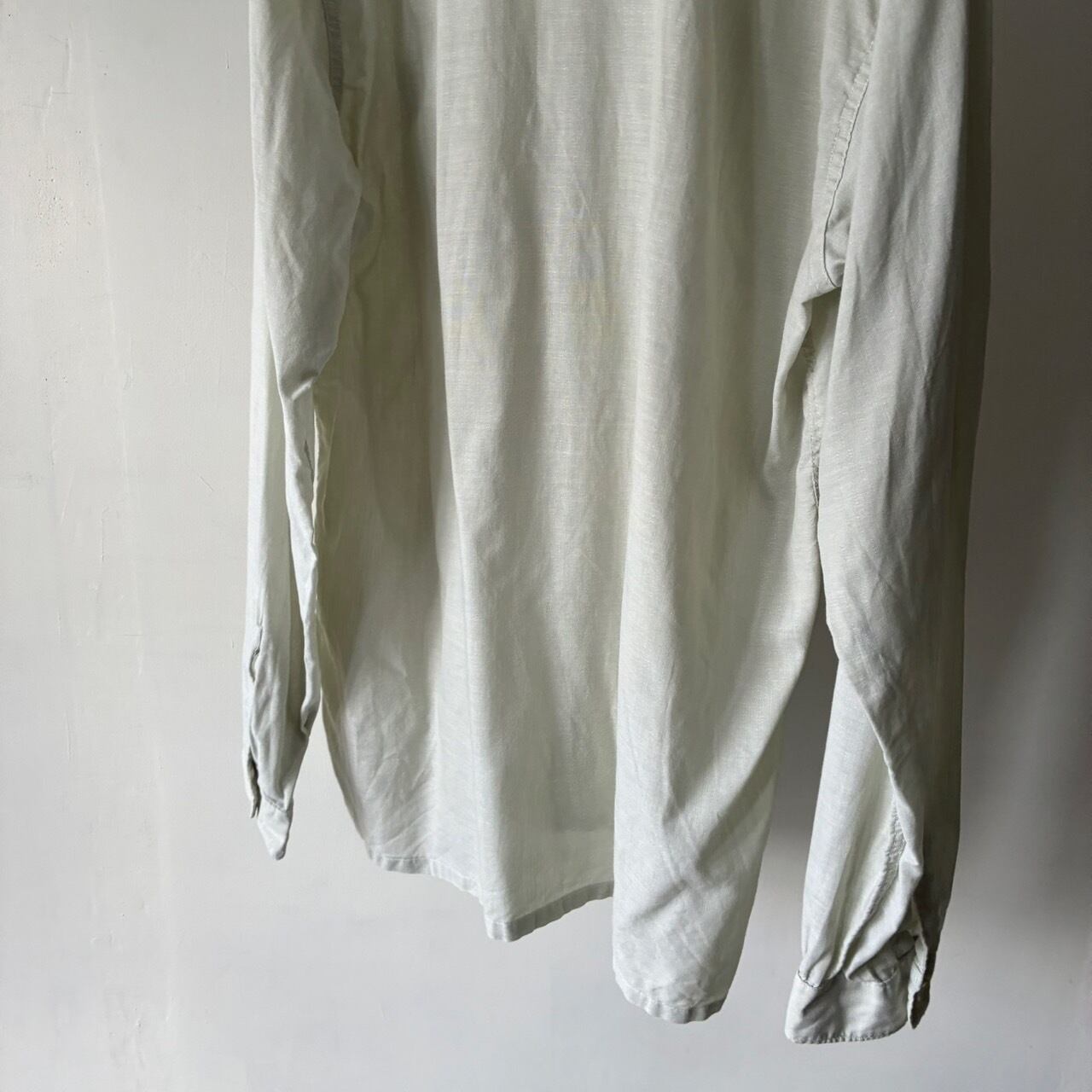 ほんのり青みがかったホワイトカラーのボディで薄手ながらハリのあるリネンのような風合いの生地感