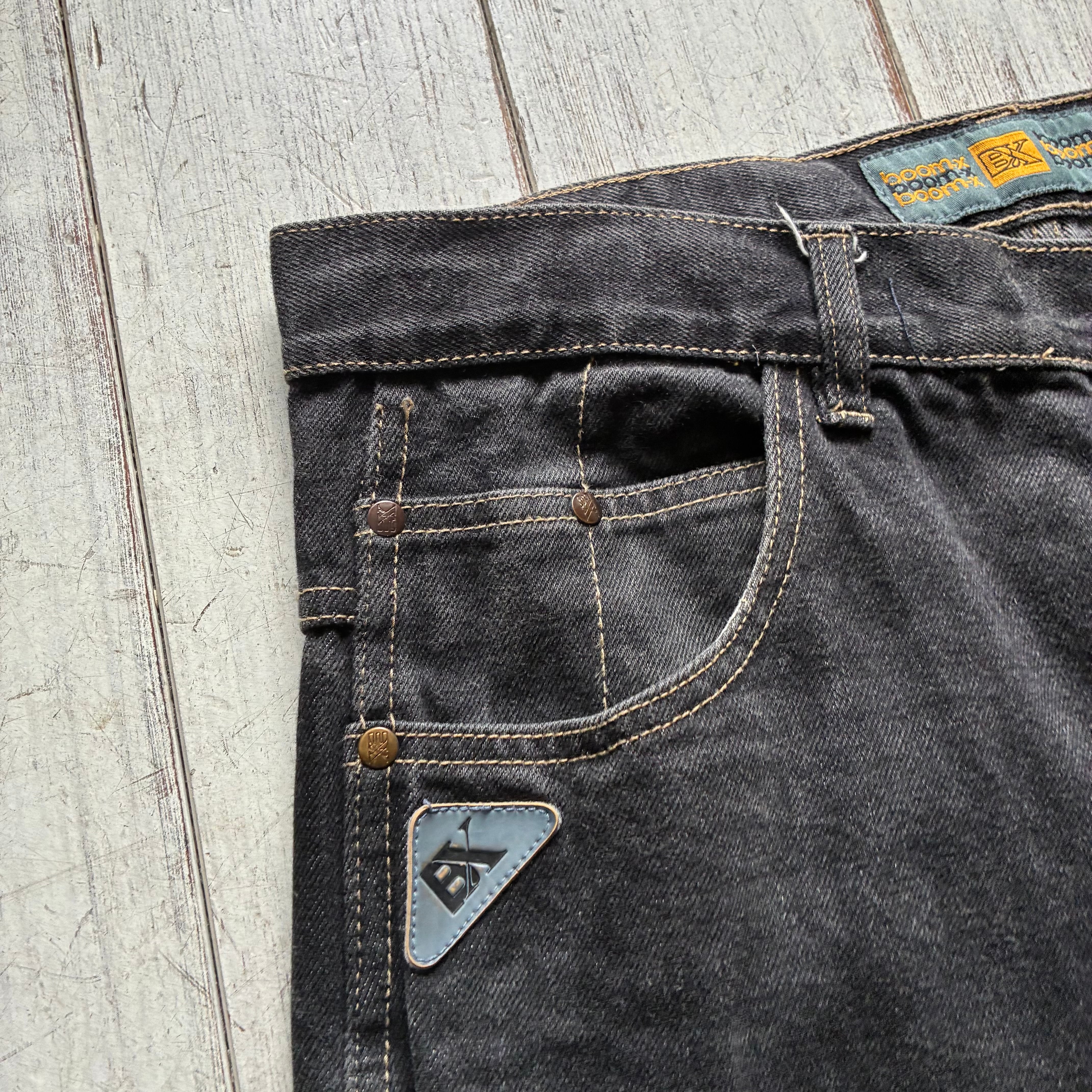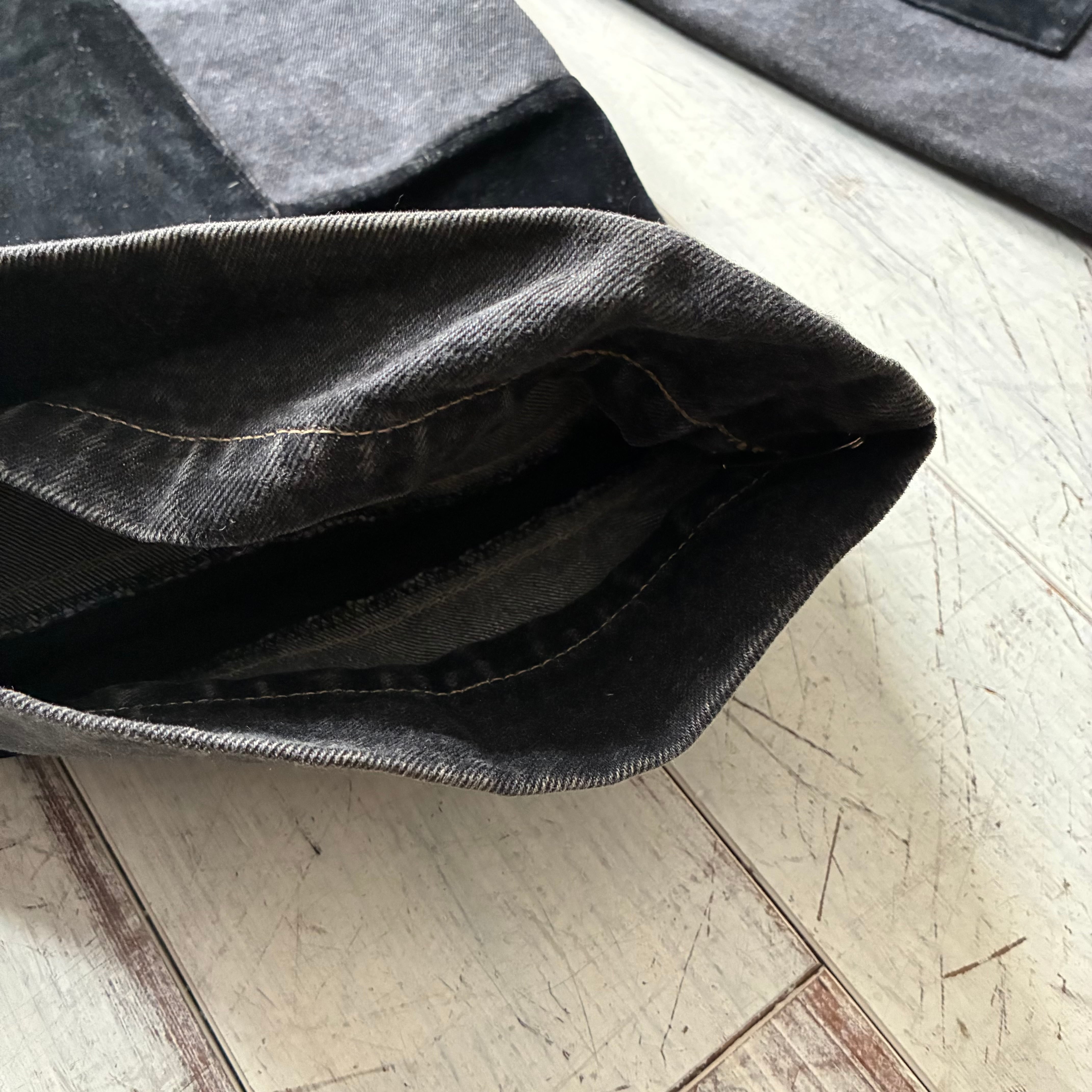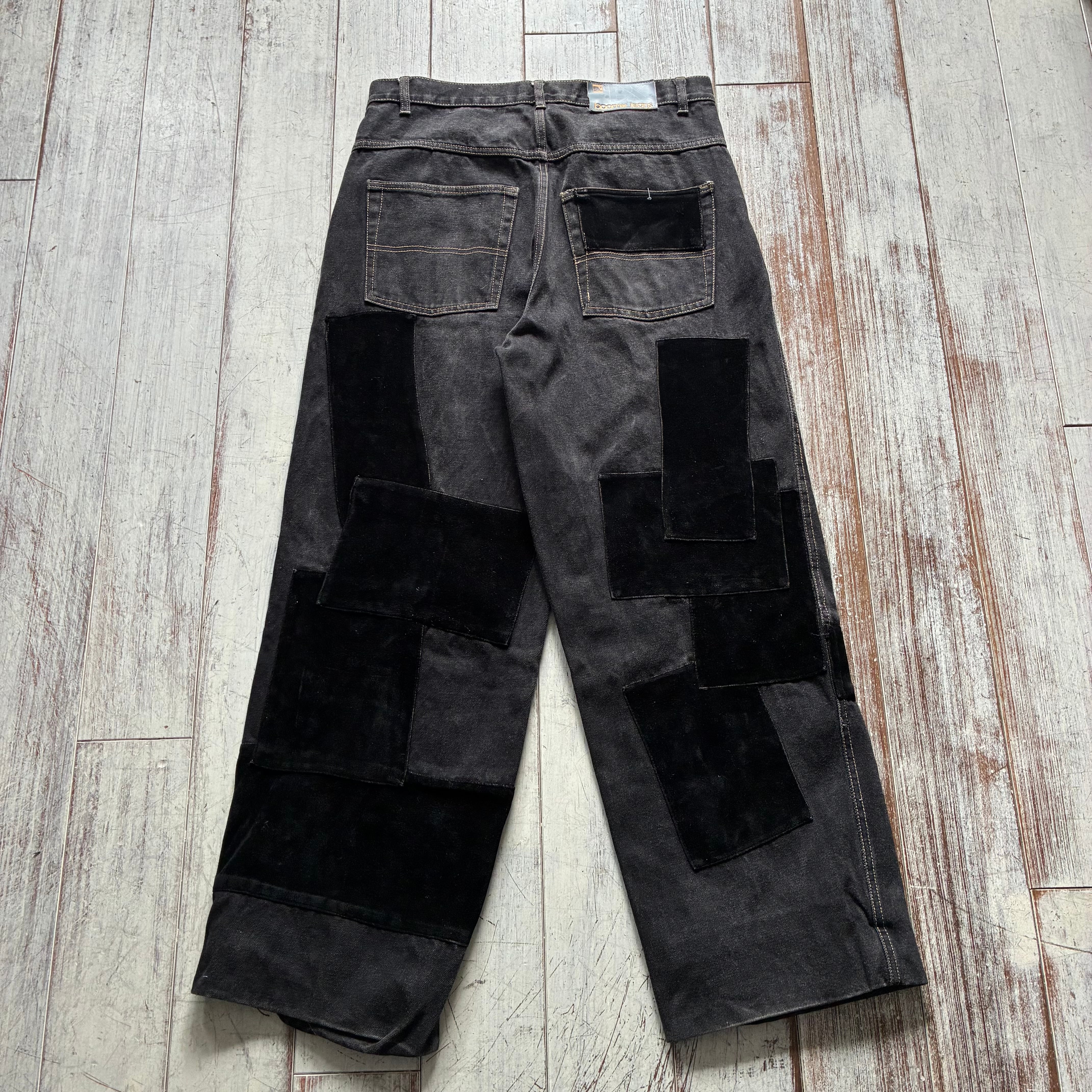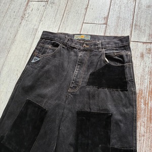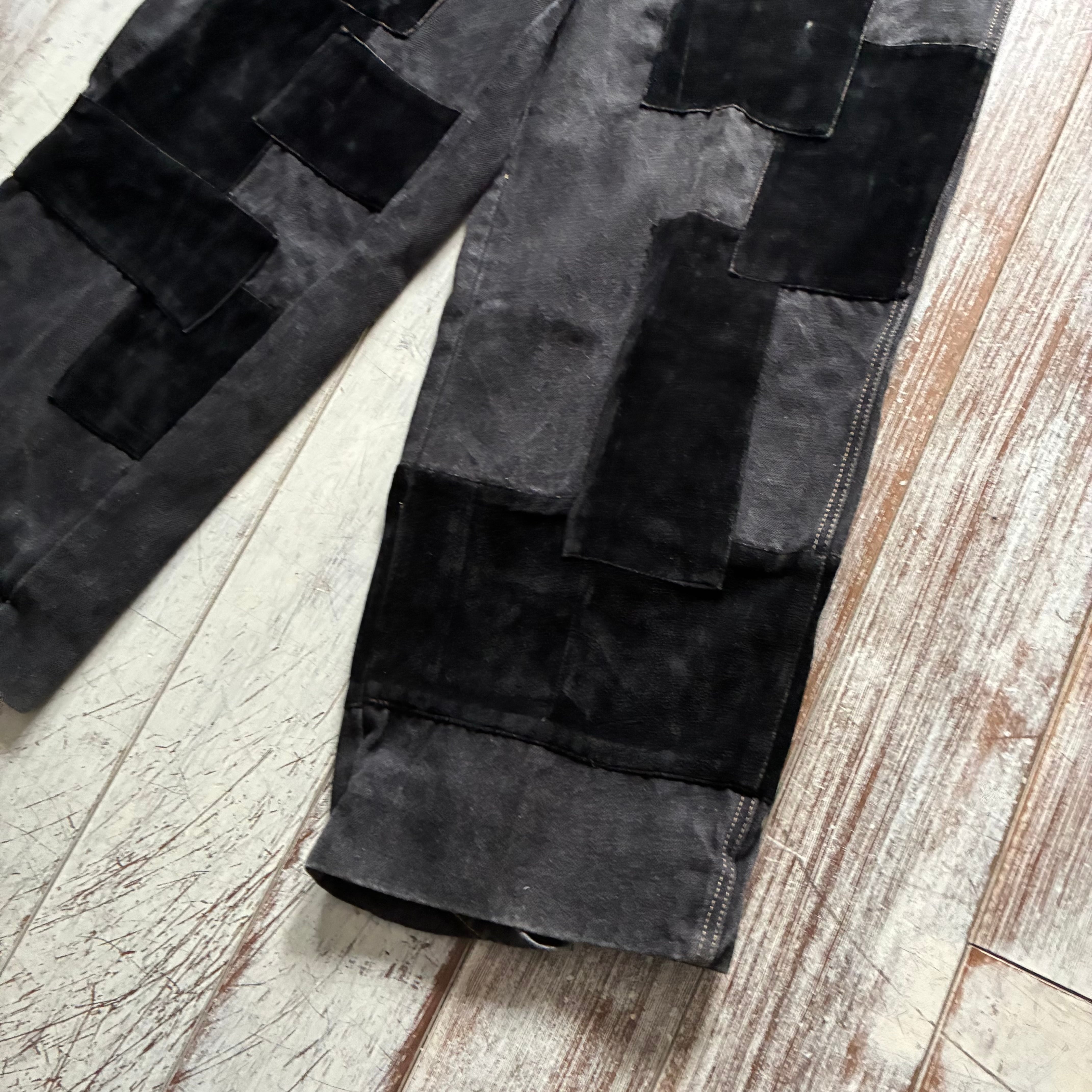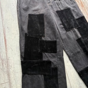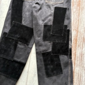 シルエットは程よいワイドストレートで、存在感のあるパッチワークがコーディネートの主役に