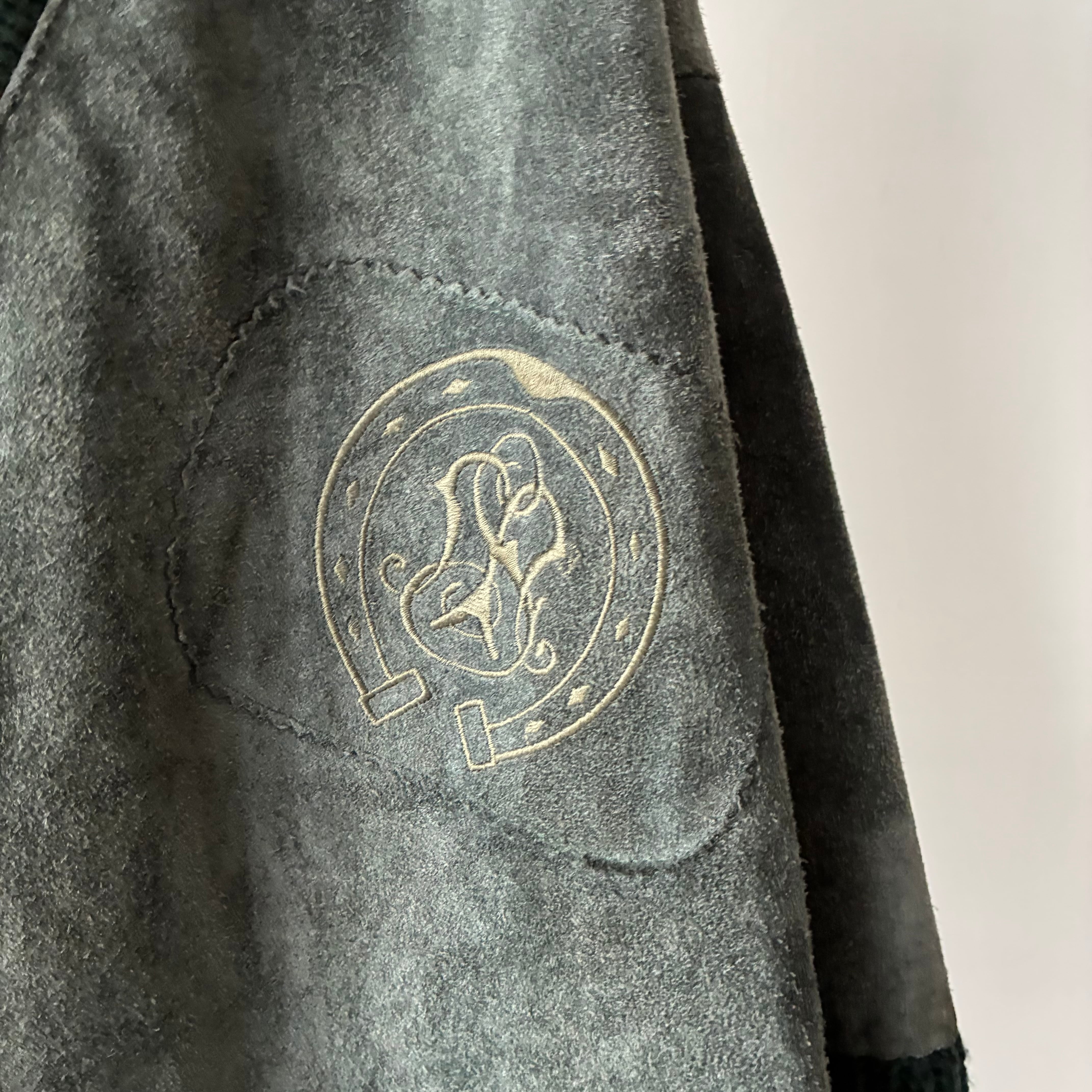 胸元には馬蹄とイニシャルモチーフのワンポイント刺繍が施され、存在感のあるアクセントに