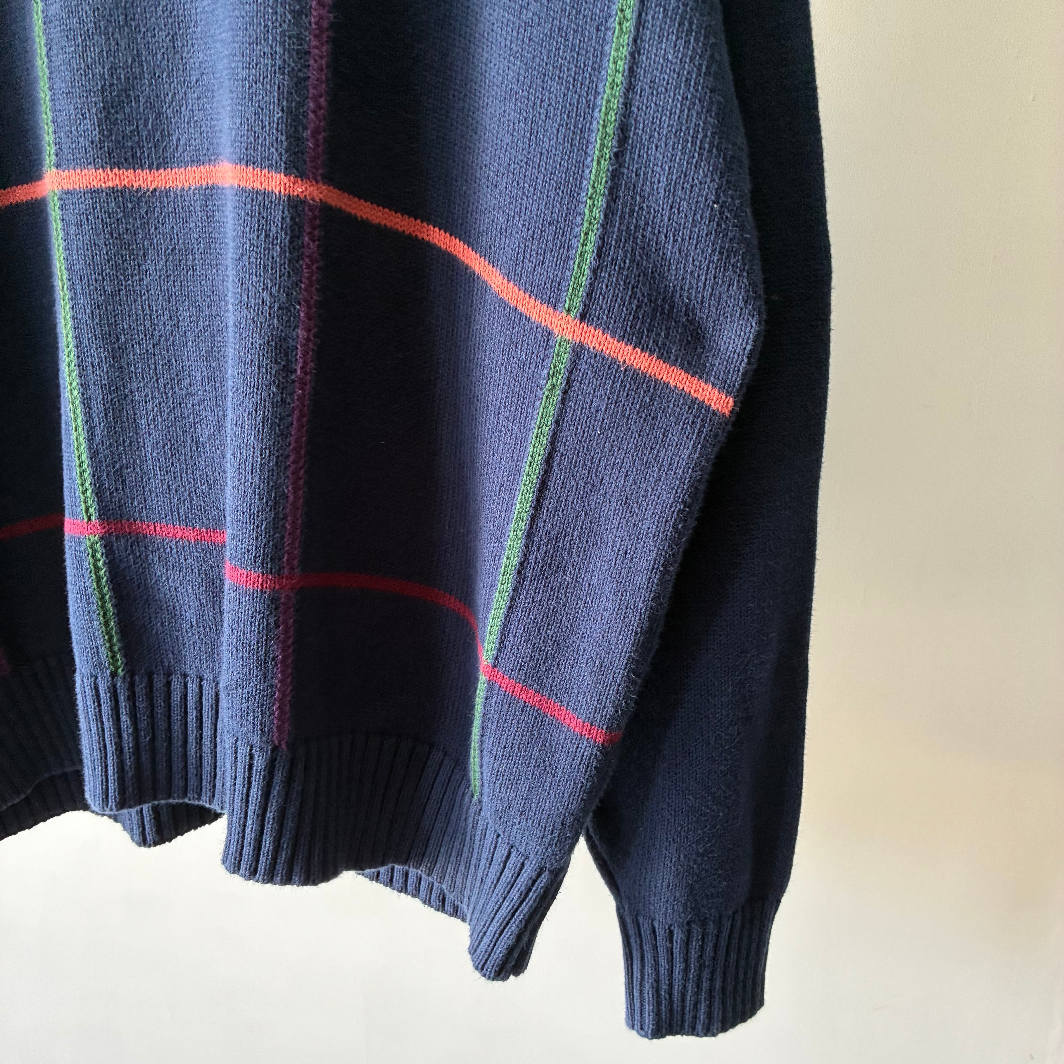 深みのあるネイビーボディに、レッド・グリーン・パープルのラインで構成されたチェック柄が映えるクラシカルな一枚