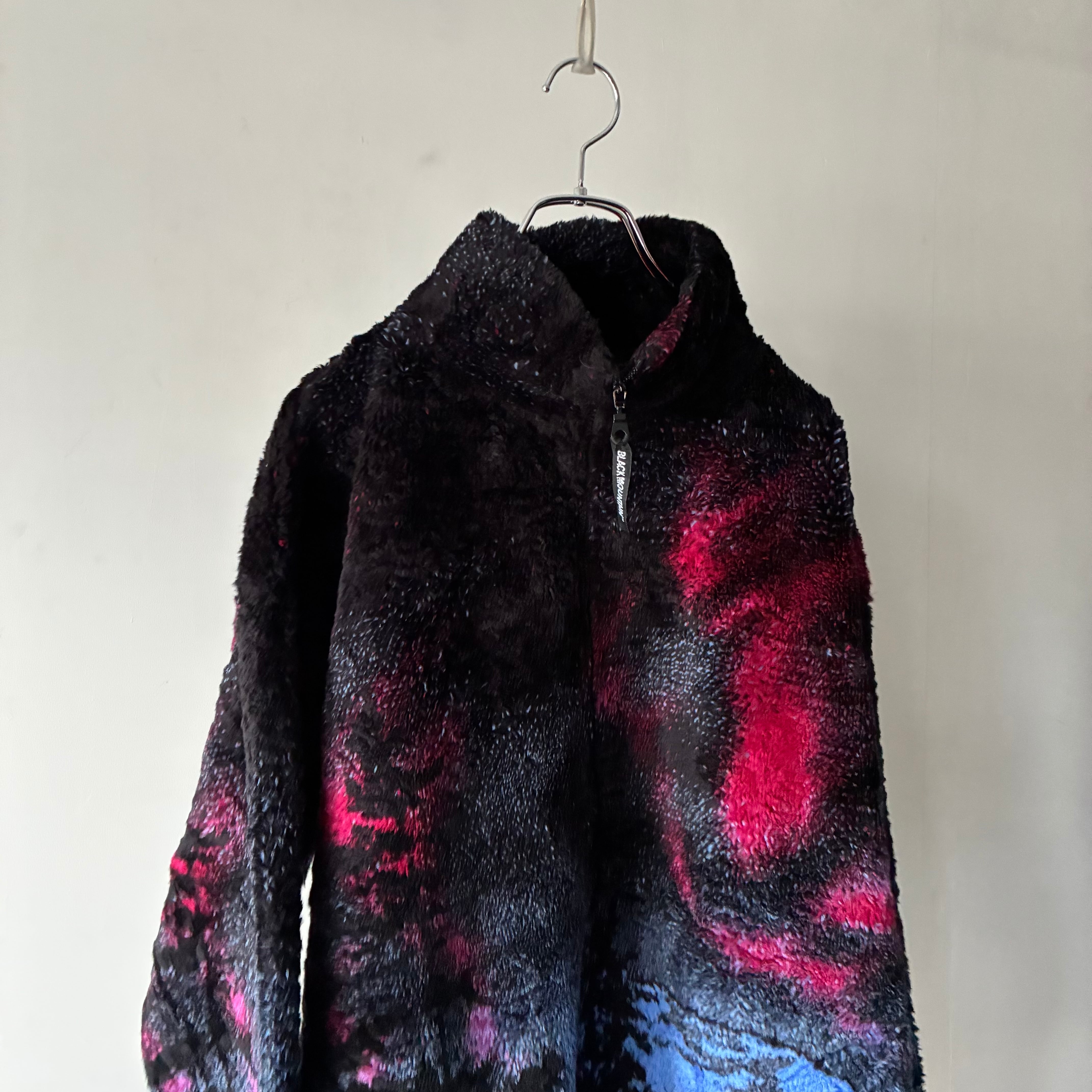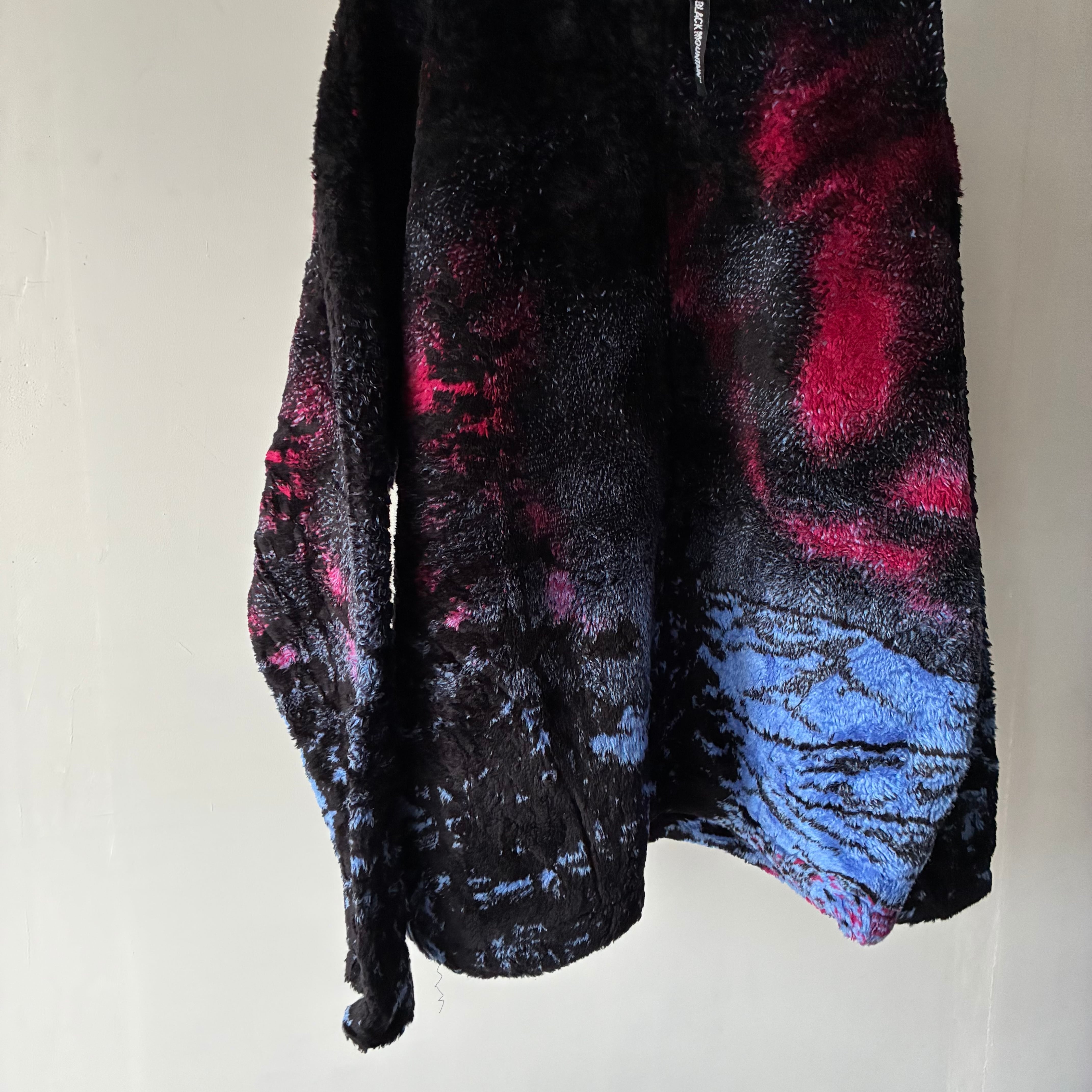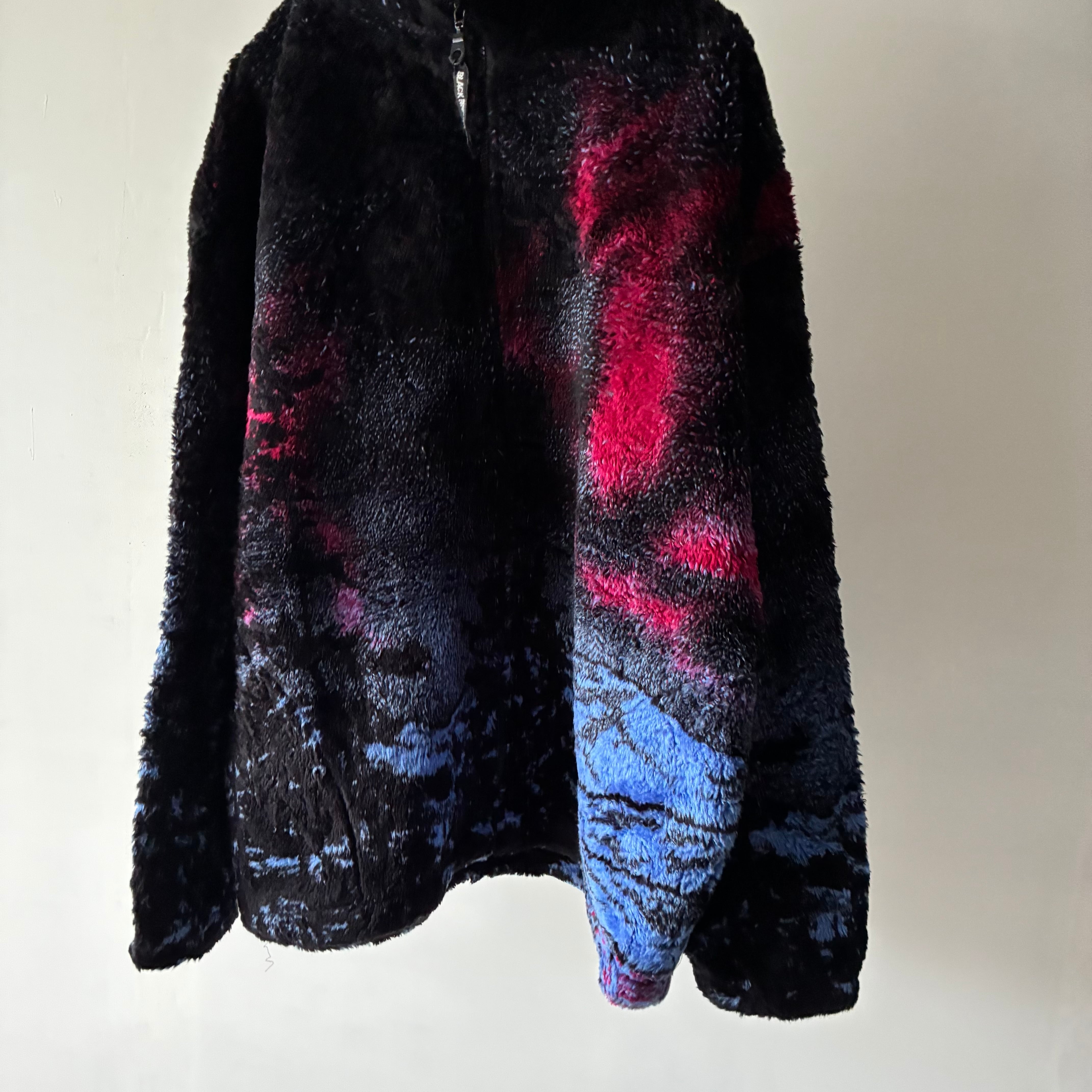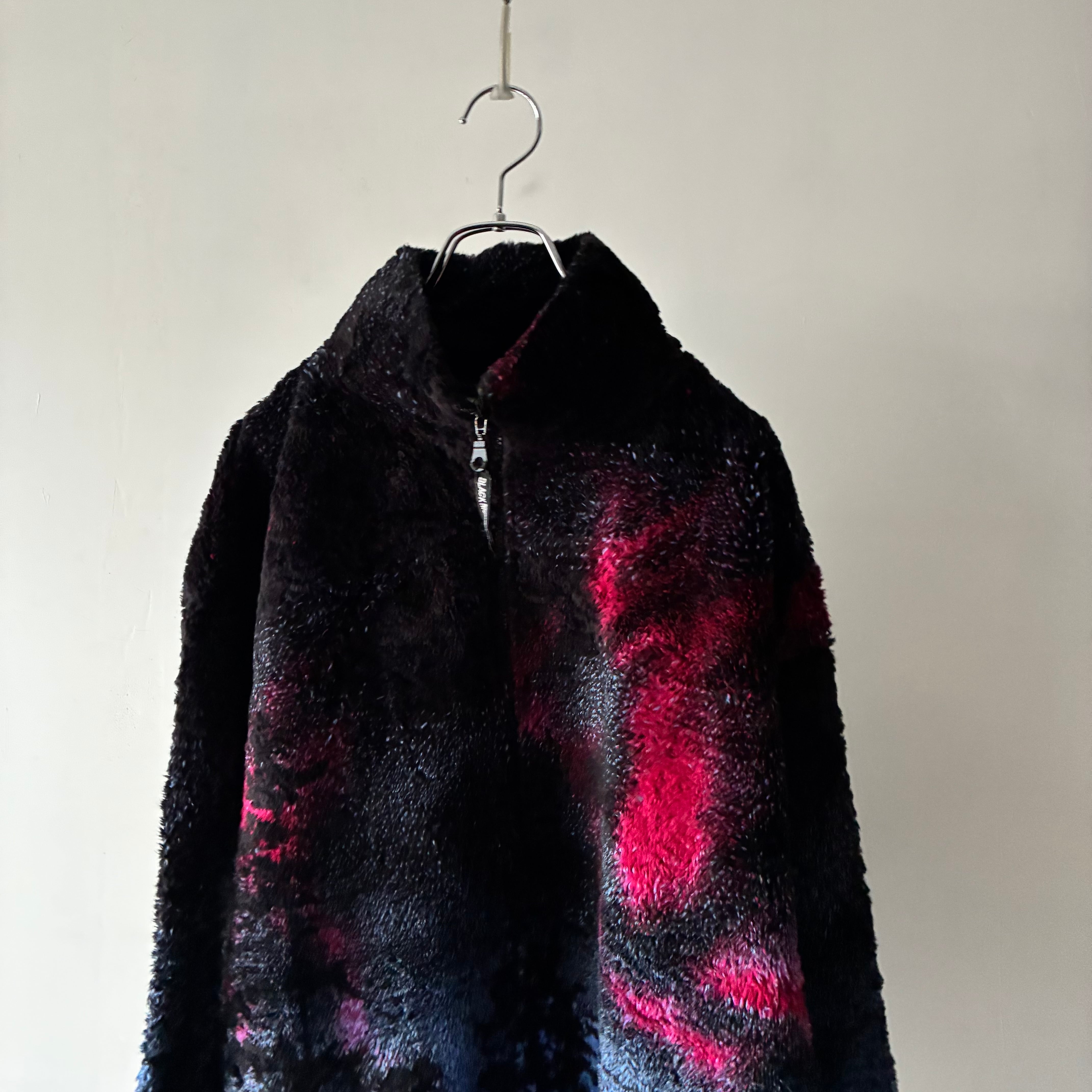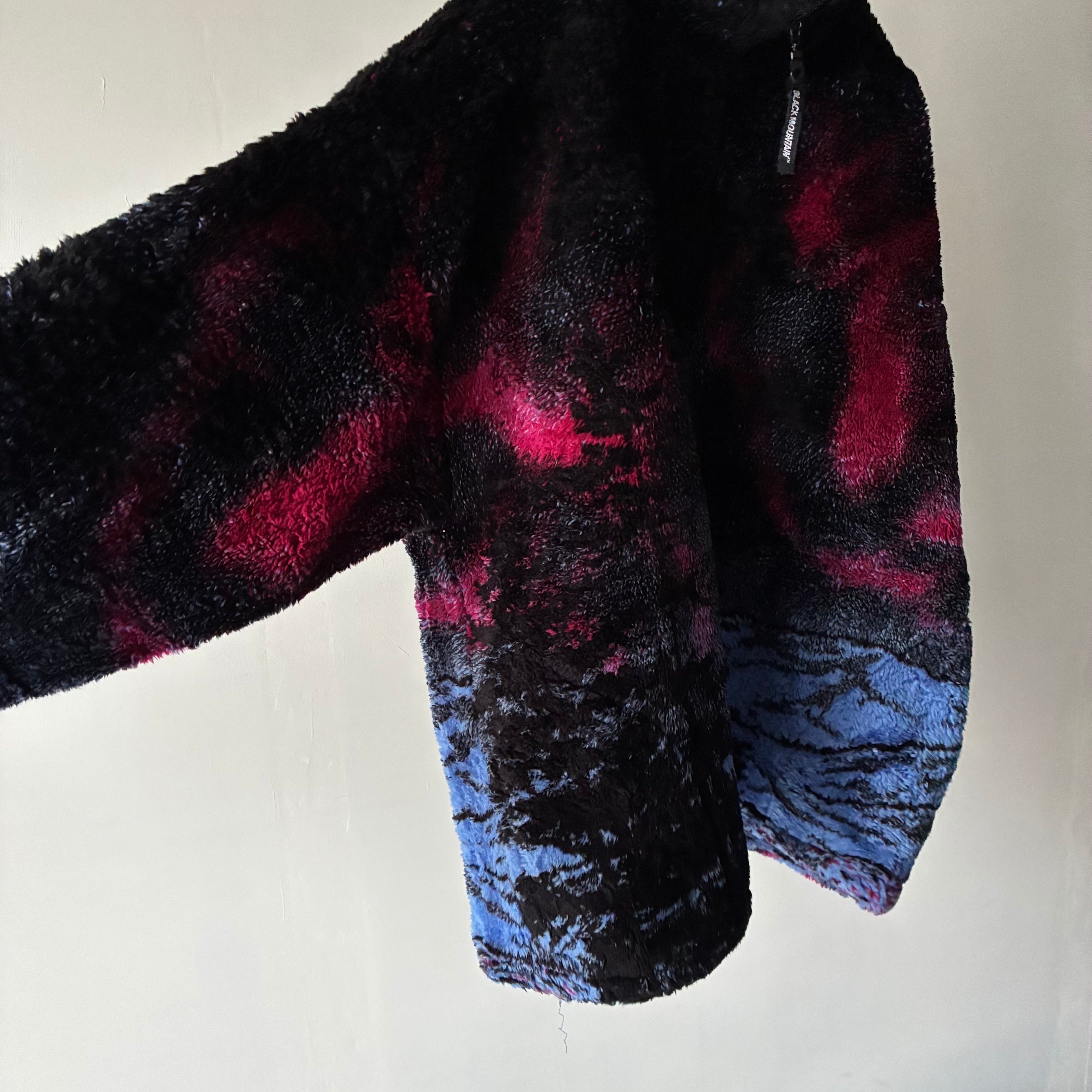深みのあるブラックをベースに、パープルやブルー、ワインレッドが溶け込むように配色されたデザインで、まるで夜空やオーロラのような幻想的な雰囲気を放つ一着です