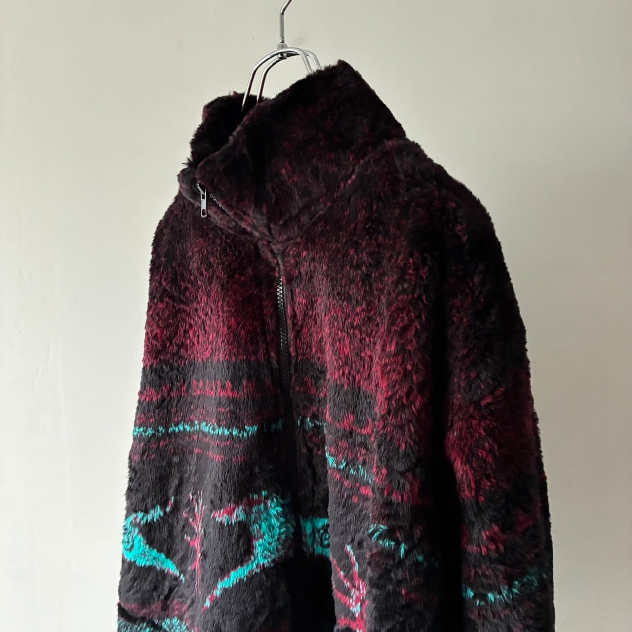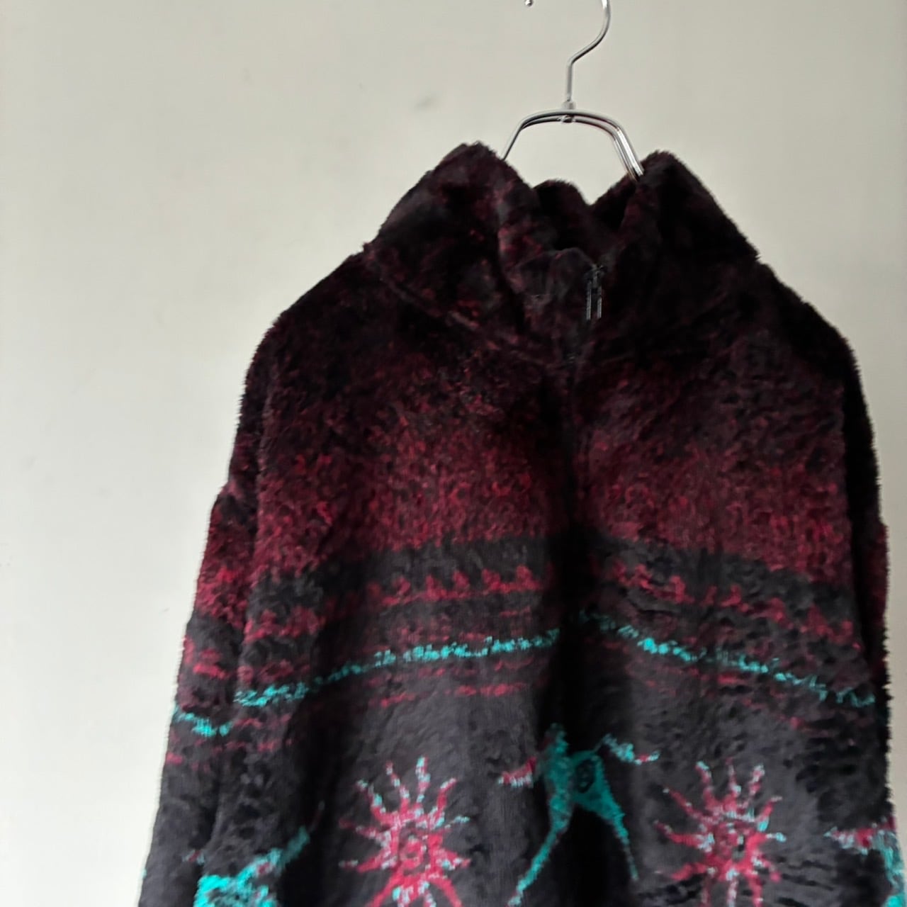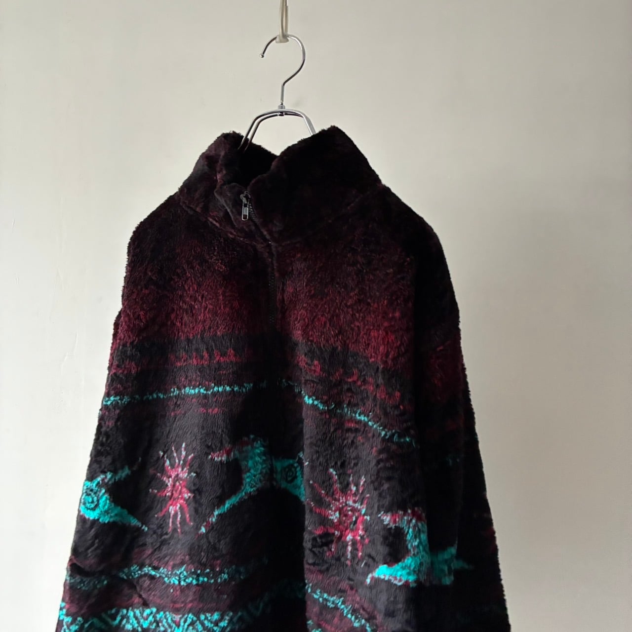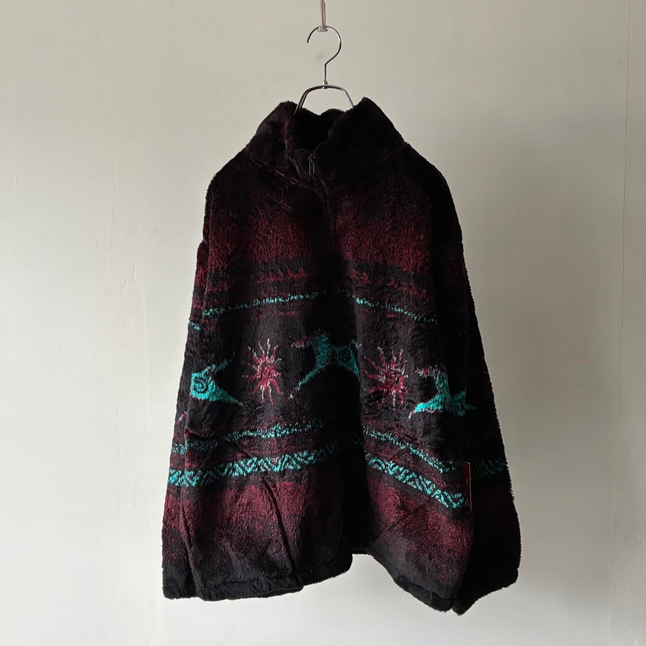 馬や太陽のようなマークで構成されたネイティブ調デザインや配色が映えるハイセンスなフリースジャケット