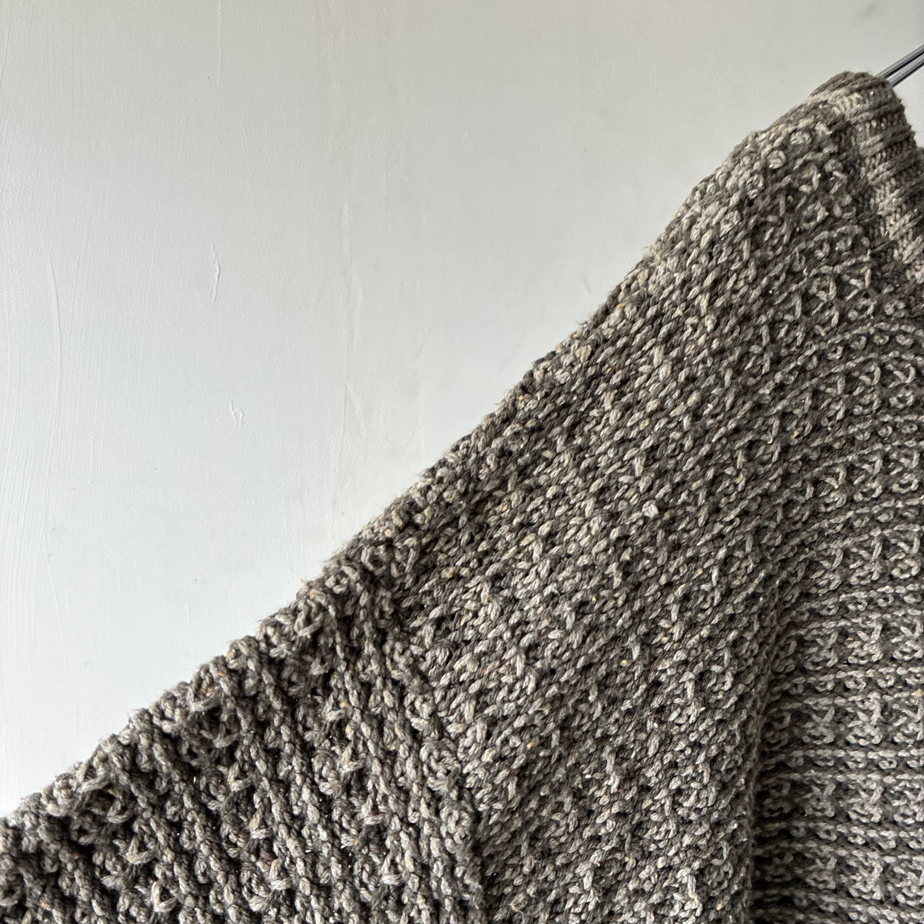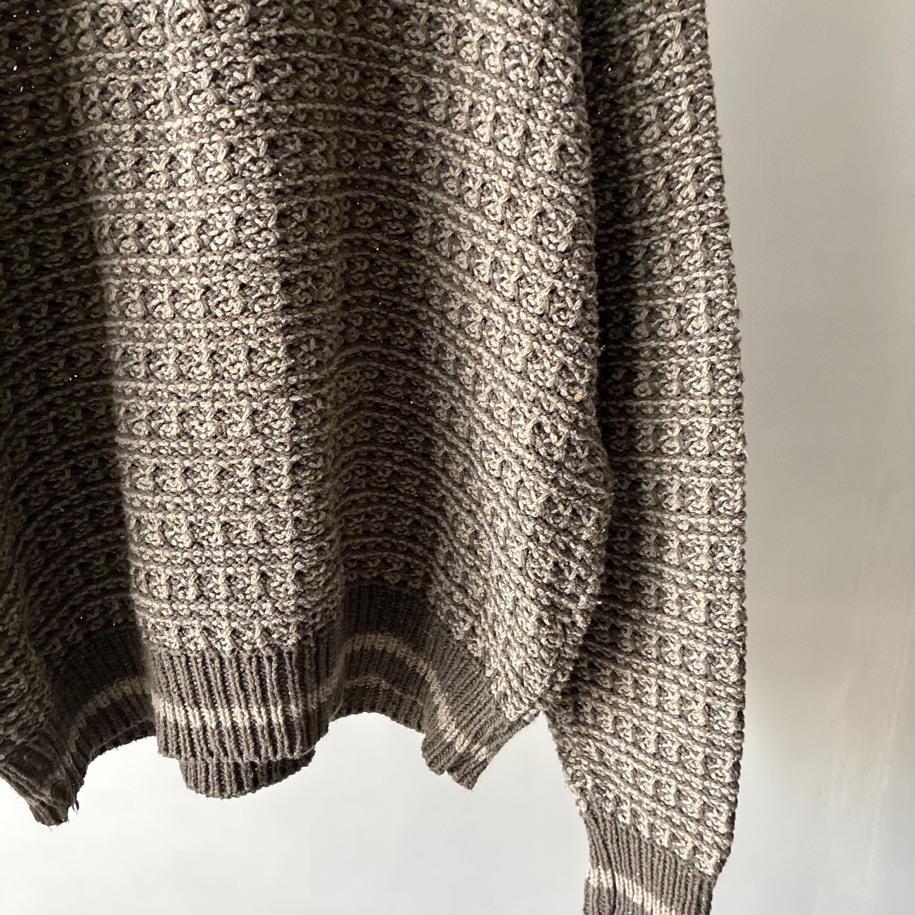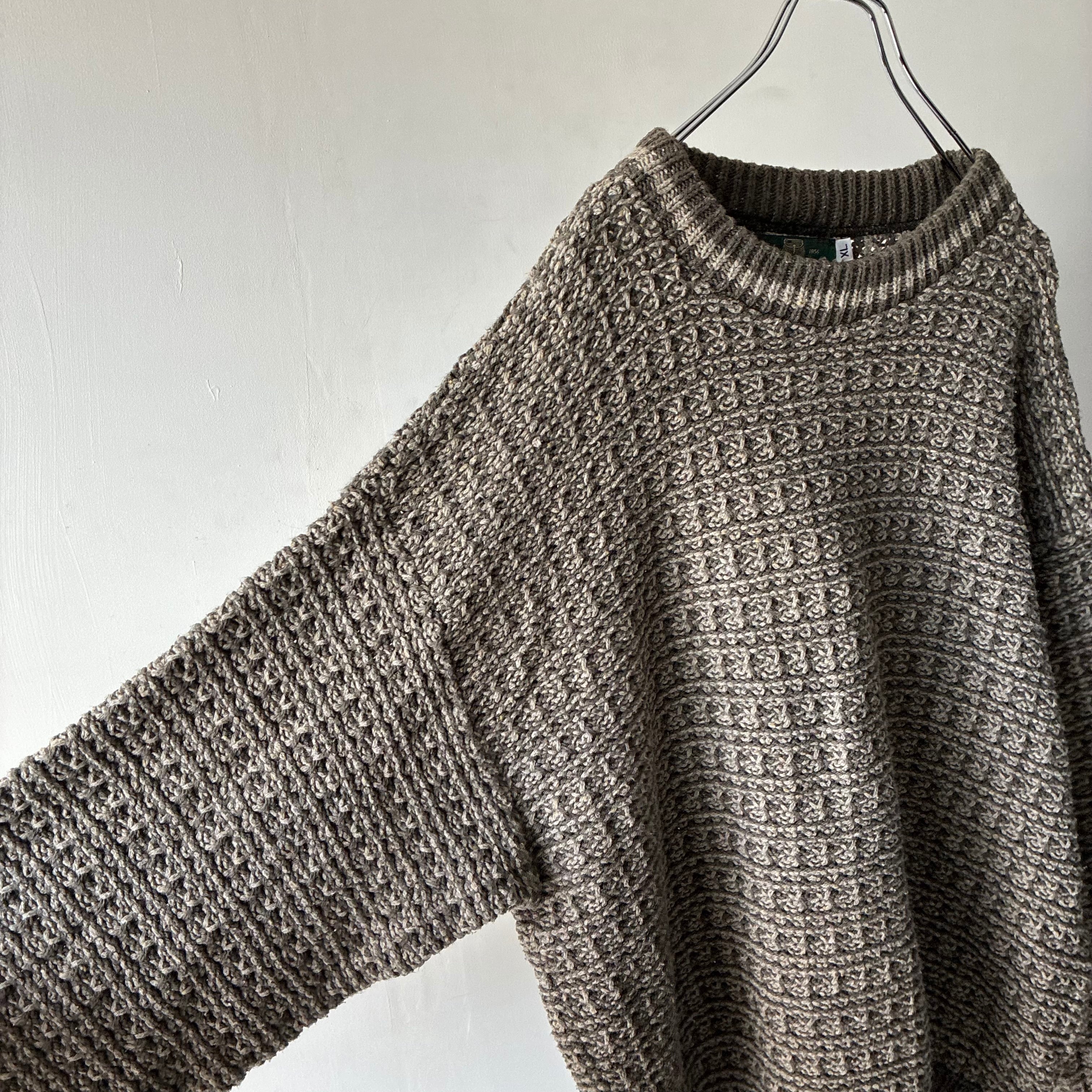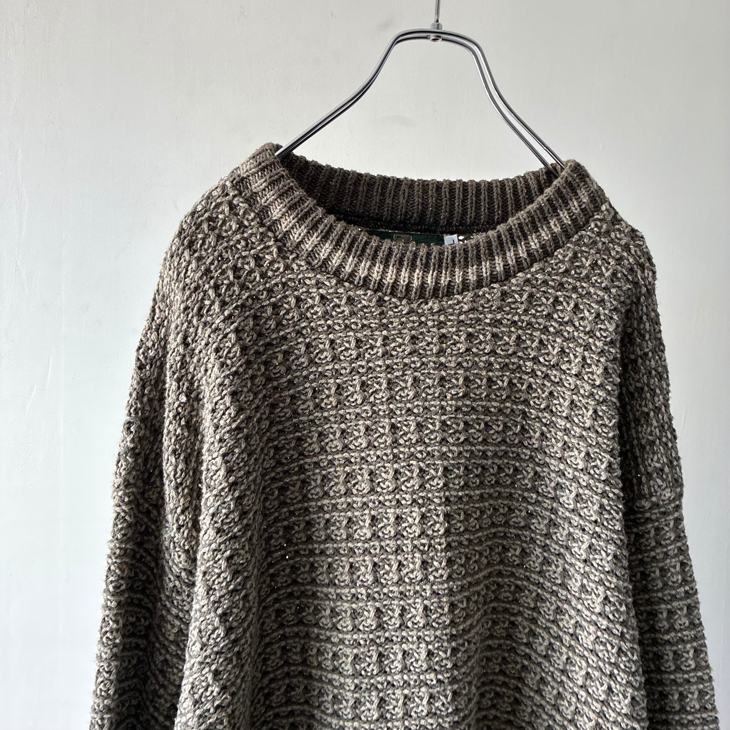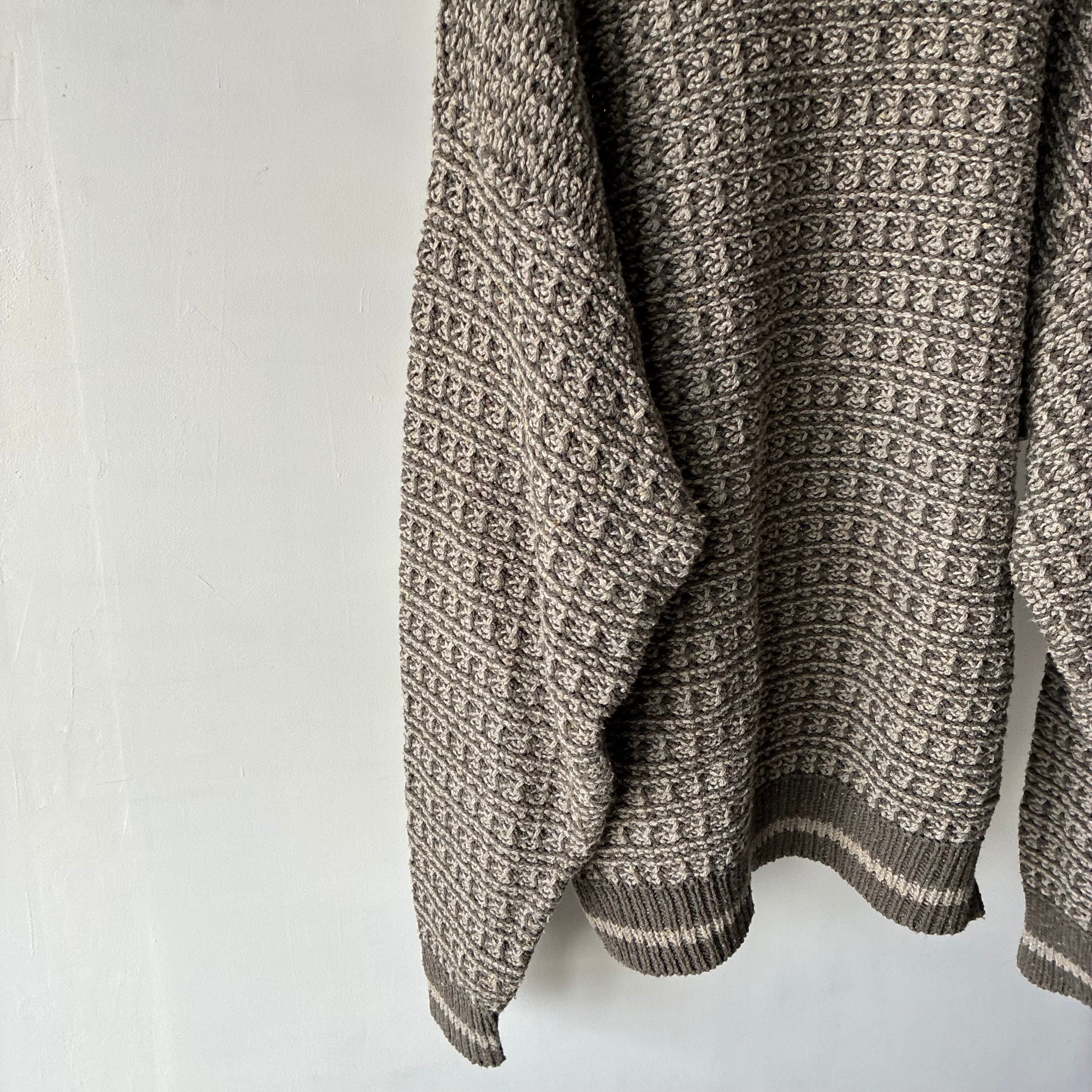 立体感のあるワッフル編みのような凹凸のある編地が特徴でどこかブリティッシュトラッドな雰囲気も感じさせる一枚