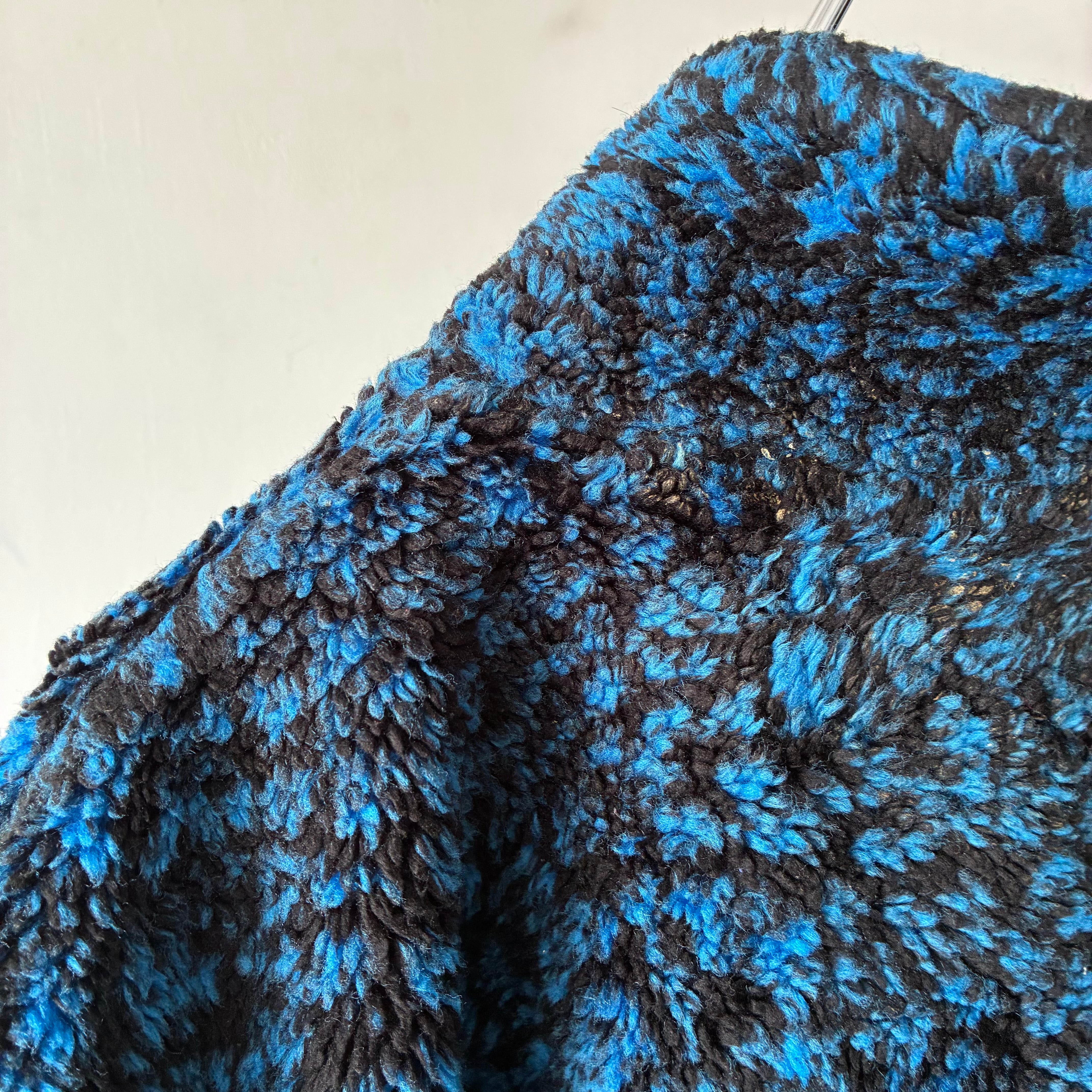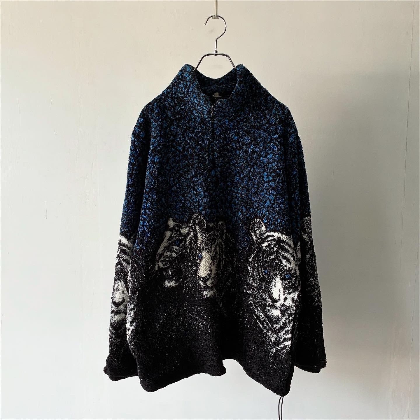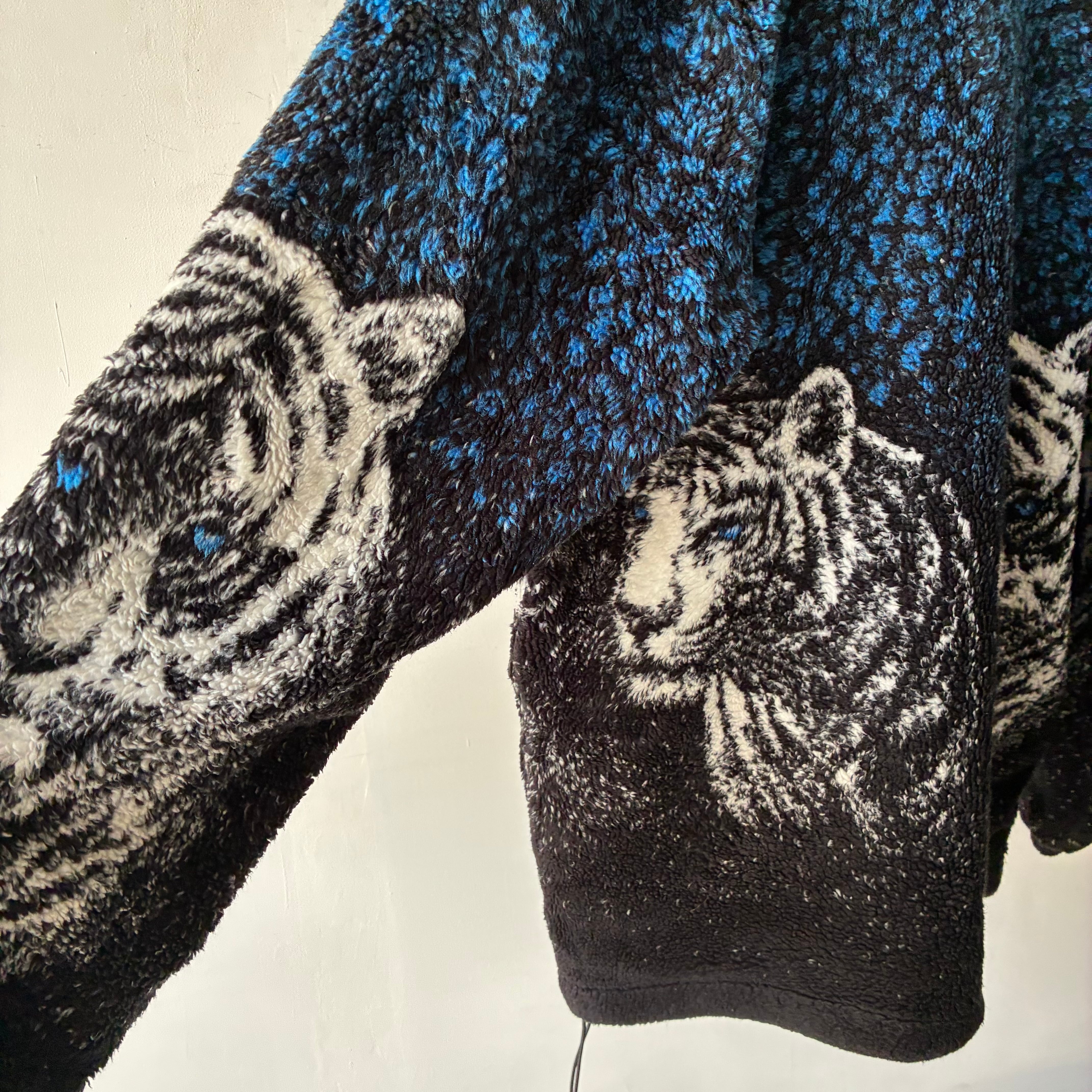 全体にブルー×ブラックの霜降り調パターンが施され、フロントから袖にかけて描かれたタイガーグラフィックが印象的な一着