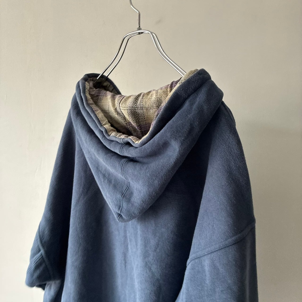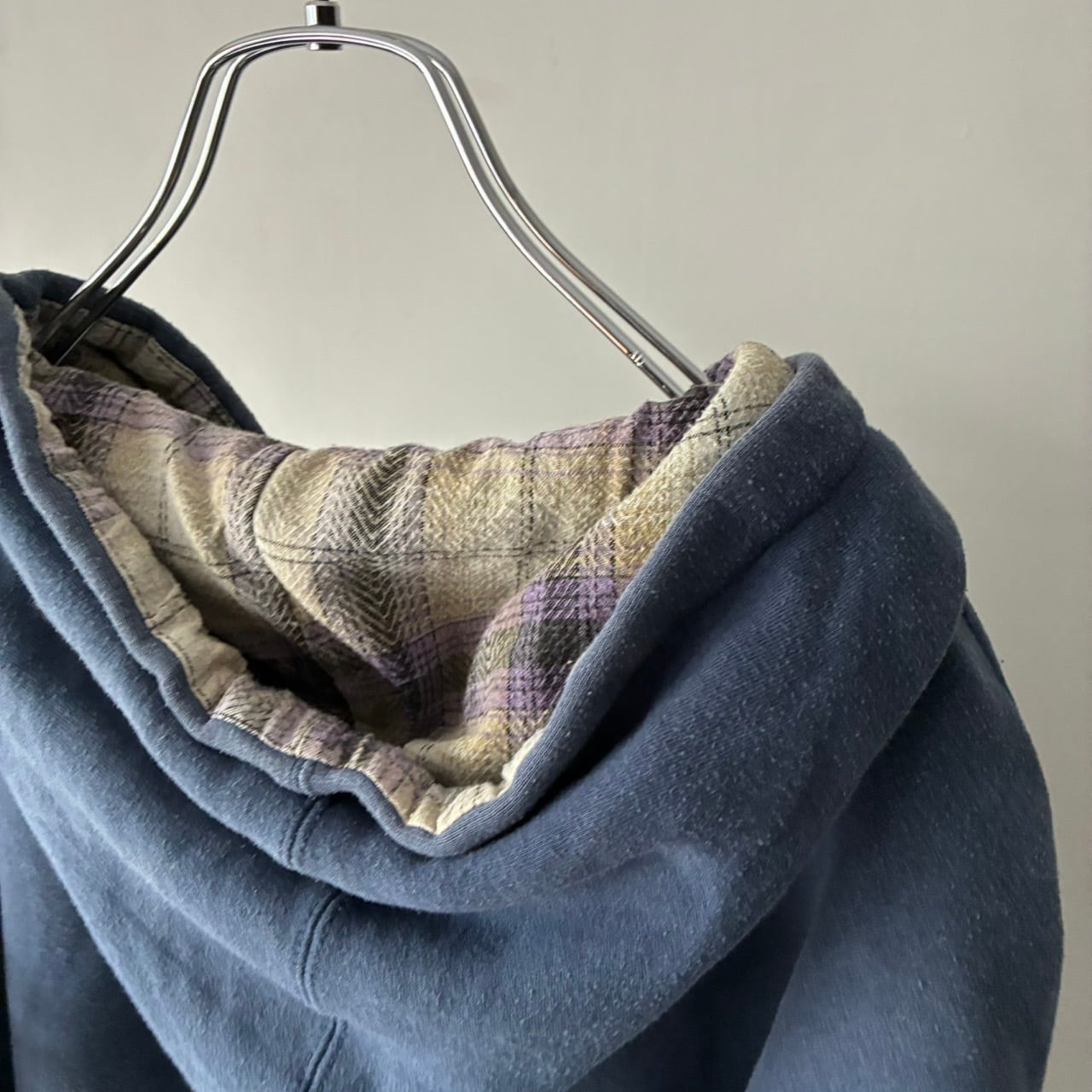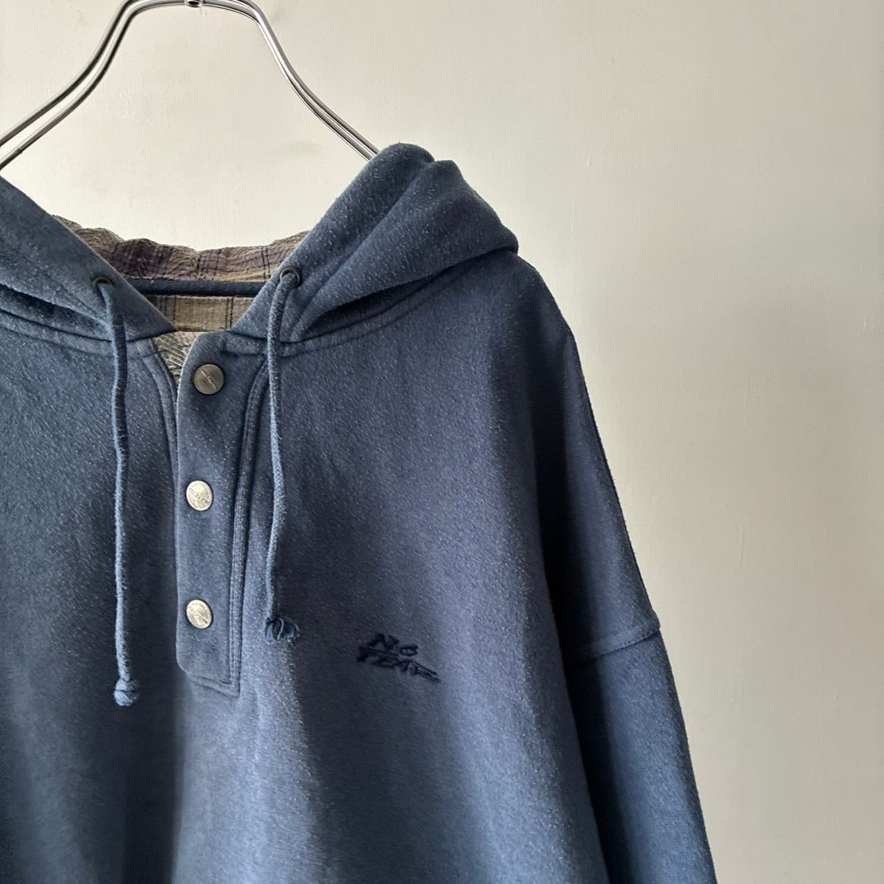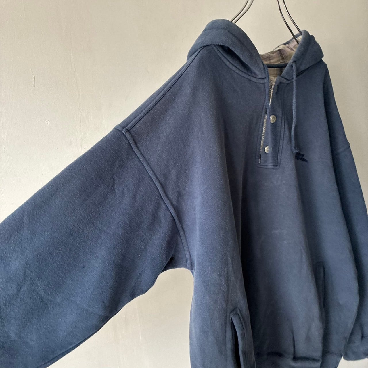 スナップボタンのヘンリーネック仕様で裏地のチェックも良いアクセントに