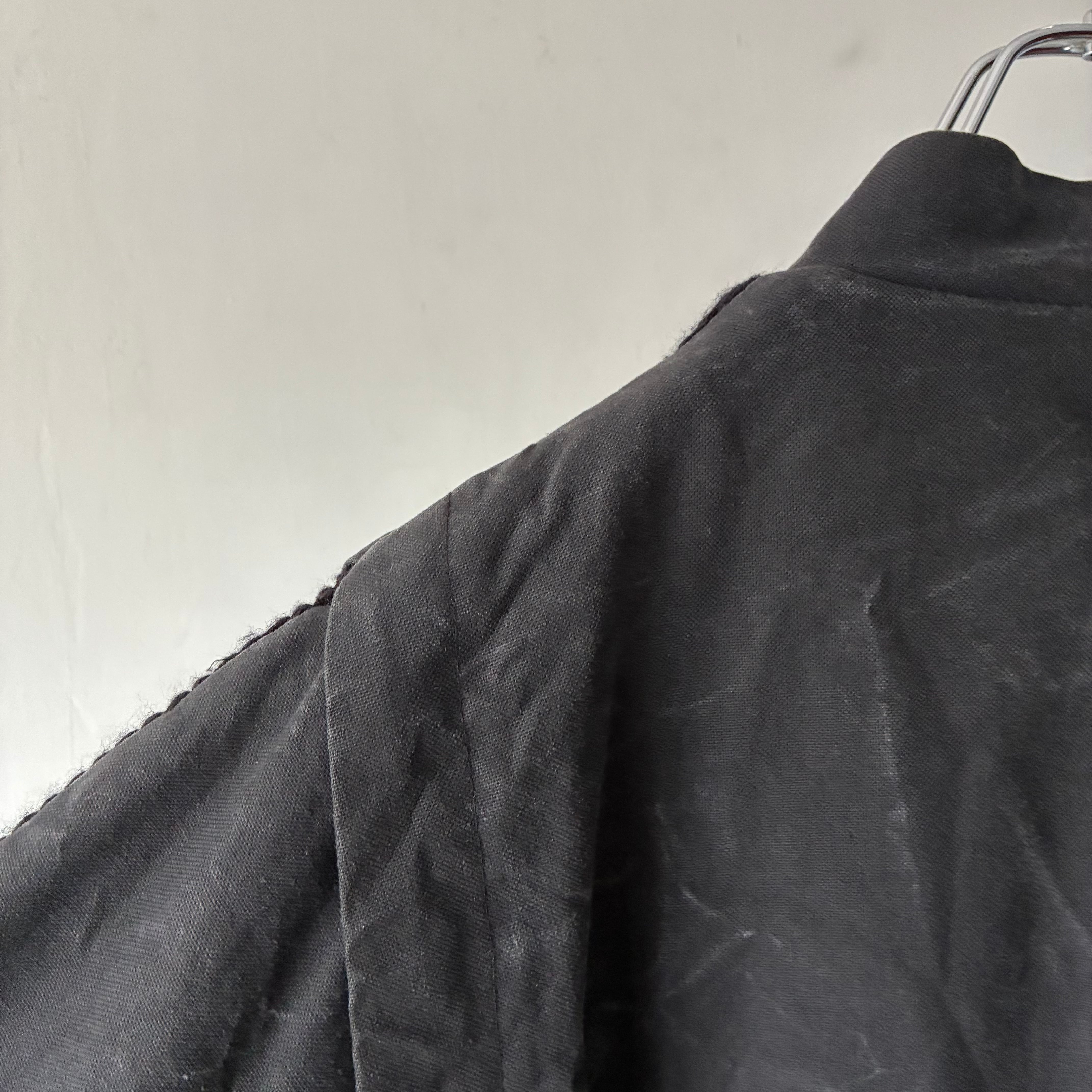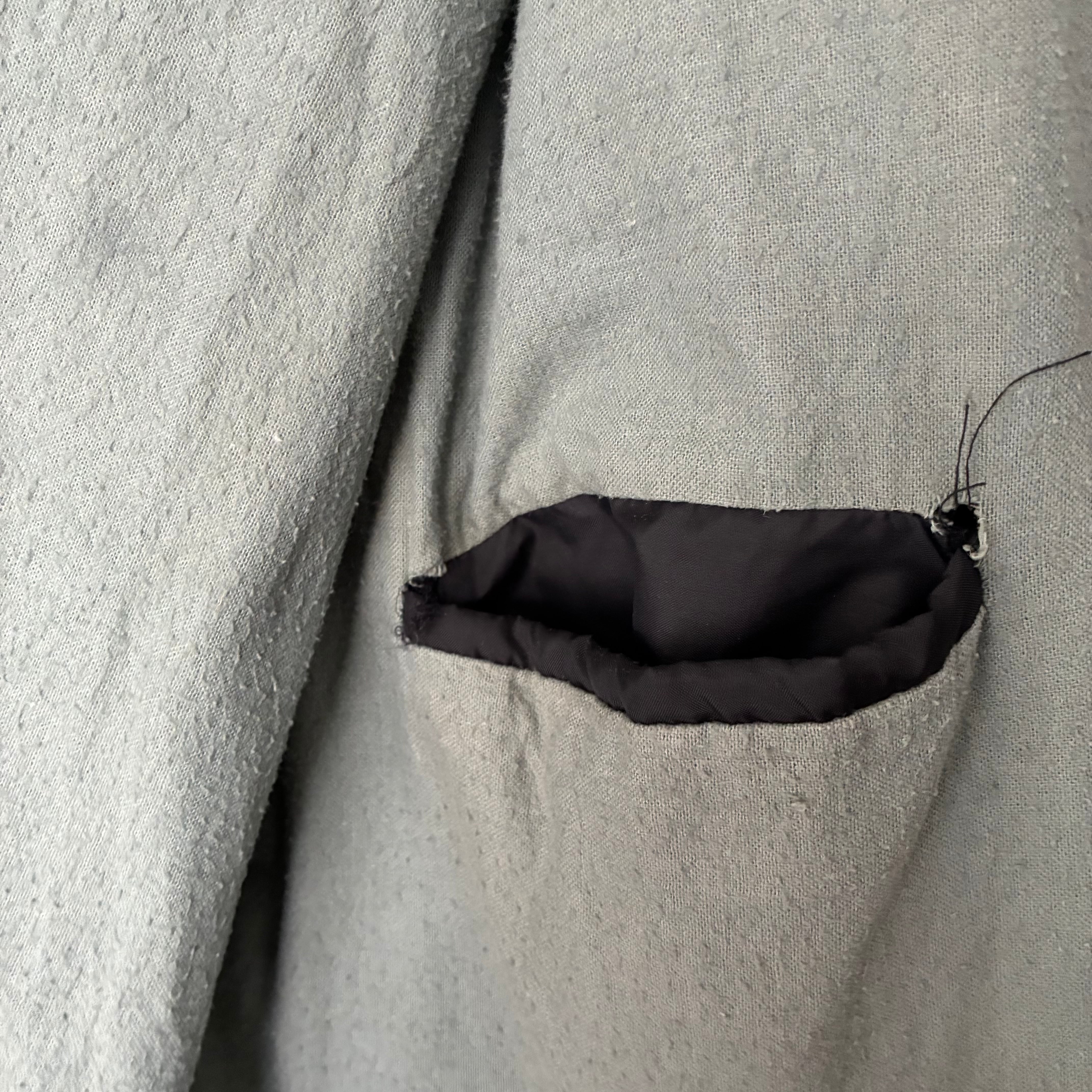 ゆったりとしたシルエットで羽織りやすく、内側には淡いグリーンの裏地が施された細部までデザイン性の高いアイテムかと