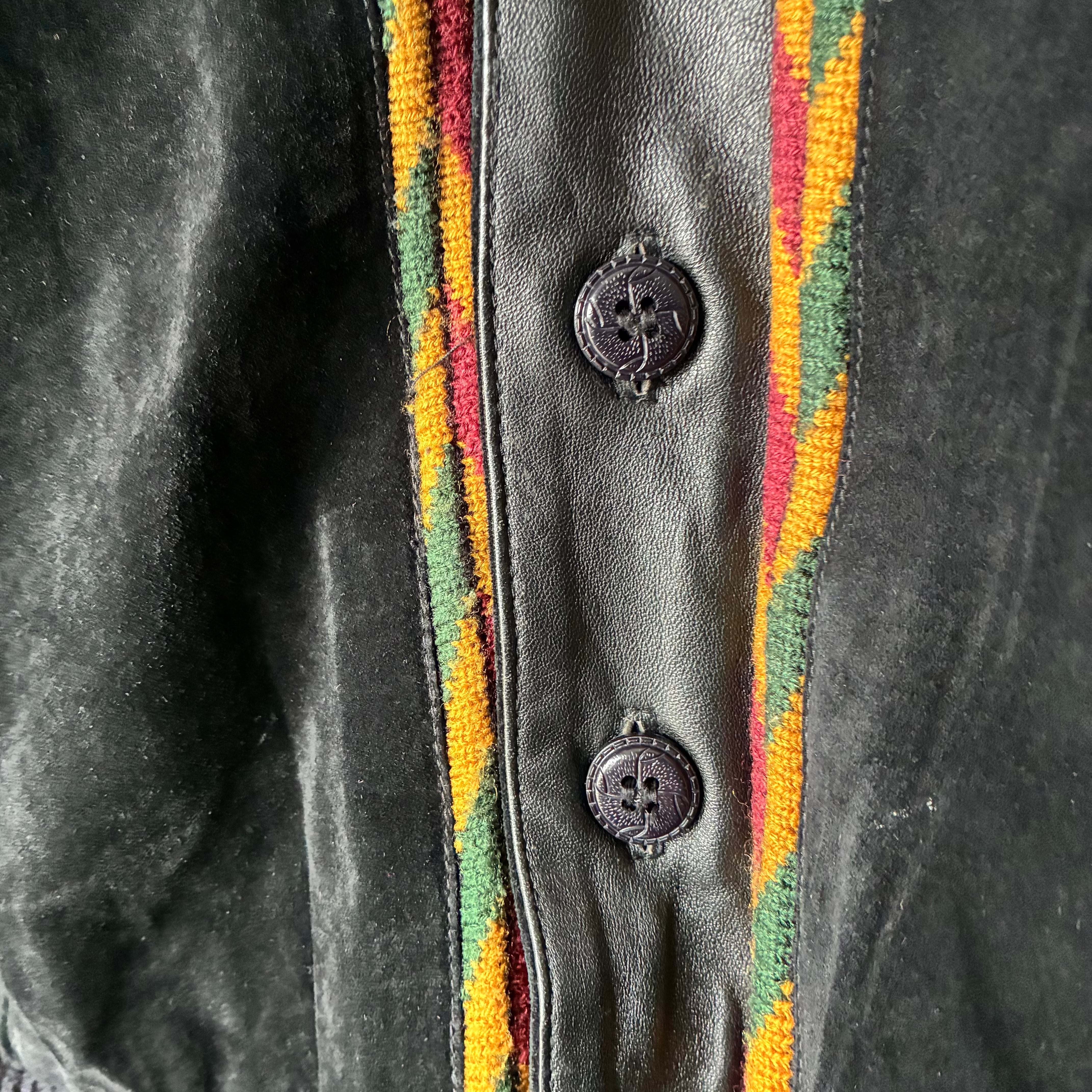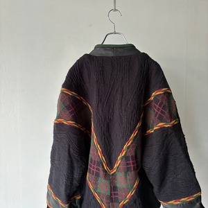 首元とパイピングにはグリーン×マルチカラーのラインが走り民族調のアクセントが効いた仕上がり