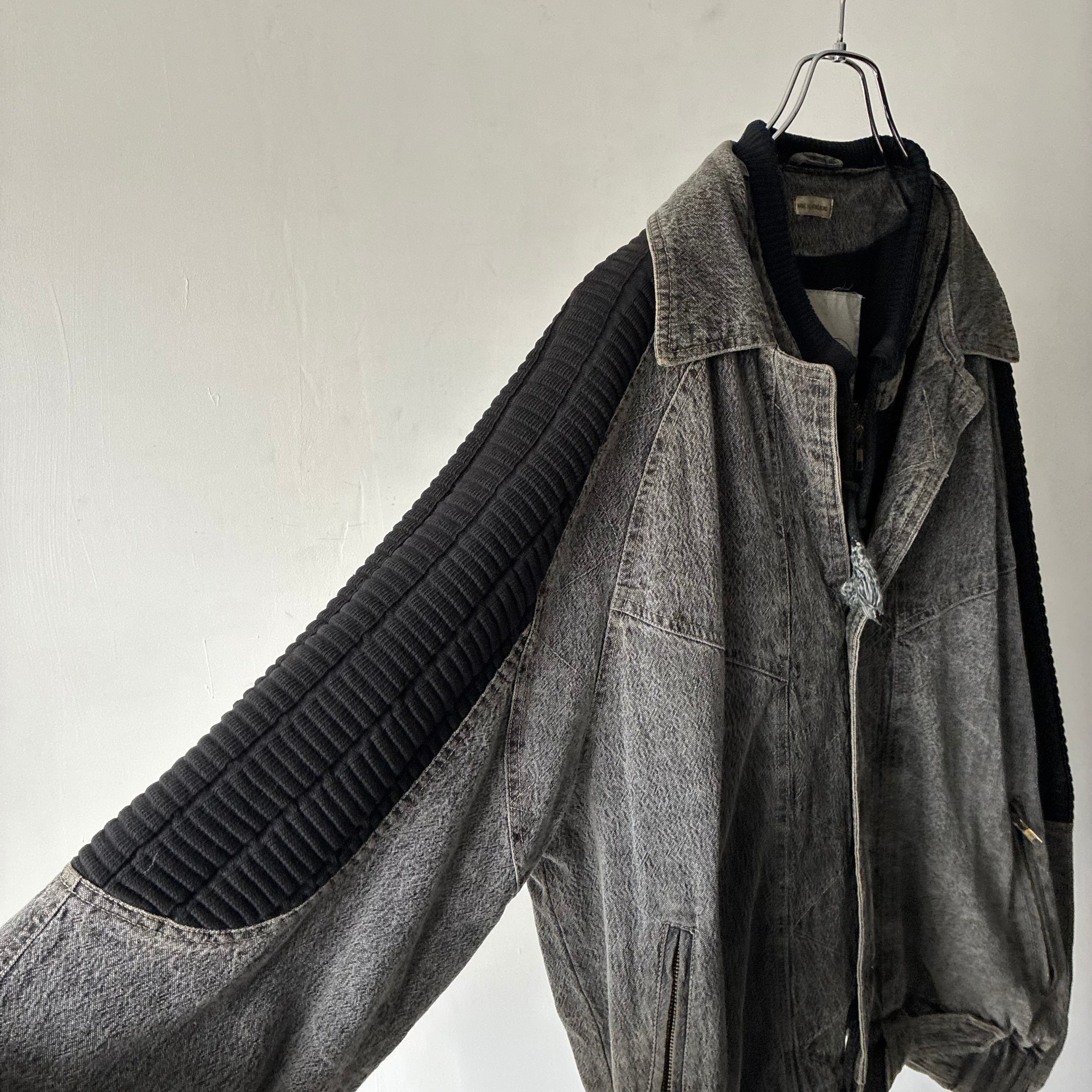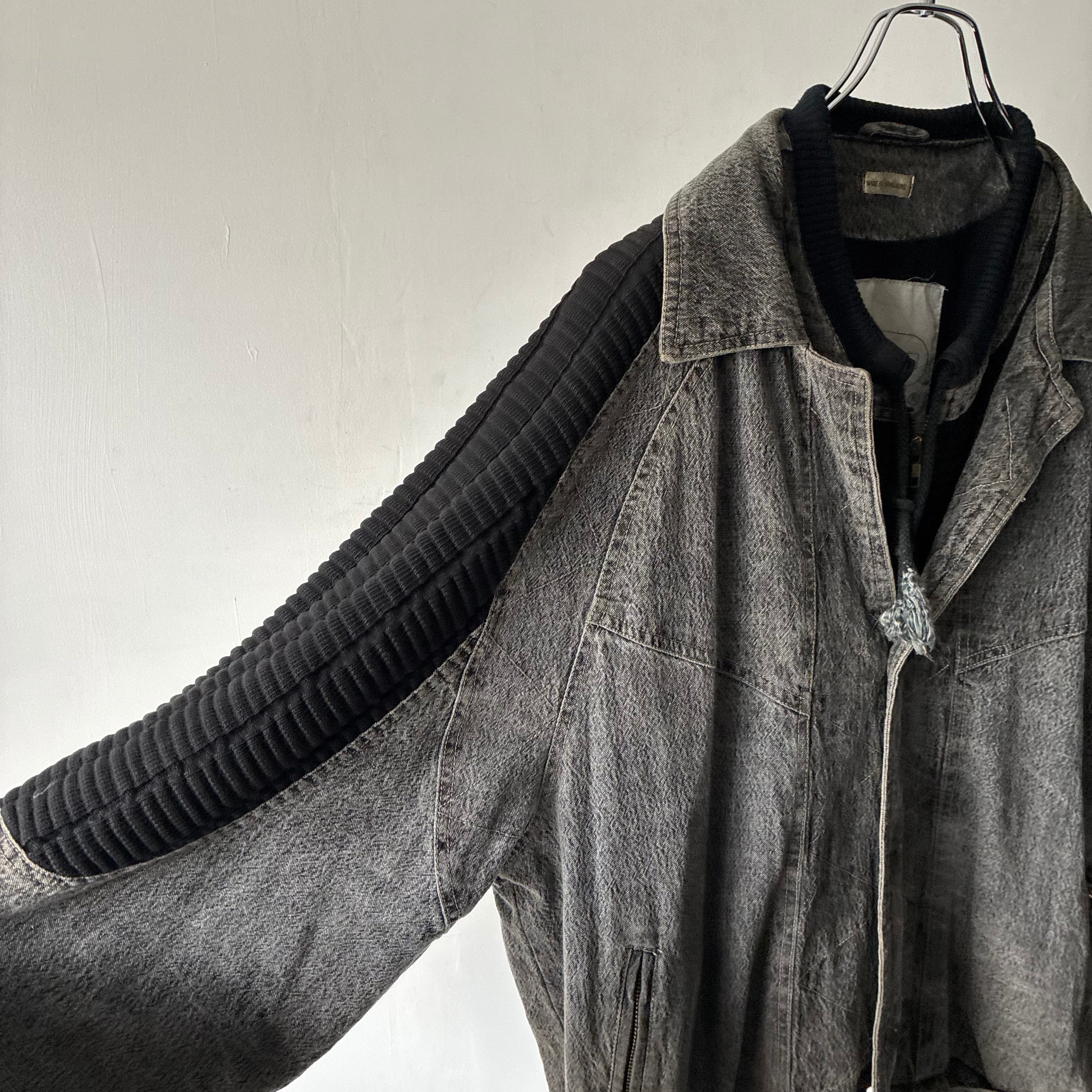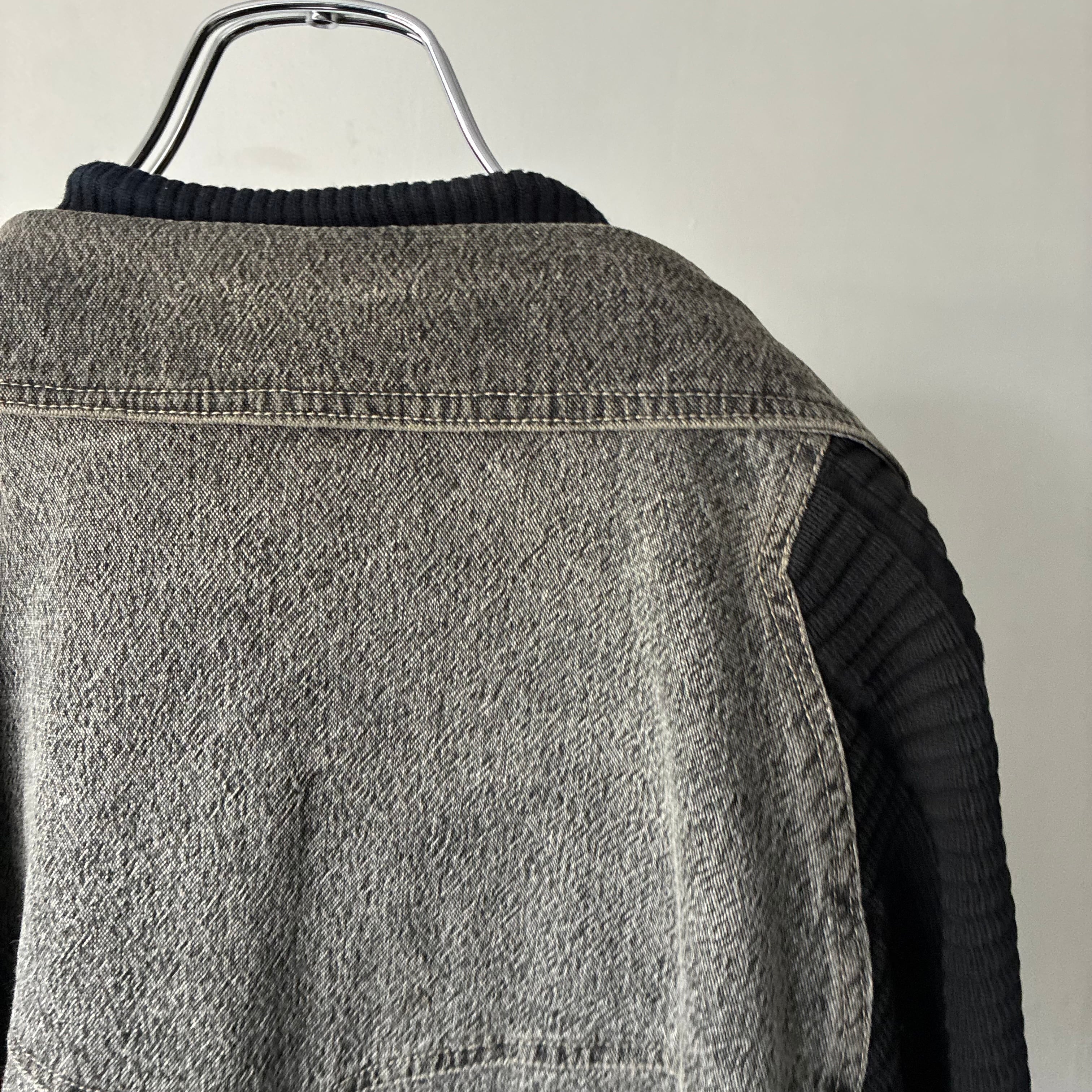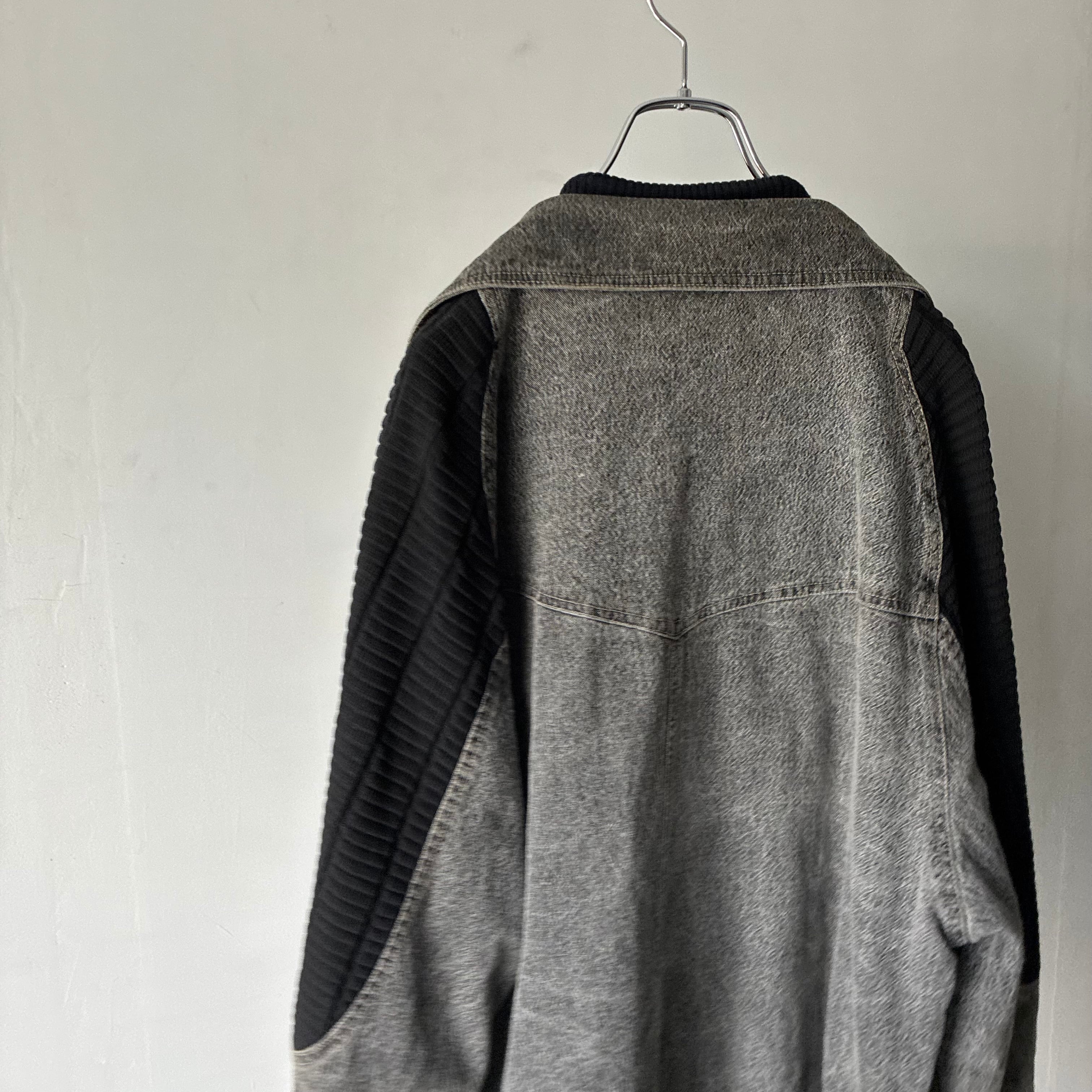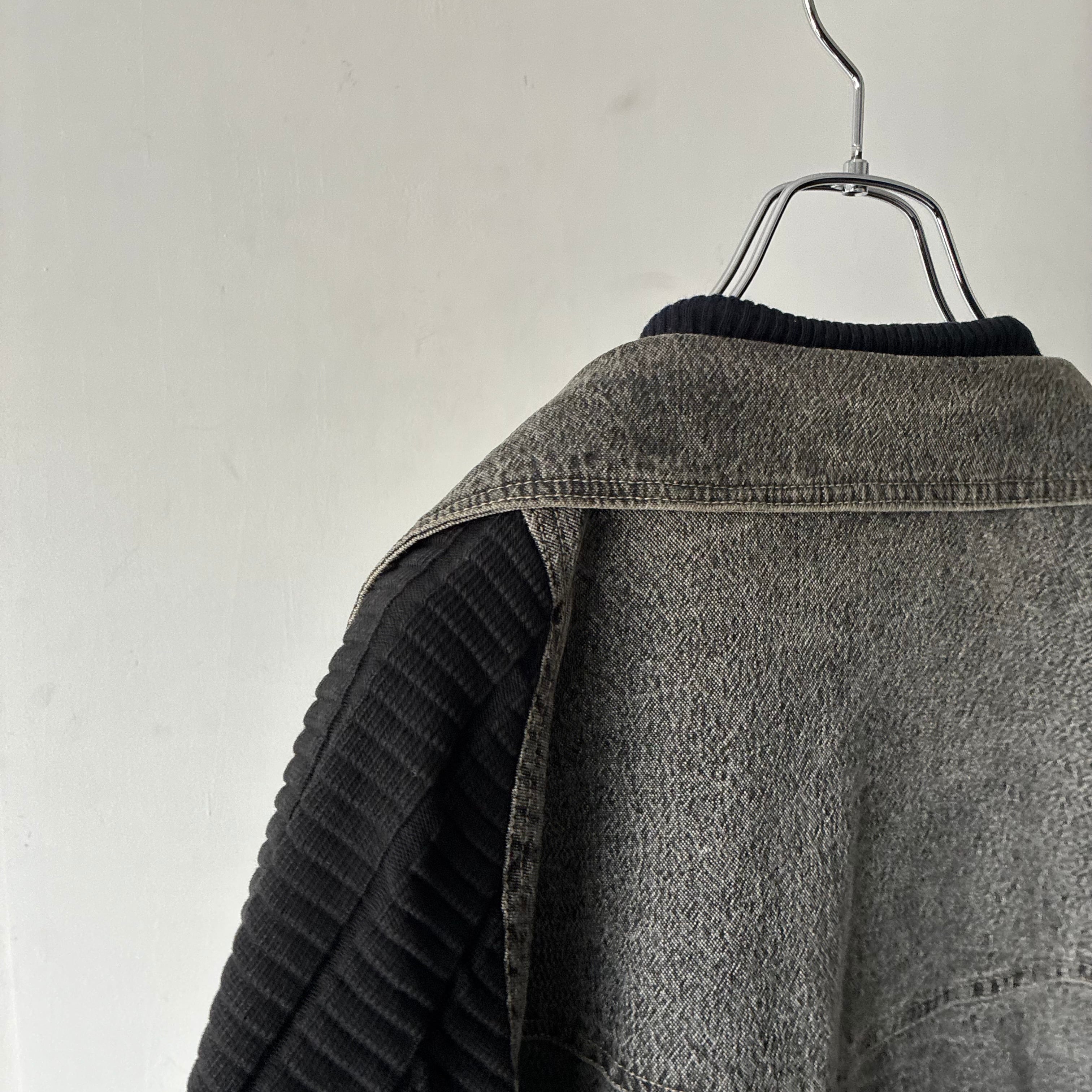 身頃にはウォッシュ加工が施されたグレーデニム生地、袖には立体感のあるリブニット素材を使用した異素材切り替えの一着