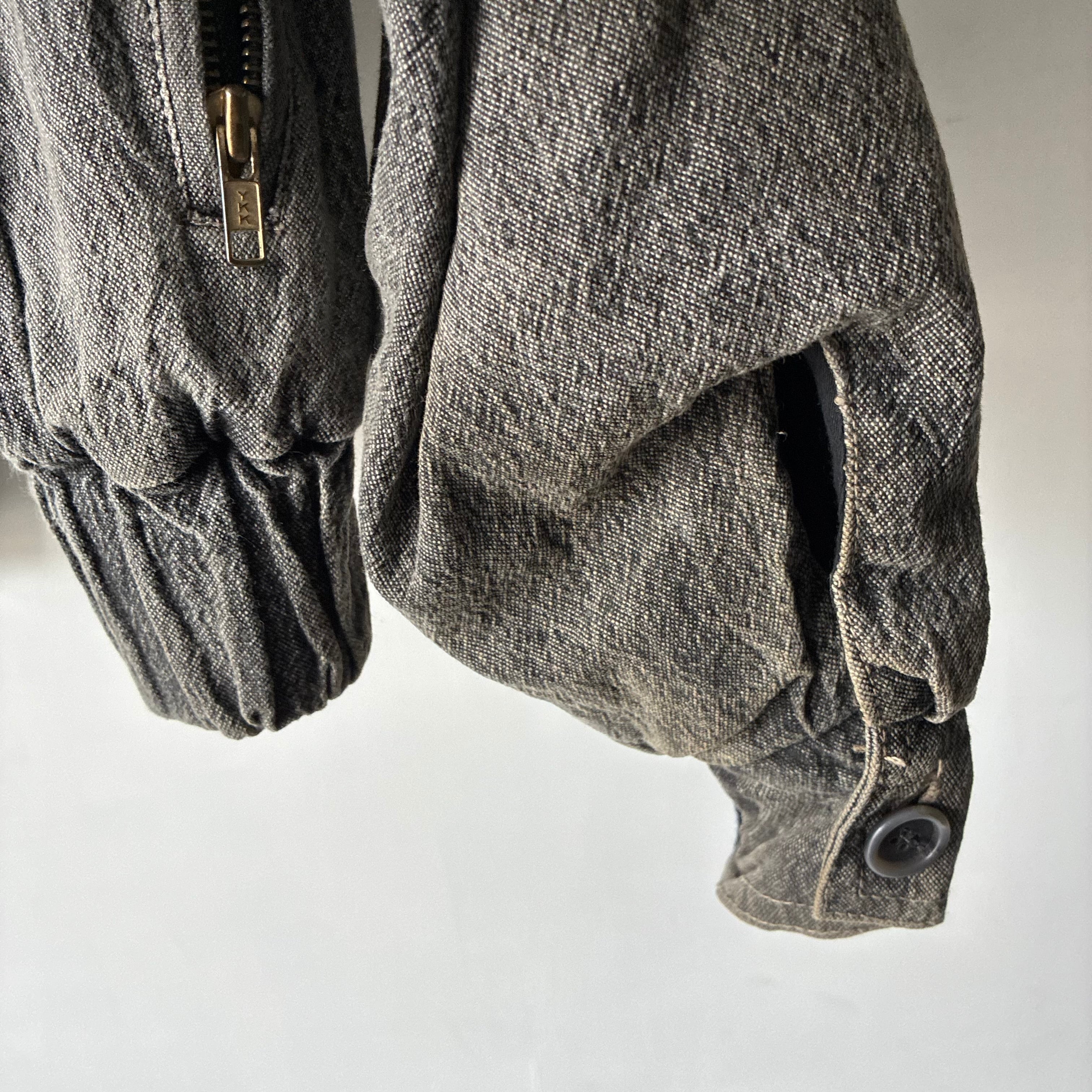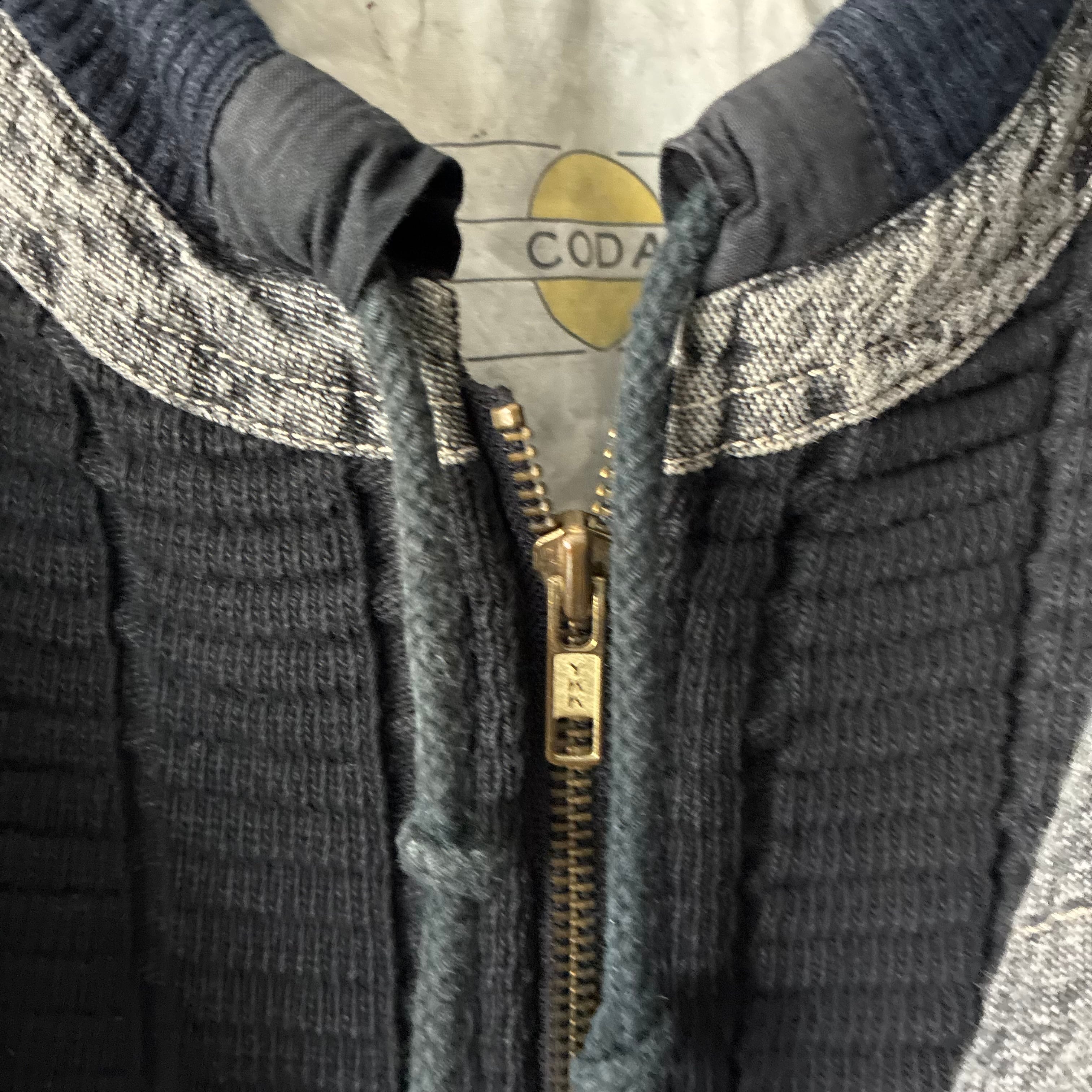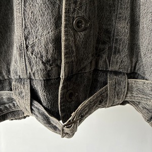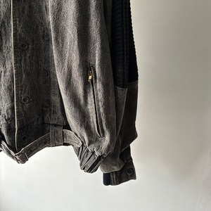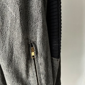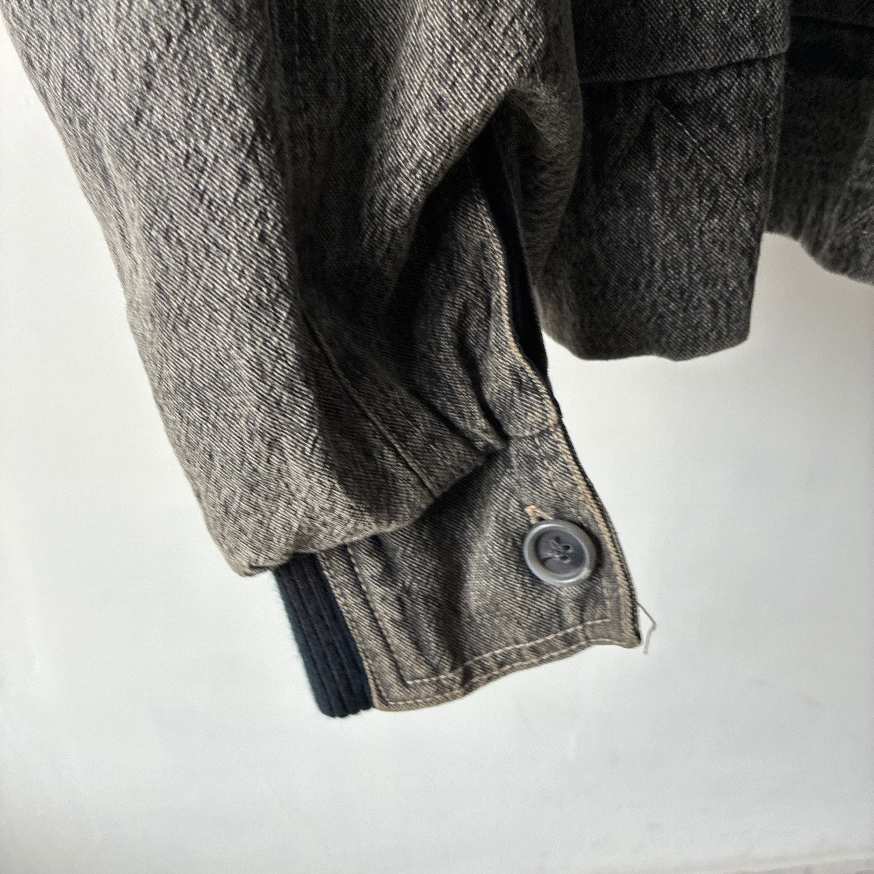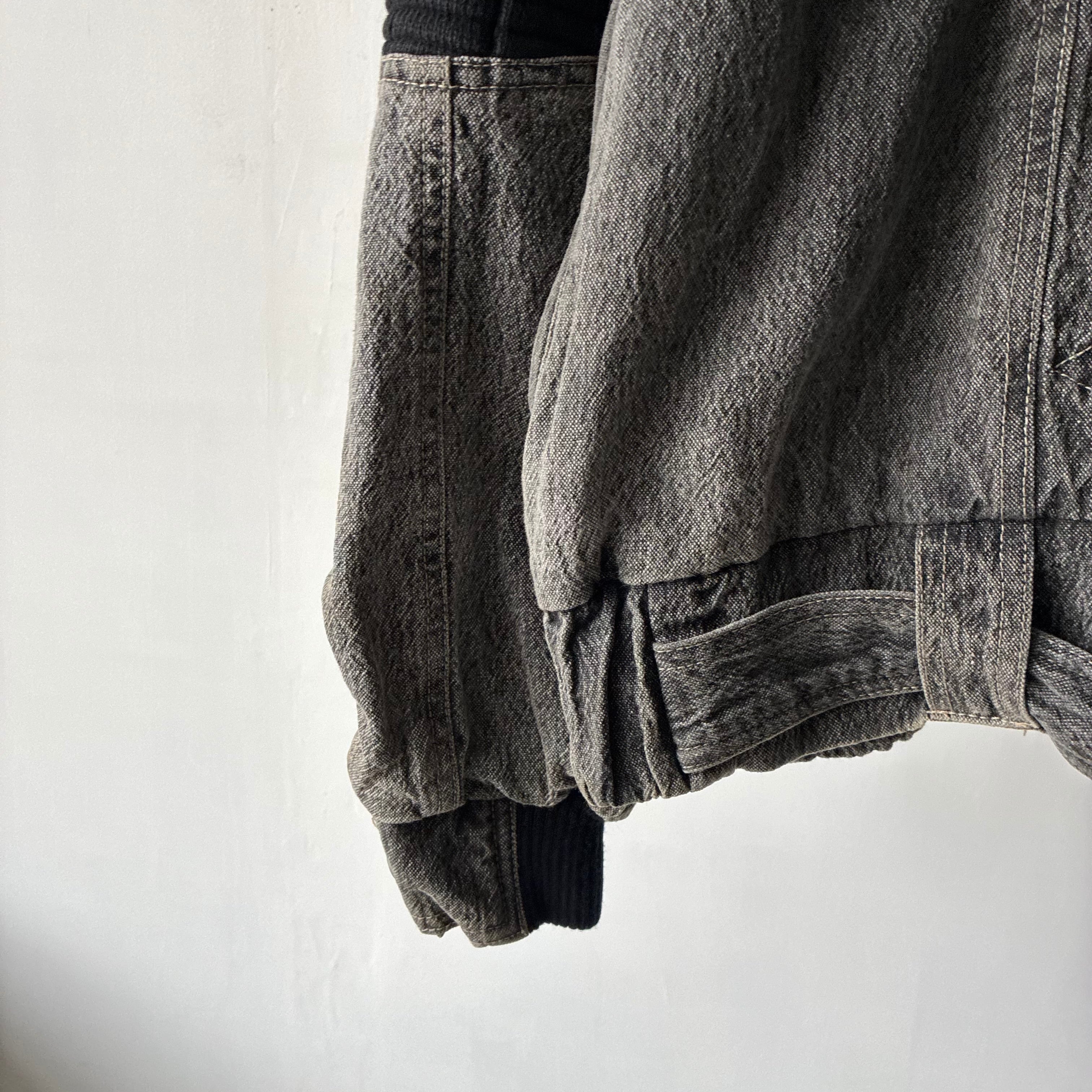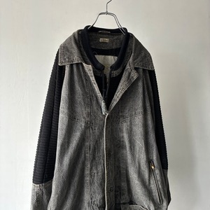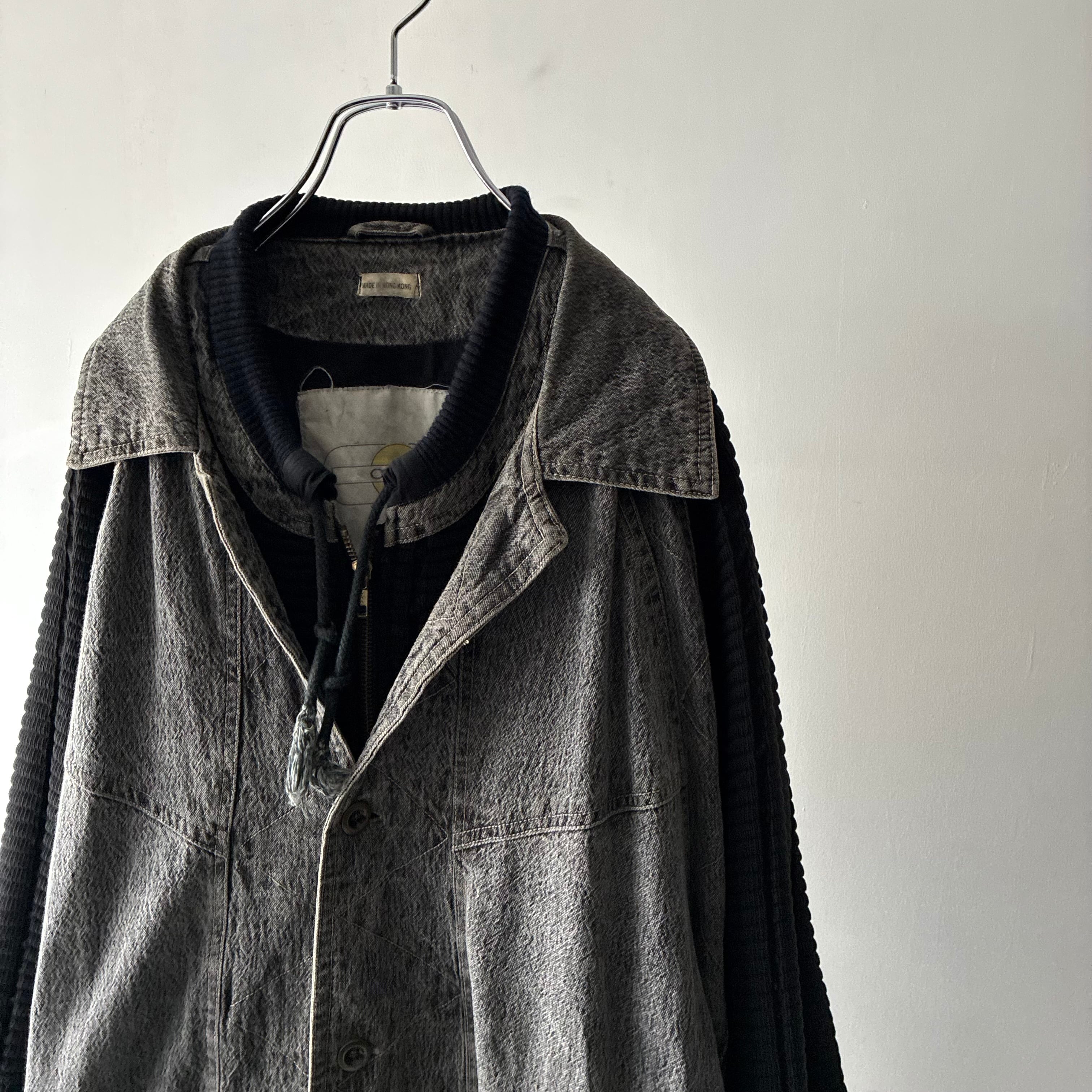 身頃にはウォッシュ加工が施されたグレーデニム生地、袖には立体感のあるリブニット素材を使用した異素材切り替えの一着