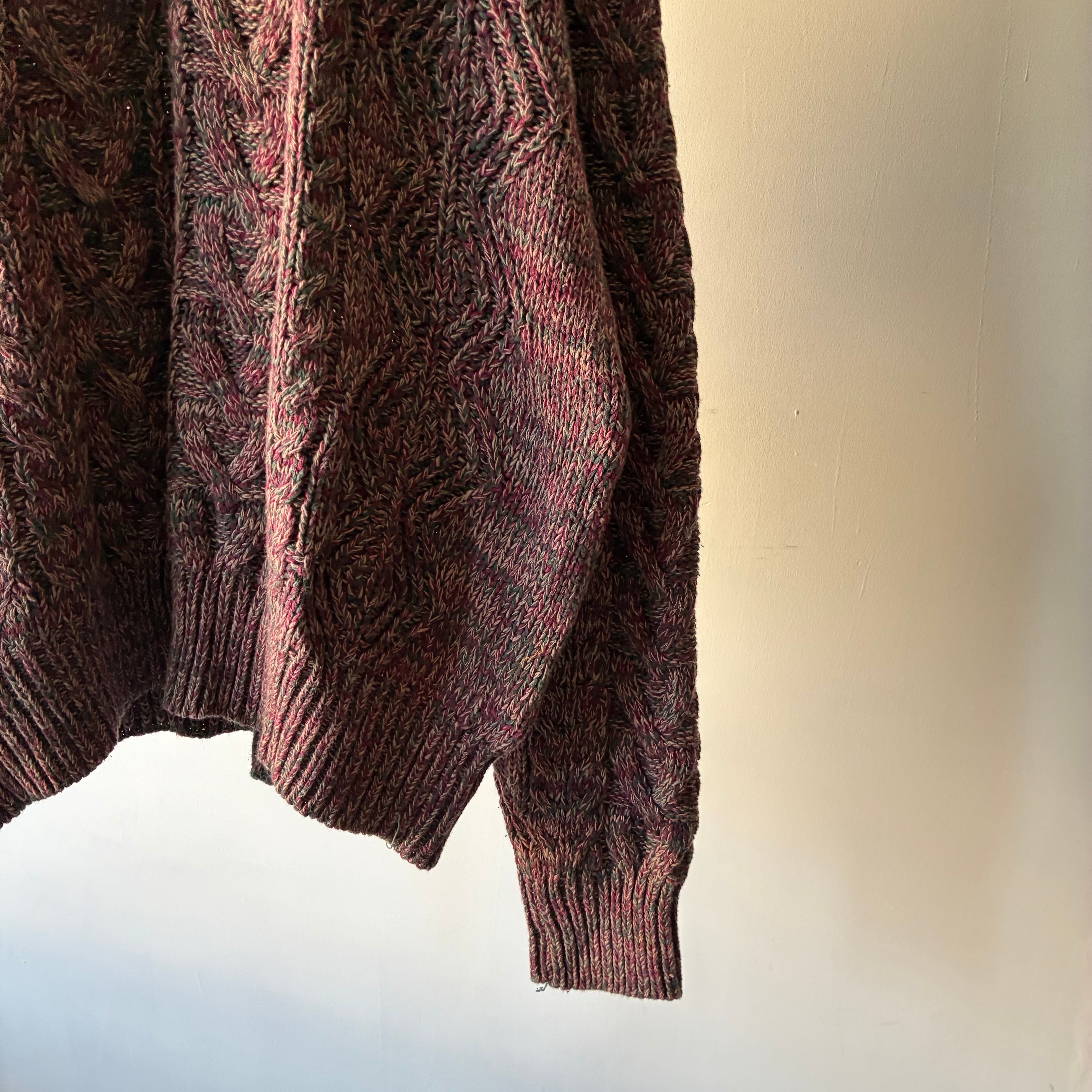 特徴的なのは、全面に施された立体的なケーブル編み・幾何学柄のミックスパターン