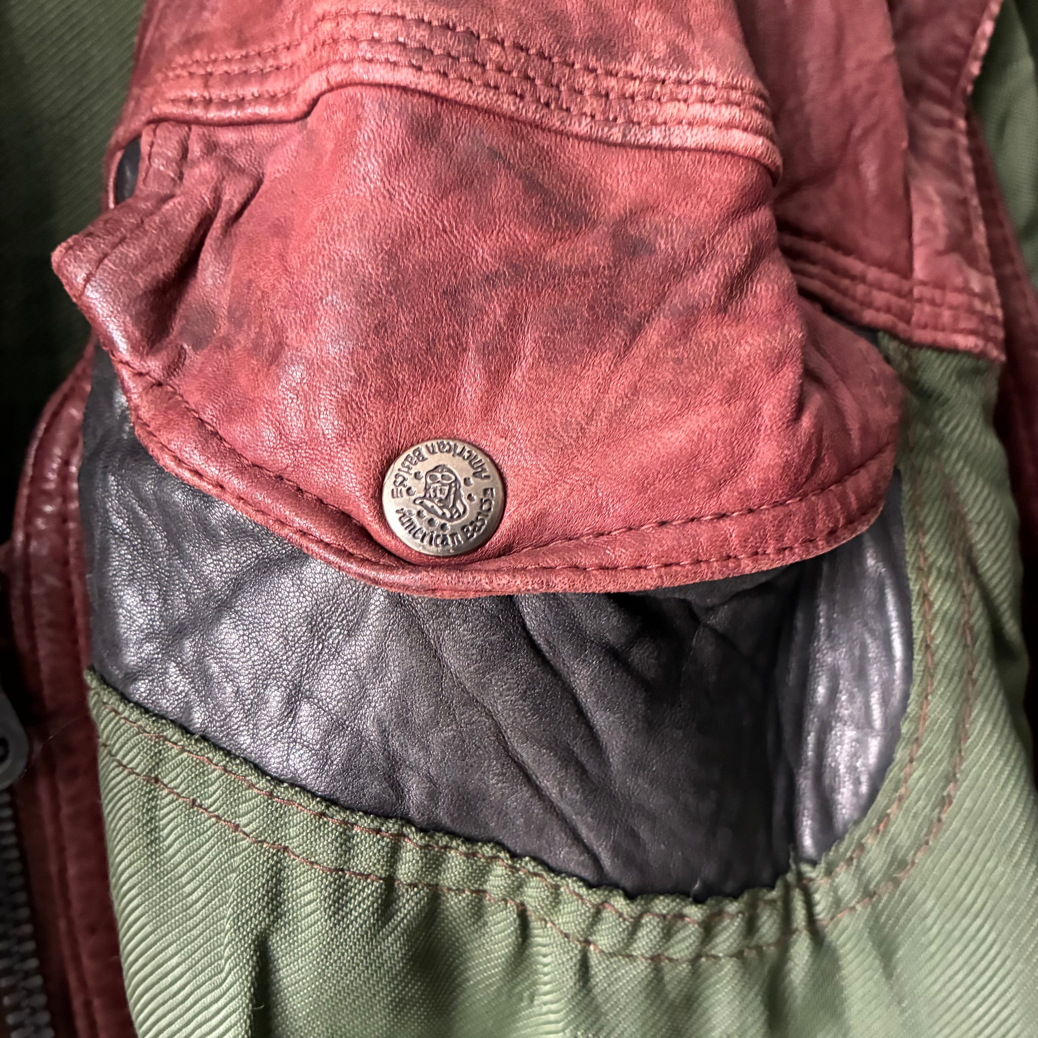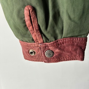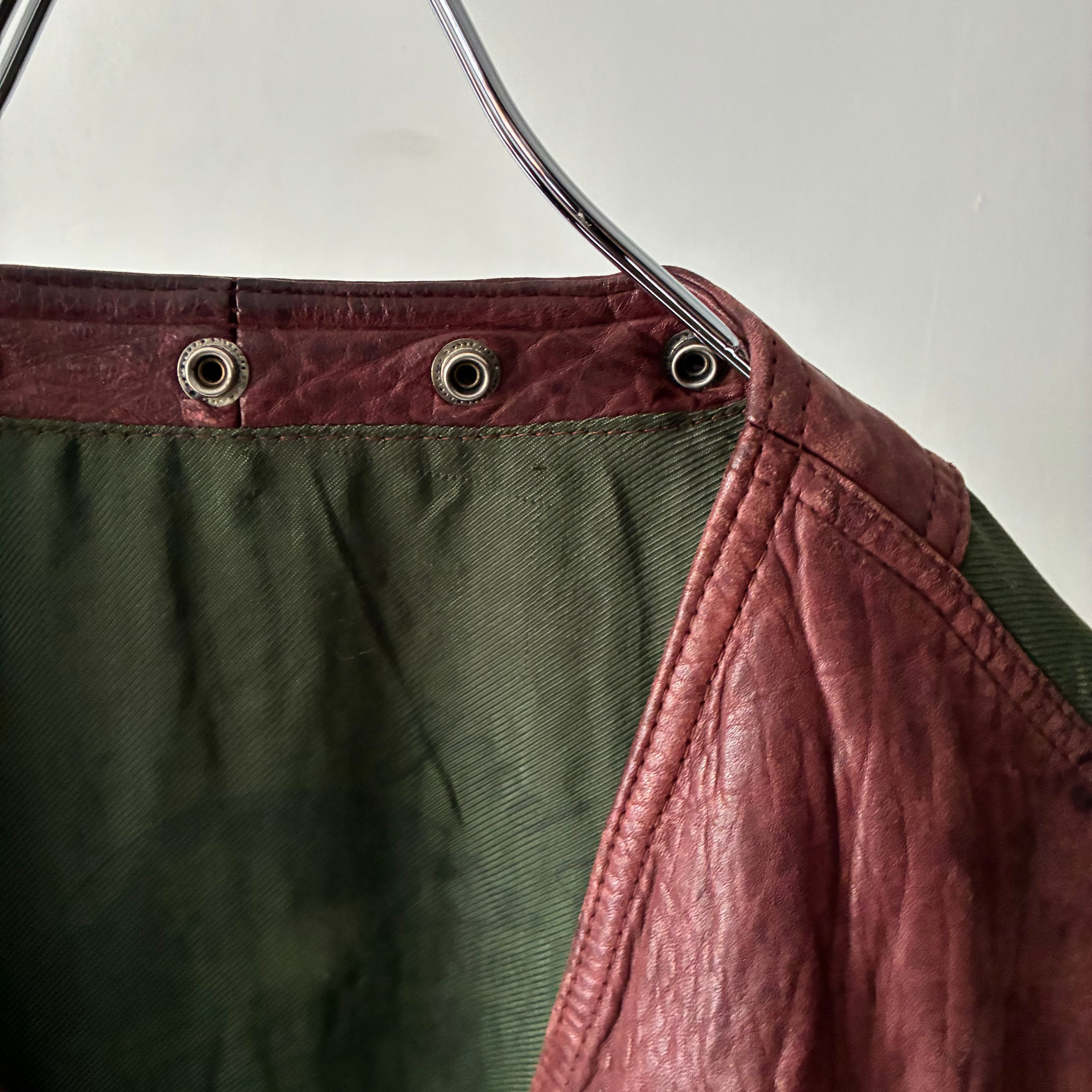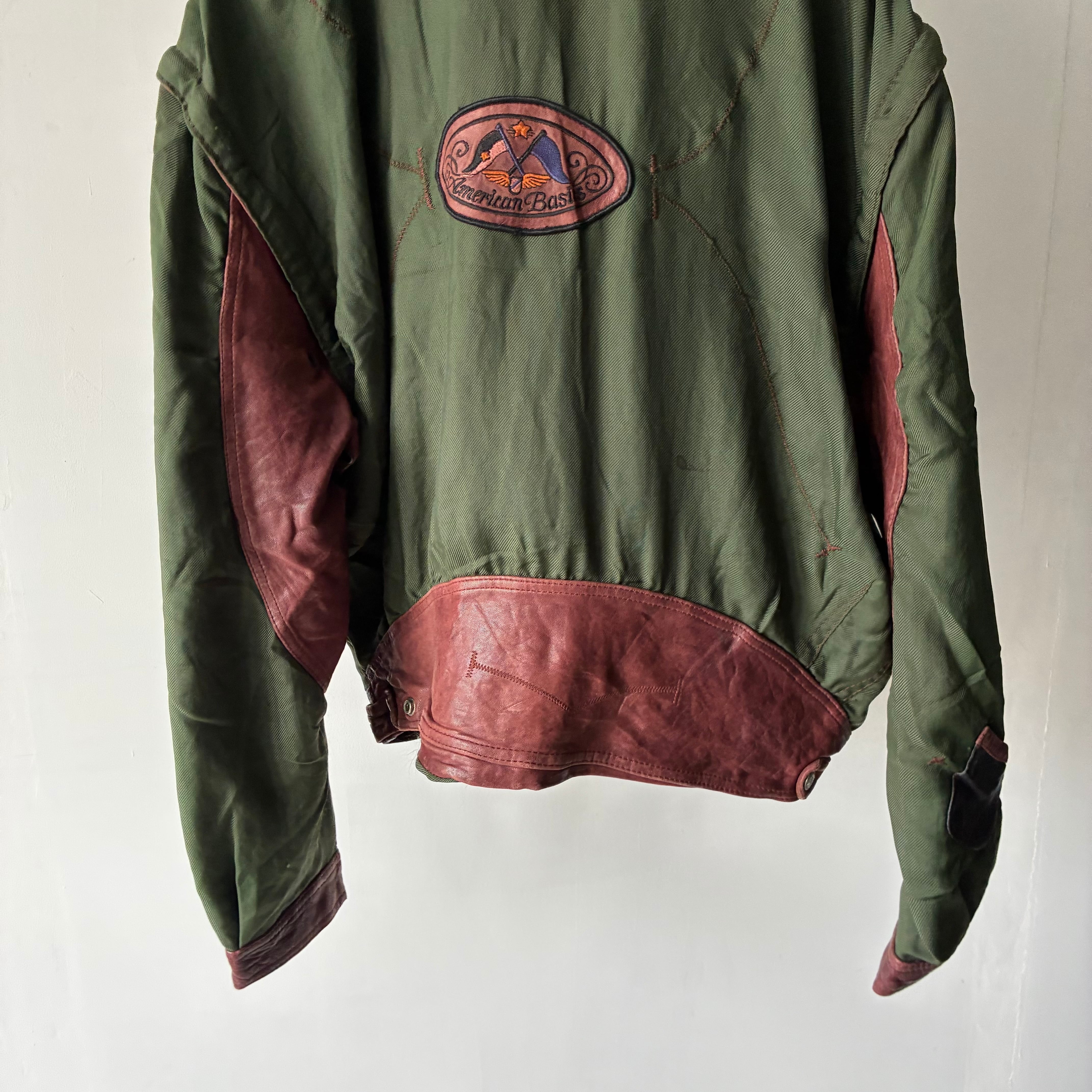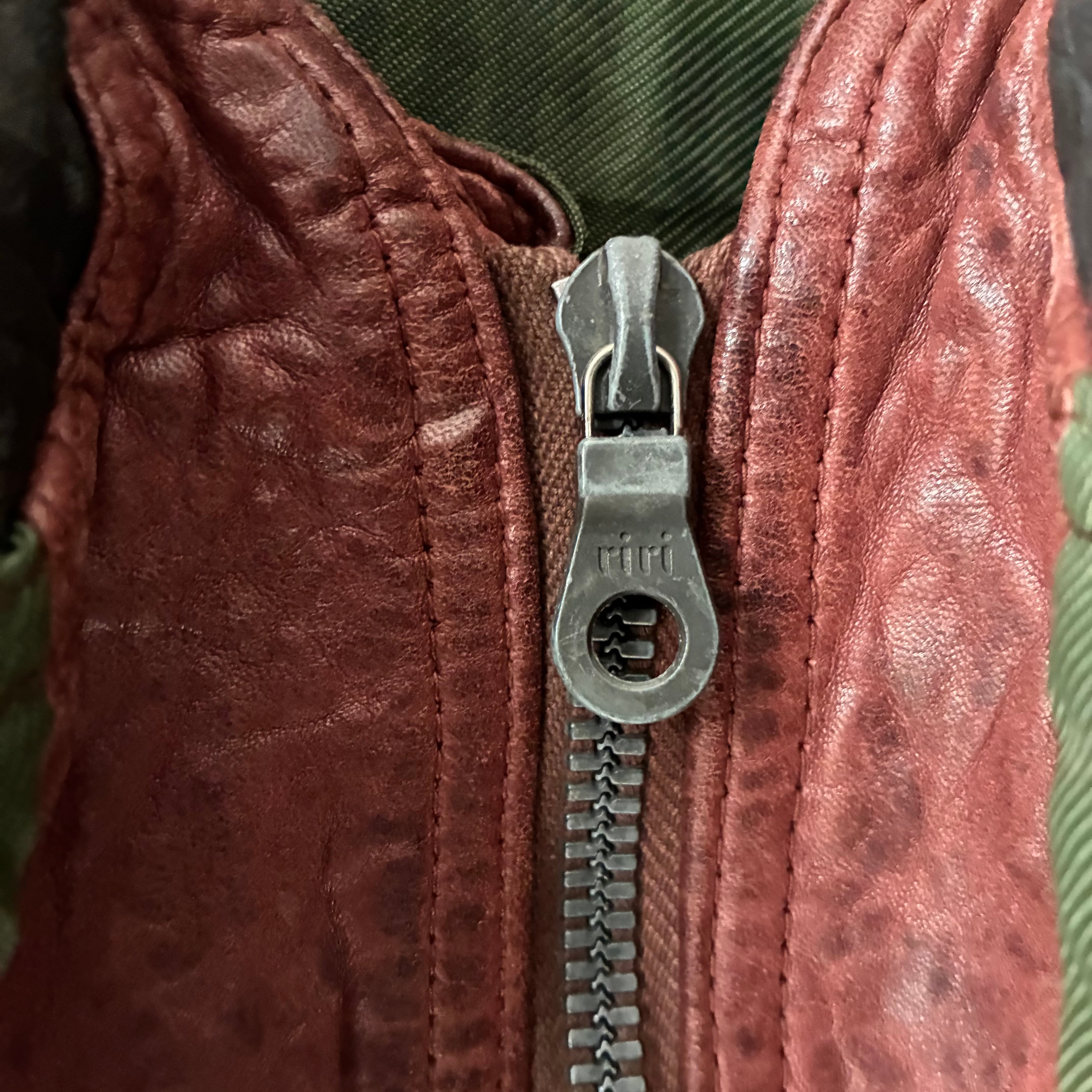 オリーブグリーンのナイロン生地にボルドーの本革パーツを大胆に切り替えた無骨さとアート性が同居するAmerican Basicsのデザインジャケット