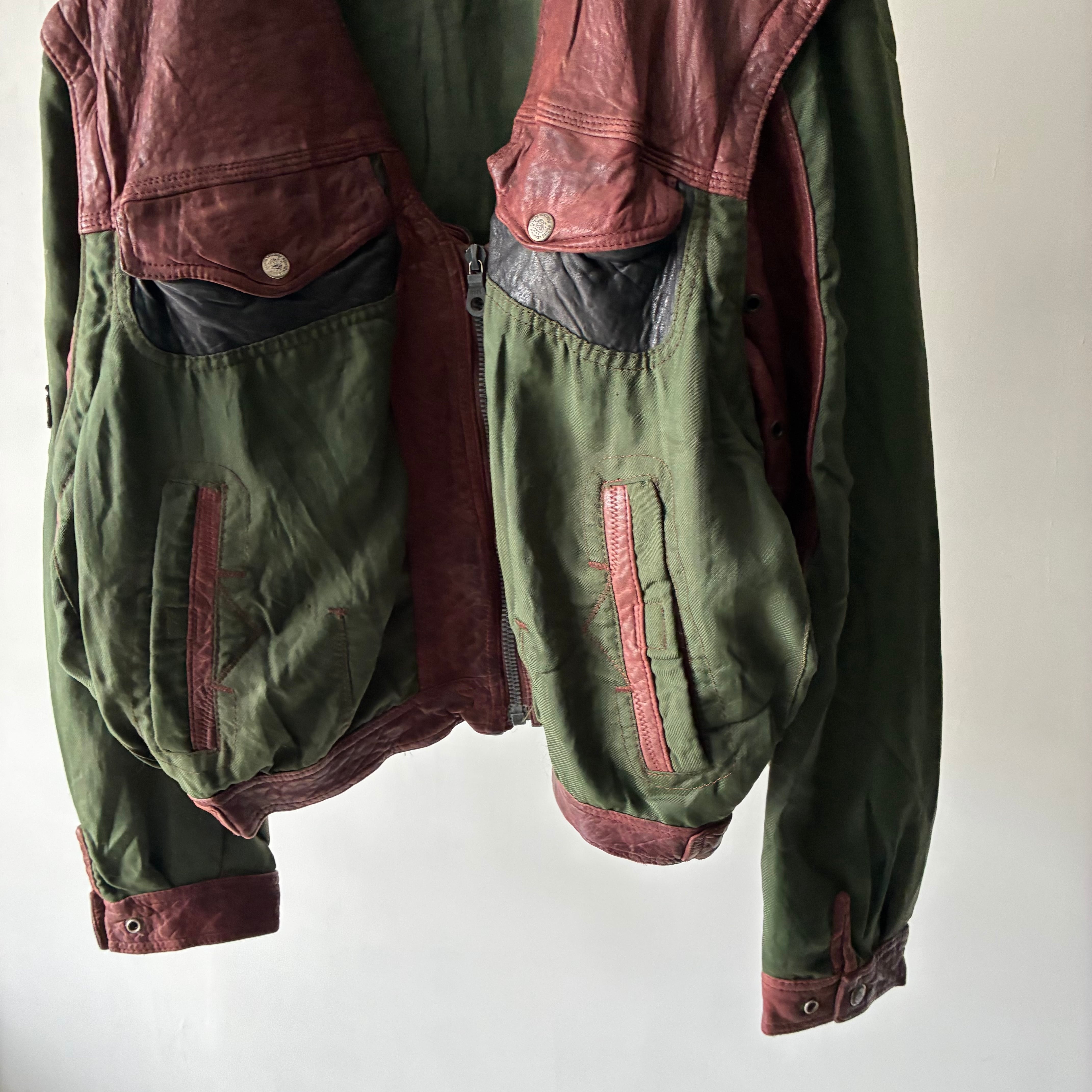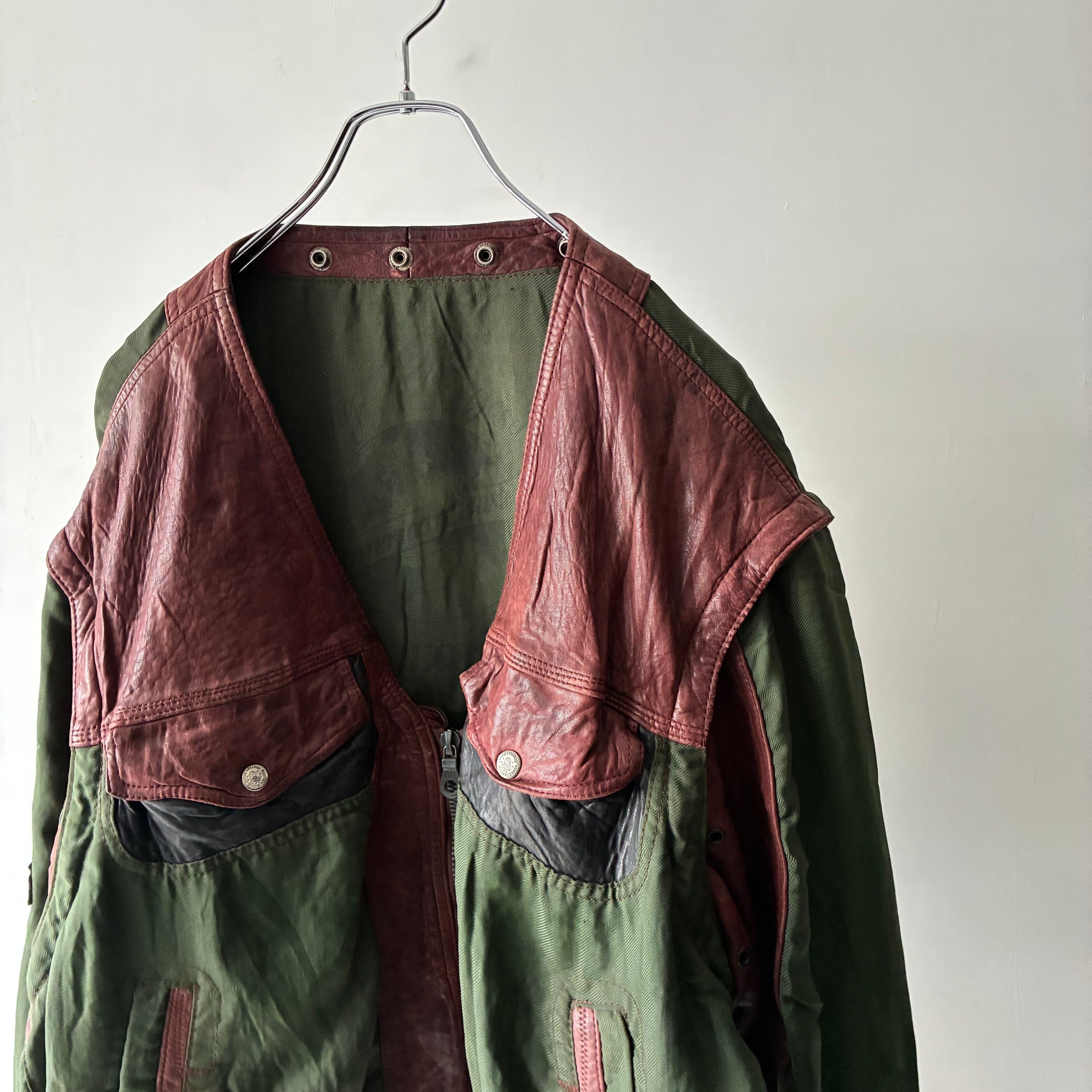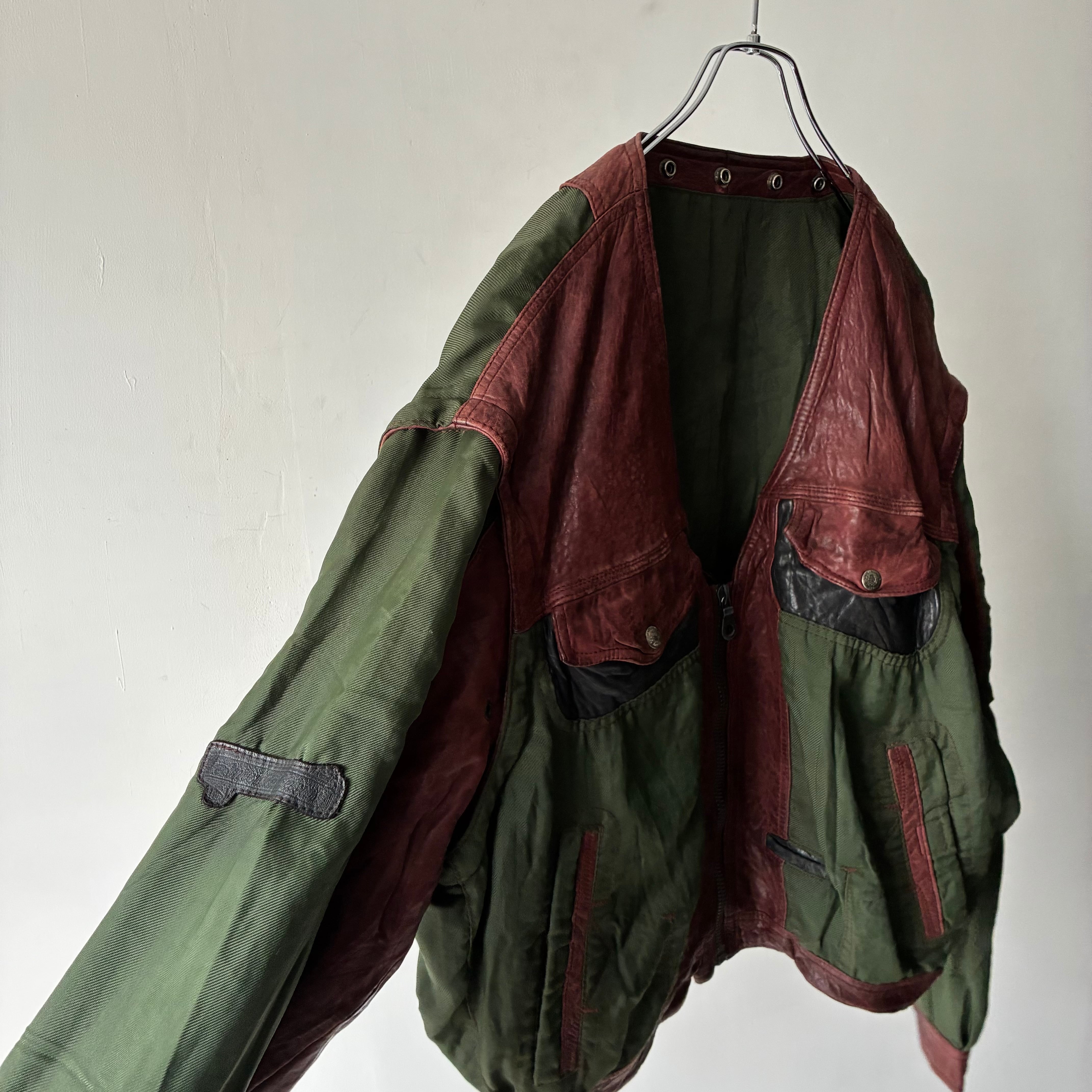 オリーブグリーンのナイロン生地にボルドーの本革パーツを大胆に切り替えた無骨さとアート性が同居するAmerican Basicsのデザインジャケット