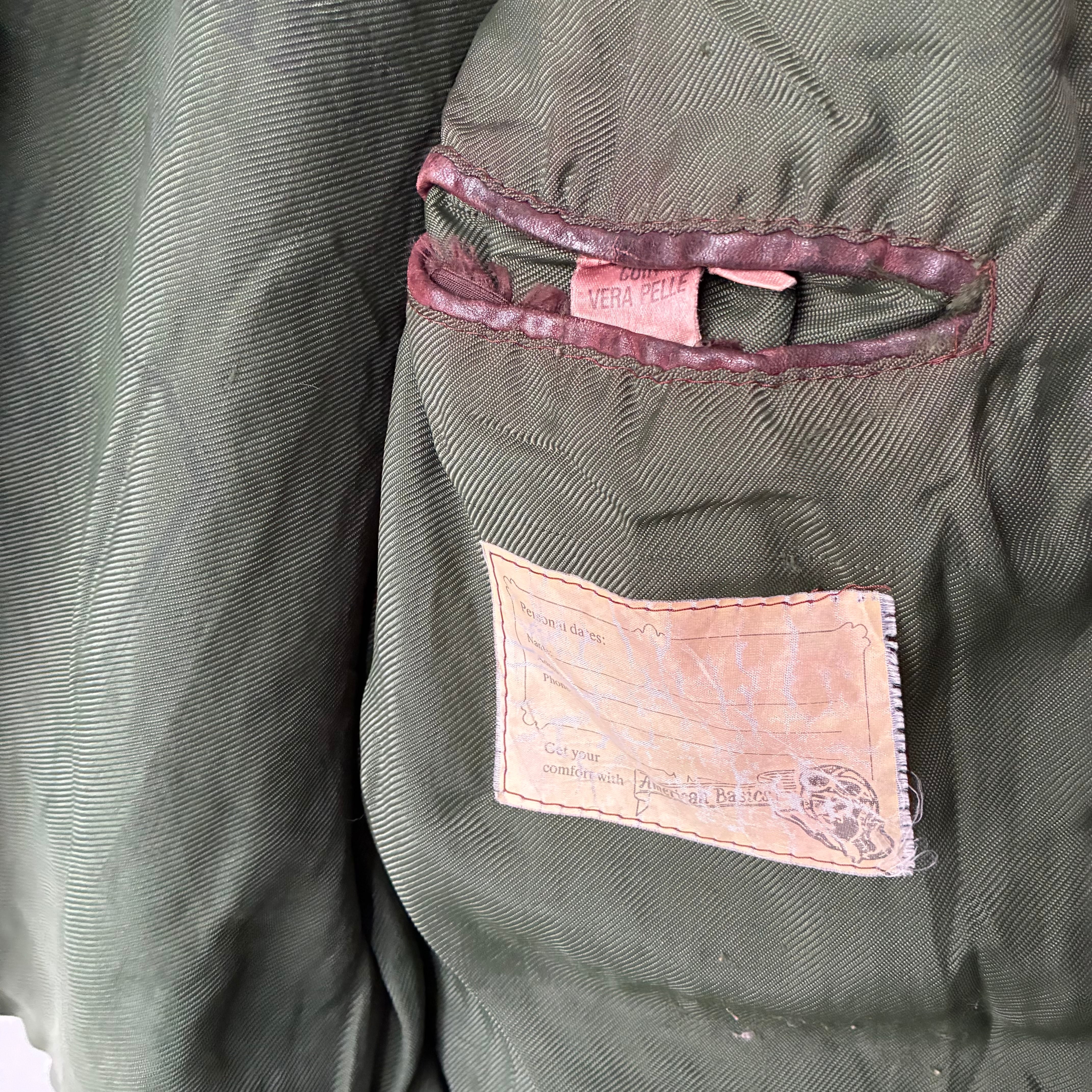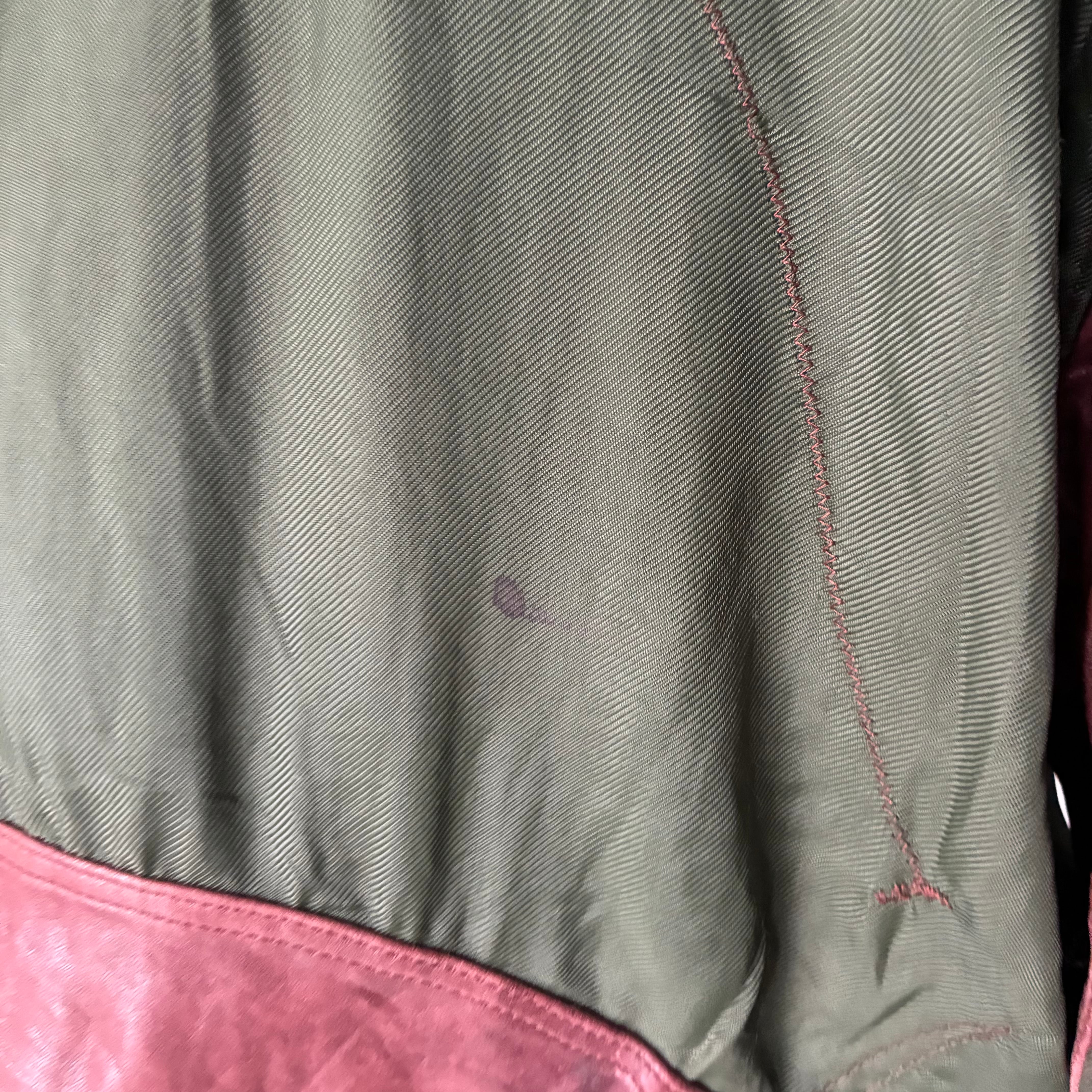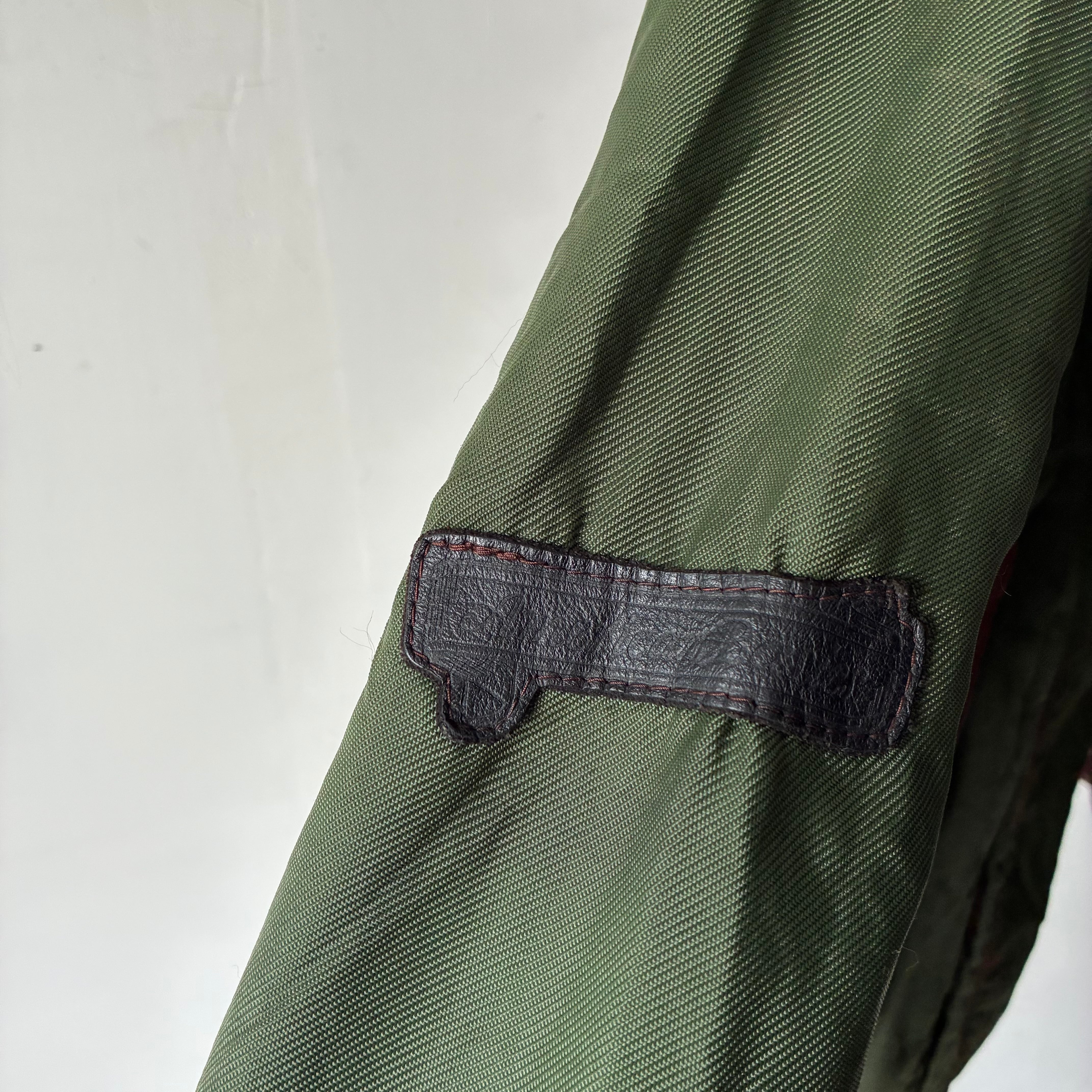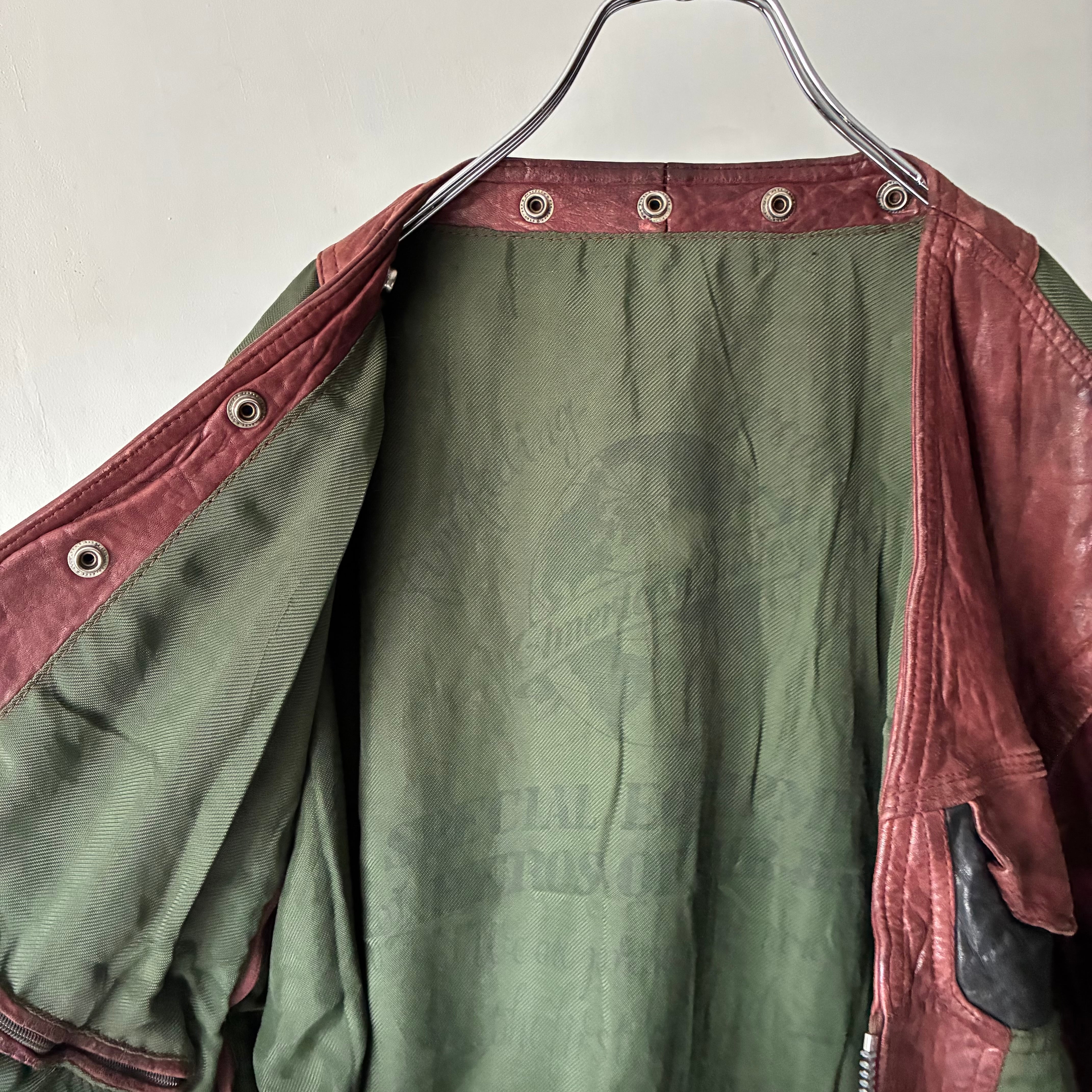 オリーブグリーンのナイロン生地にボルドーの本革パーツを大胆に切り替えた無骨さとアート性が同居するAmerican Basicsのデザインジャケット