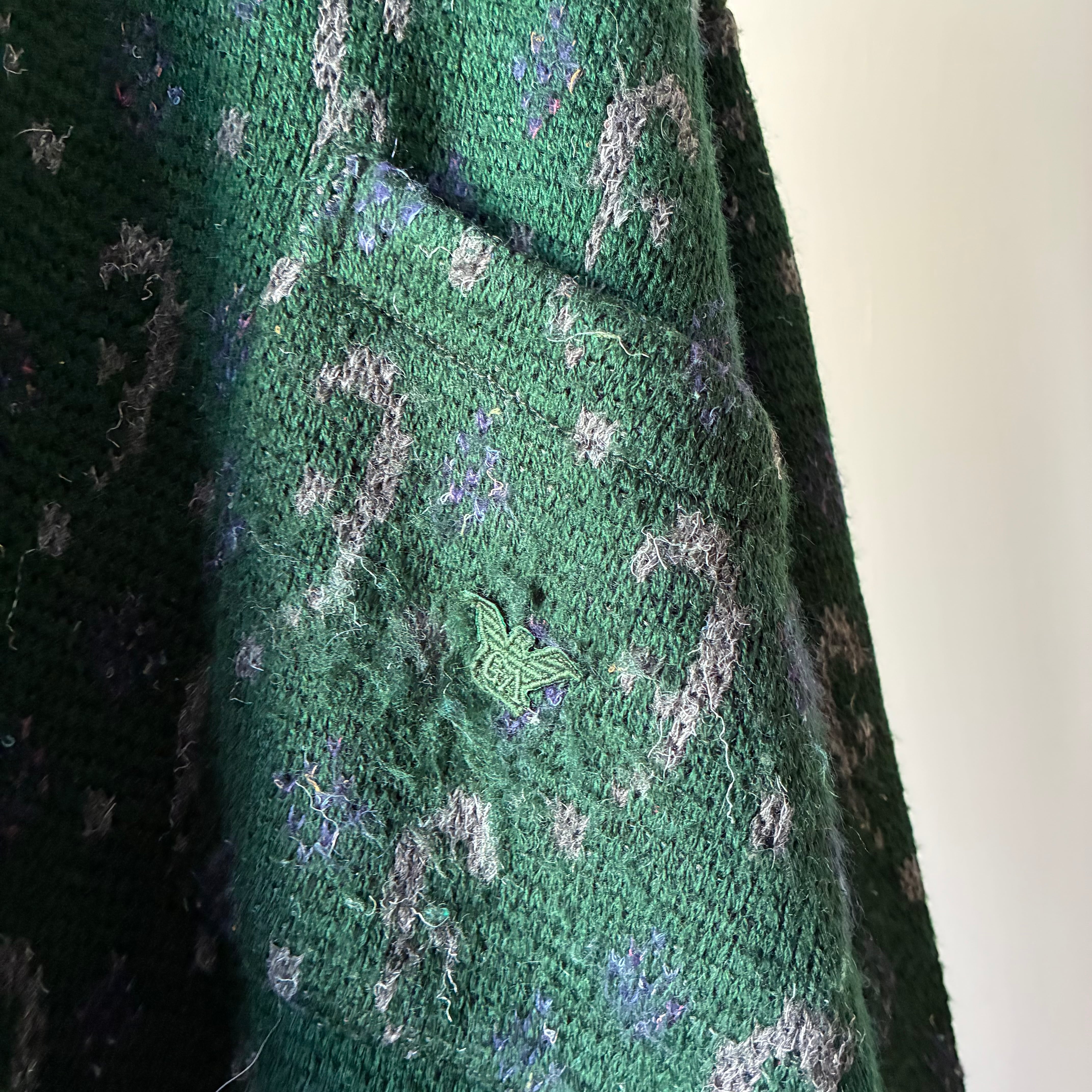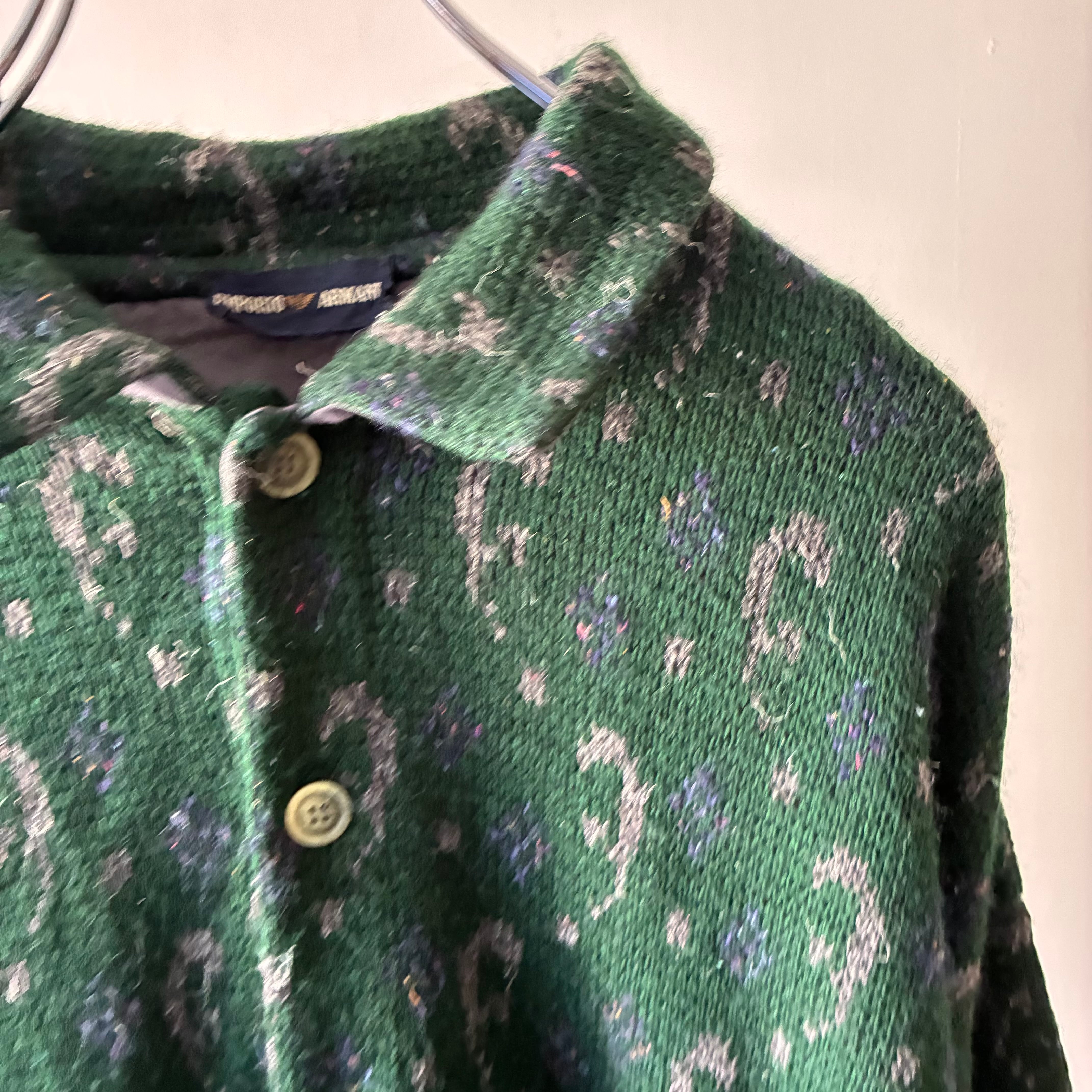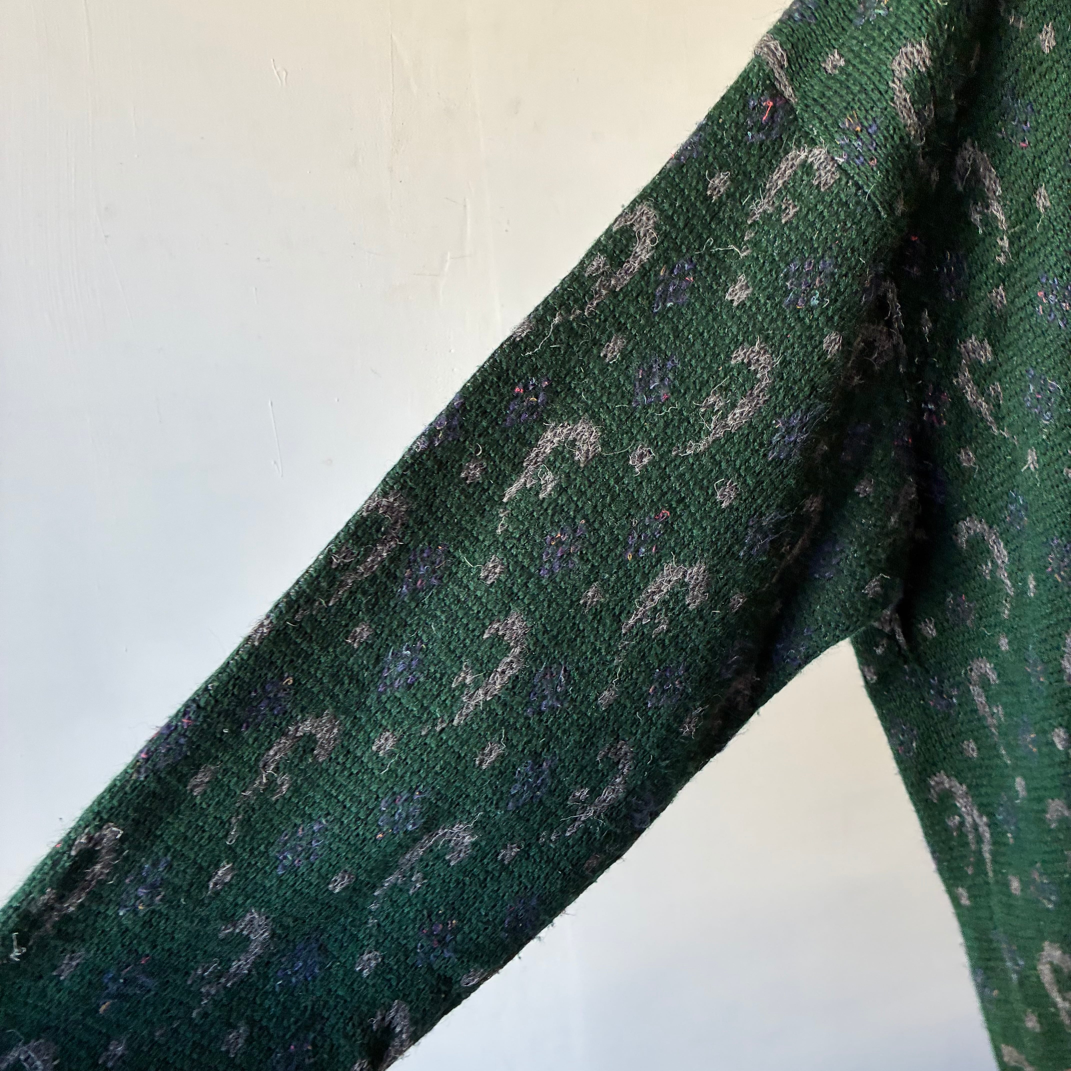 深みのあるフォレストグリーンを基調に、グレーやパープルの糸を織り交ぜた総柄パターンが特徴で上質な存在感を放つ一着