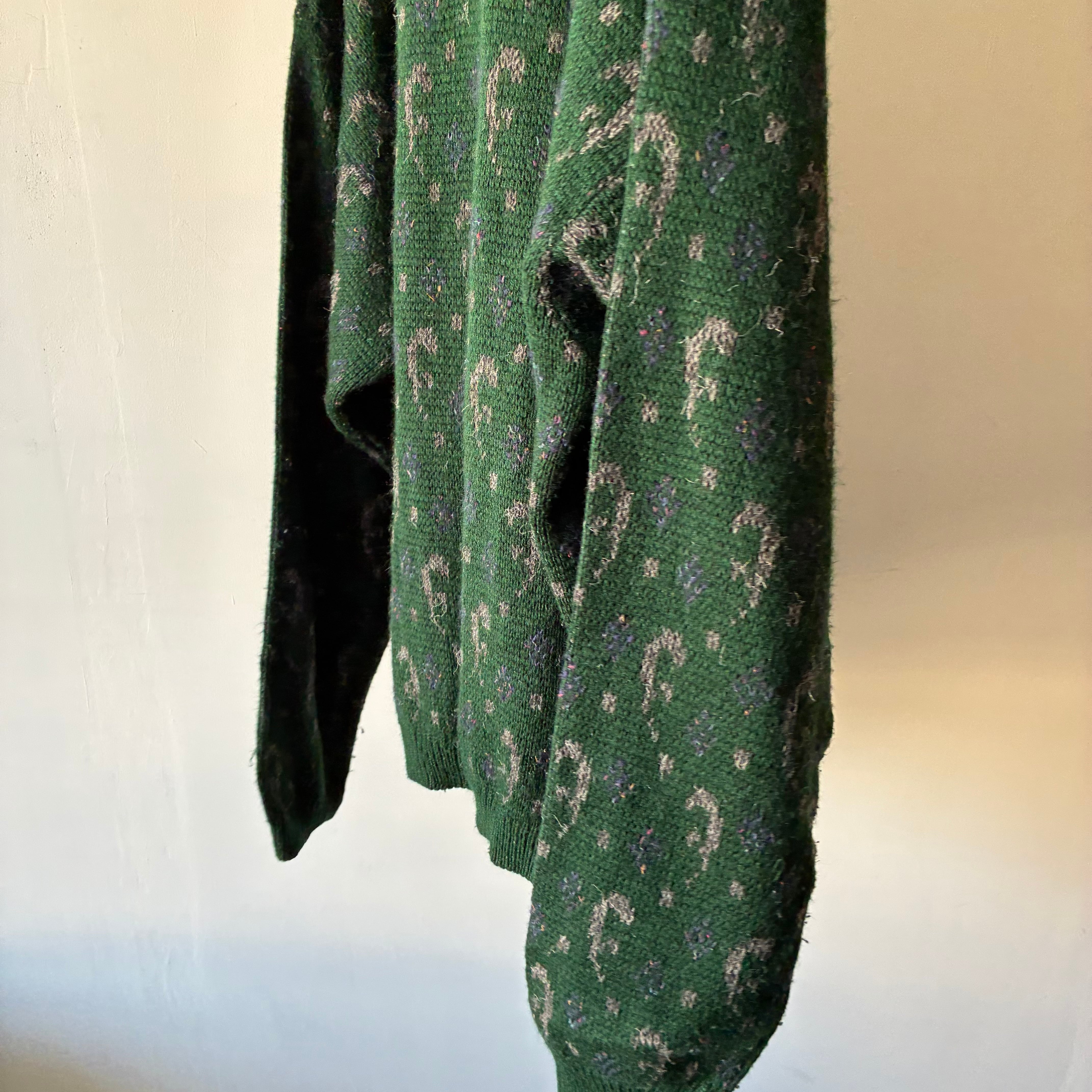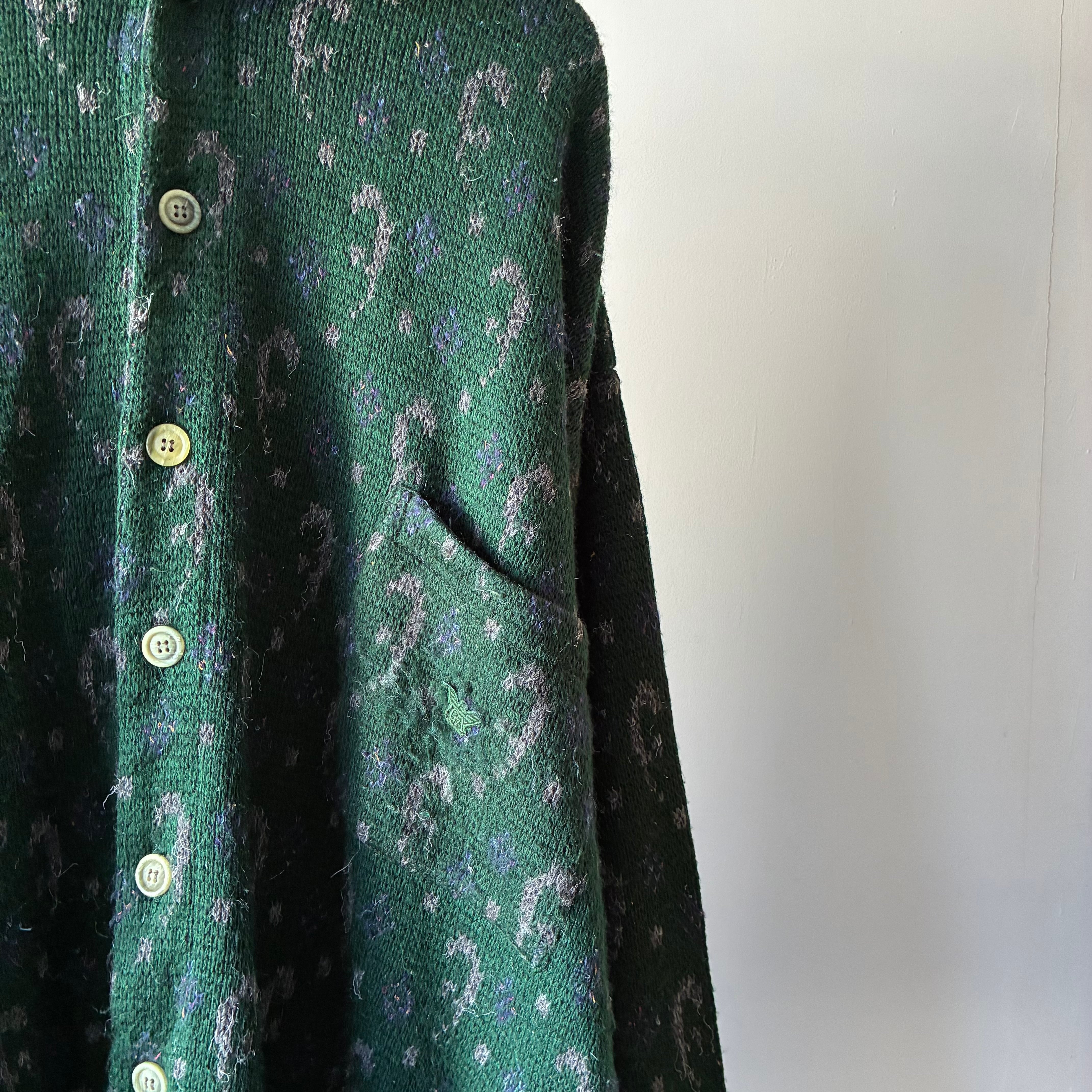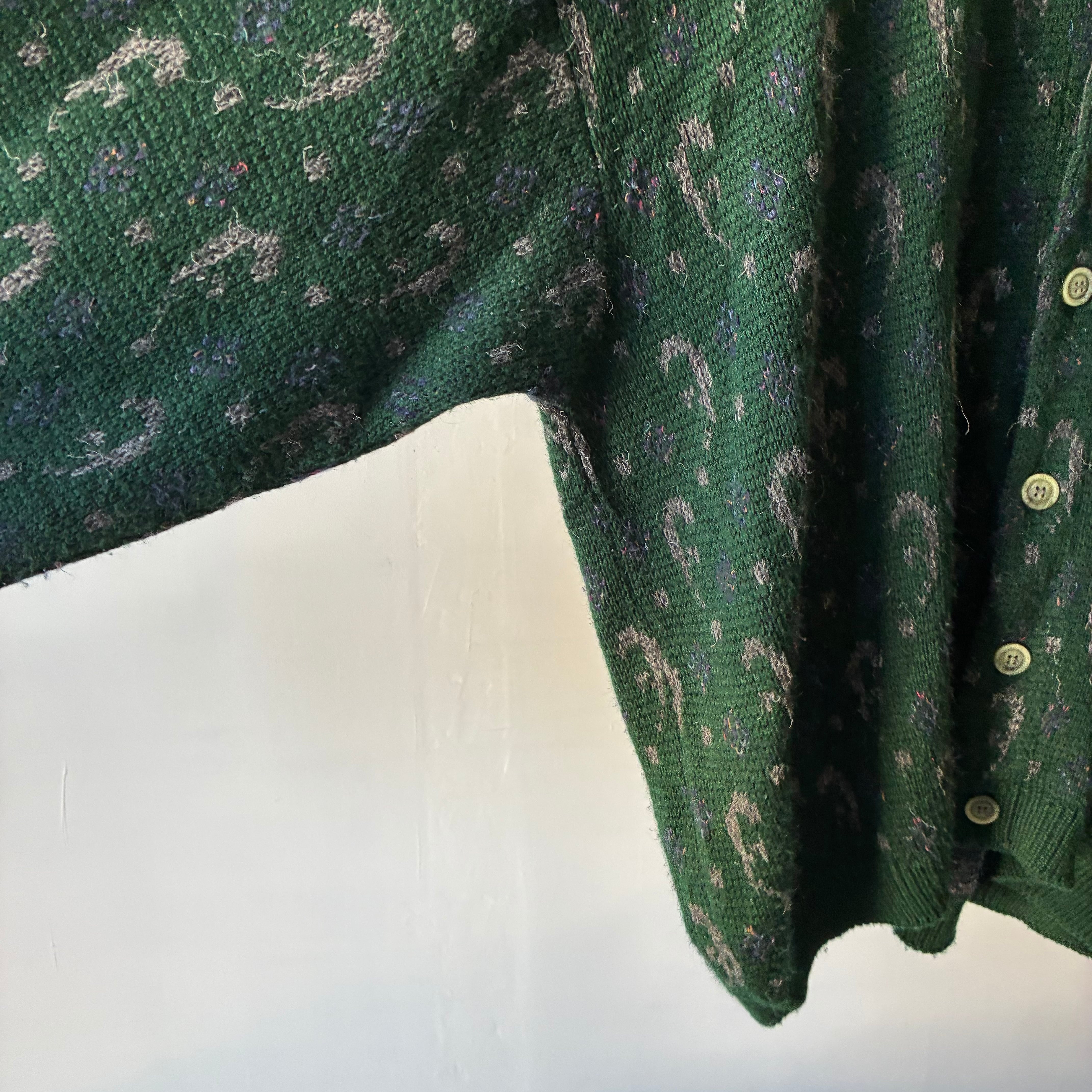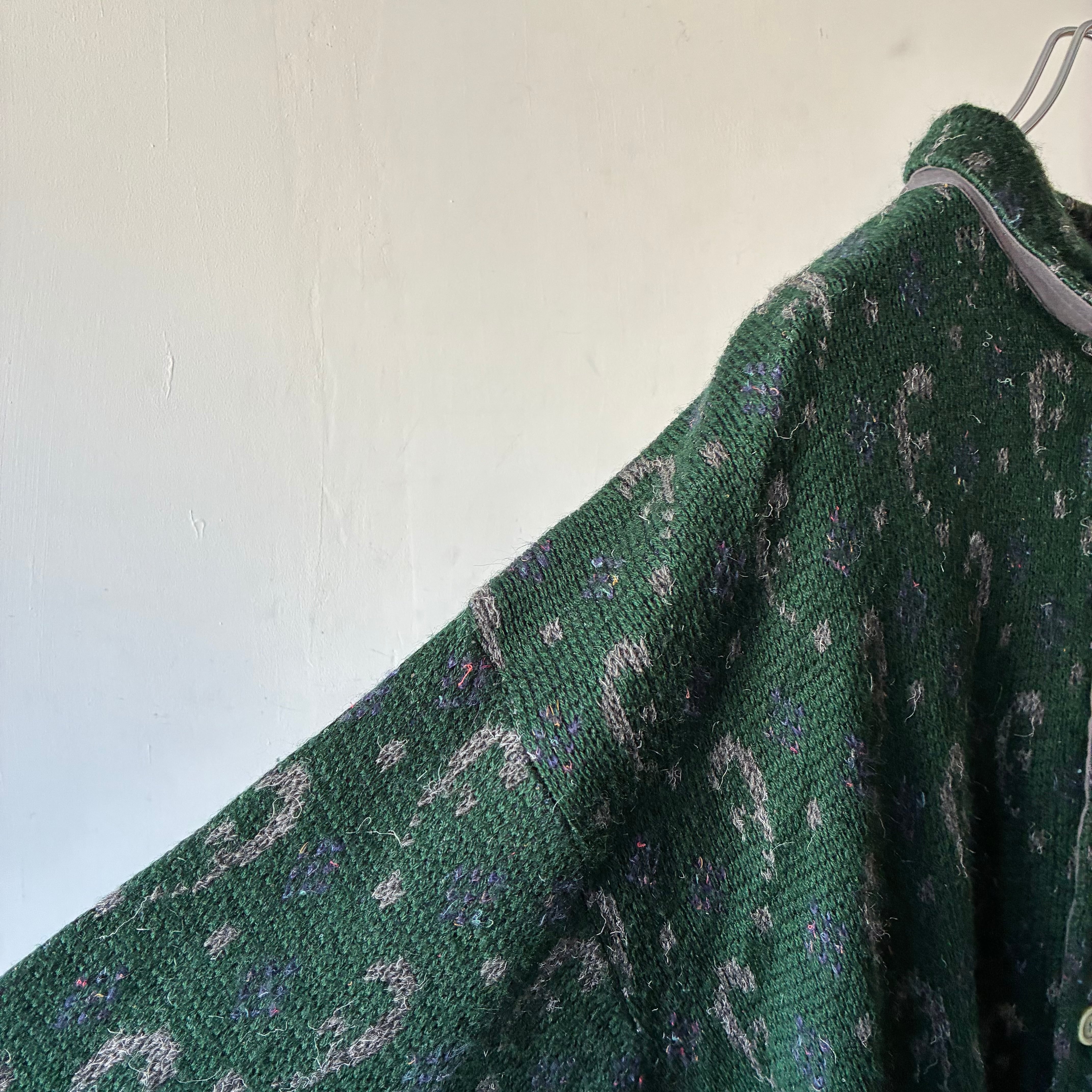 深みのあるフォレストグリーンを基調に、グレーやパープルの糸を織り交ぜた総柄パターンが特徴で上質な存在感を放つ一着