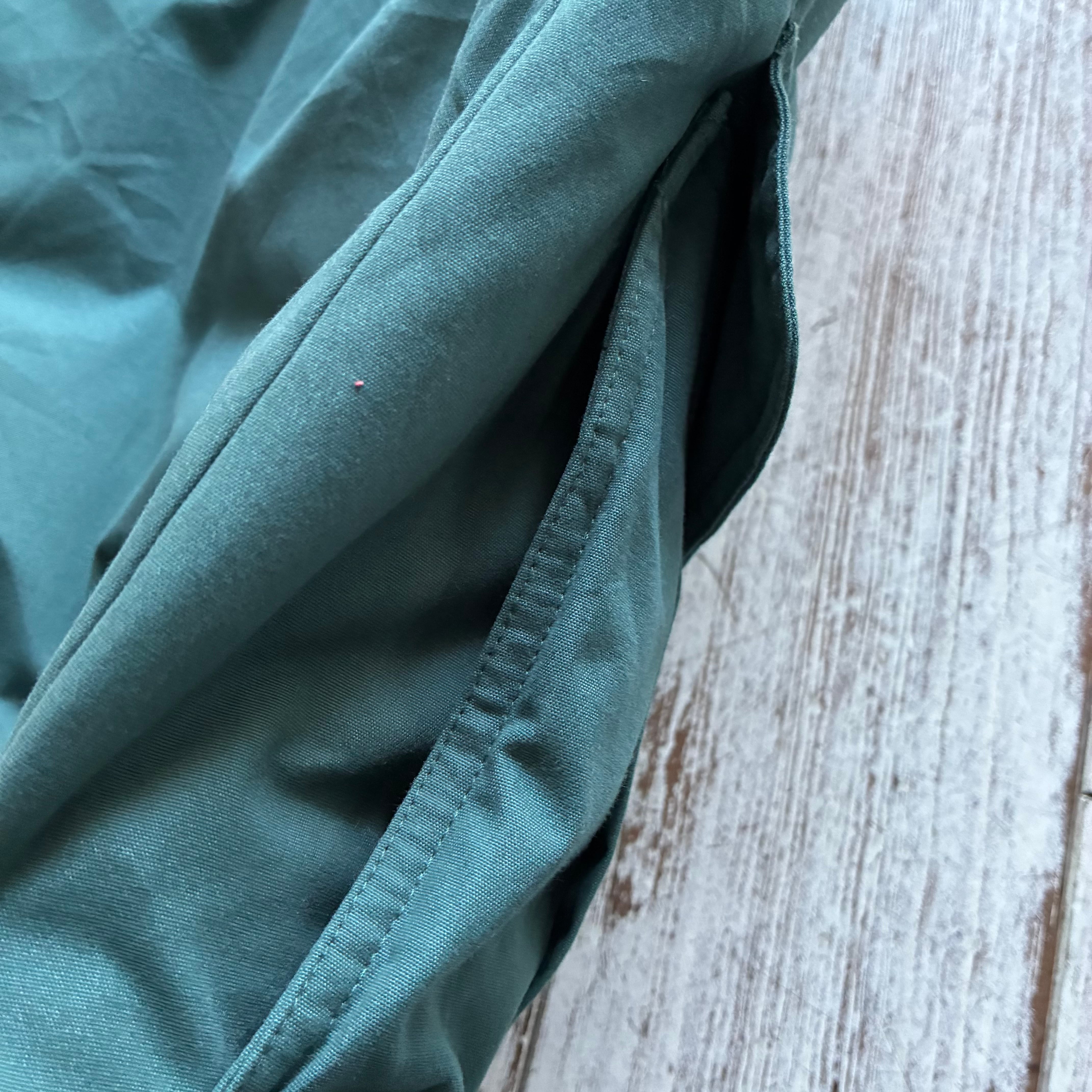 深みのあるグリーンボディに、フロントの大ぶりなフラップポケットが映える無骨なデザイン。程よく光沢のあるシェル生地は65%ポリエステル×35%コットンのタフな混紡素材で、デイリーユースでも気兼ねなく着られる一着