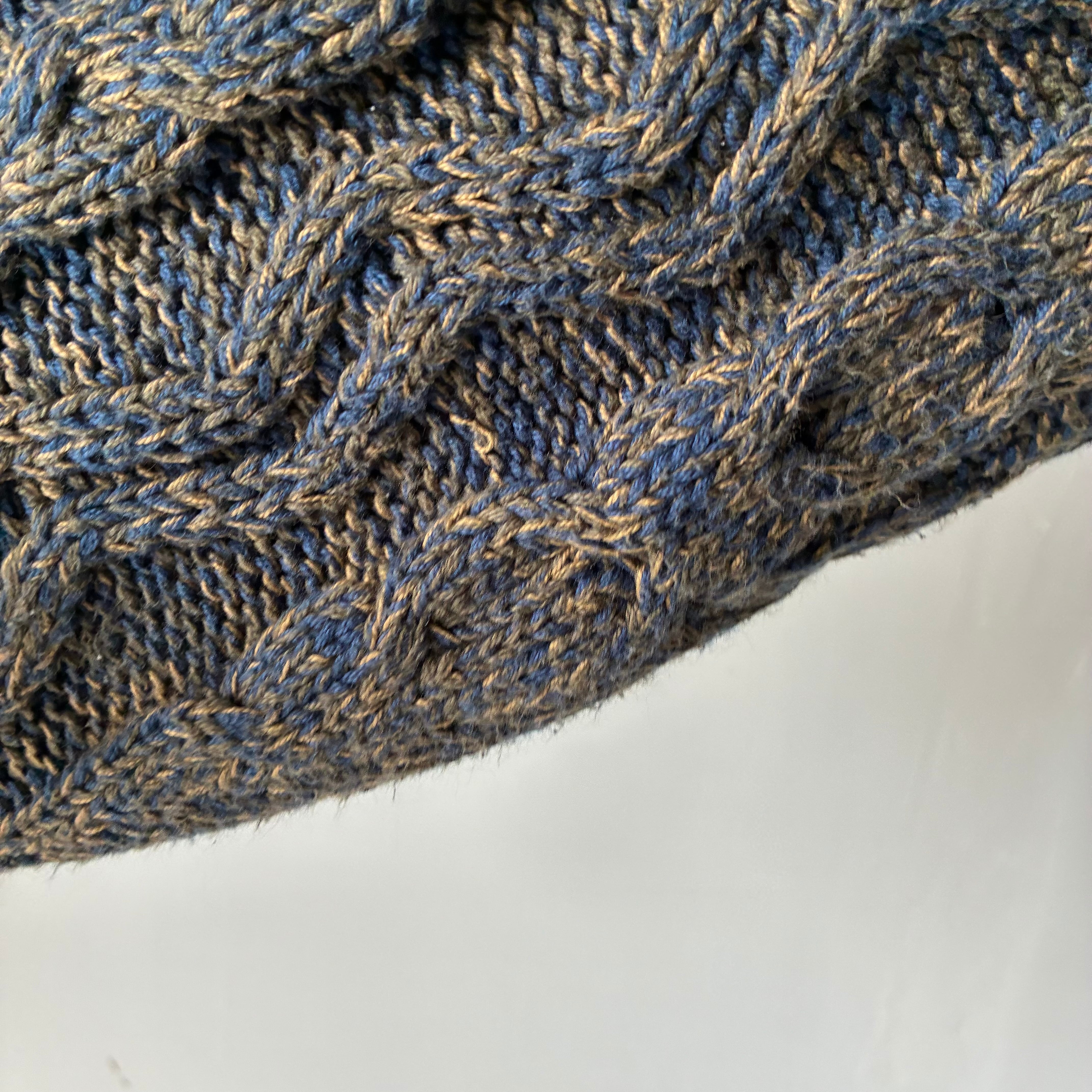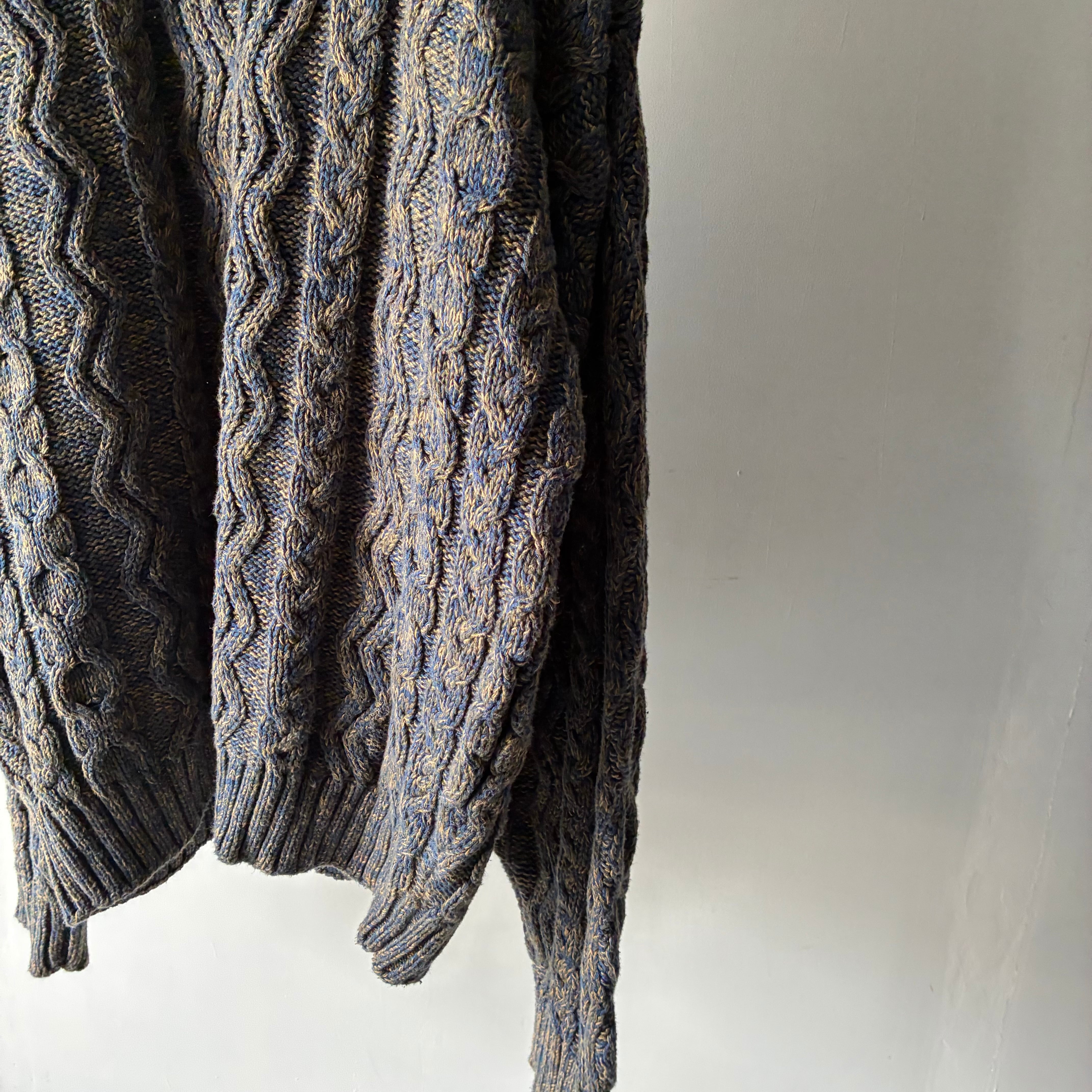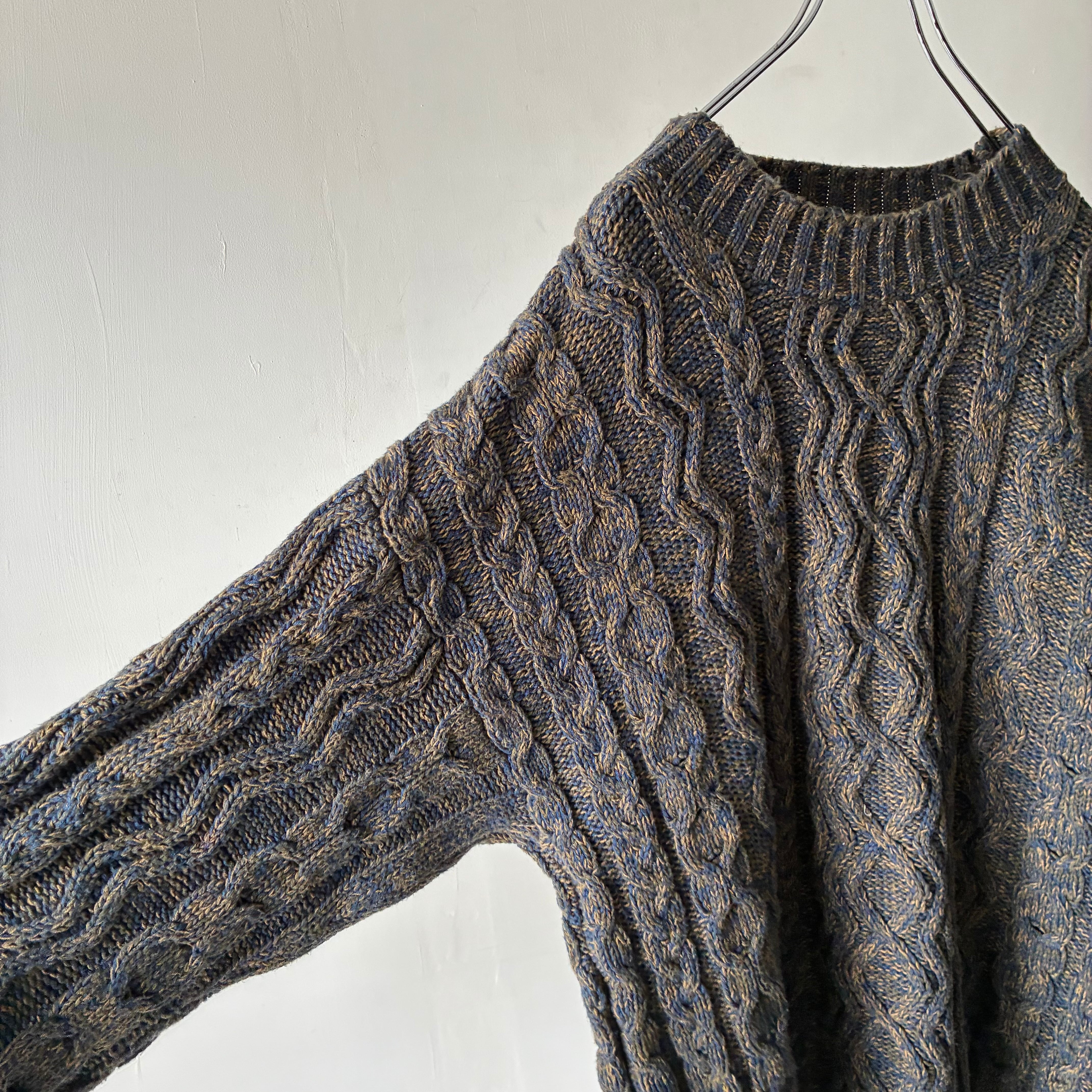 ざっくりとしたローゲージ編みと、複雑に連なるケーブル編みが存在感抜群の一着