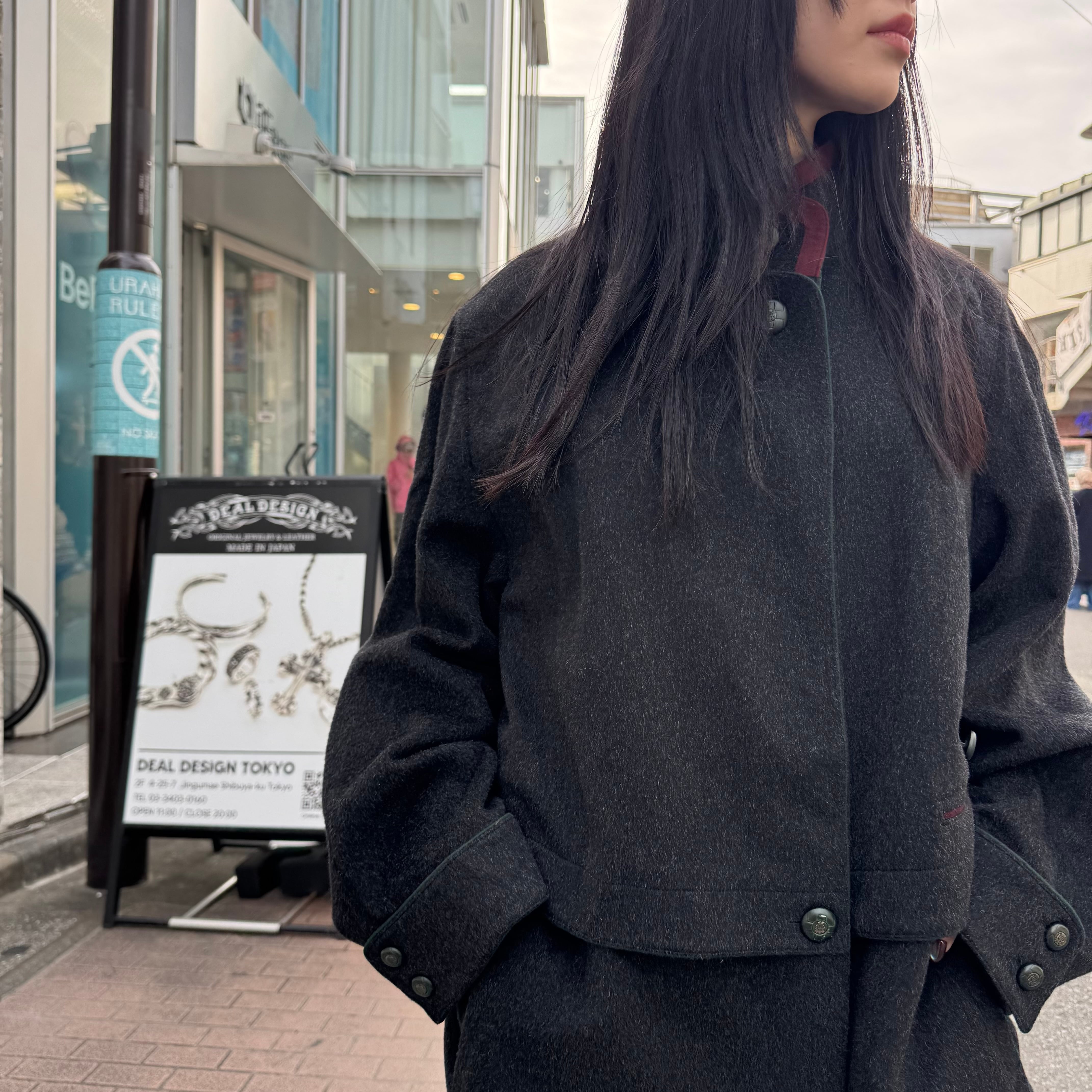 深みのあるチャコールグレーを基調に、襟裏・前立て・袖カフスに配されたグリーン×ワインレッドの切り替えパイピングが伝統的なアルプス地方のローデンスタイルを象徴する一着