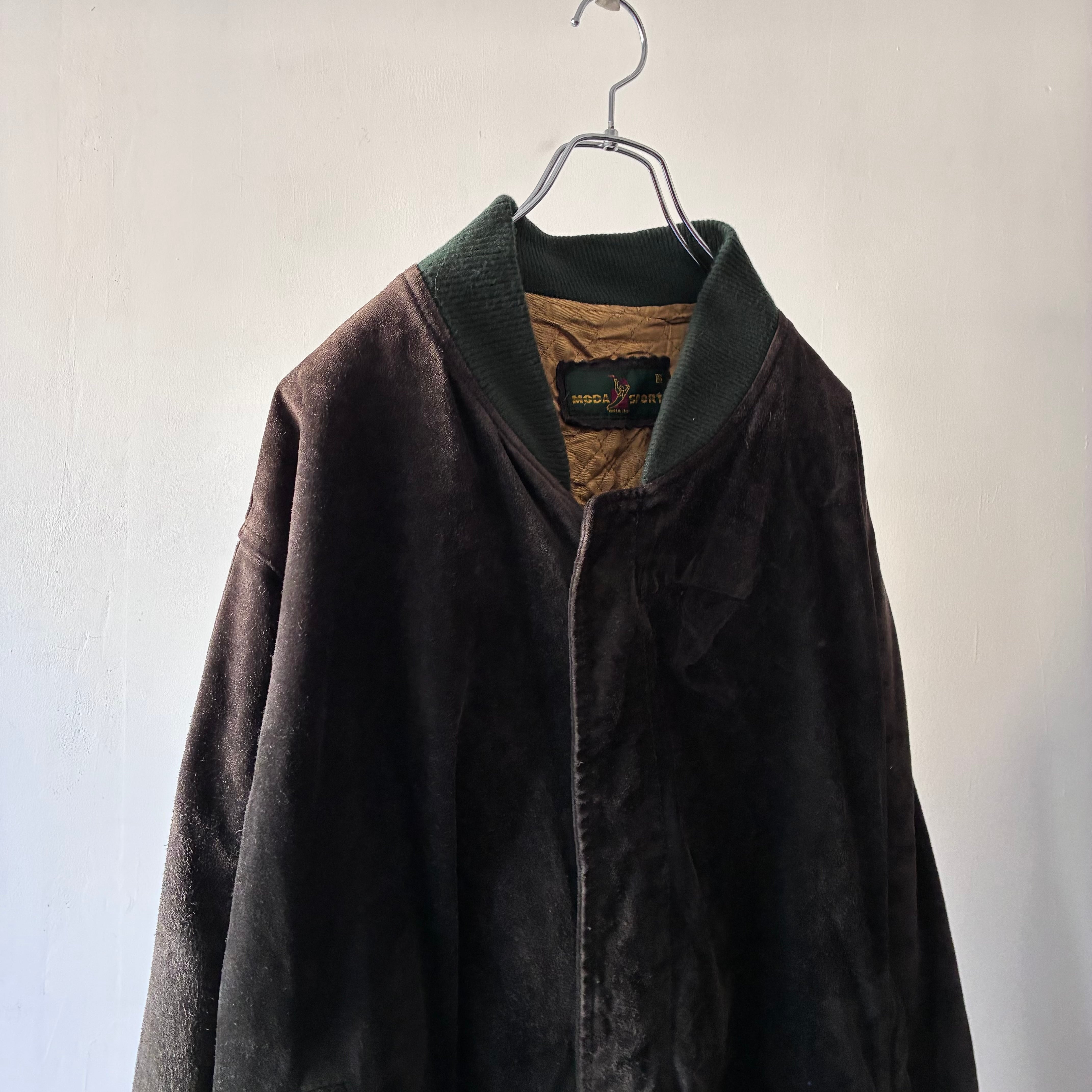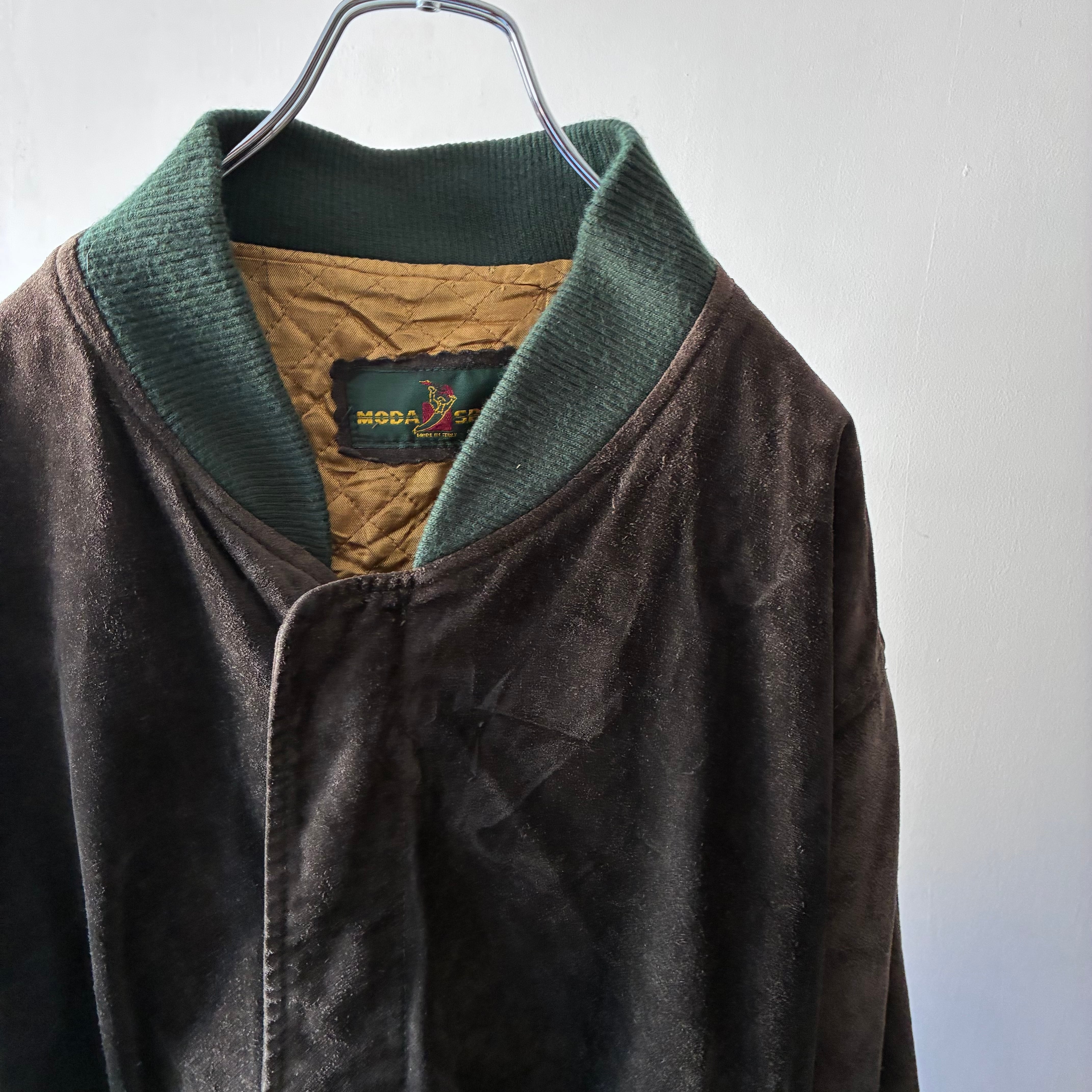 落ち着いたカラーのスエードに襟・袖口・裾には深みのあるグリーンリブを採用