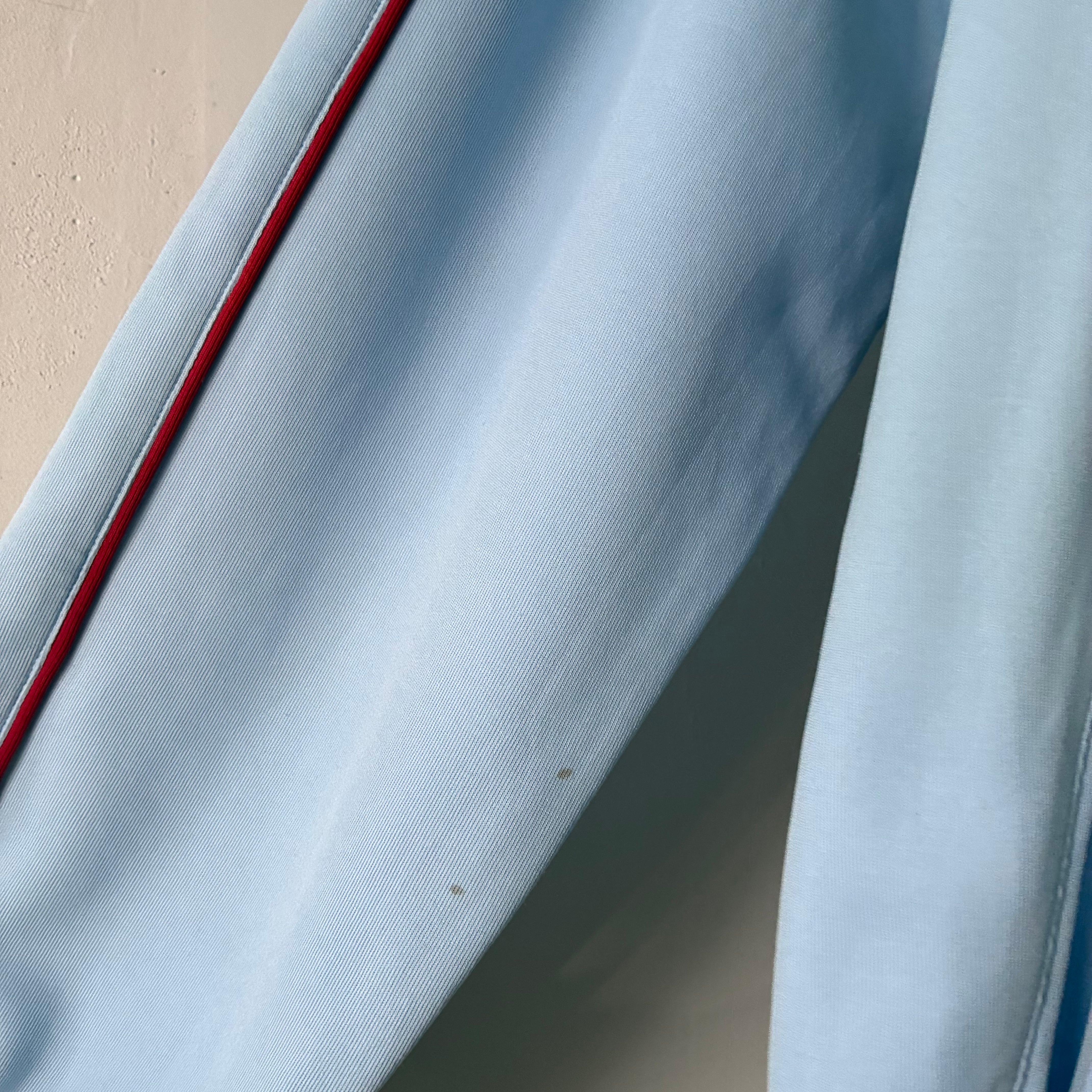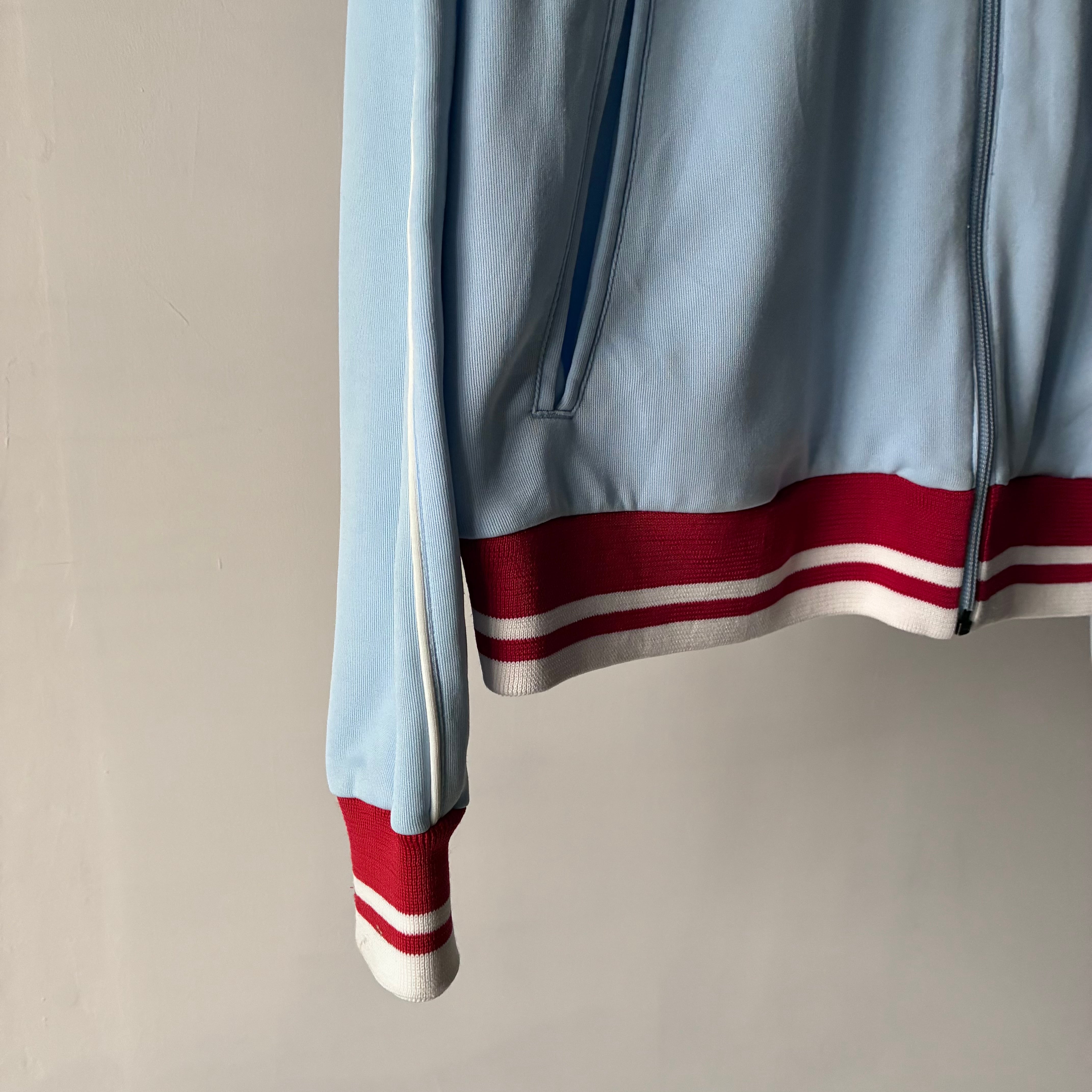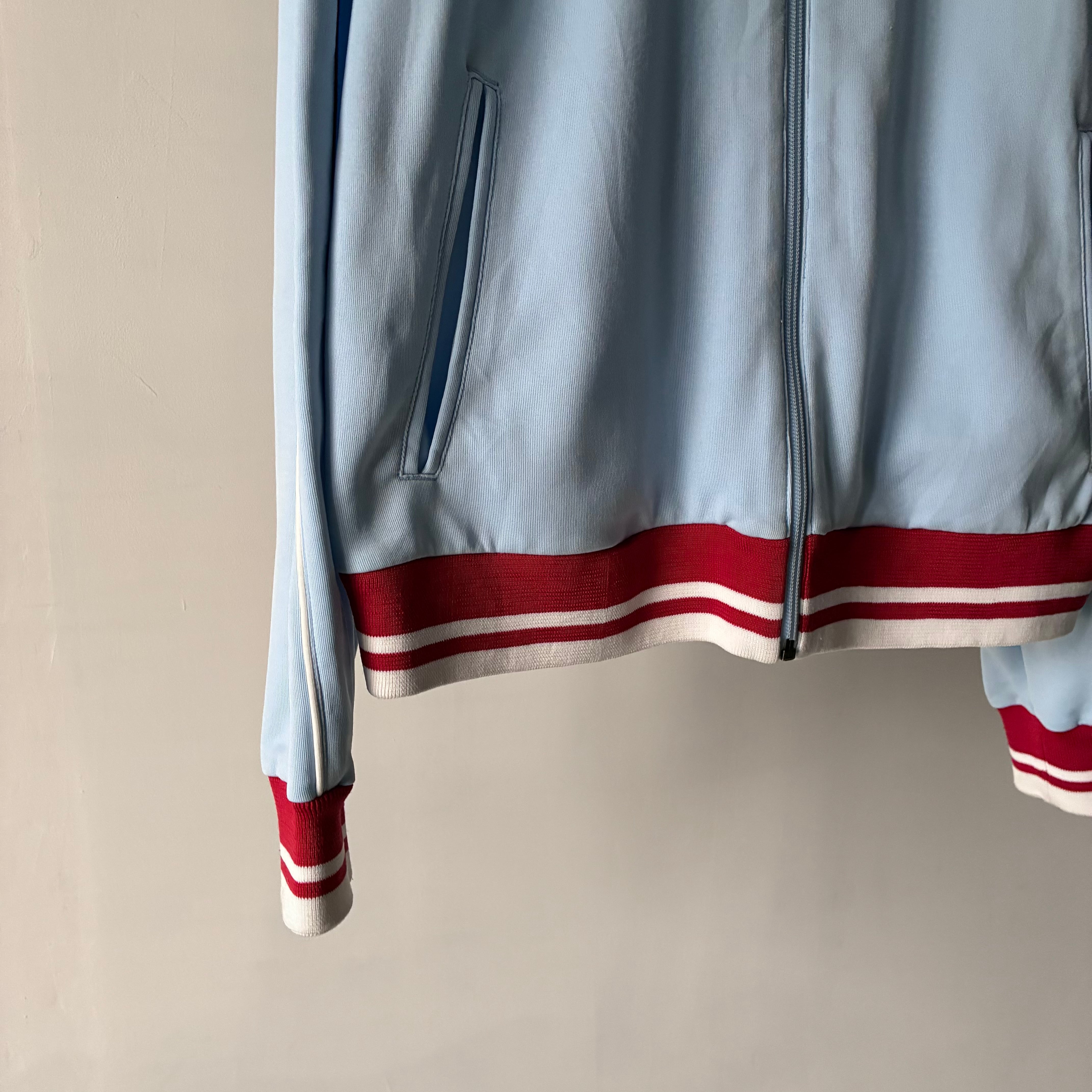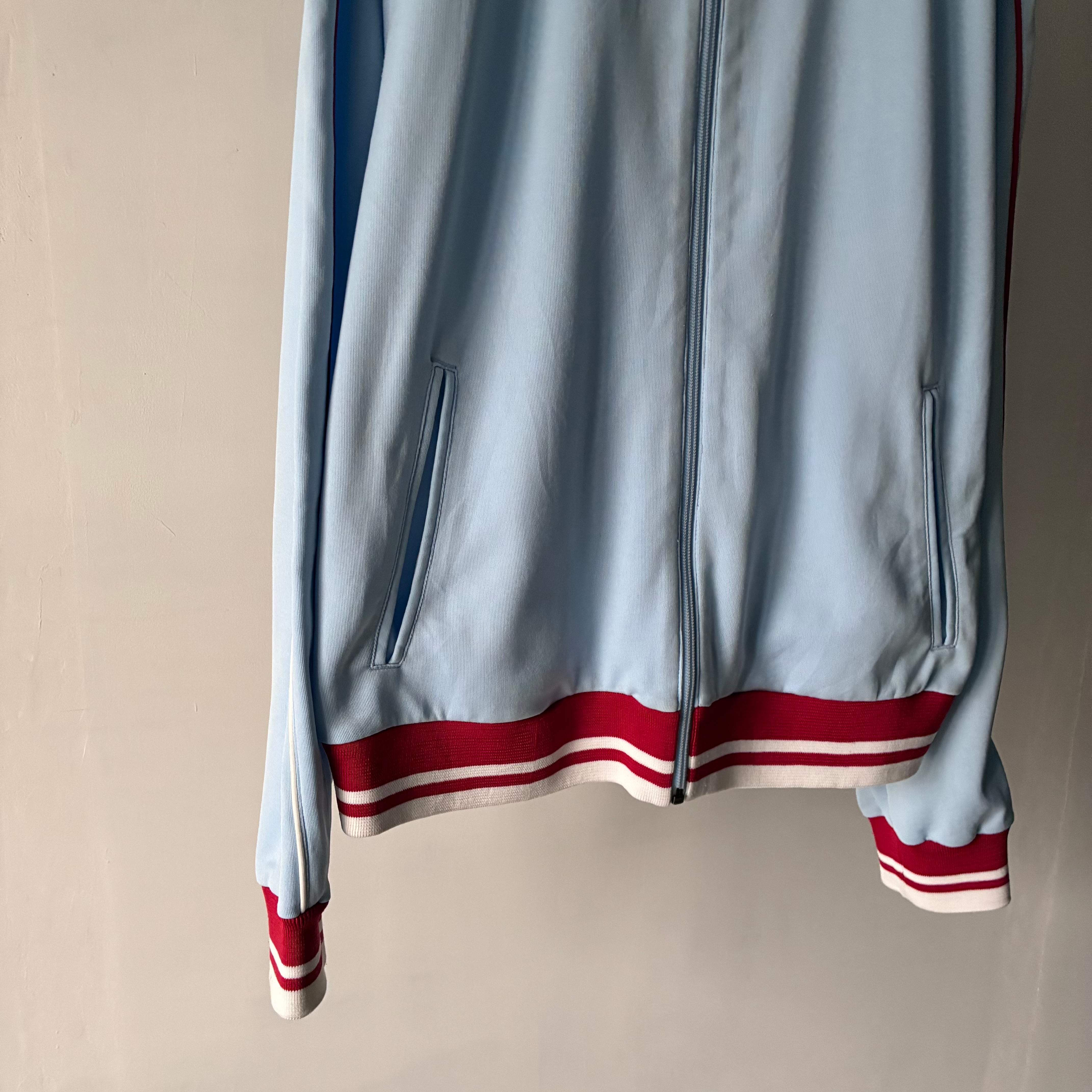 淡いライトブルーをベースに、ボルドー×ホワイトのリブ切り替えが映える好配色デザインのトラックジャケット