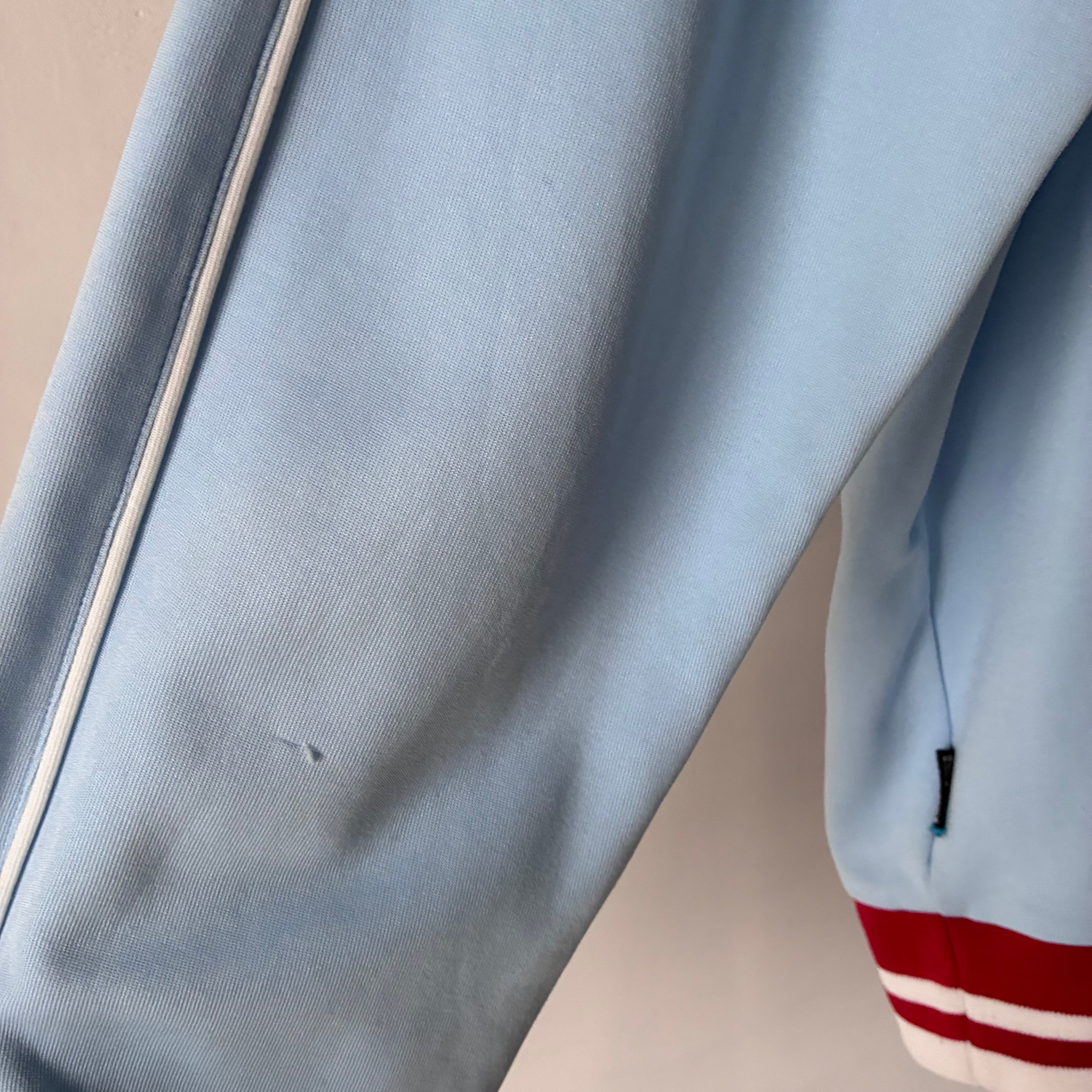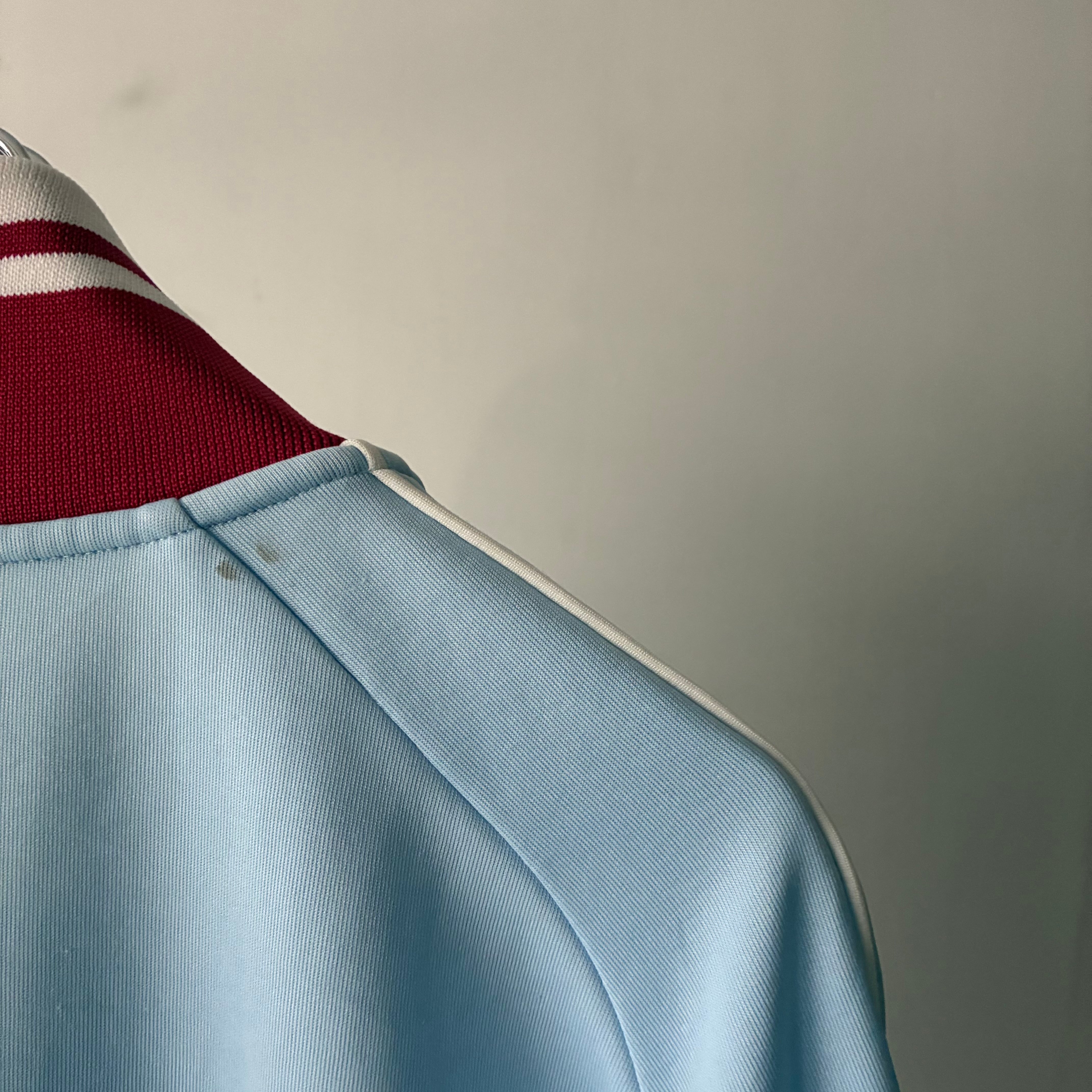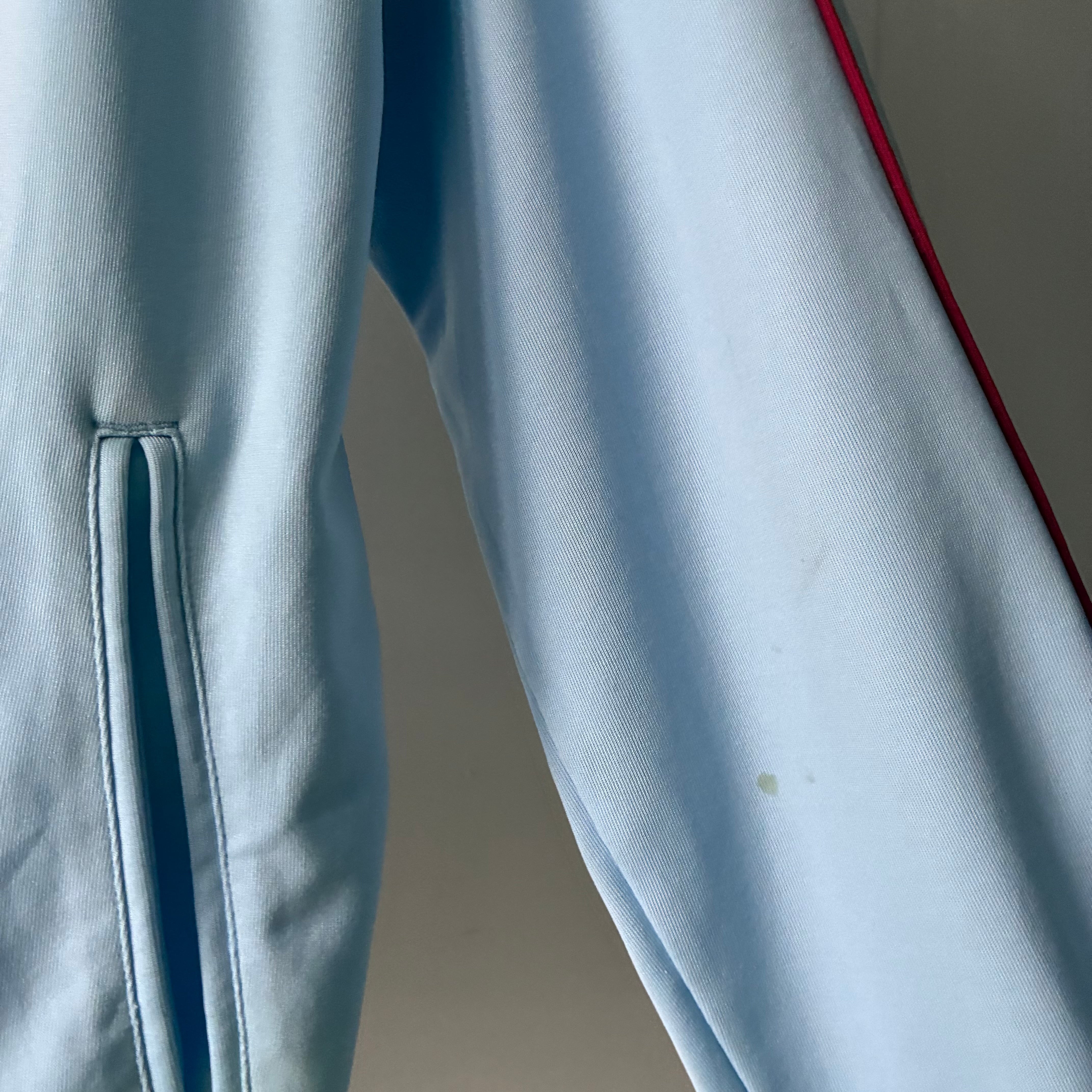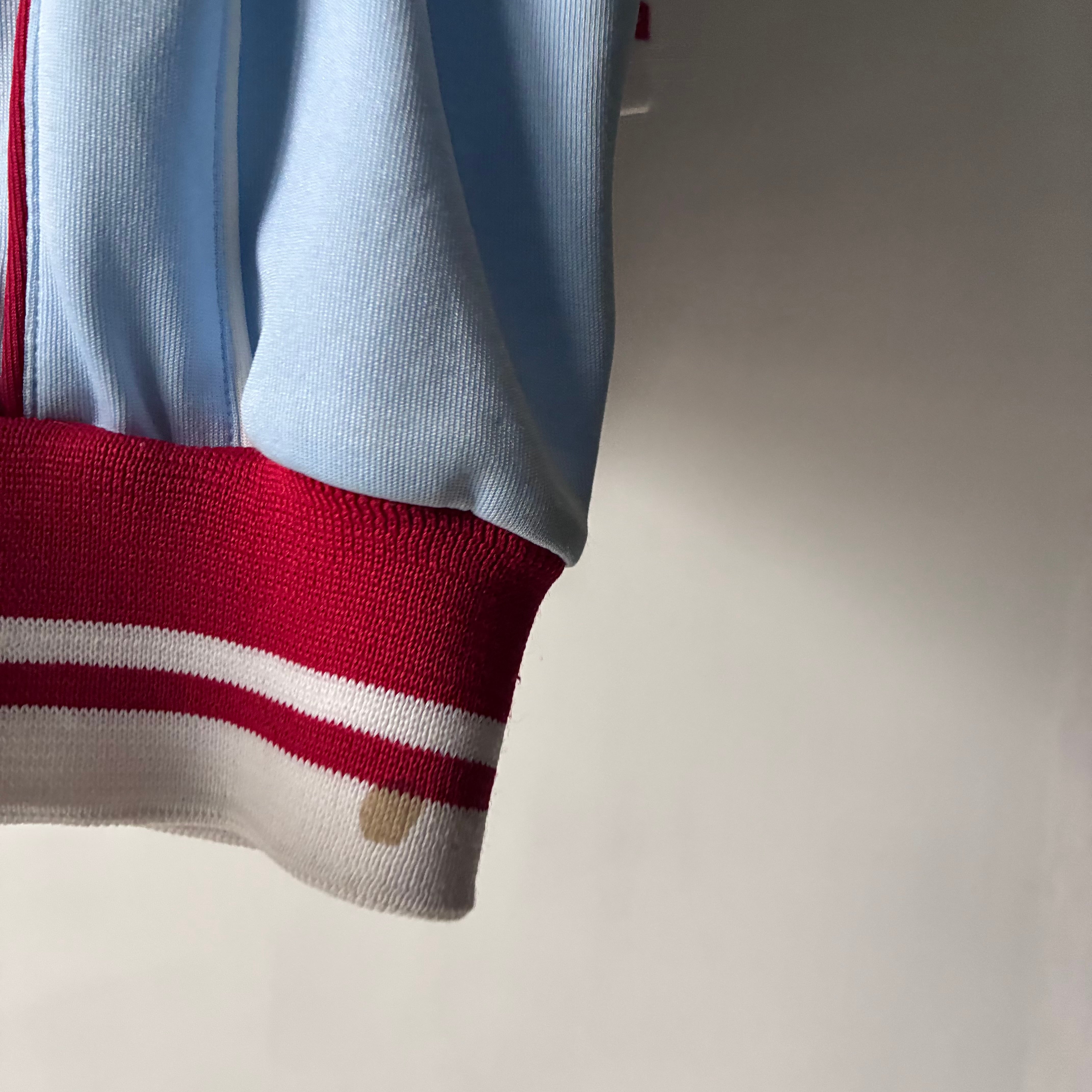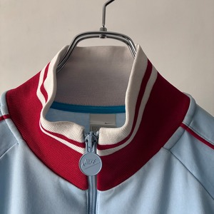 淡いライトブルーをベースに、ボルドー×ホワイトのリブ切り替えが映える好配色デザインのトラックジャケット