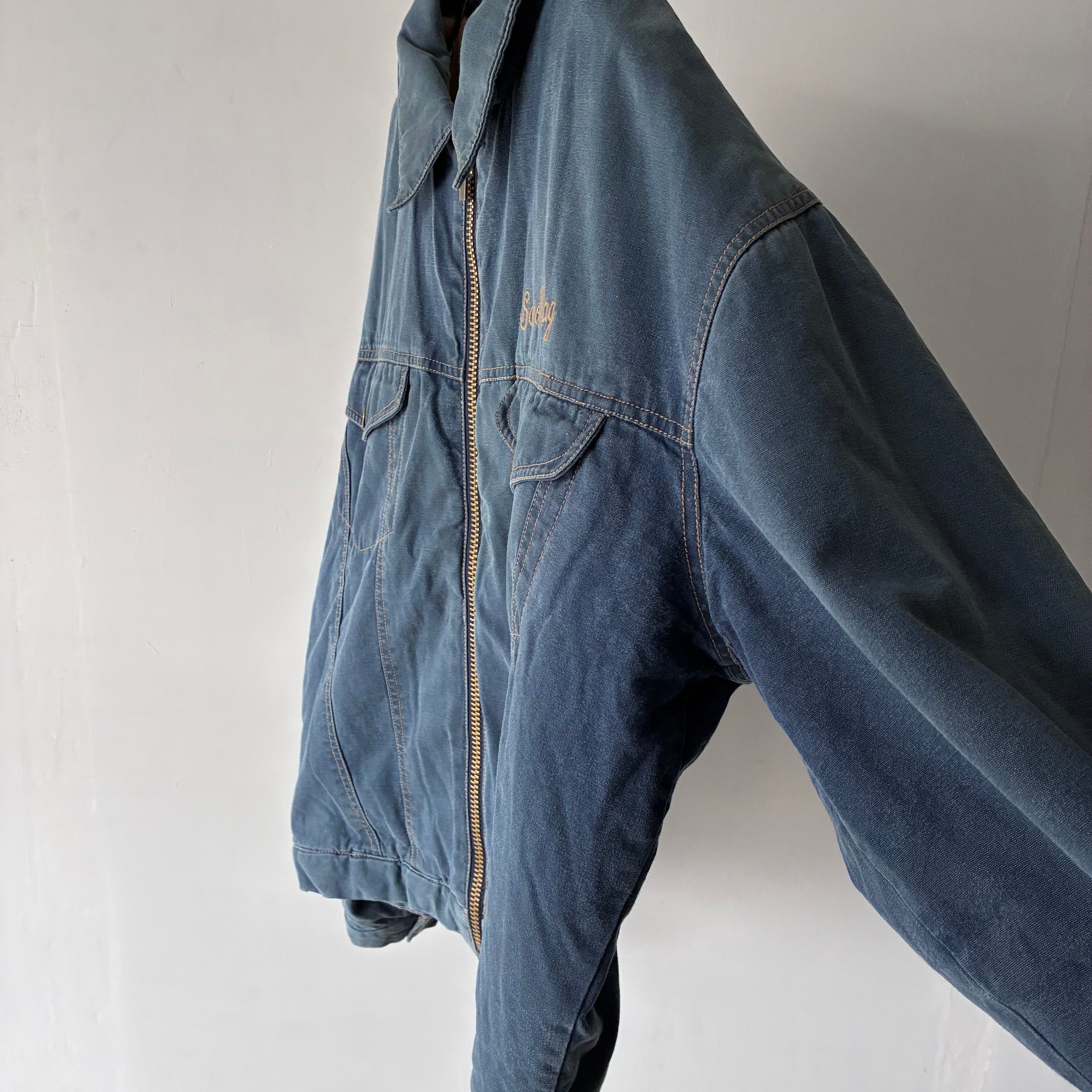 フロントはジップ仕様、胸元にはフラップポケットを配置し、ワークジャケットらしい無骨さも感じられるデザイン