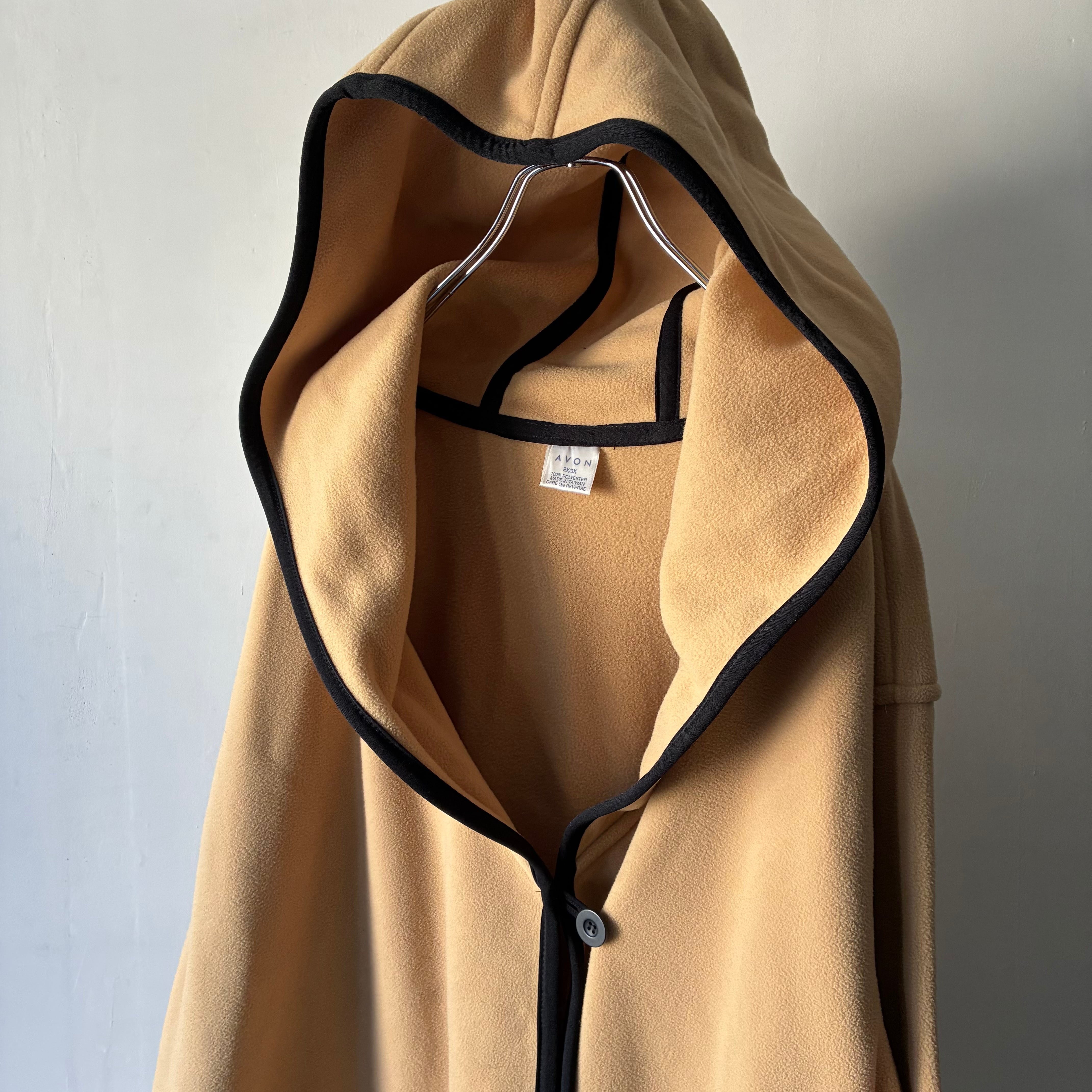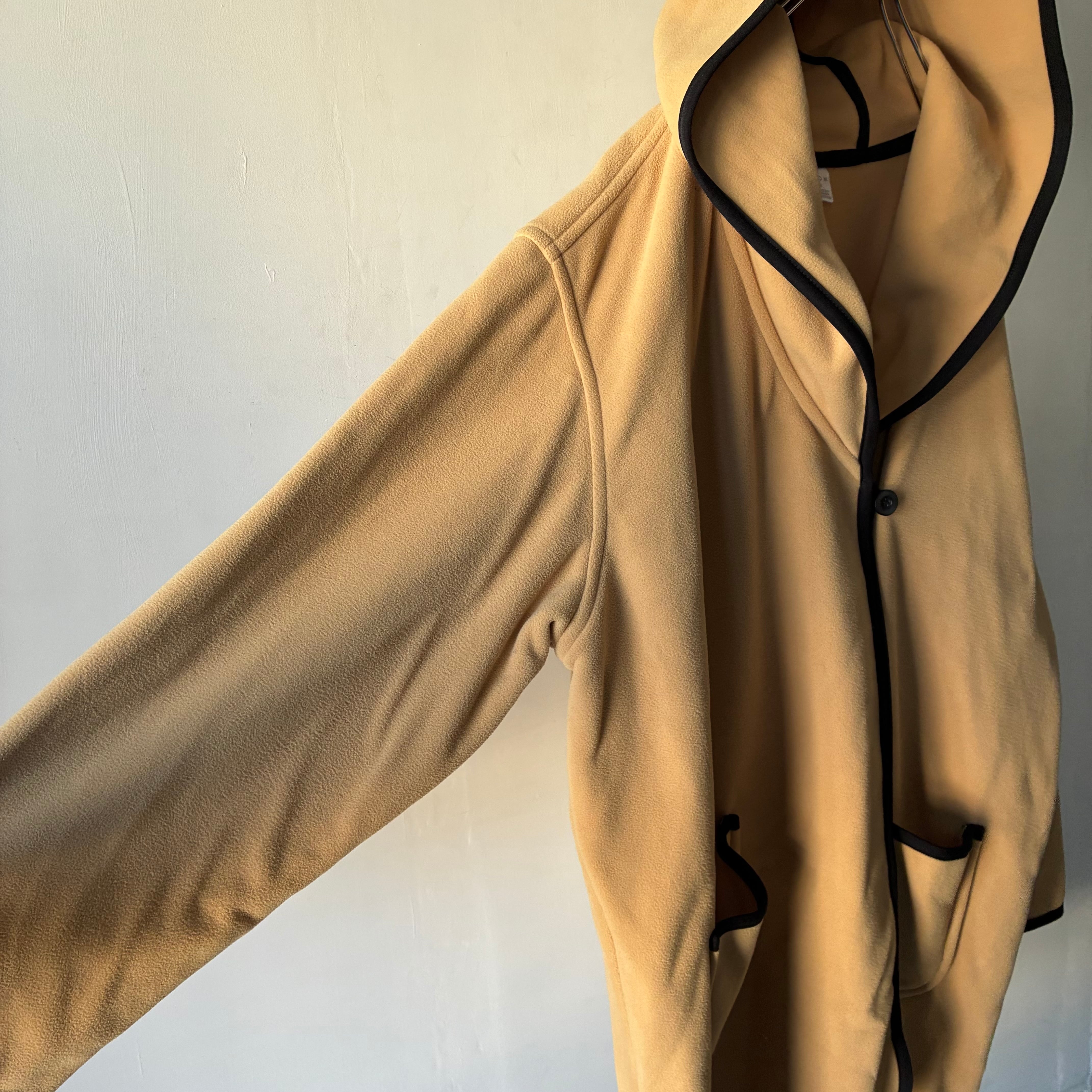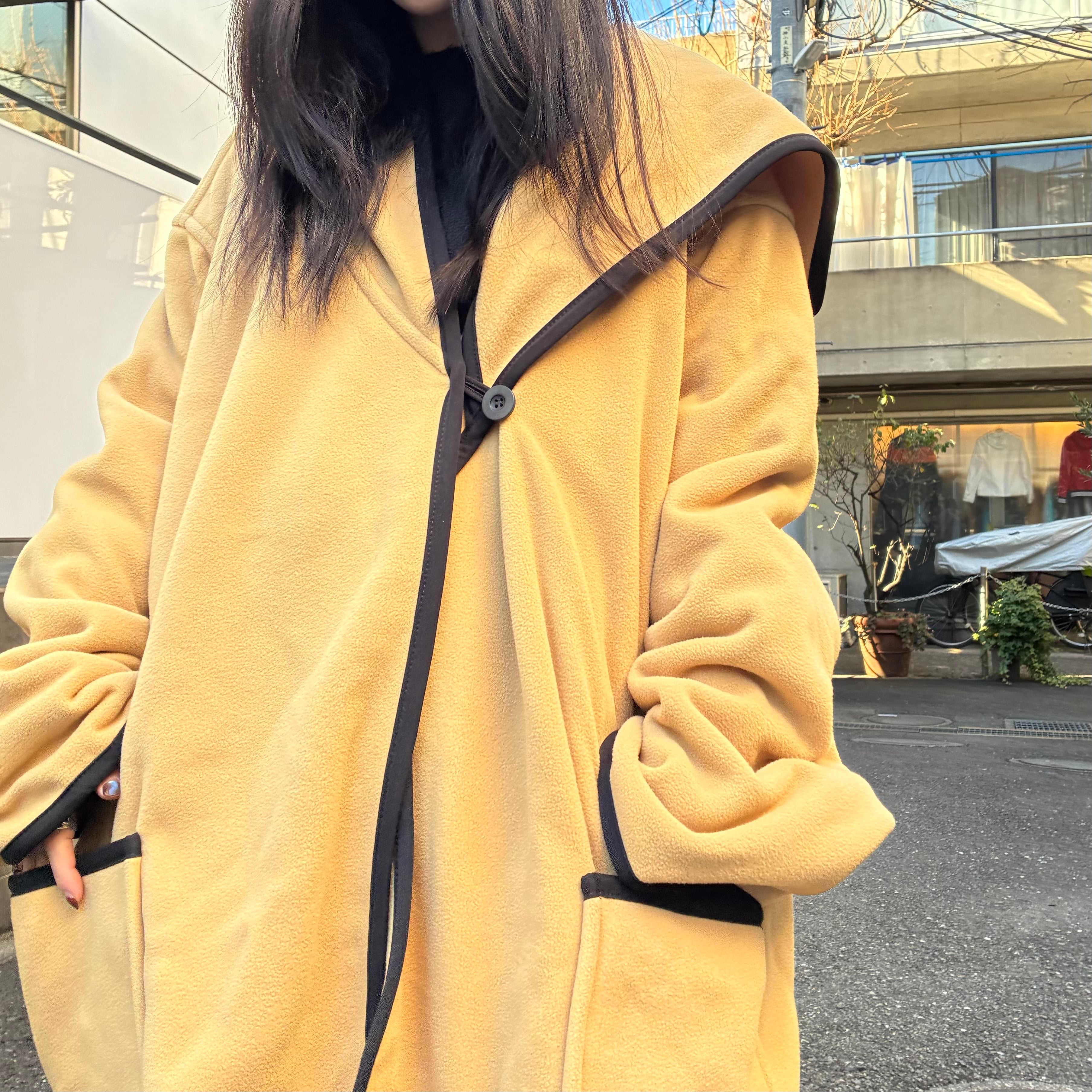 ボタン1つ留めのラップジャケットのような作りでオーバーサイズながらエレガントな雰囲気のある1着