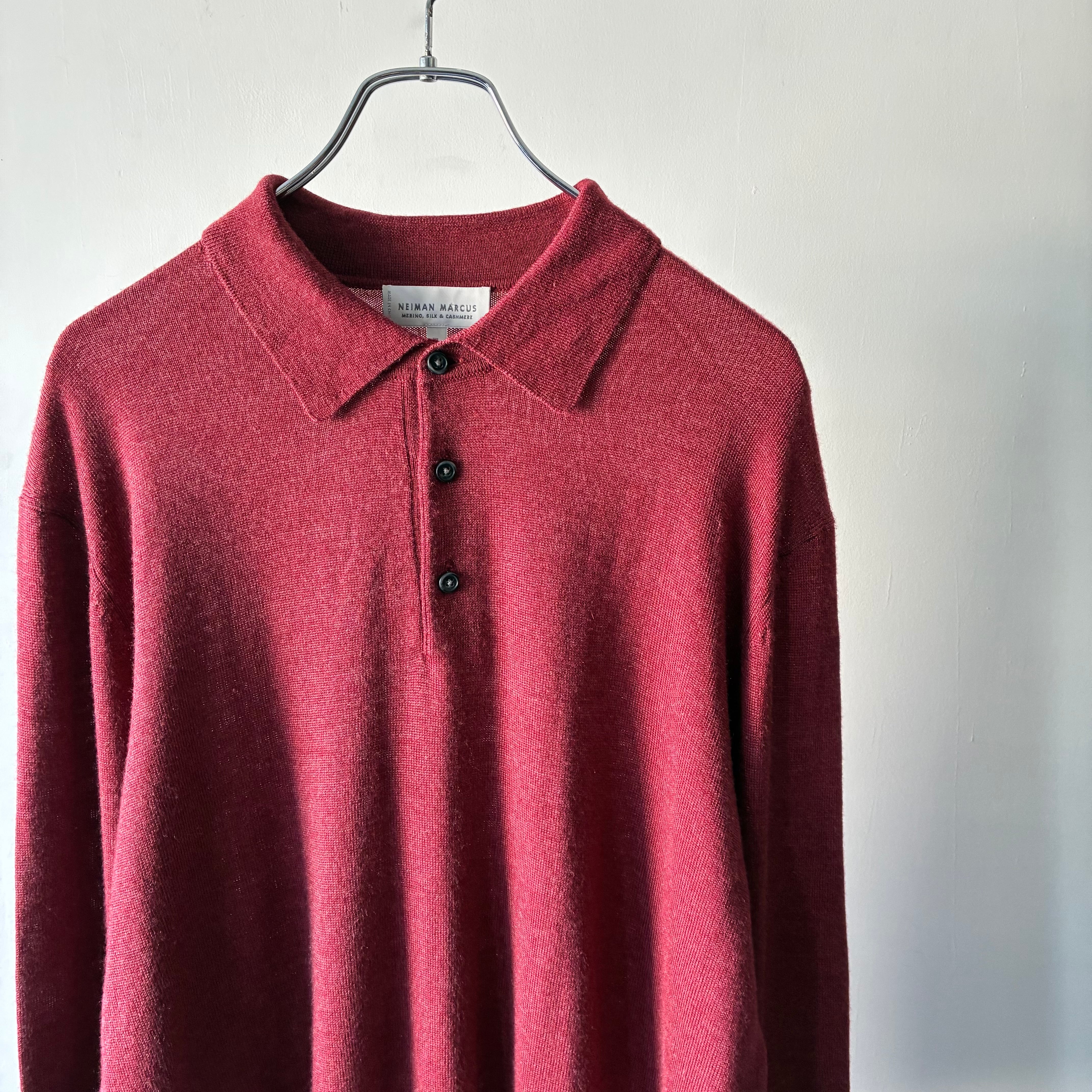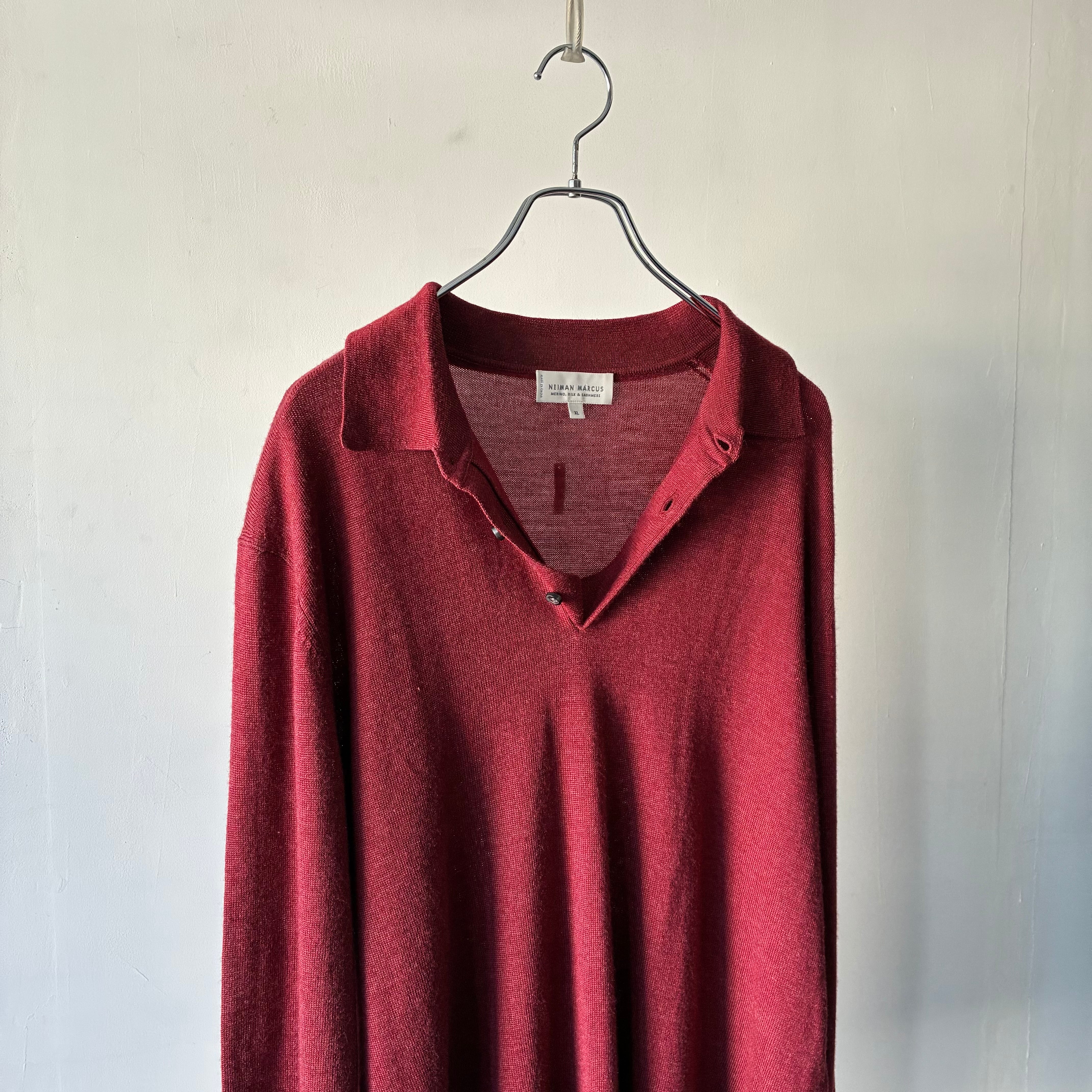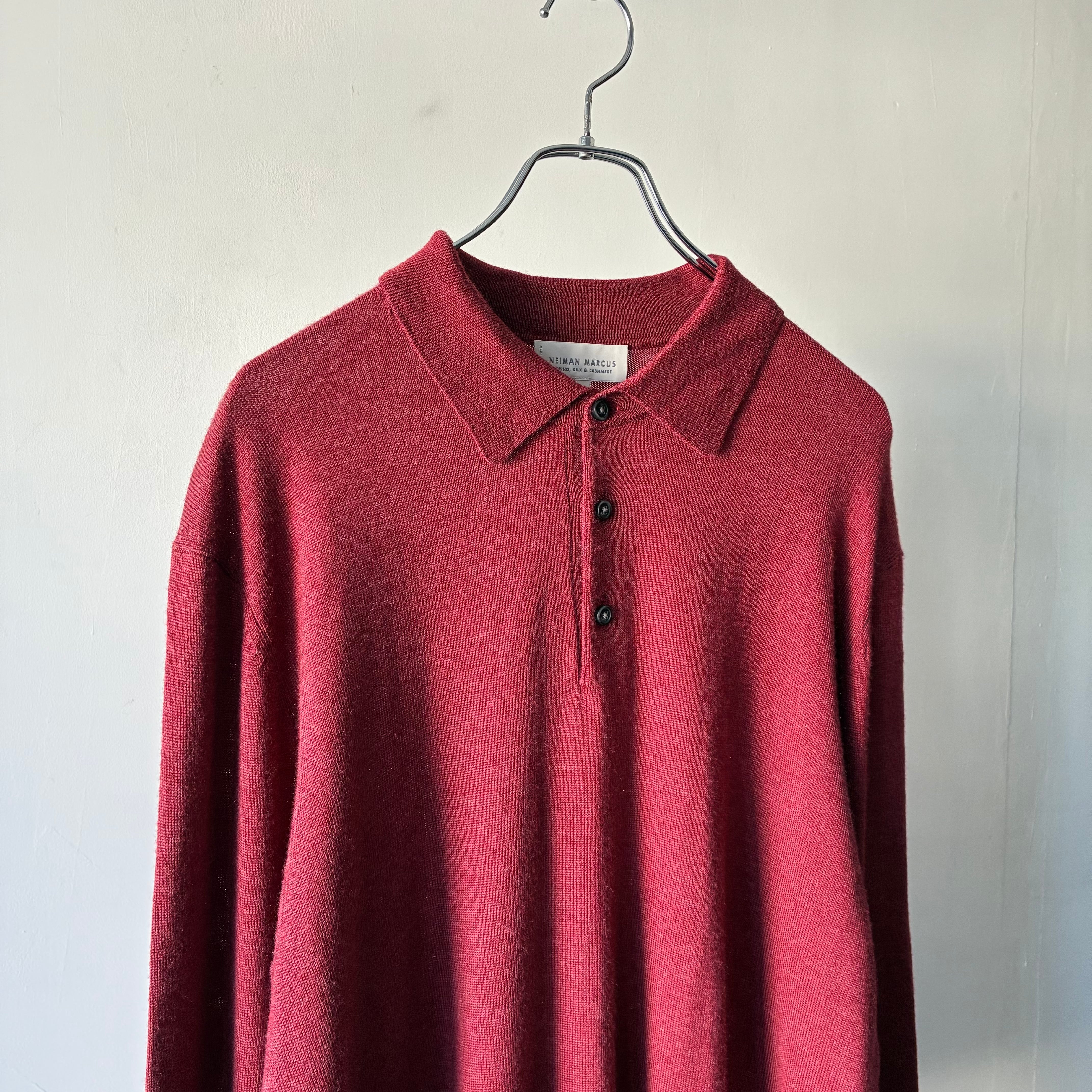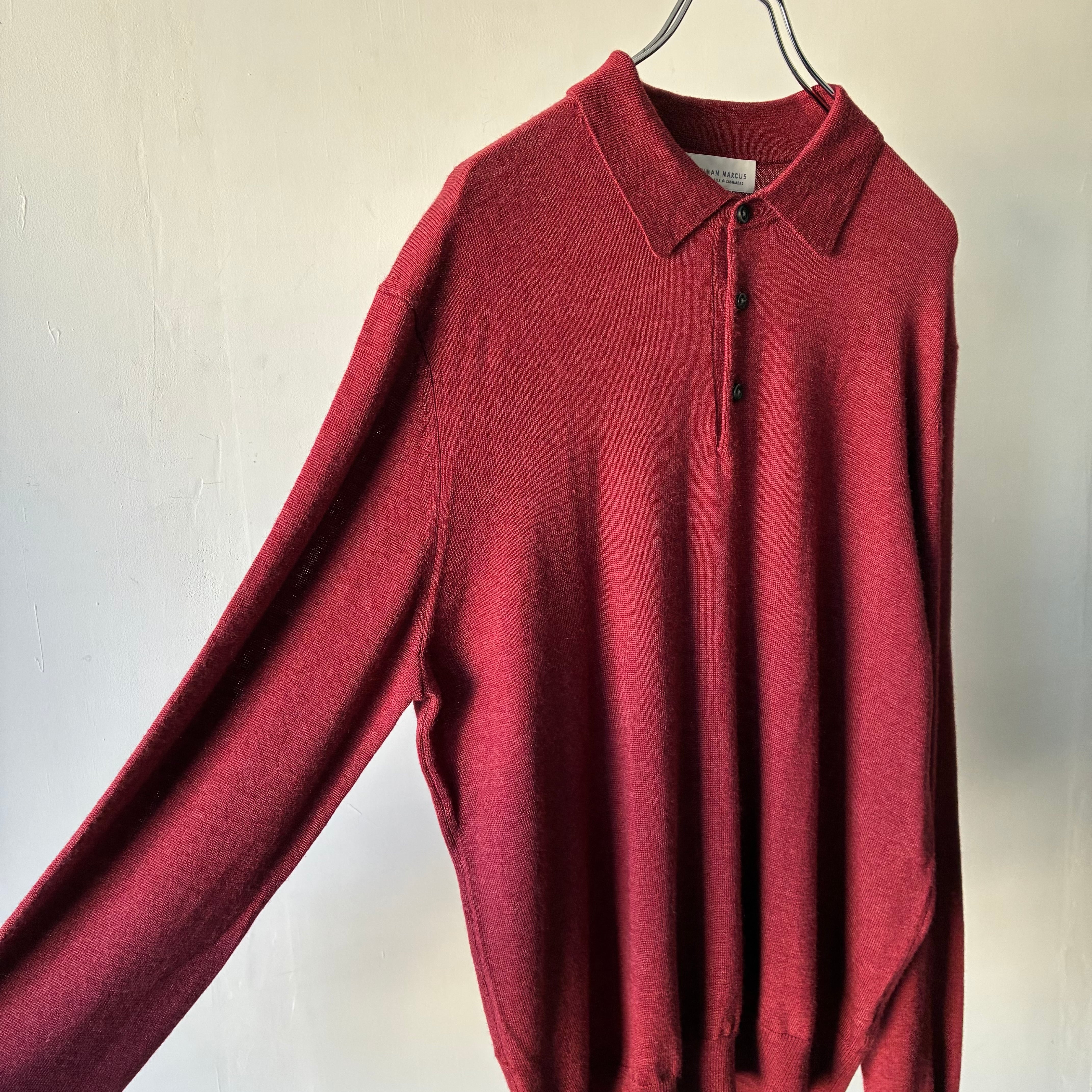 深みのあるレッドカラーが映えるシンプルかつ上品な印象のニットポロシャツ